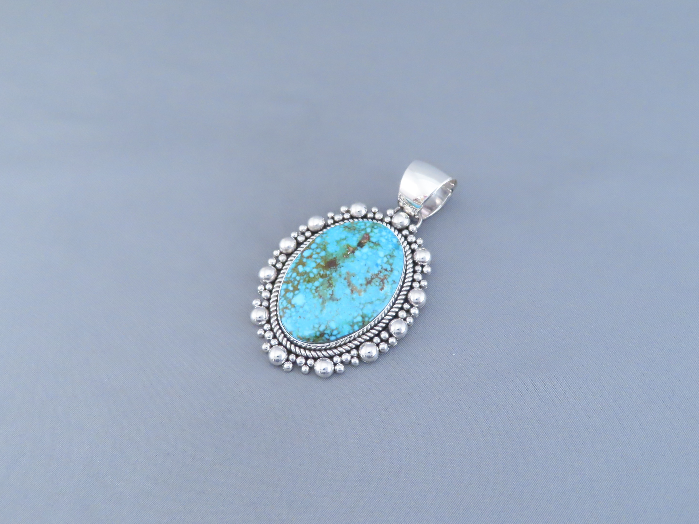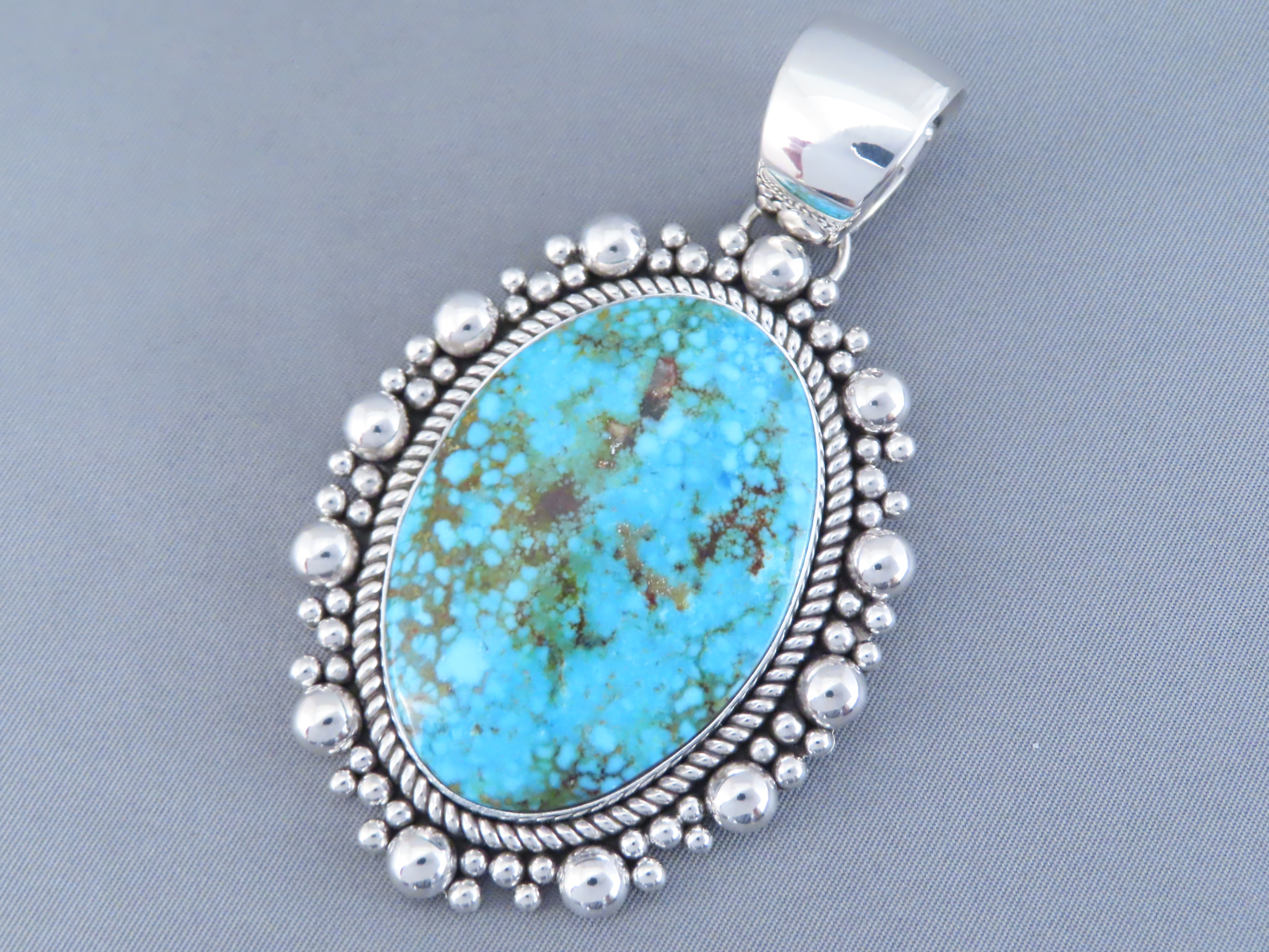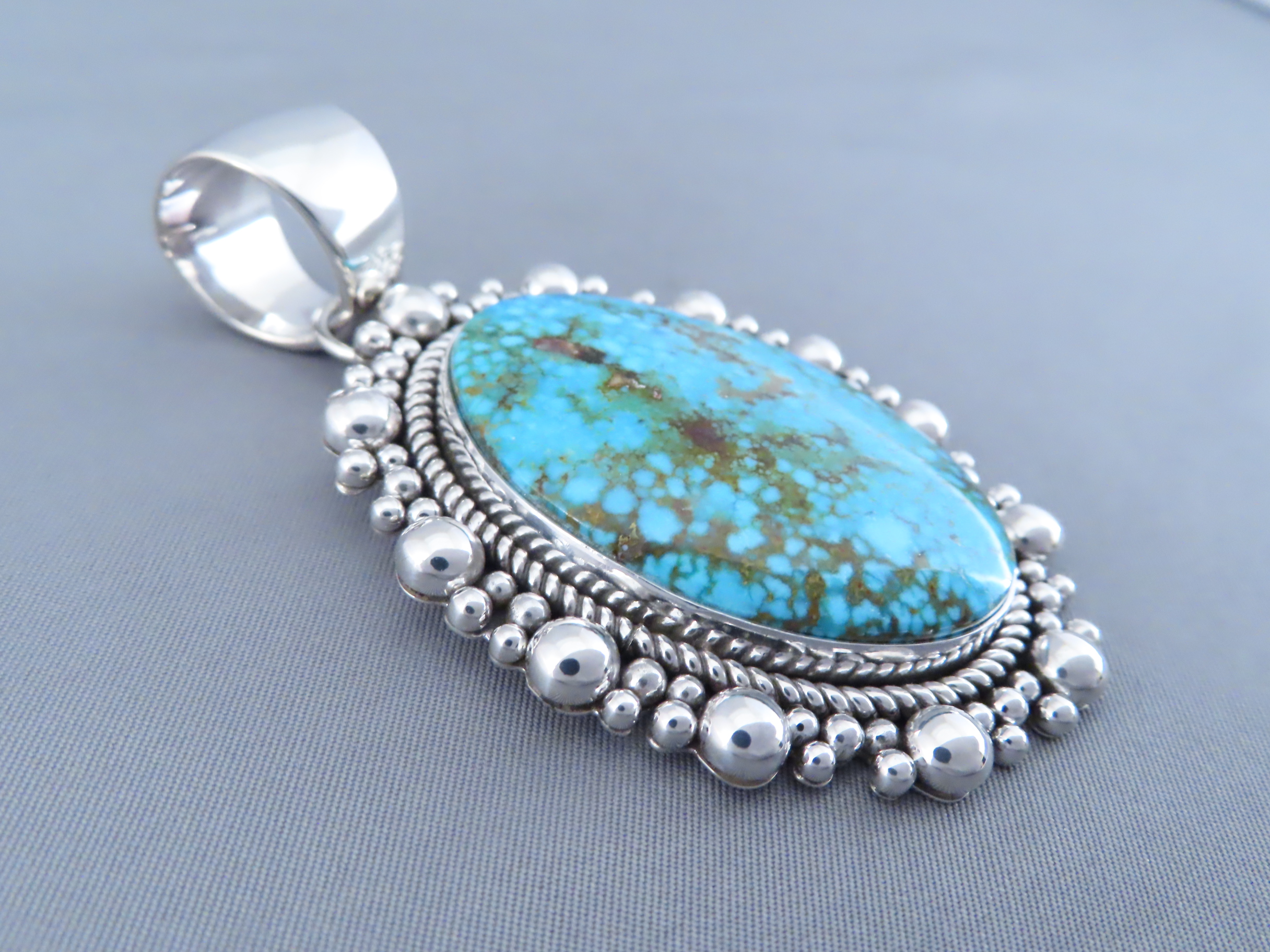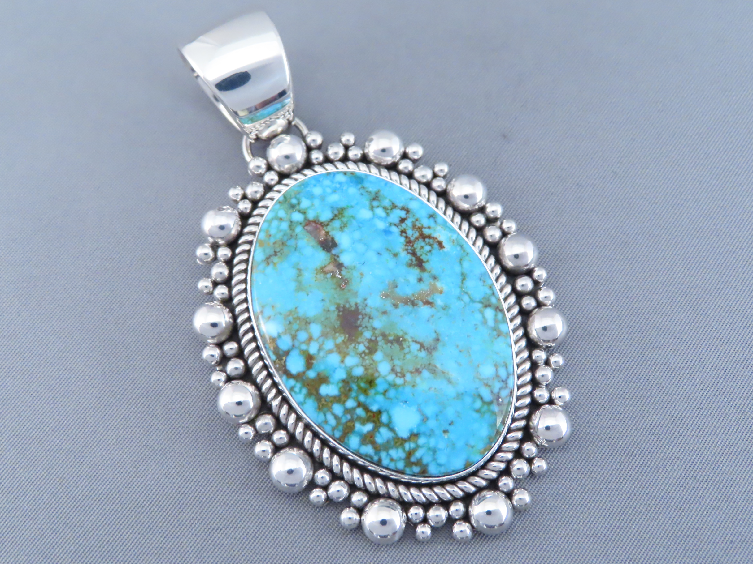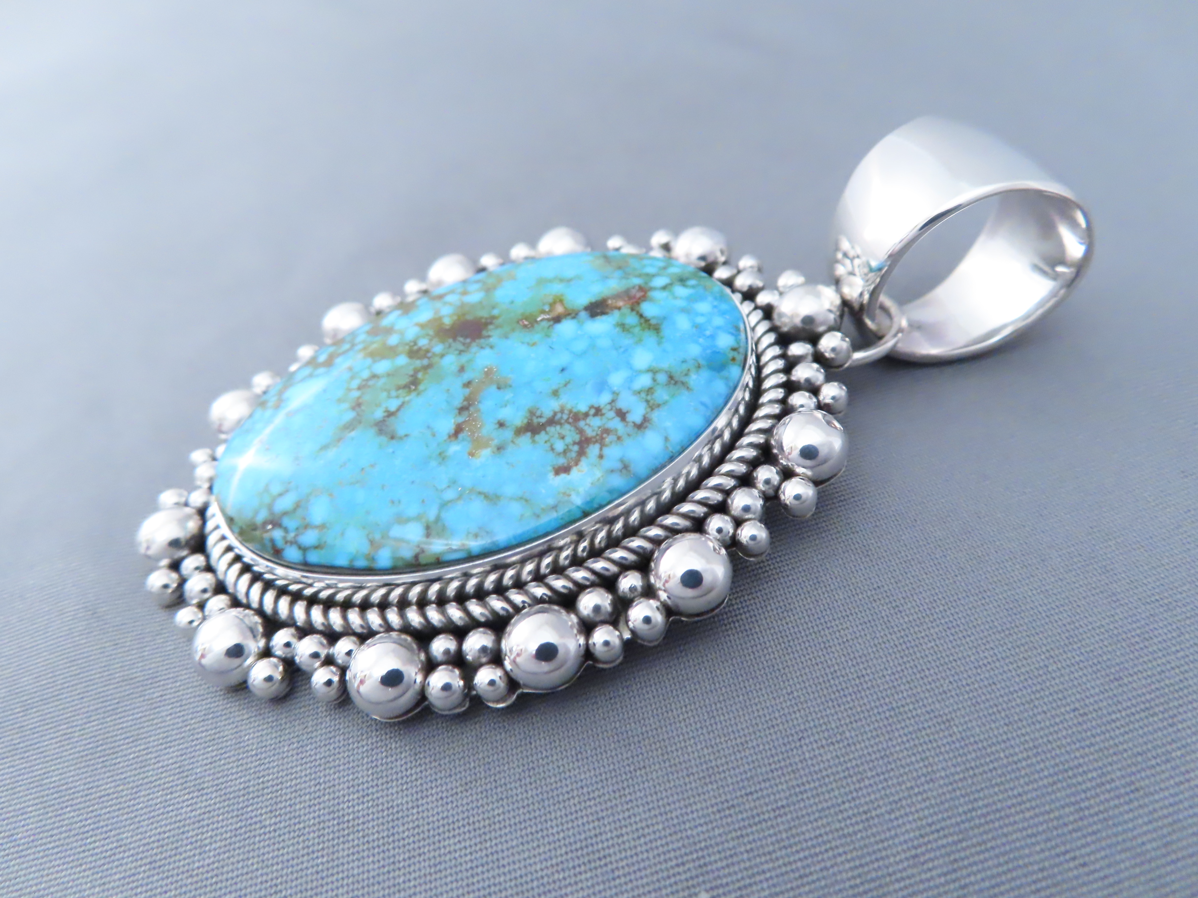 Kingman Turquoise Pendant! Navajo jewelry artist, Artie Yellowhorse, made this very impressive Kingman Turquoise pendant in hand-made sterling silver. GREAT piece of turquoise! Lovely turquoise jewelry by Artie Yellowhorse!