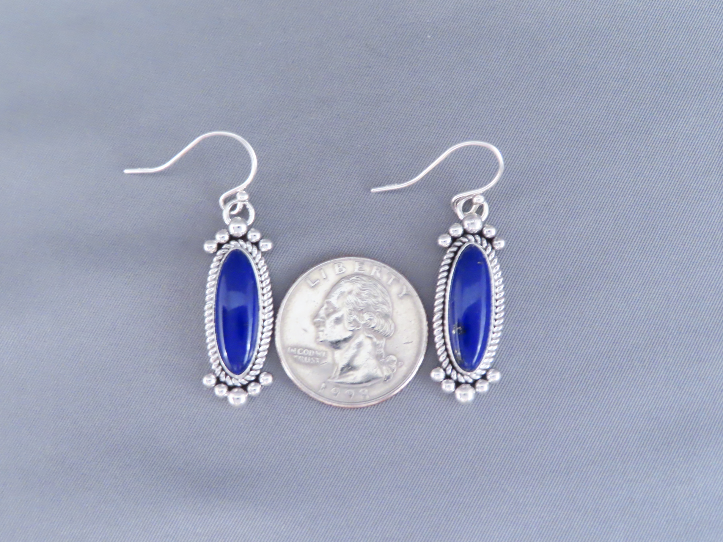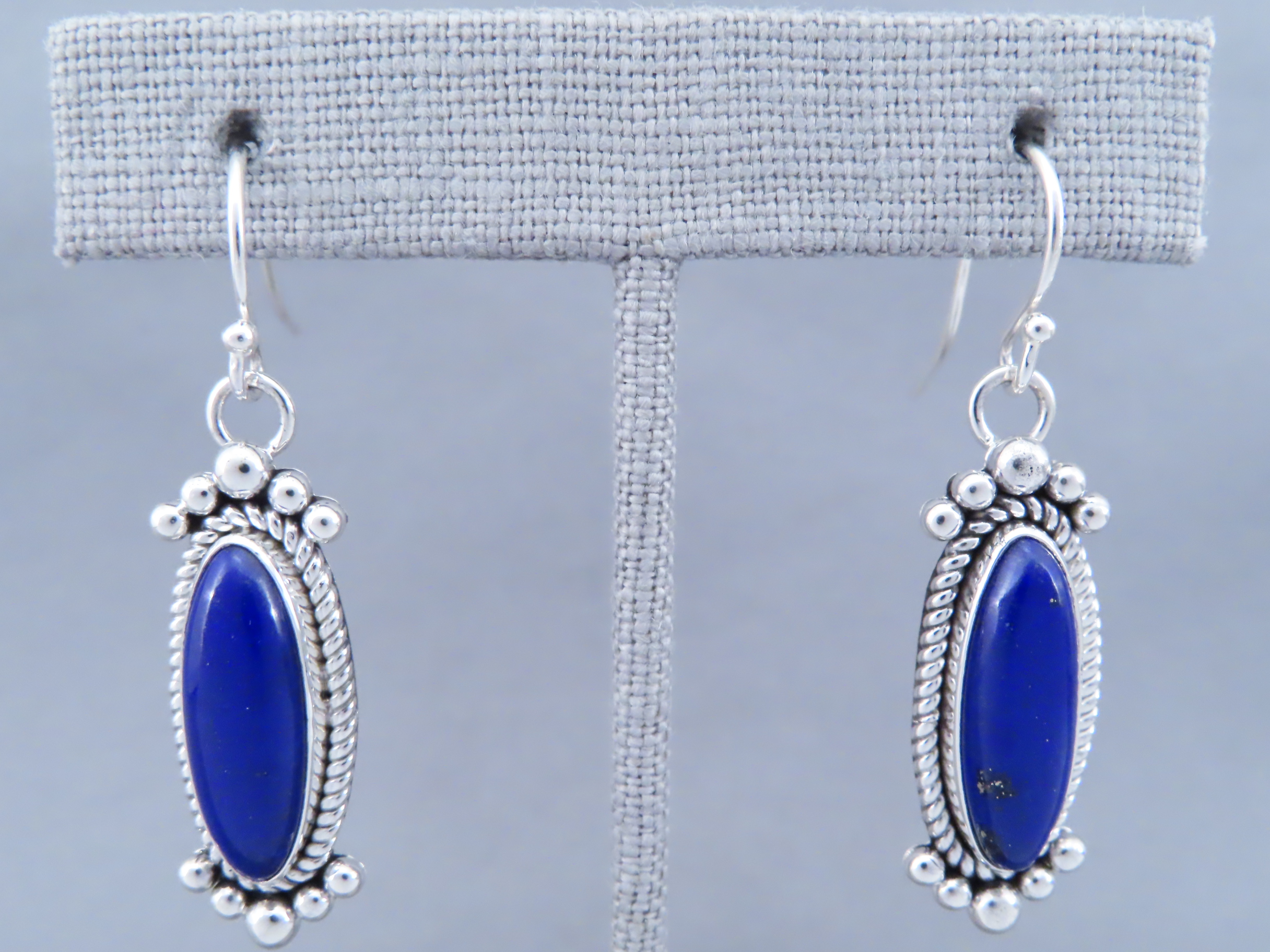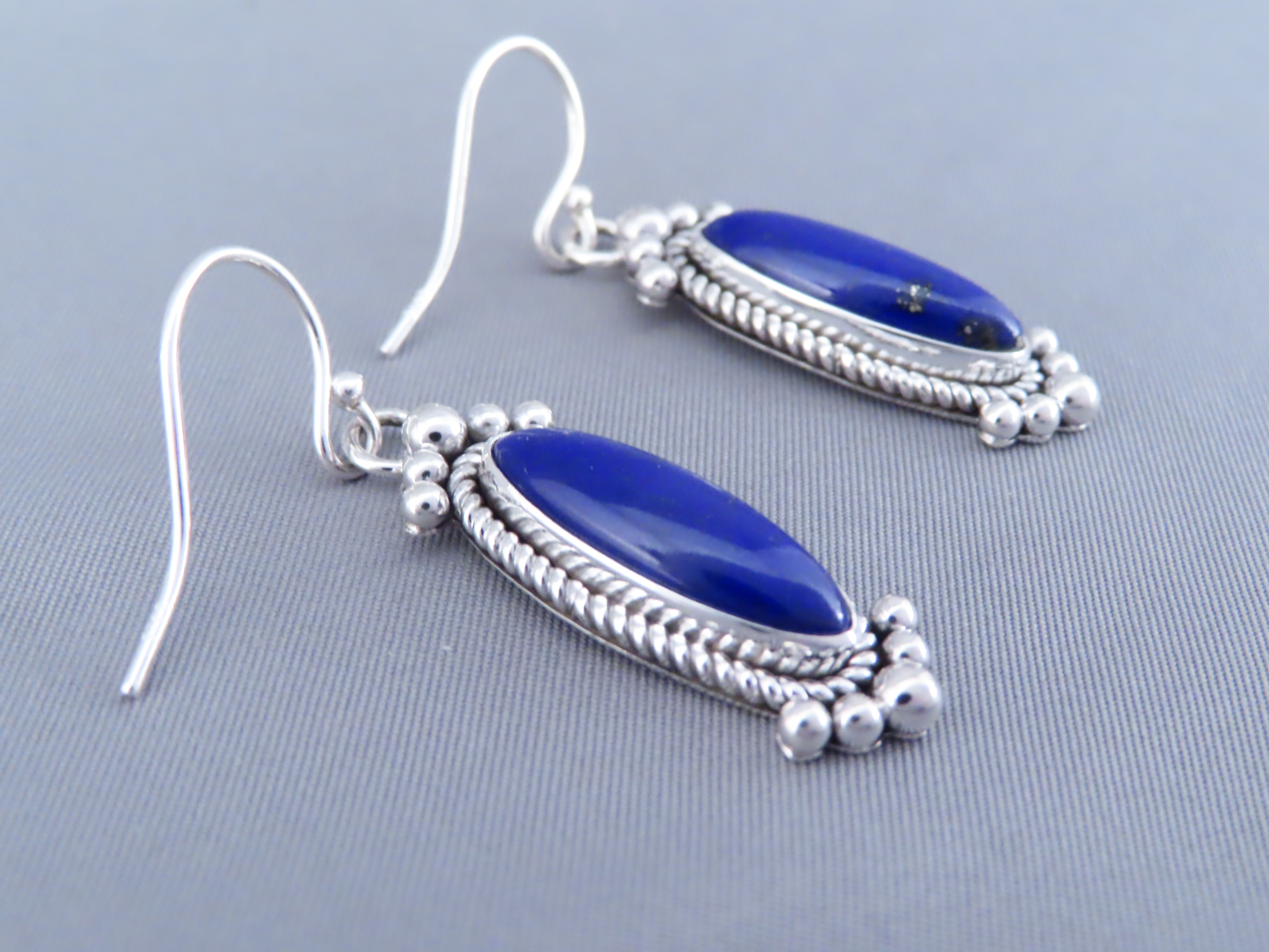 Artie Yellowhorse Lapis Earrings! Sterling silver hook earrings with beautiful blue lapis stones. Made by Navajo jewelry artist, Artie Yellowhorse. Lapis Earrings – Native American Jewelry!