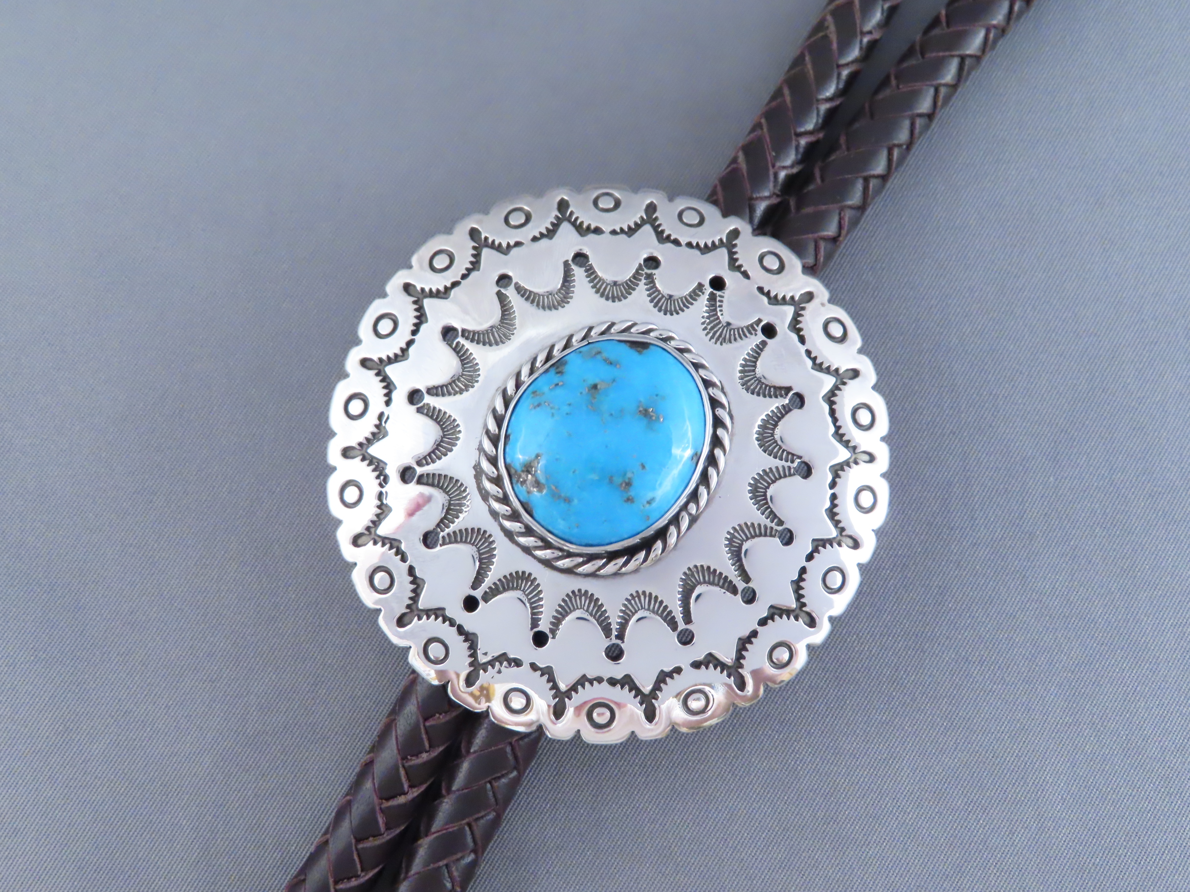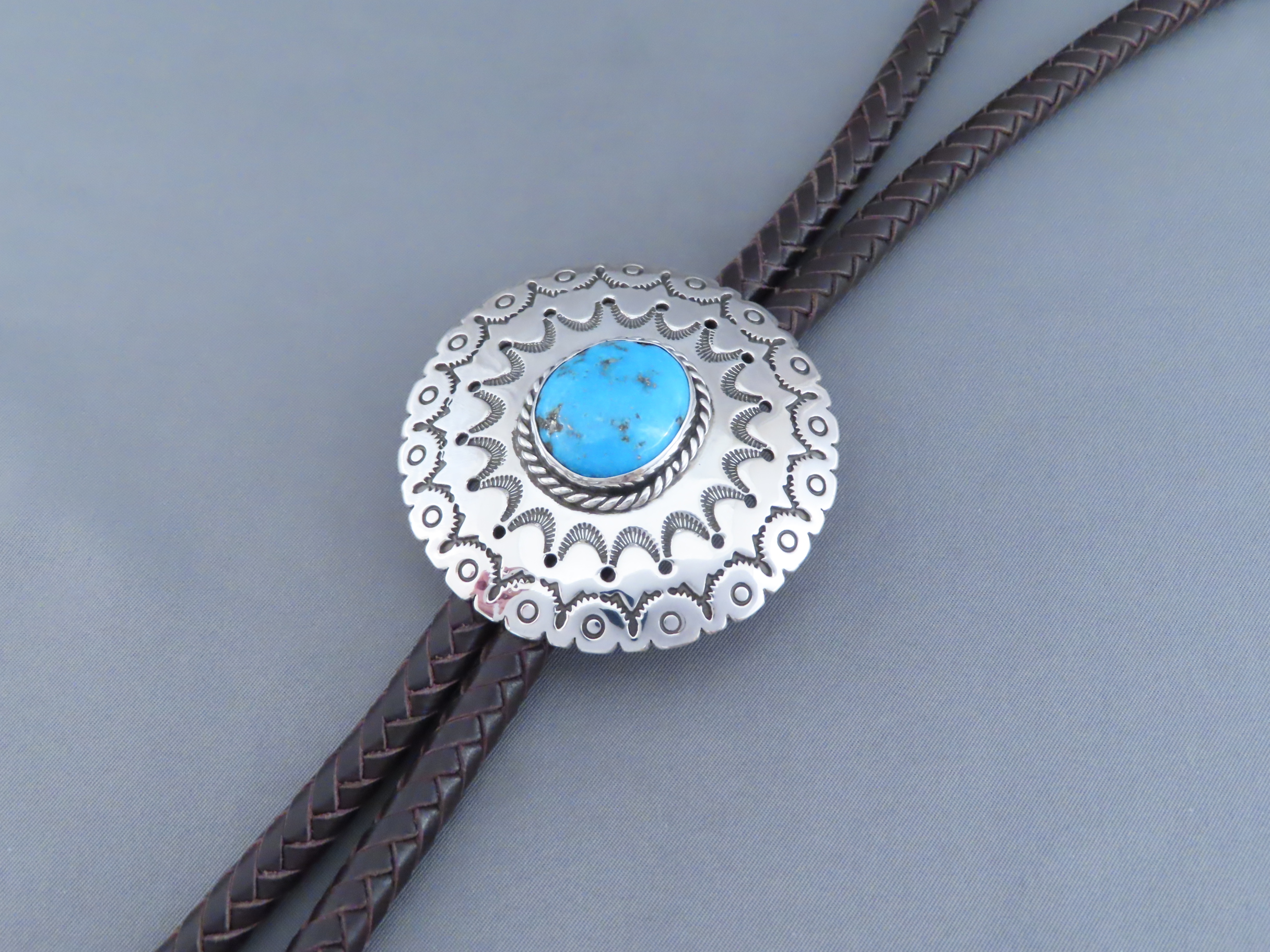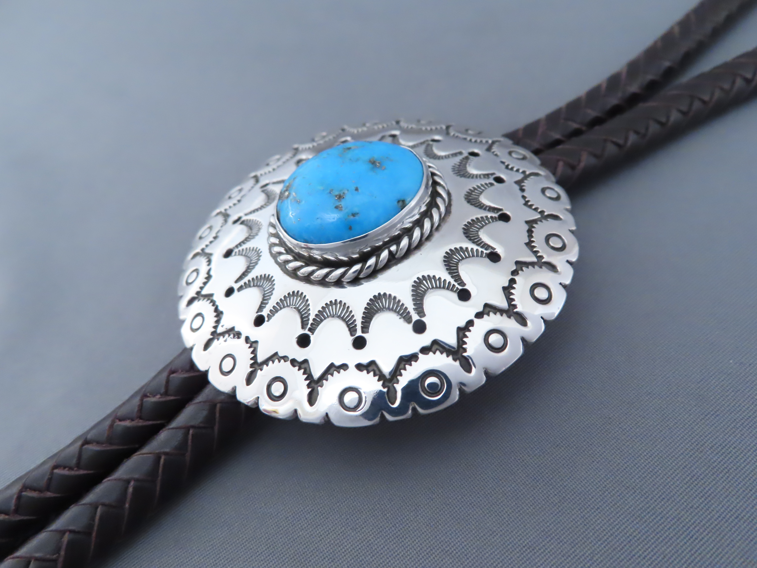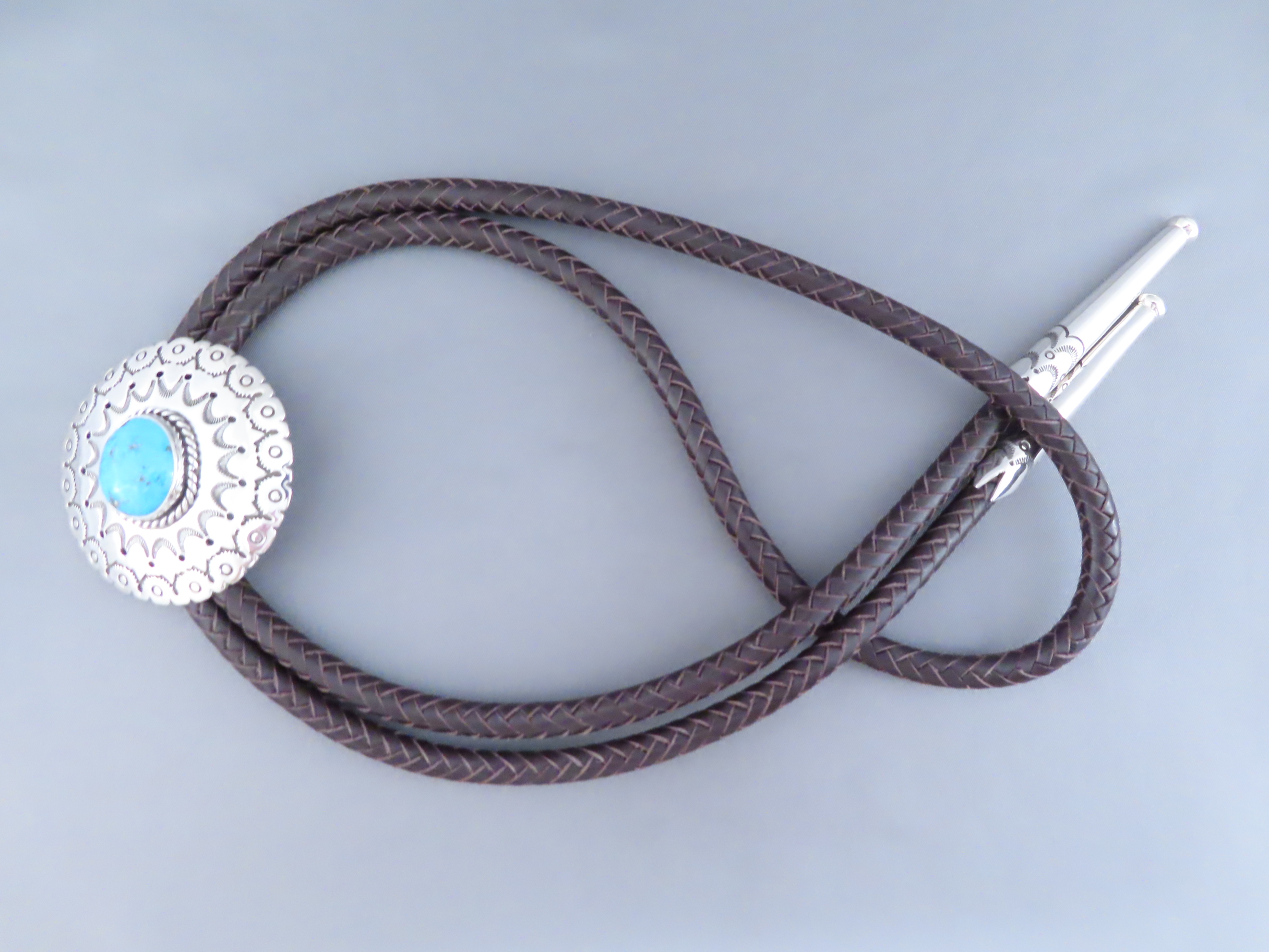 Bolo Tie with Kingman Turquoise! Very nicely hand-stamped sterling silver bolo tie with Kingman Turquoise by Native American jewelry artist, Rose Anne Taylor (Navajo). Details like the chocolatey brown hand-braided strap and beautifully hand-crafted tie tips really compliment the silver bolo with a nice Kingman Turquoise centerpiece stone. Bolo comes with a 46″ braided brown leather tie (leather work by her husband Leonard Gene).