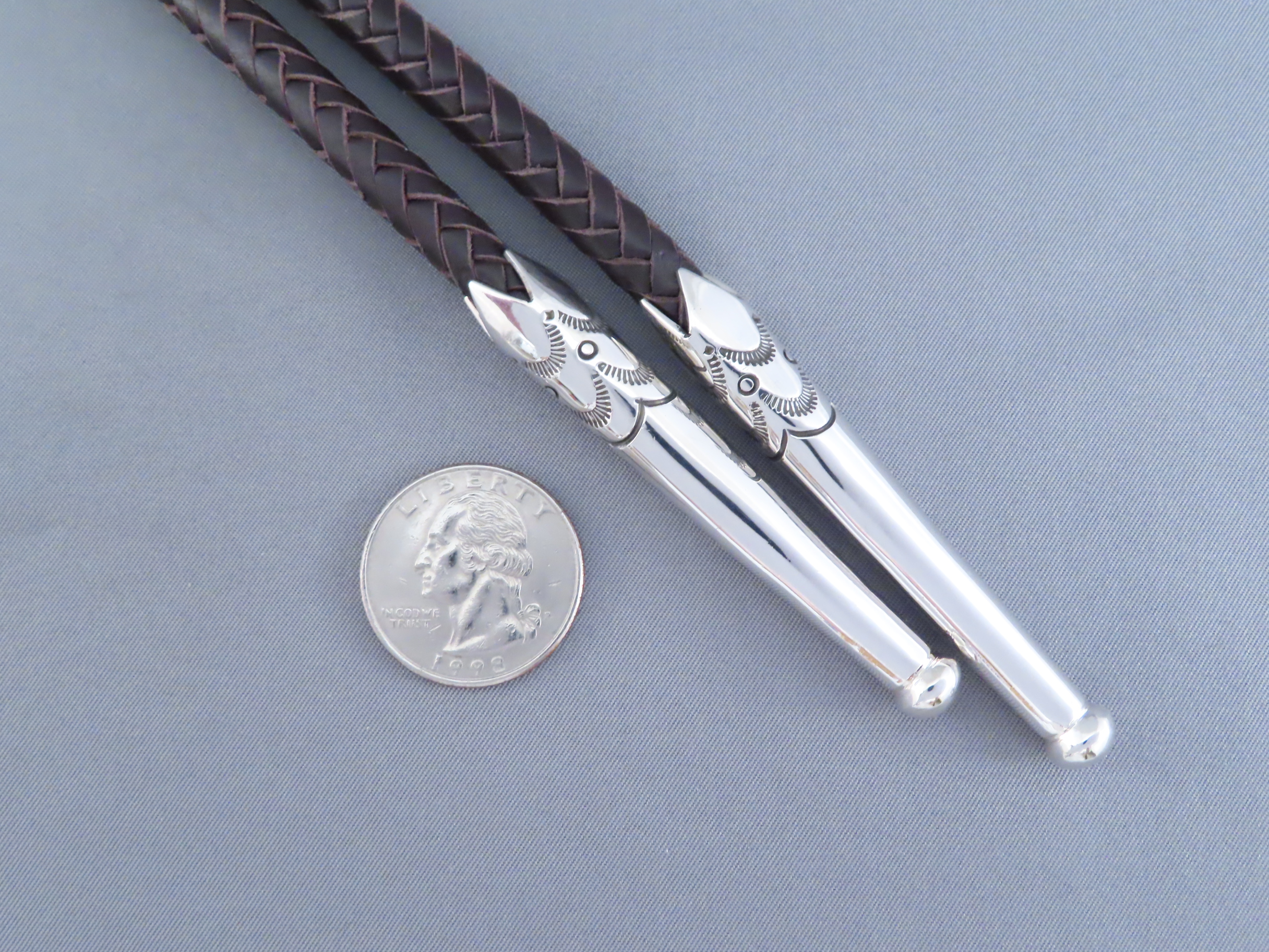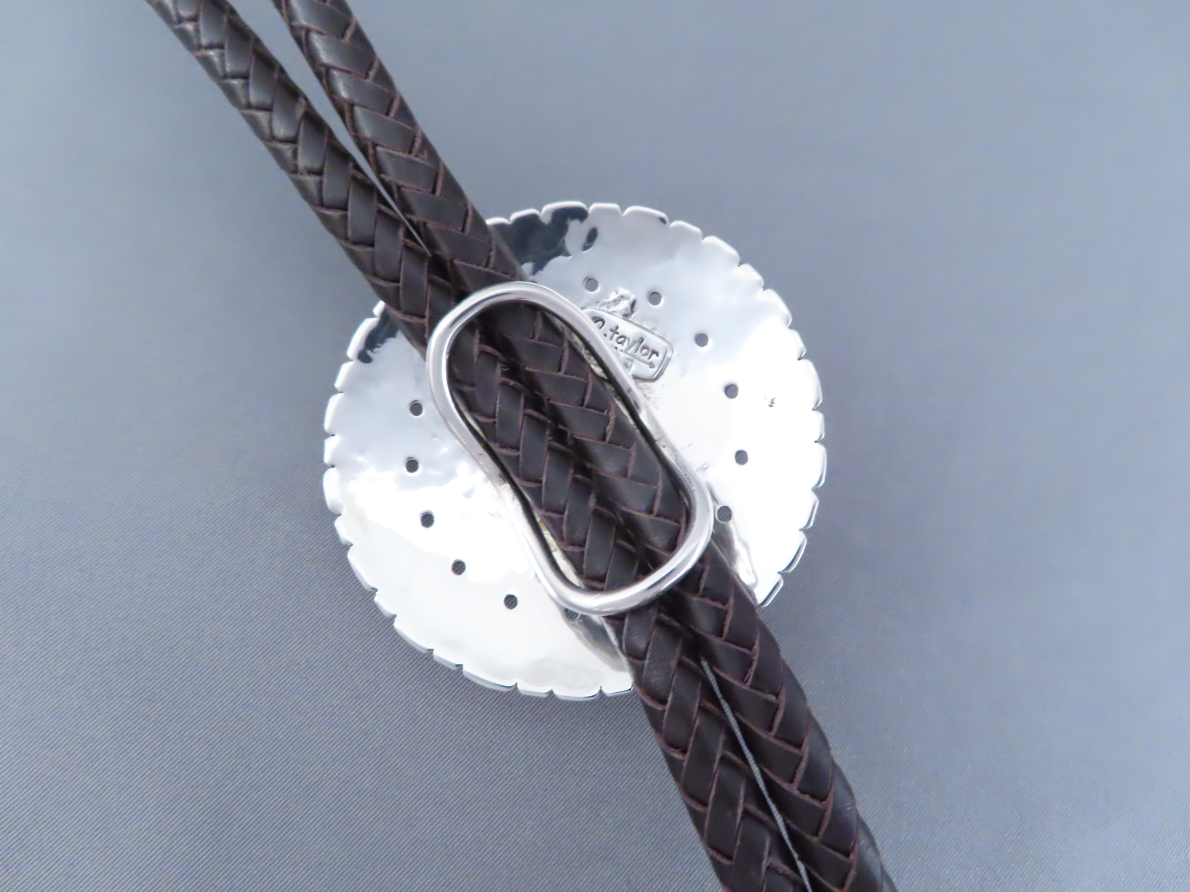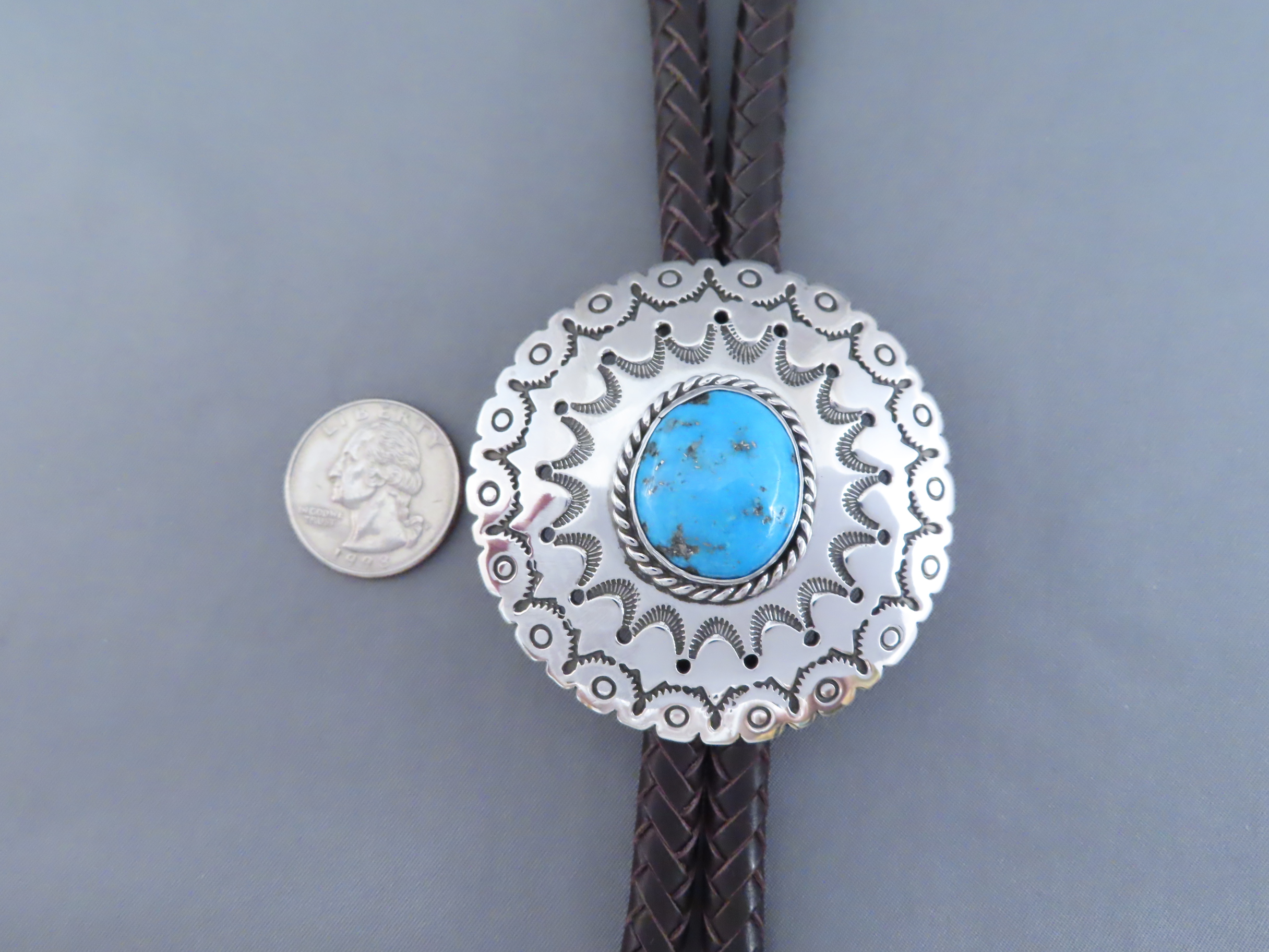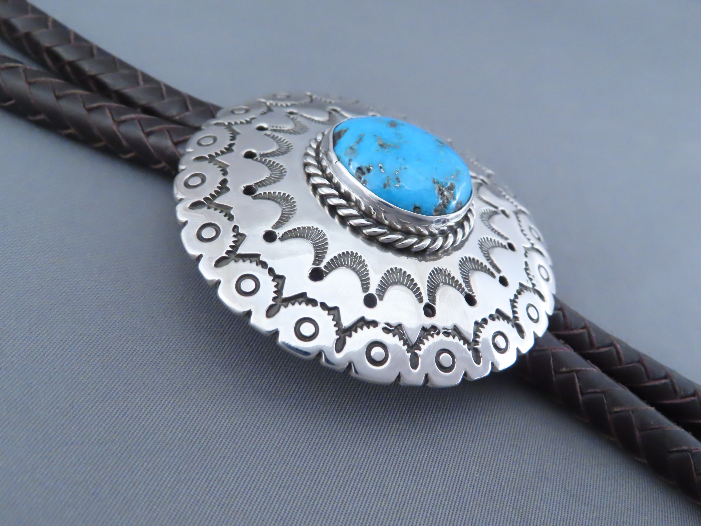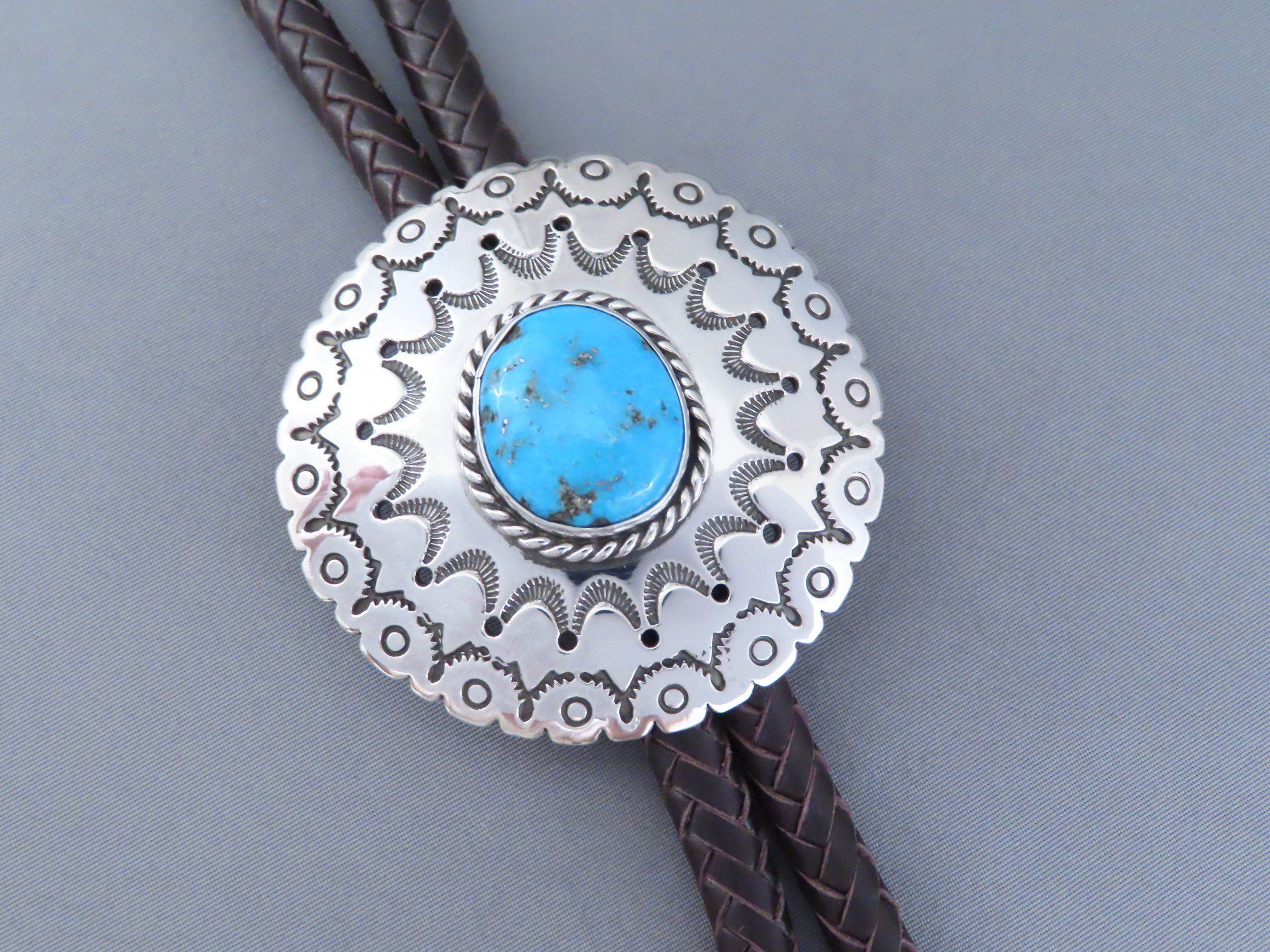 Bolo Tie with Kingman Turquoise! Very nicely hand-stamped sterling silver bolo tie with Kingman Turquoise by Native American jewelry artist, Rose Anne Taylor (Navajo). Details like the chocolatey brown hand-braided strap and beautifully hand-crafted tie tips really compliment the silver bolo with a nice Kingman Turquoise centerpiece stone. Bolo comes with a 46″ braided brown leather tie (leather work by her husband Leonard Gene).