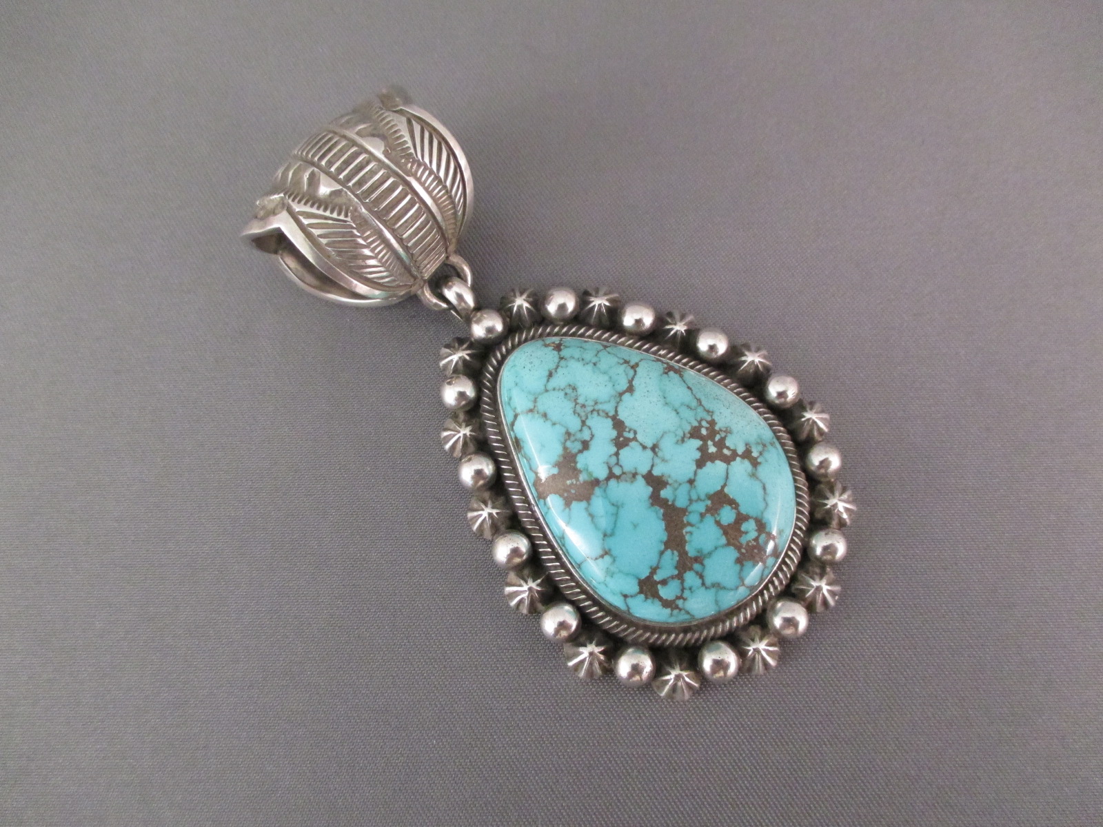 Carico Lake Turquoise Pendant! Attractive sterling silver pendant made by Navajo jewelry artist, Terry Martinez, with an impressive Carico Lake Turquoise stone.