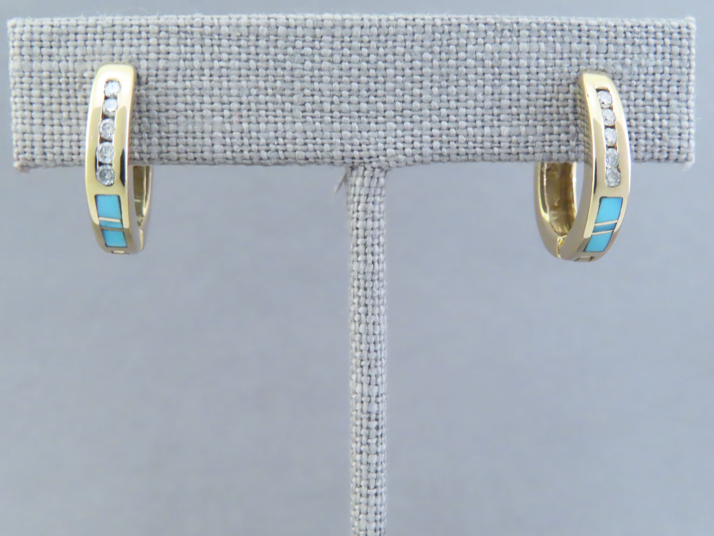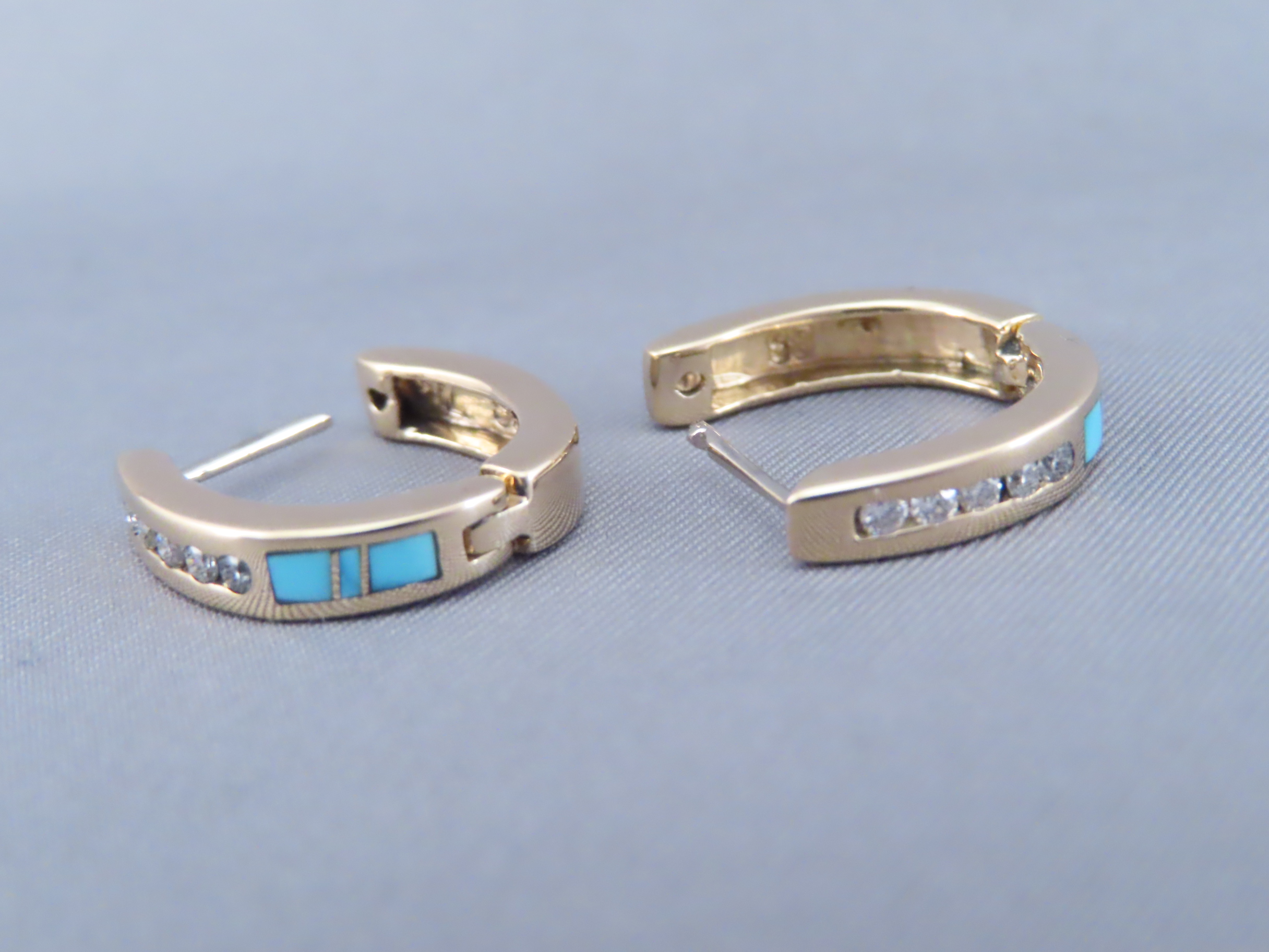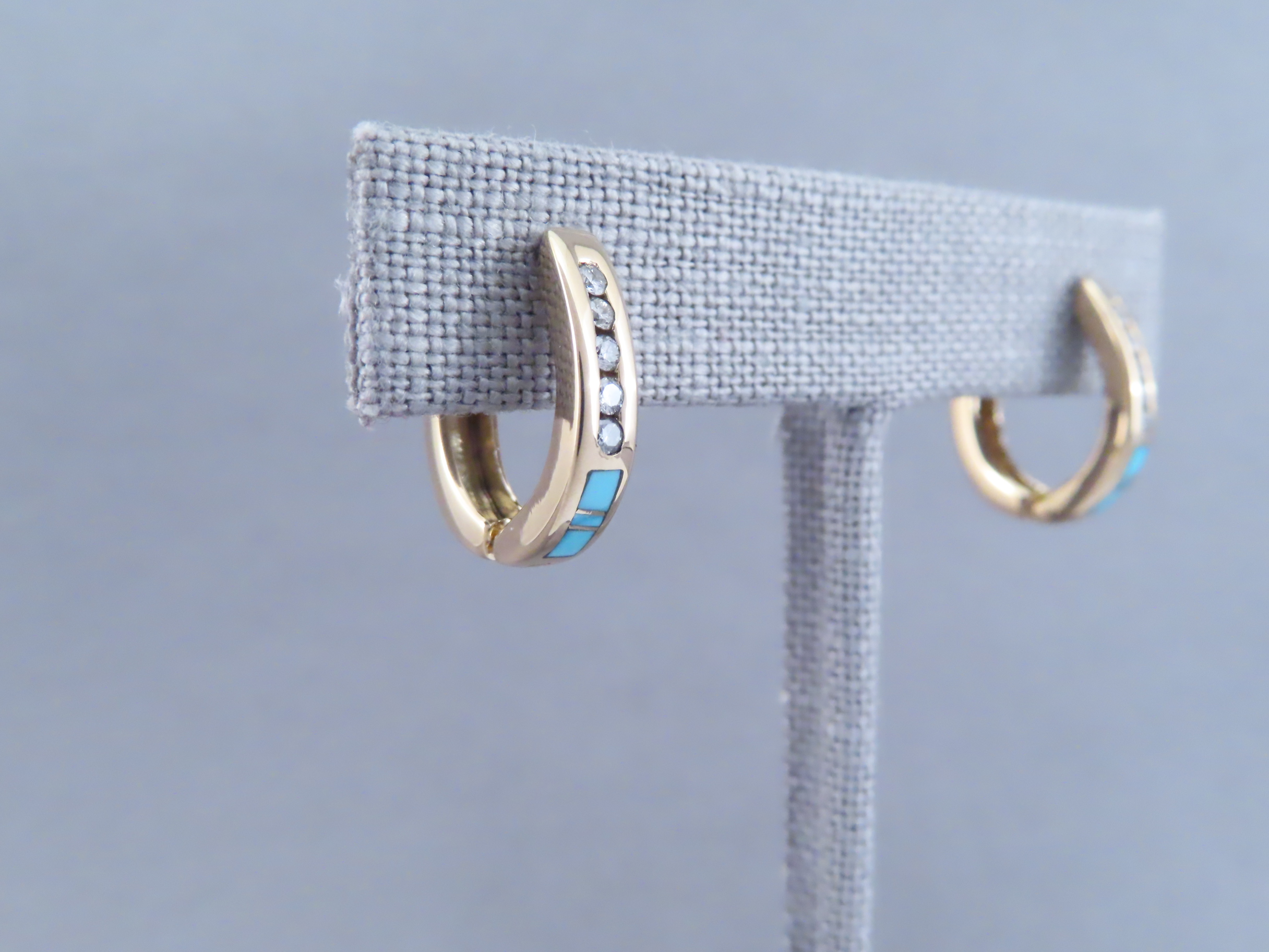 Diamonds & Turquoise Earrings!  GORGEOUS 14kt Gold ‘huggies’ earrings, with diamonds & turquoise inlay.  Made by Native American jewelry artist, Peterson Chee (Navajo).  5 sparkling diamonds in each earring perfectly sing with the gold + blue turquoise.  Fine Native American Jewelry.