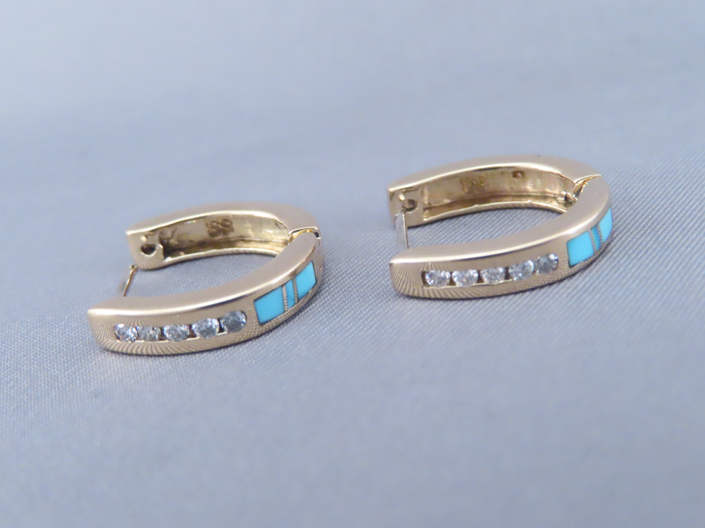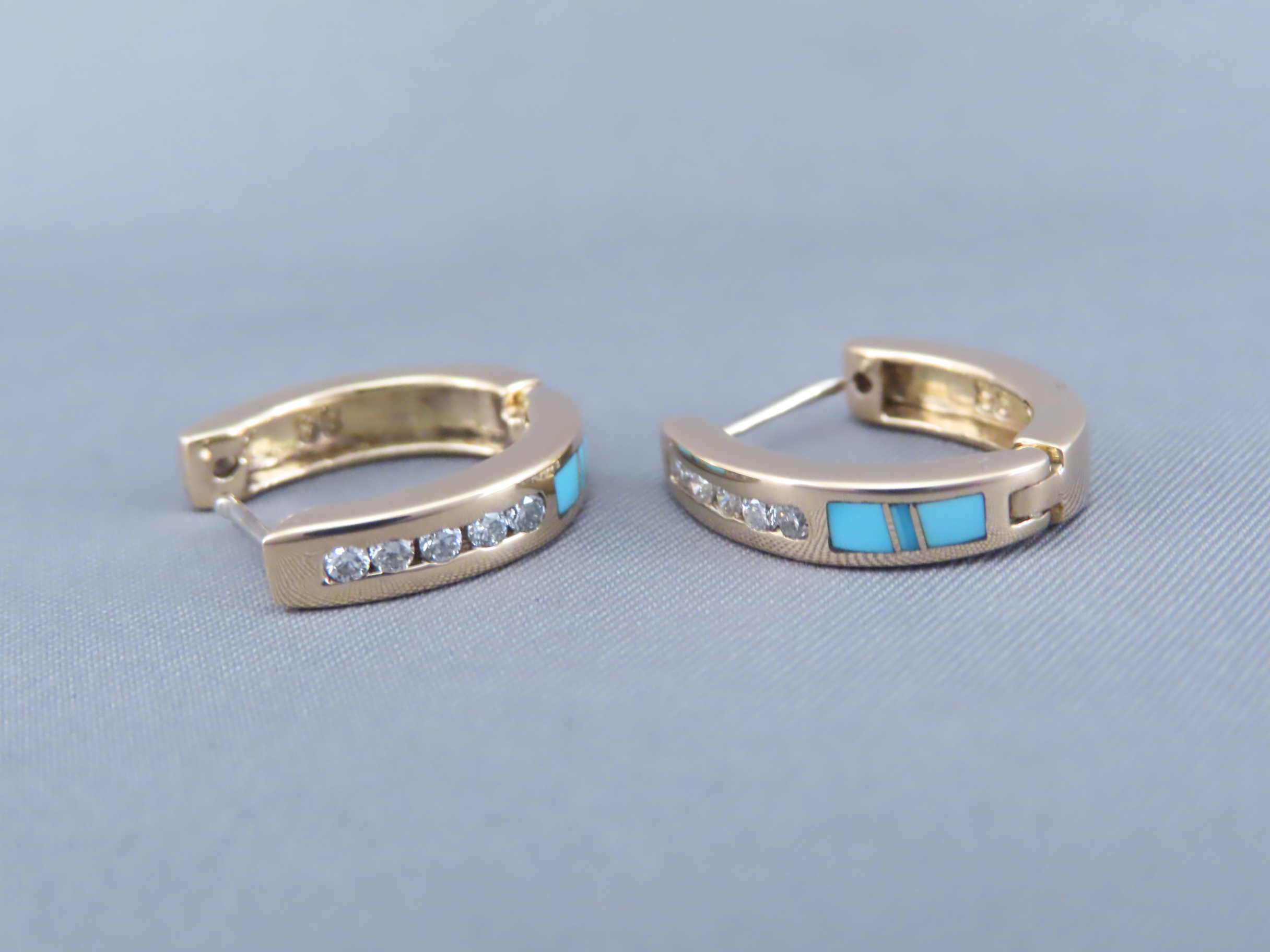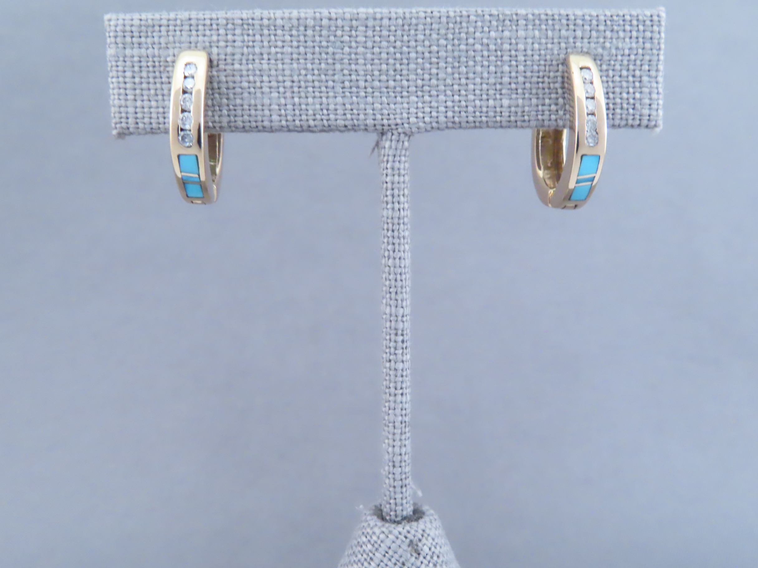Diamonds & Turquoise Earrings!  GORGEOUS 14kt Gold ‘huggies’ earrings, with diamonds & turquoise inlay.  Made by Native American jewelry artist, Peterson Chee (Navajo).  5 sparkling diamonds in each earring perfectly sing with the gold + blue turquoise.  Fine Native American Jewelry.