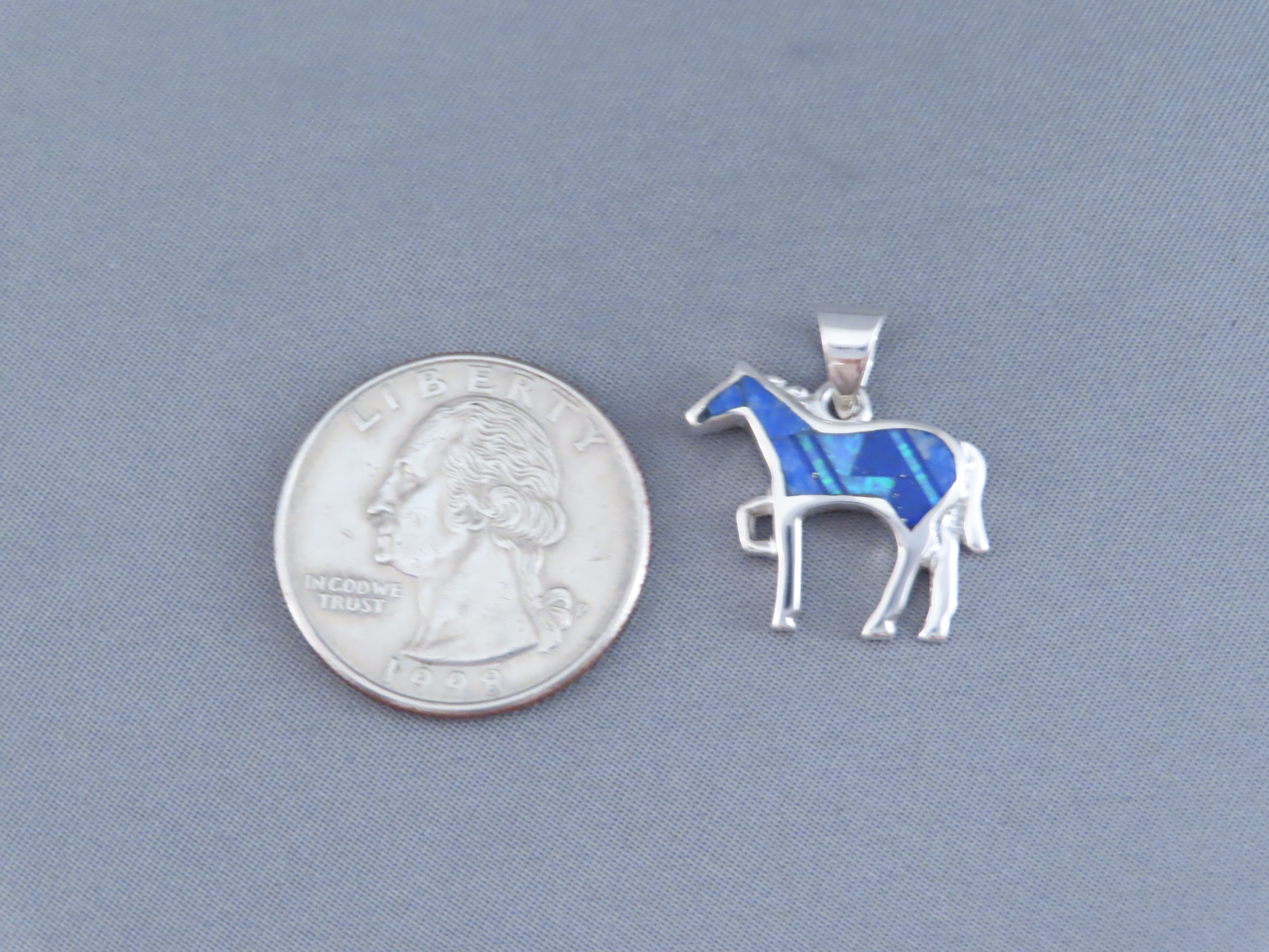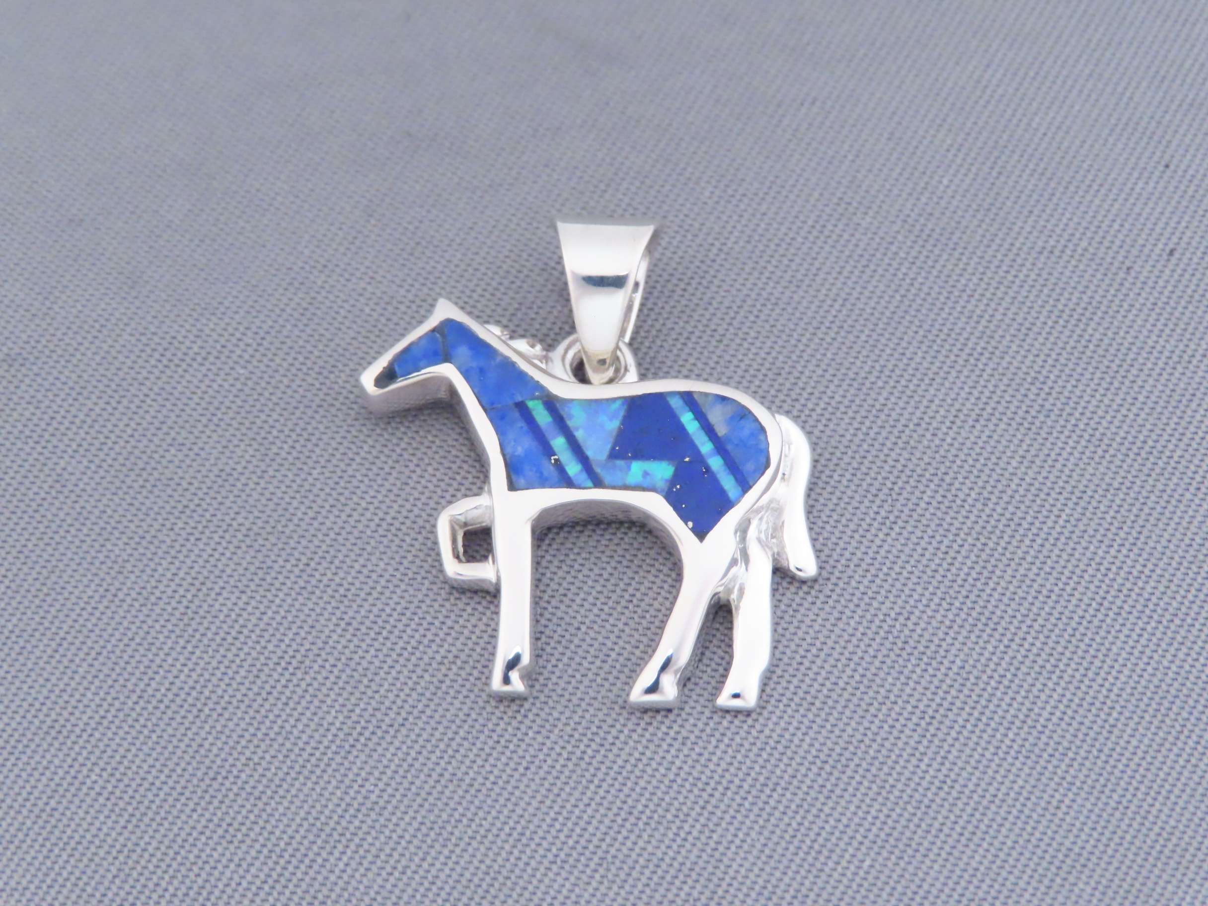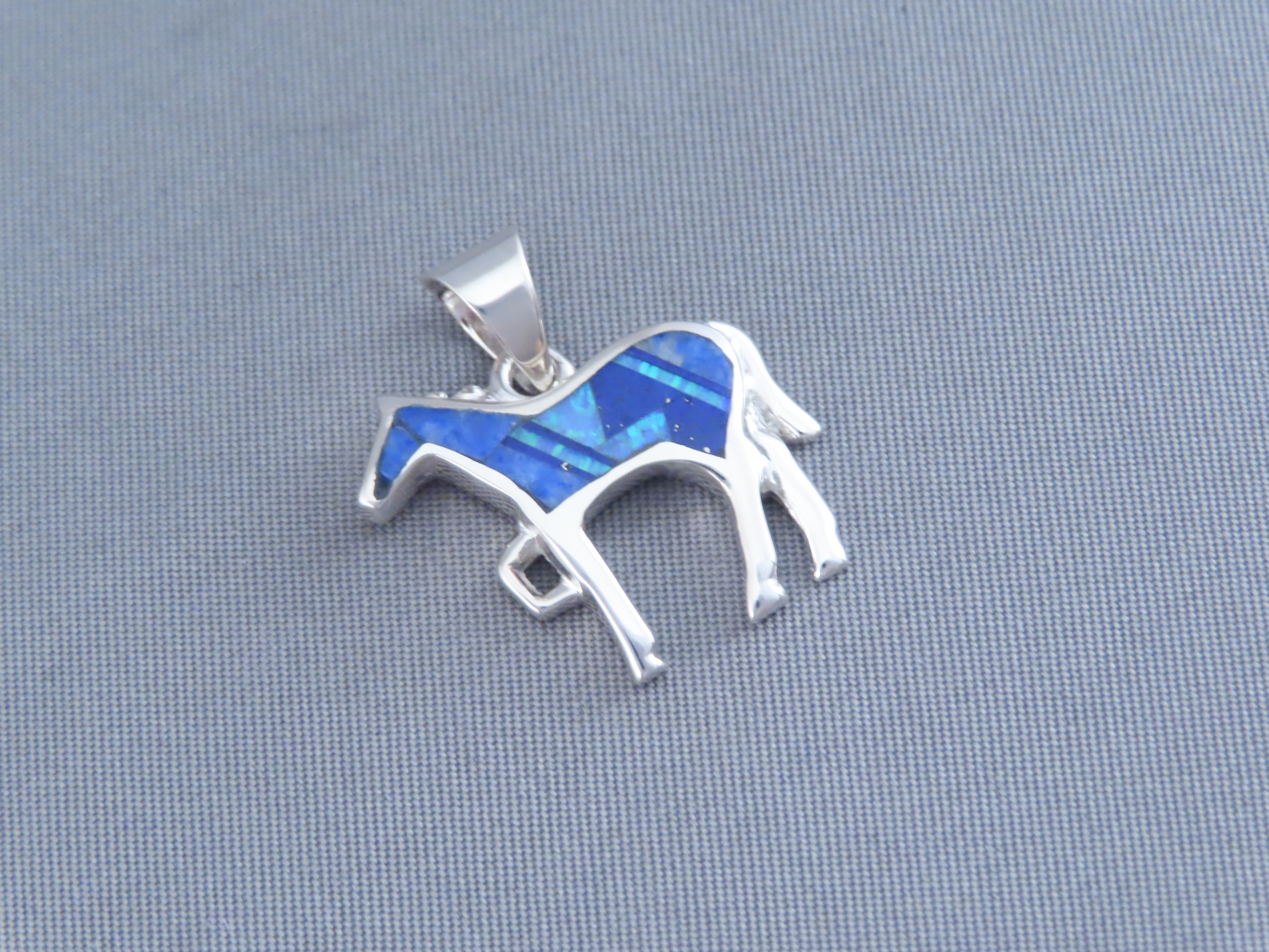 Tiny Inlay Horse Pendant! This sterling silver pendant in the shape of a little horse features beautifully inlaid Lapis & Cultured Opal stones. Made by Native American (Navajo) jewelry artist, Peterson Chee. A VERY eye-catching color combination!