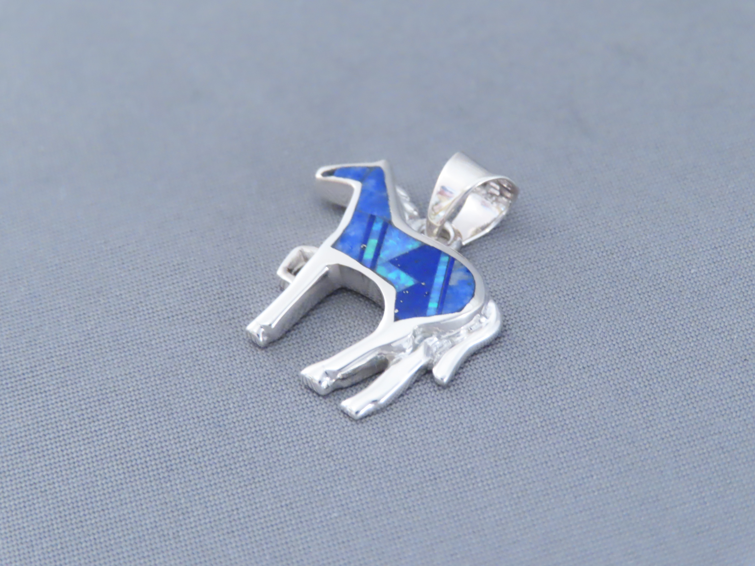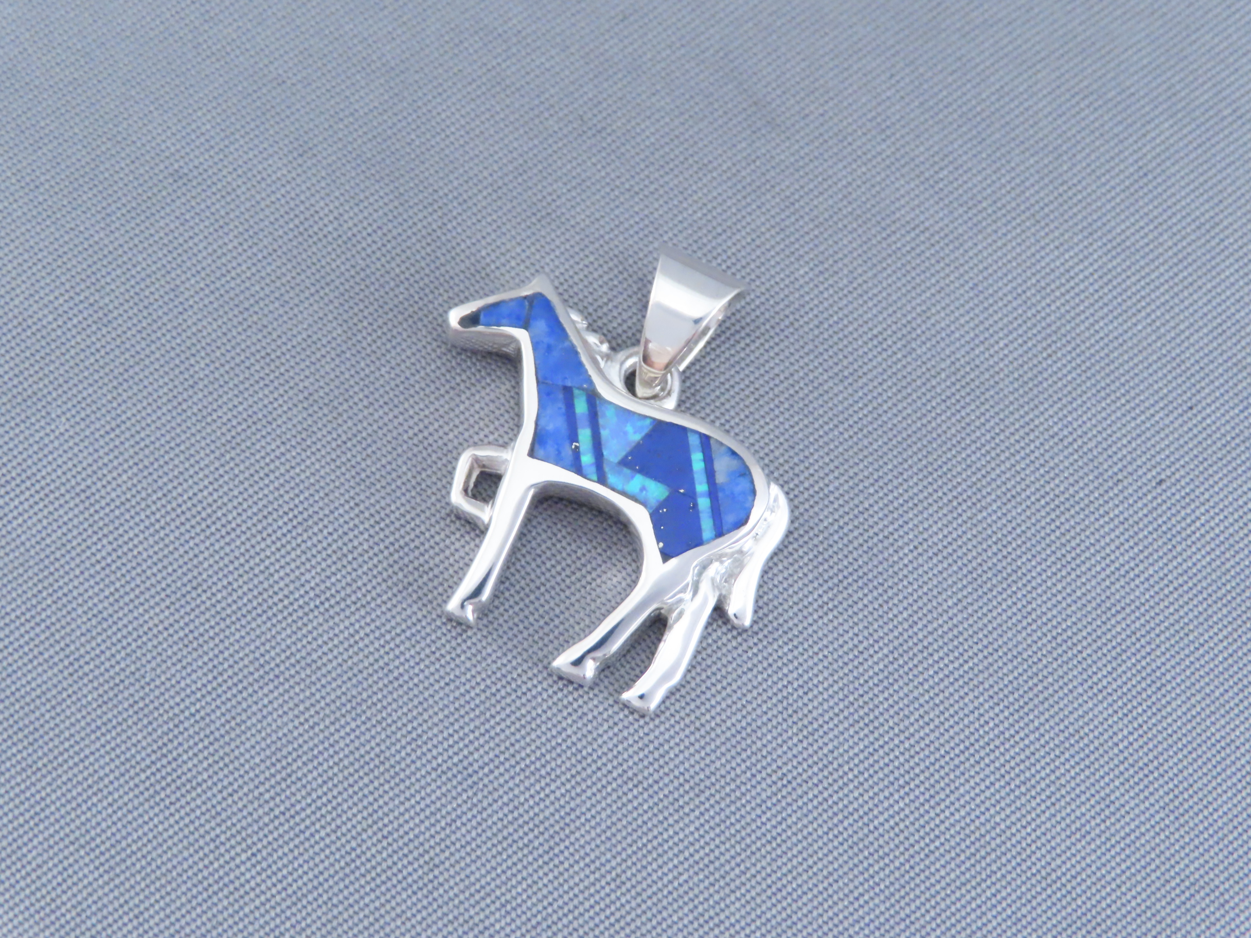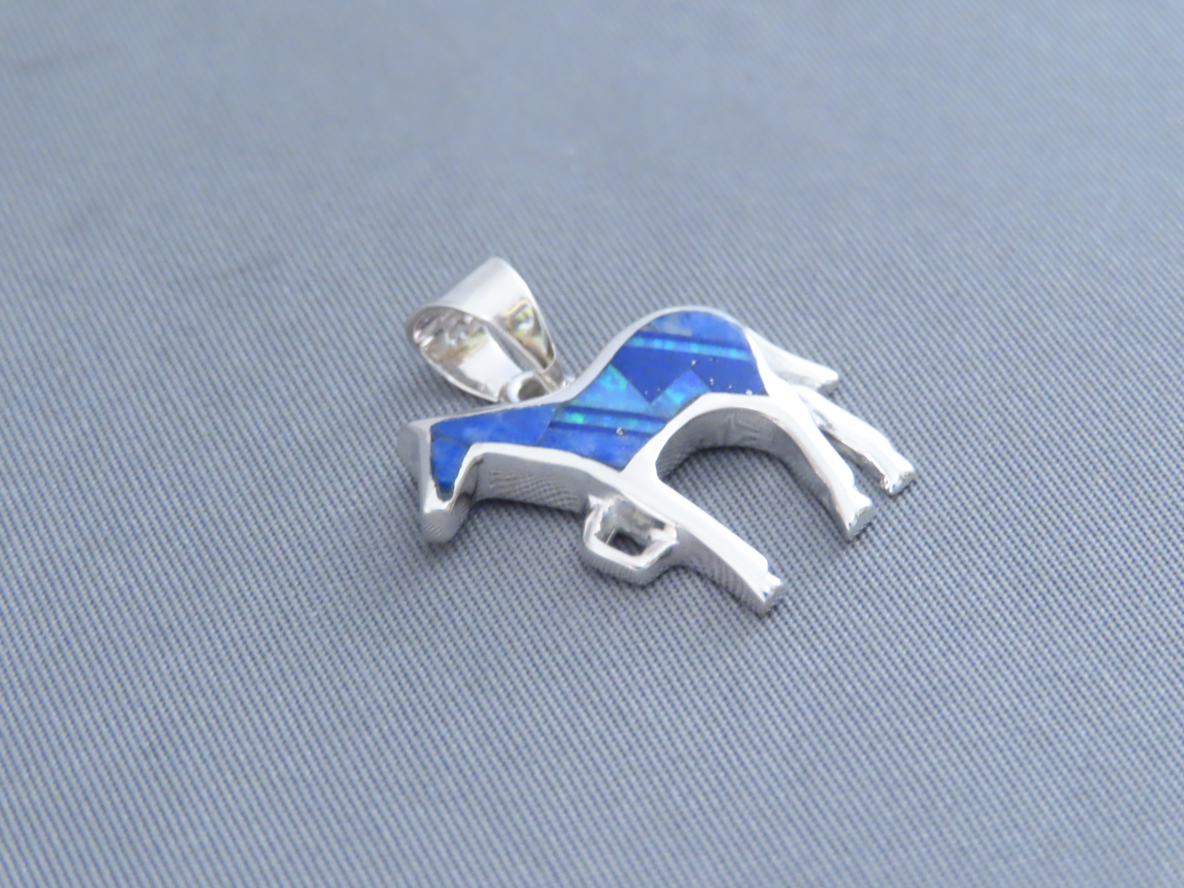 Tiny Inlay Horse Pendant! This sterling silver pendant in the shape of a little horse features beautifully inlaid Lapis & Cultured Opal stones. Made by Native American (Navajo) jewelry artist, Peterson Chee. A VERY eye-catching color combination!