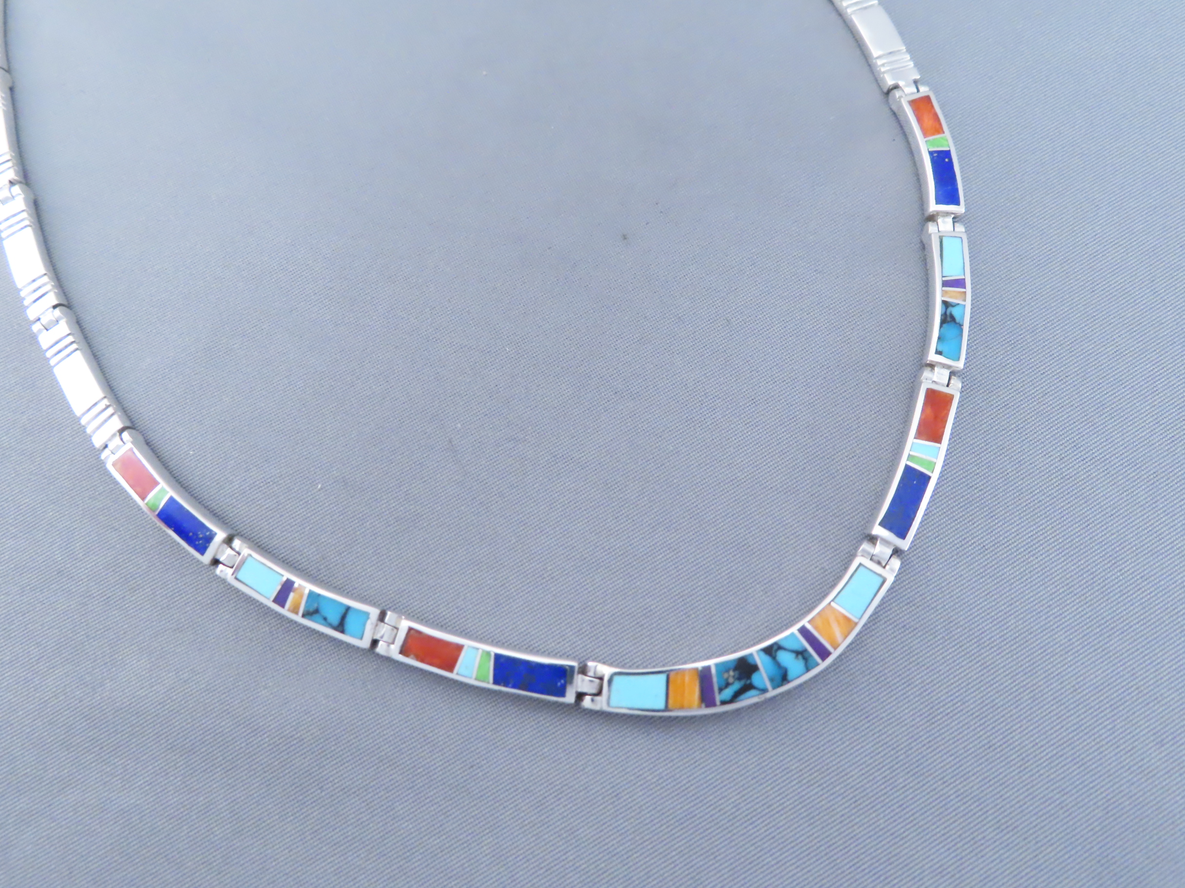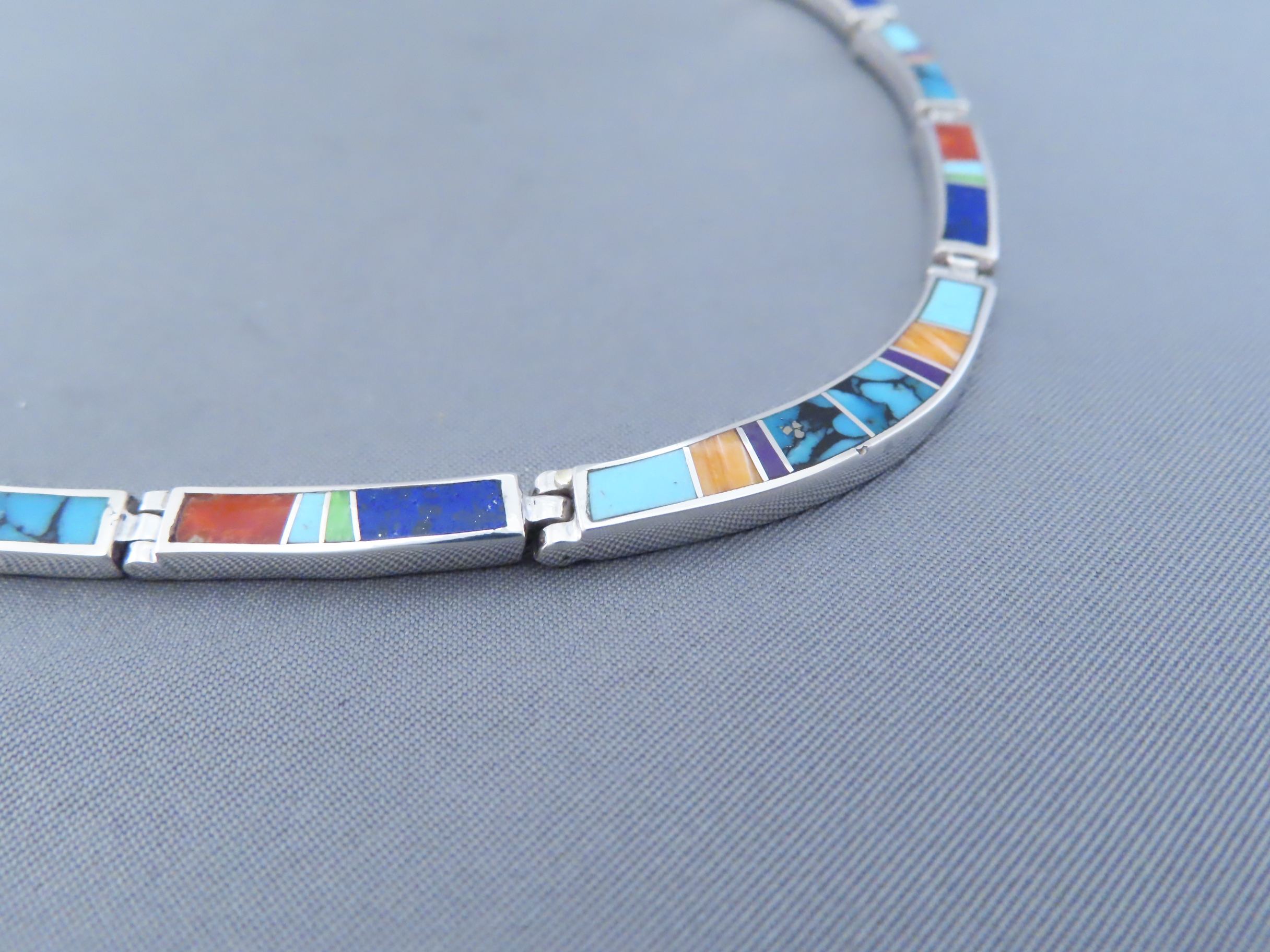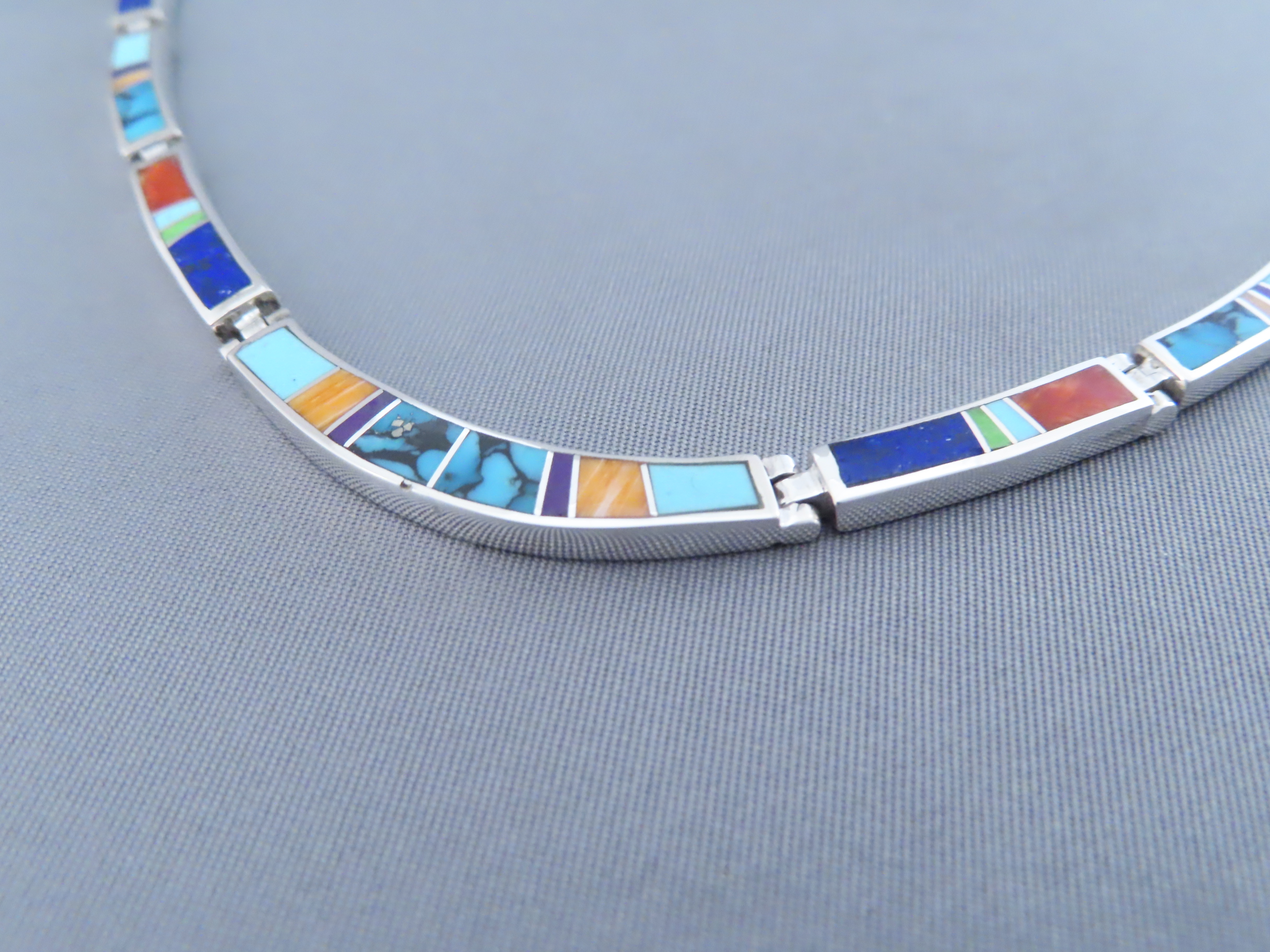 Colorful Inlay Necklace!  Sterling silver inlay necklace with beautifully inlaid Turquoise, Lapis, Spiny Oyster, Sugilite, and Gaspeite stones.  Lovely necklace made by Navajo jewelry artist, Charles Willie.  VERY nicely designed multi-color inlay necklace!