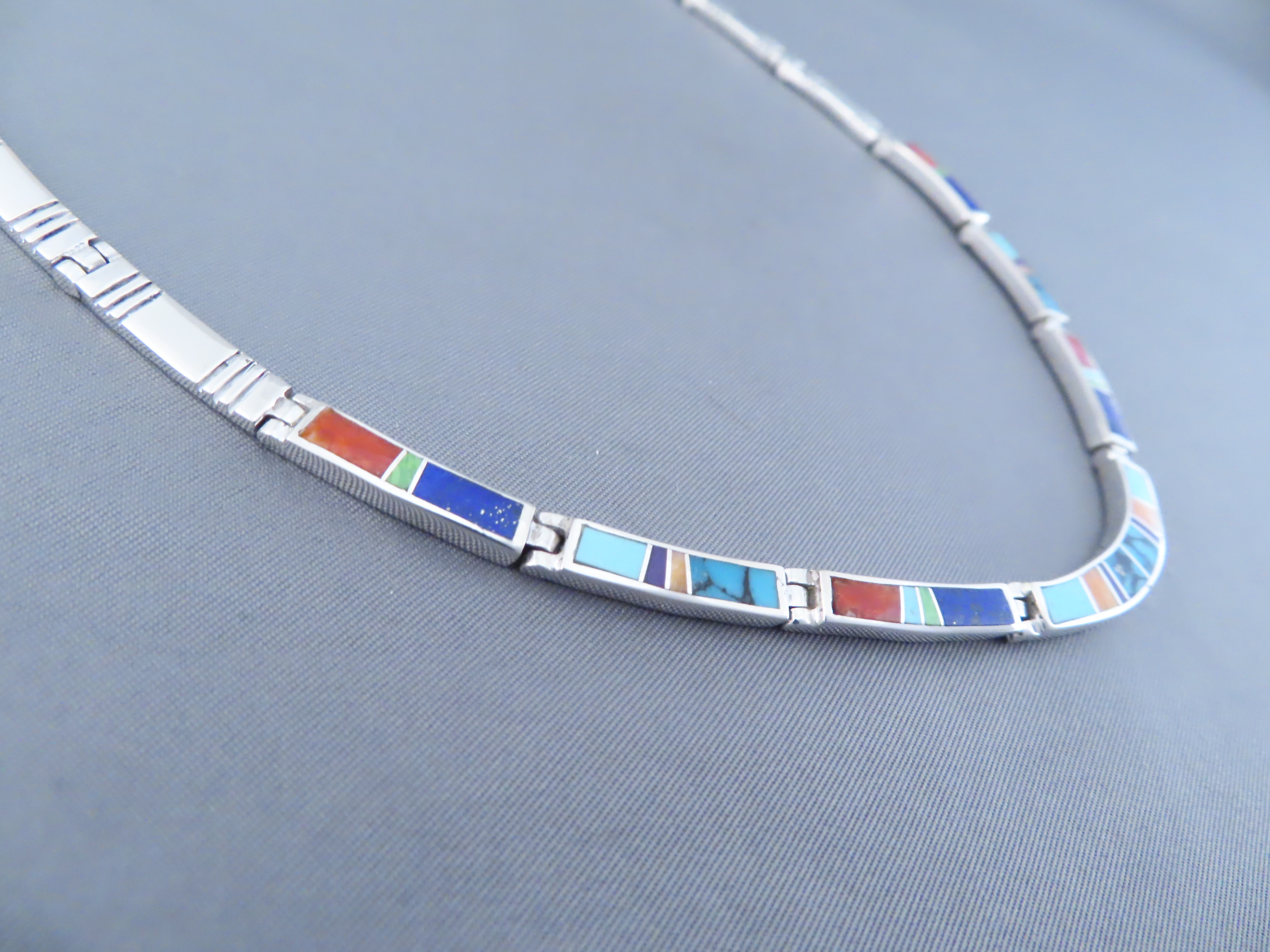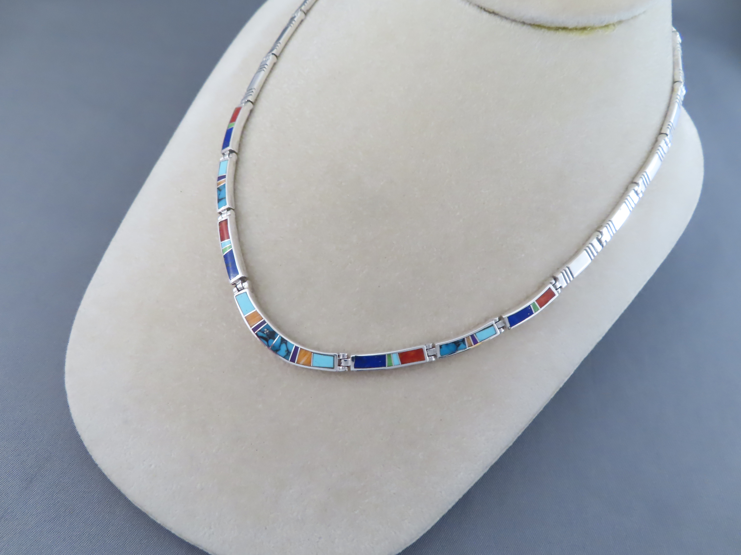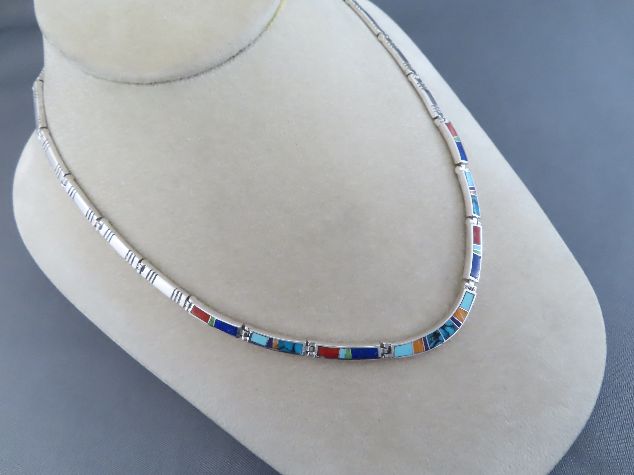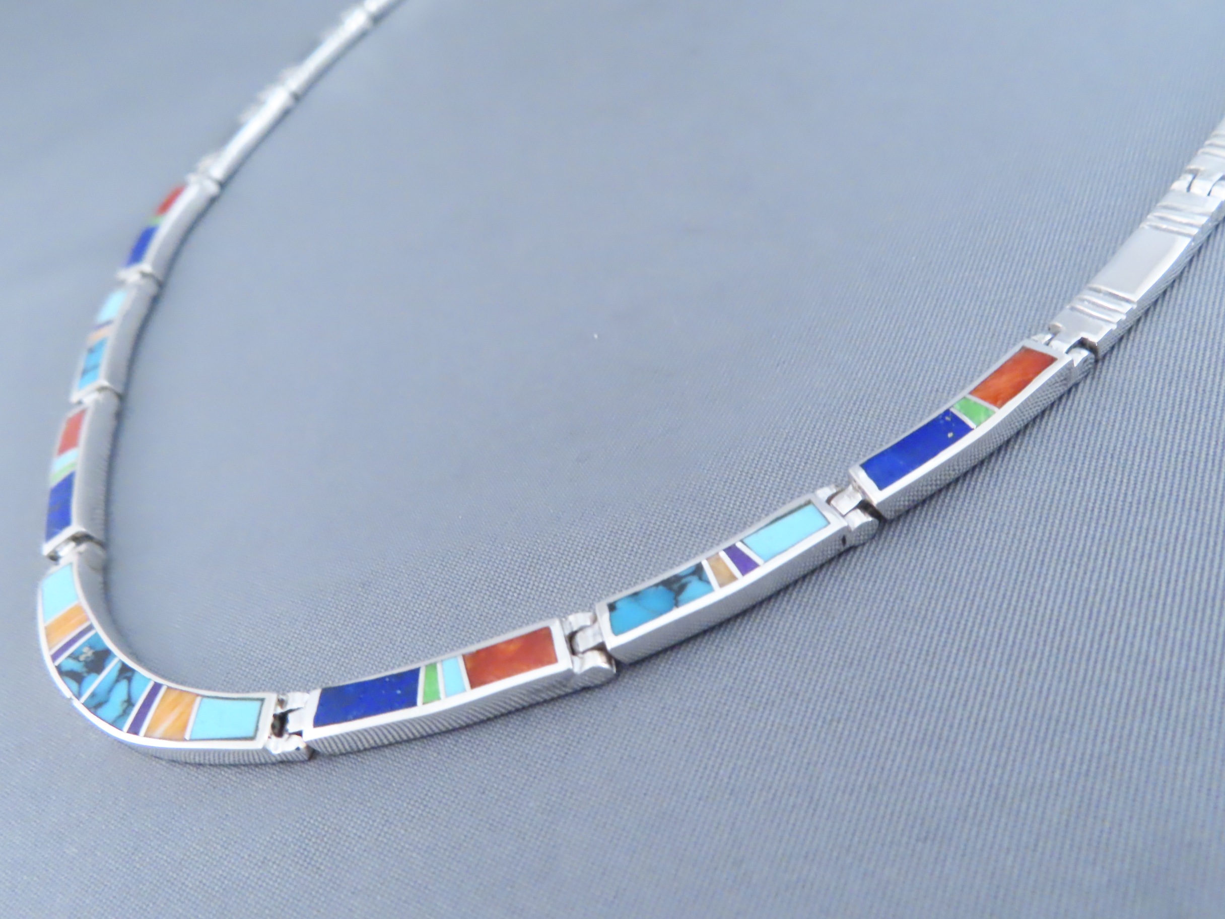 Colorful Inlay Necklace!  Sterling silver inlay necklace with beautifully inlaid Turquoise, Lapis, Spiny Oyster, Sugilite, and Gaspeite stones.  Lovely necklace made by Navajo jewelry artist, Charles Willie.  VERY nicely designed multi-color inlay necklace!