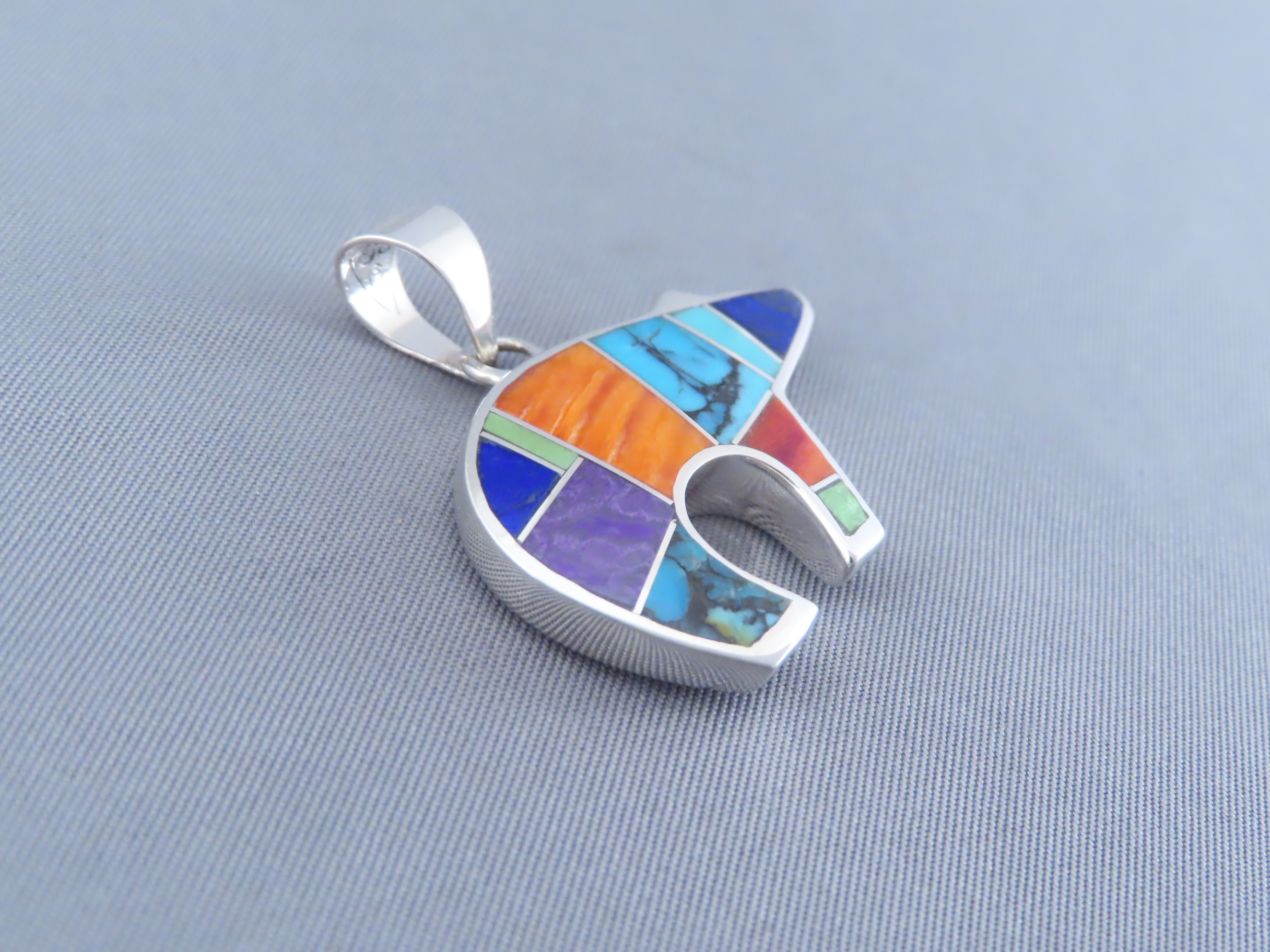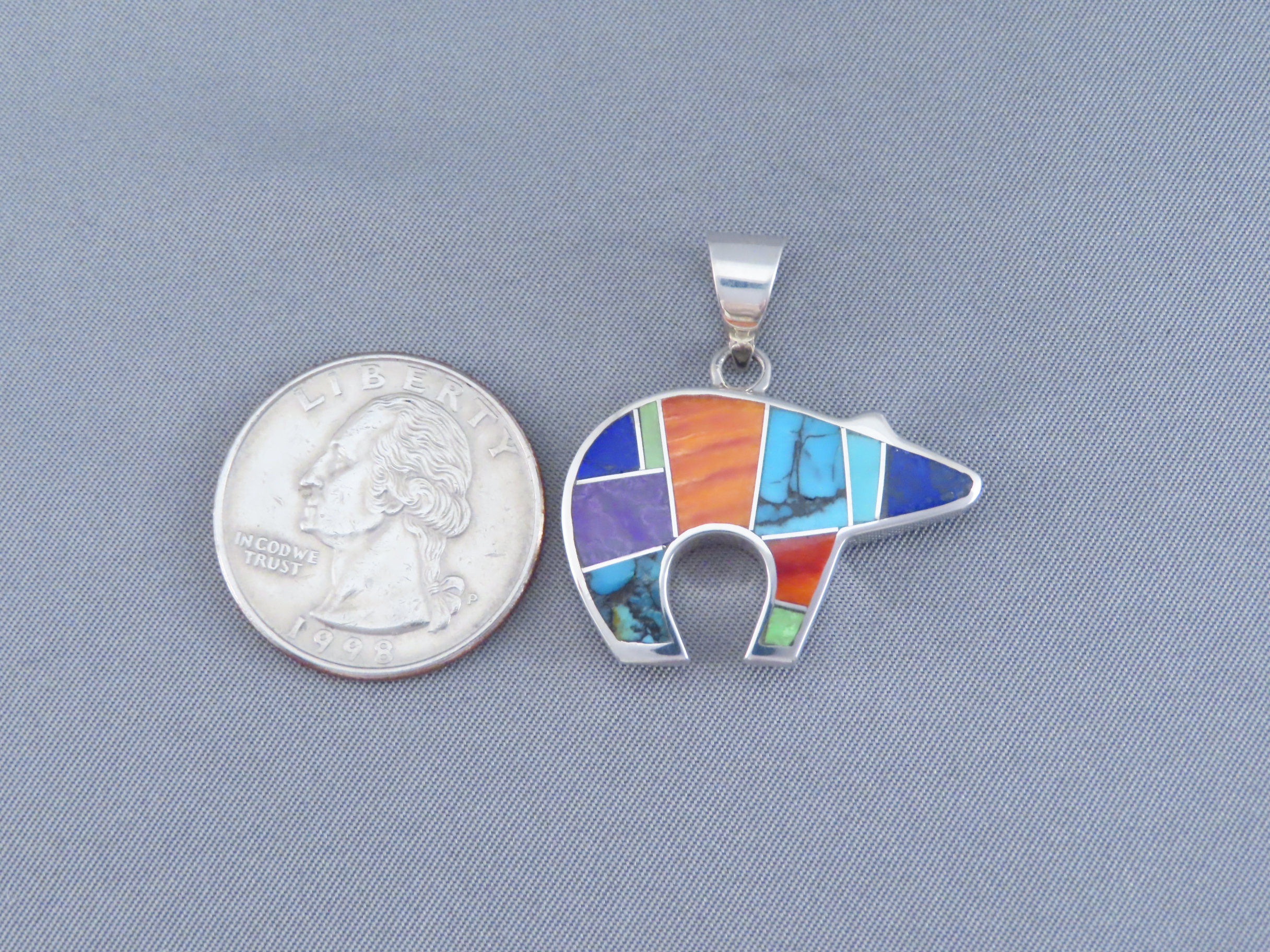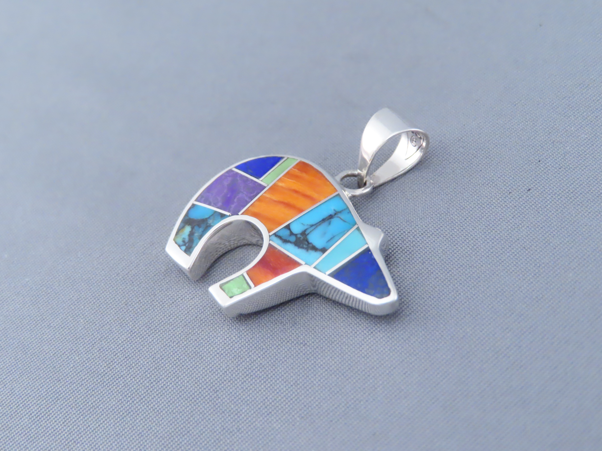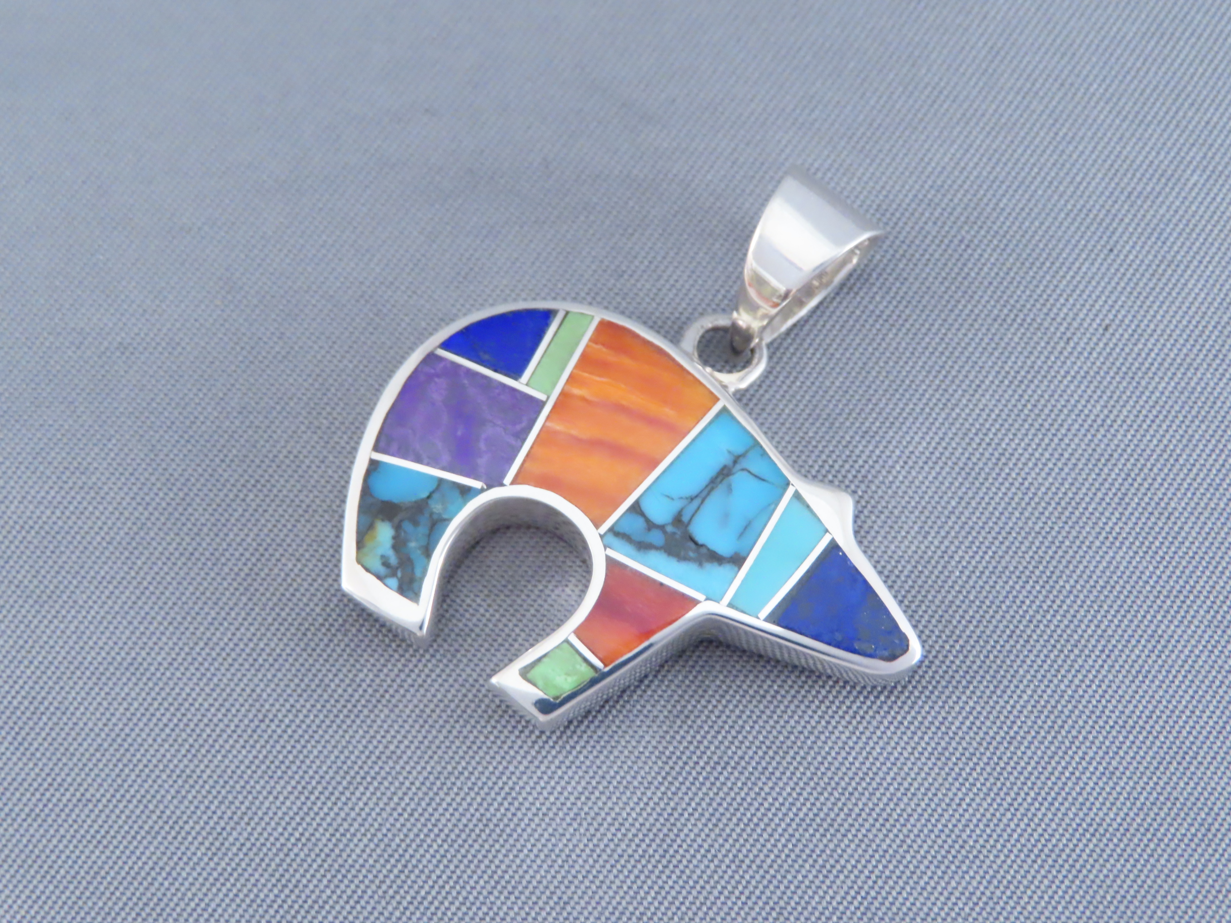 Multi-Color Inlay ‘BEAR’ Pendant! This medium-size sterling silver inlay pendant in the shape of a bear by Native American jewelry artist, Peterson Chee (Navajo), features finely inlaid Turquoise, Lapis, Spiny Oyster Shell, Gaspeite, and Sugilite stones. Bright, fun, and attractive colors that can be coordinated with almost any attire! LOVELY inlay bear pendant.