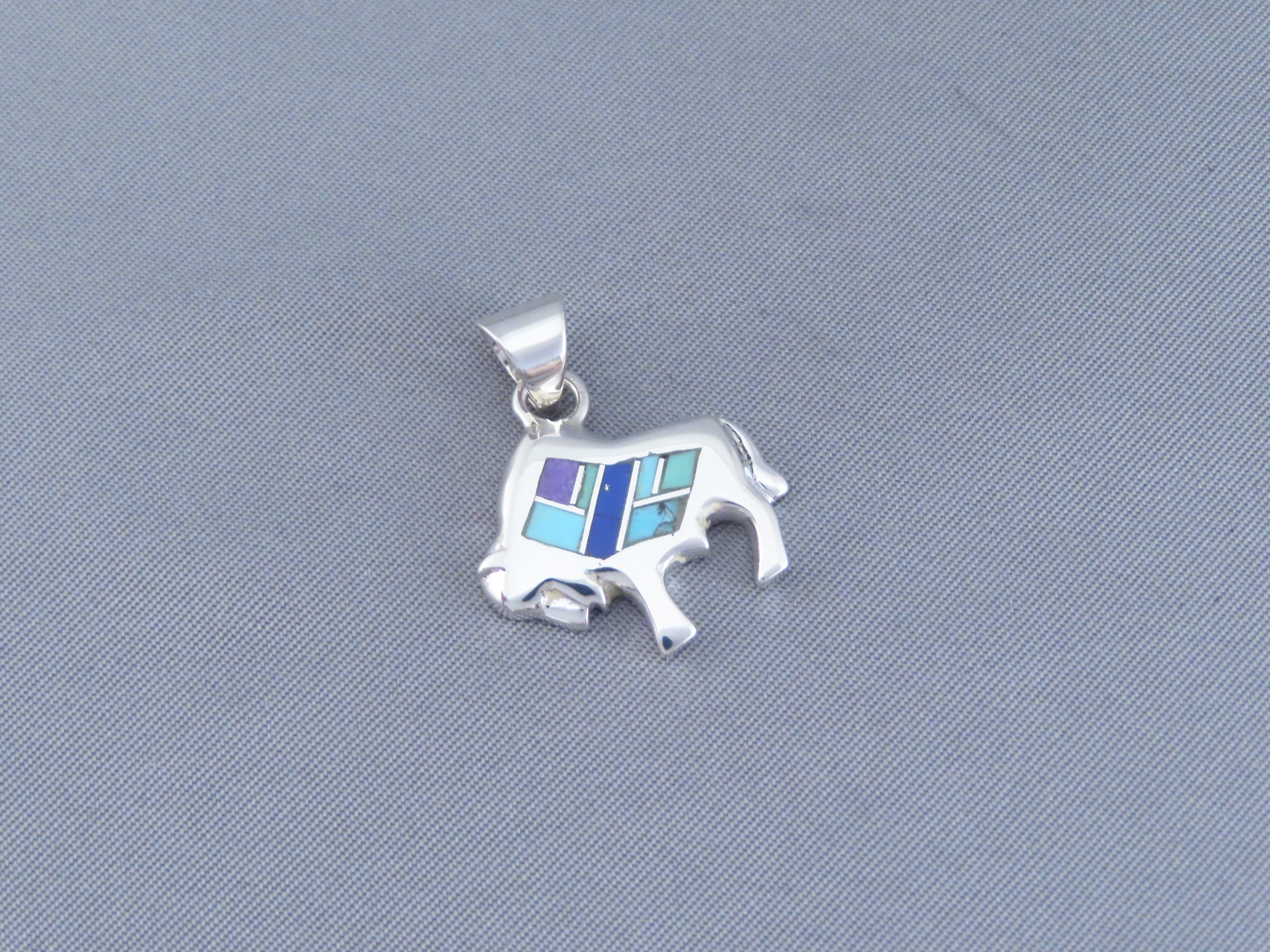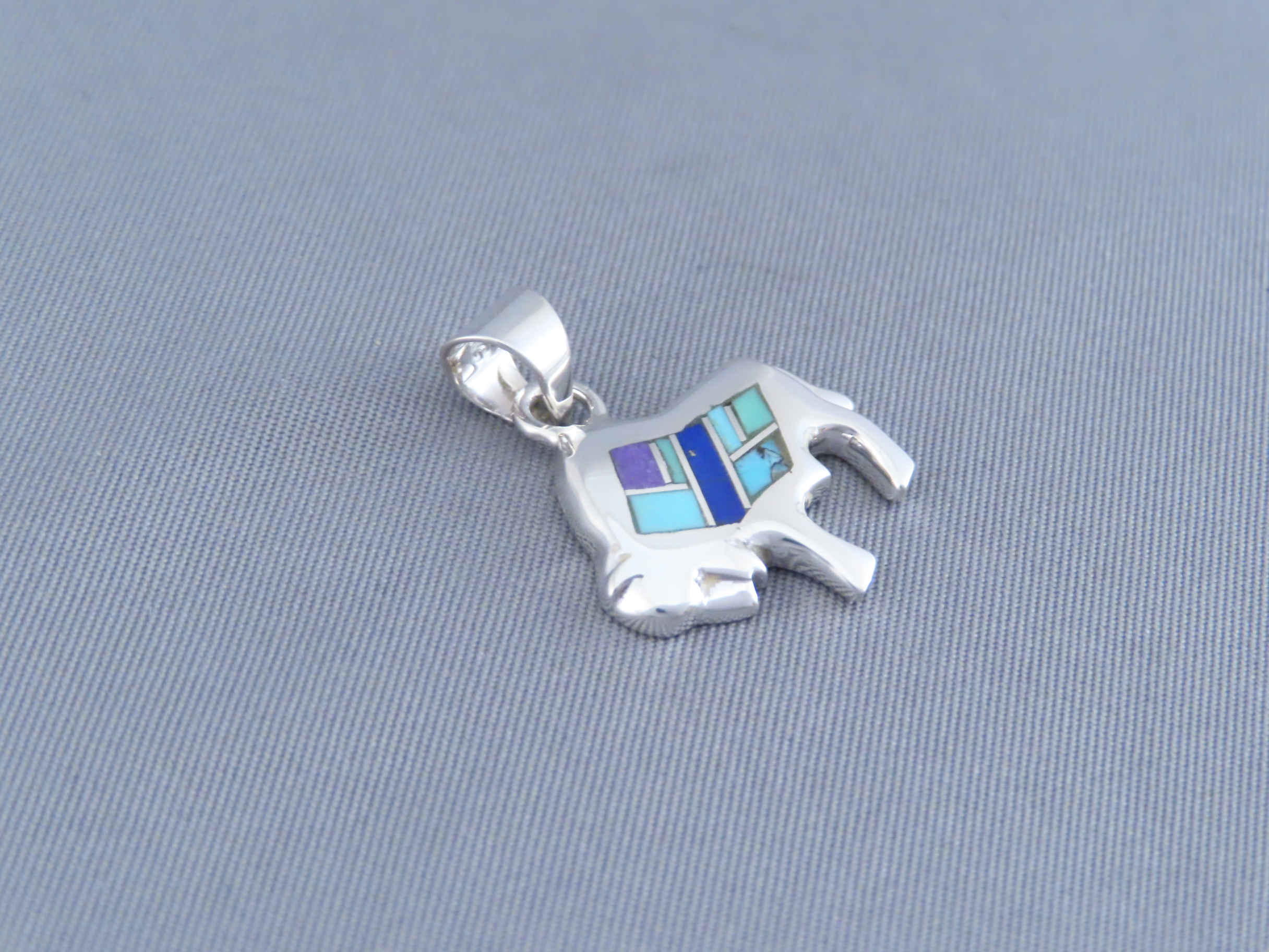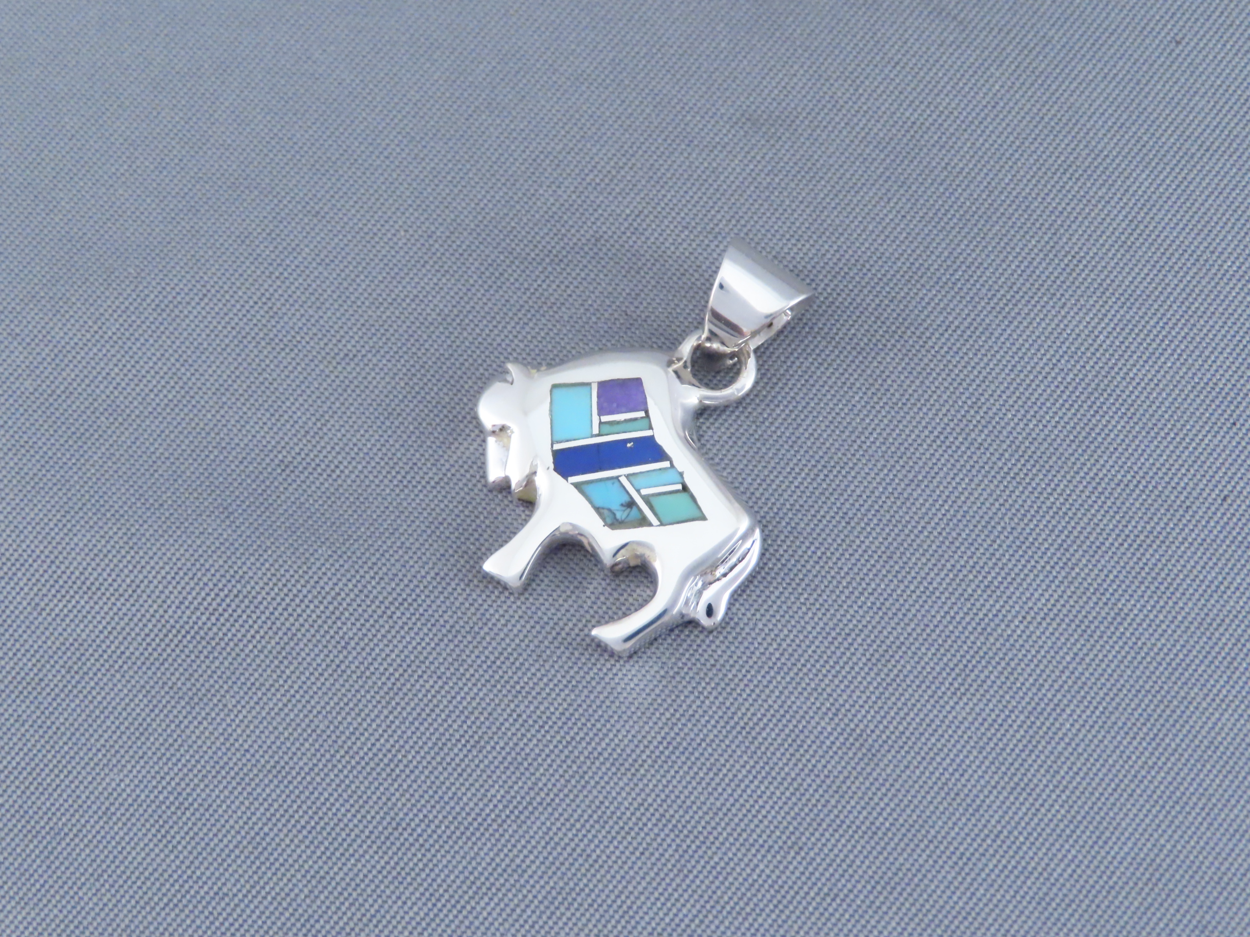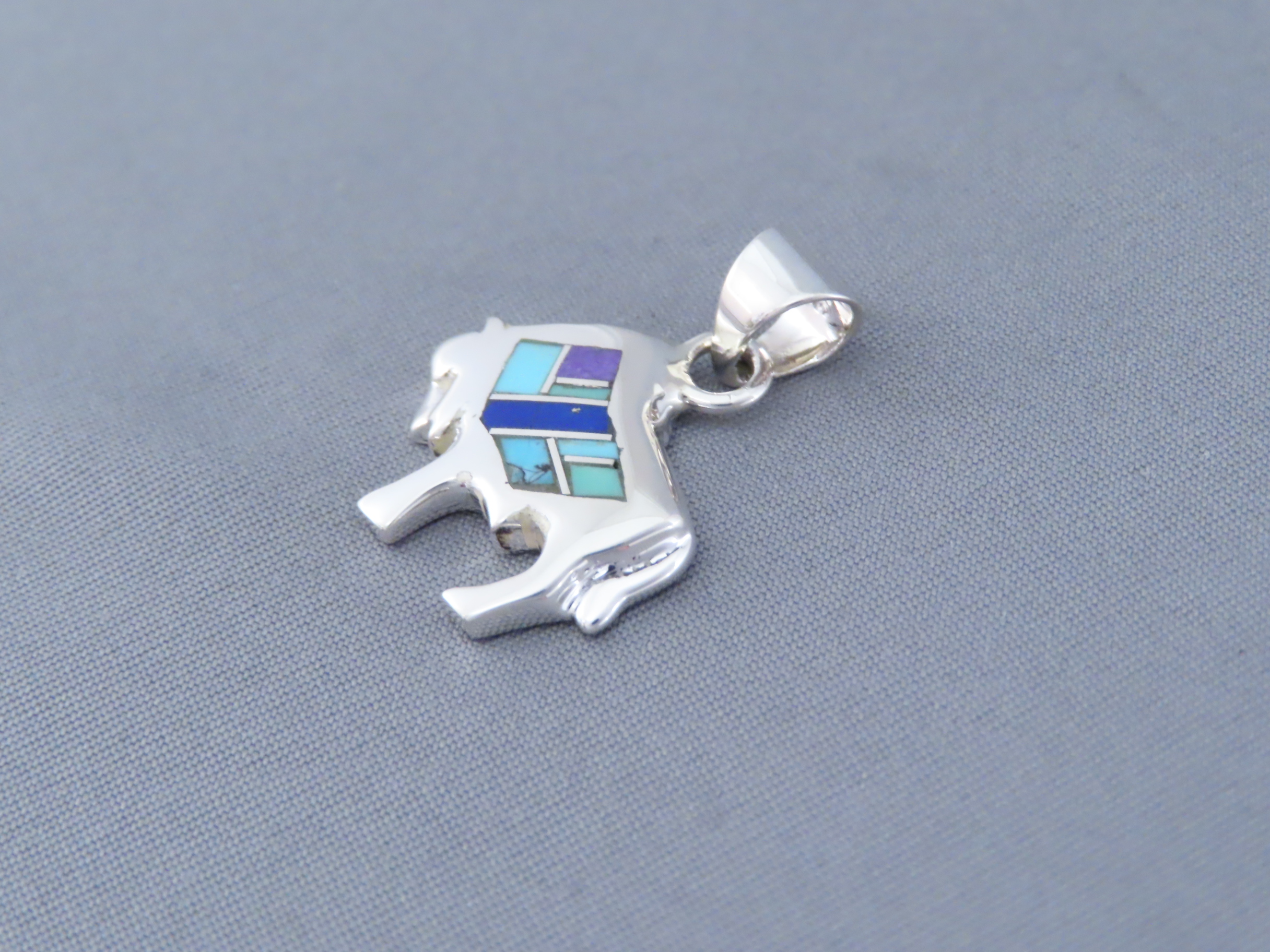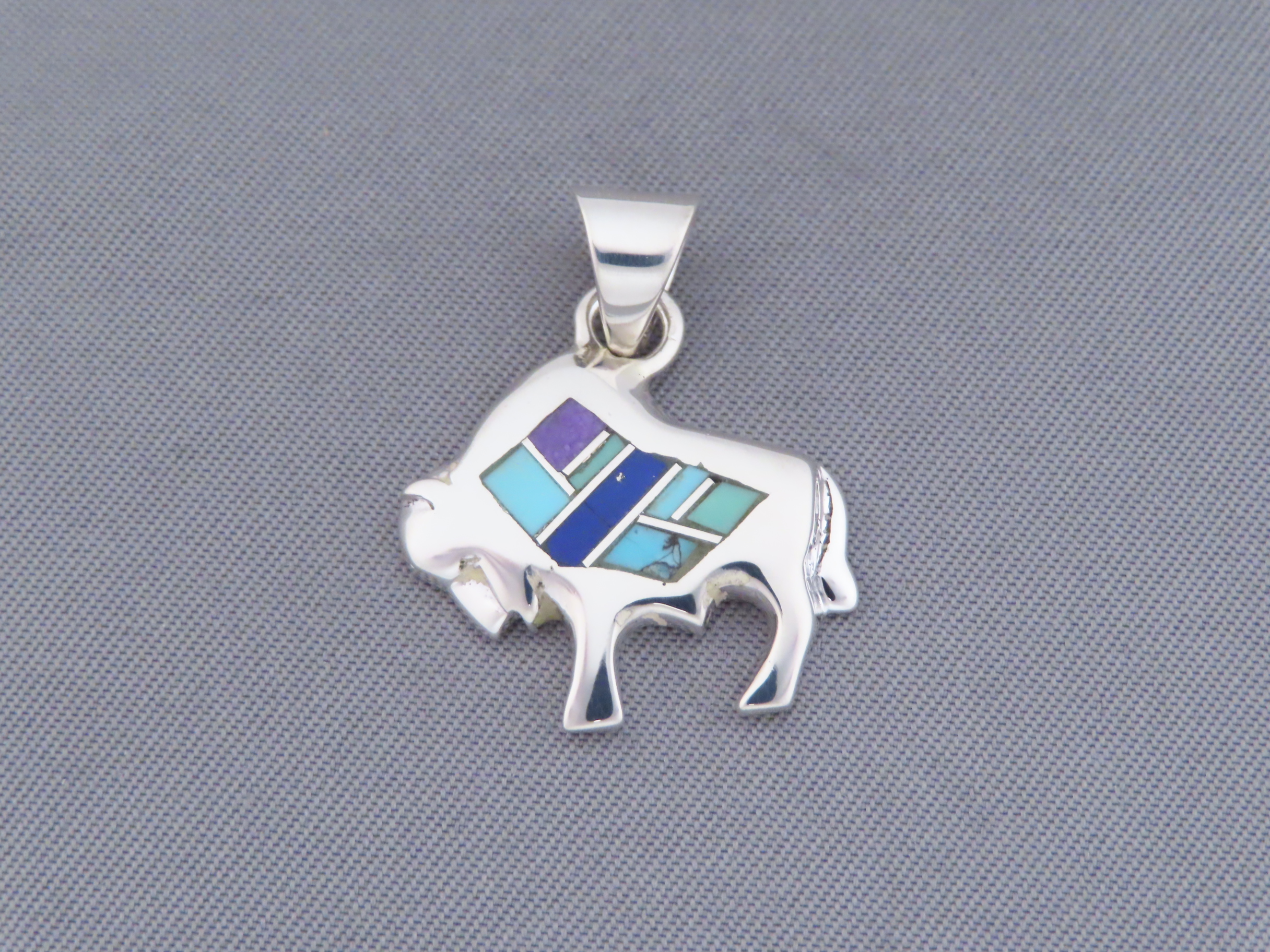 This sterling silver Bison pendant features inlaid Turquoise, Lapis, Sugilite, and Varicite stones. Beautiful Native American buffalo pendant by Navajo jewelry artist, Peterson Chee.
