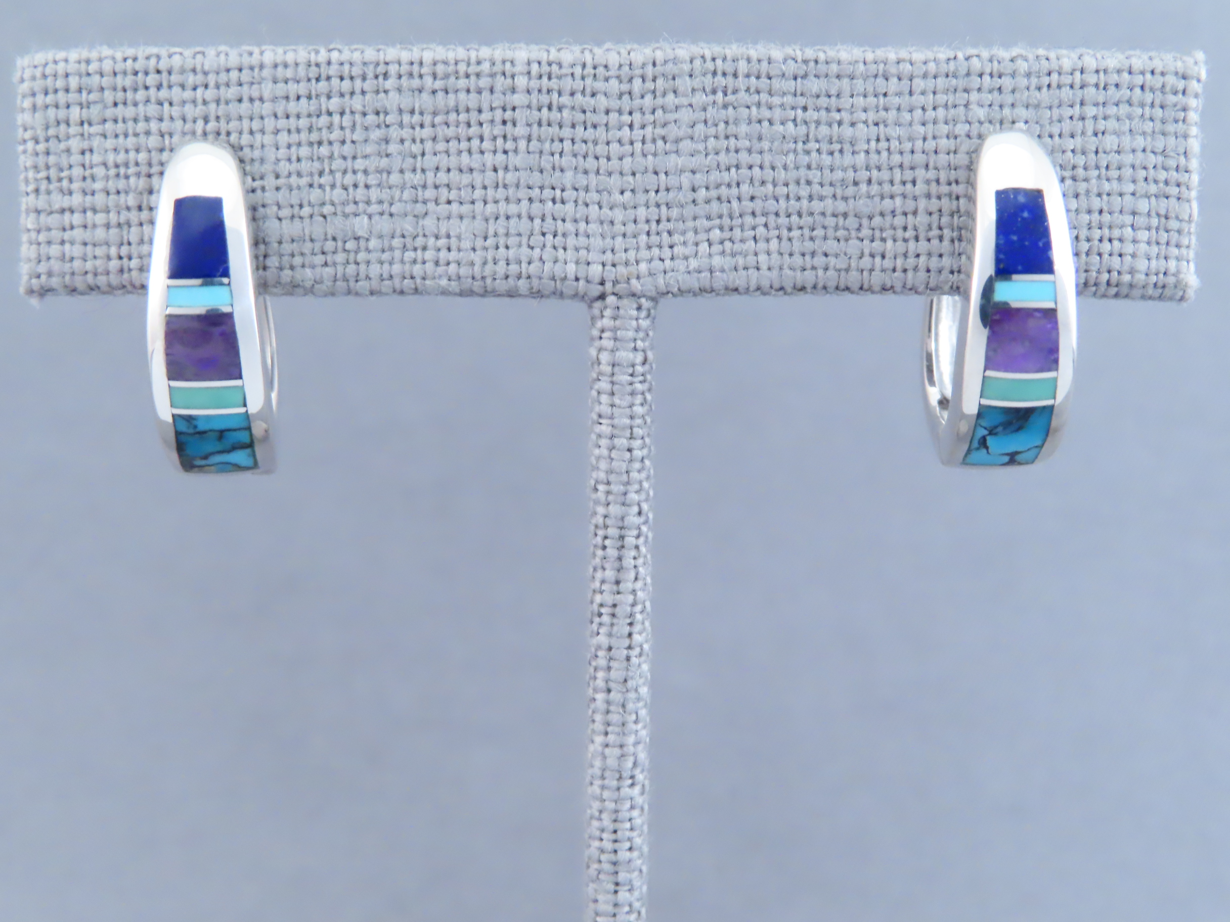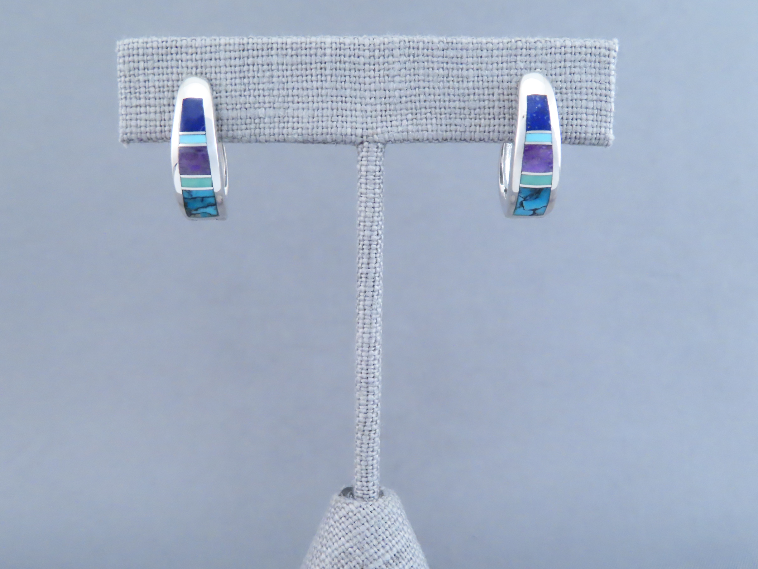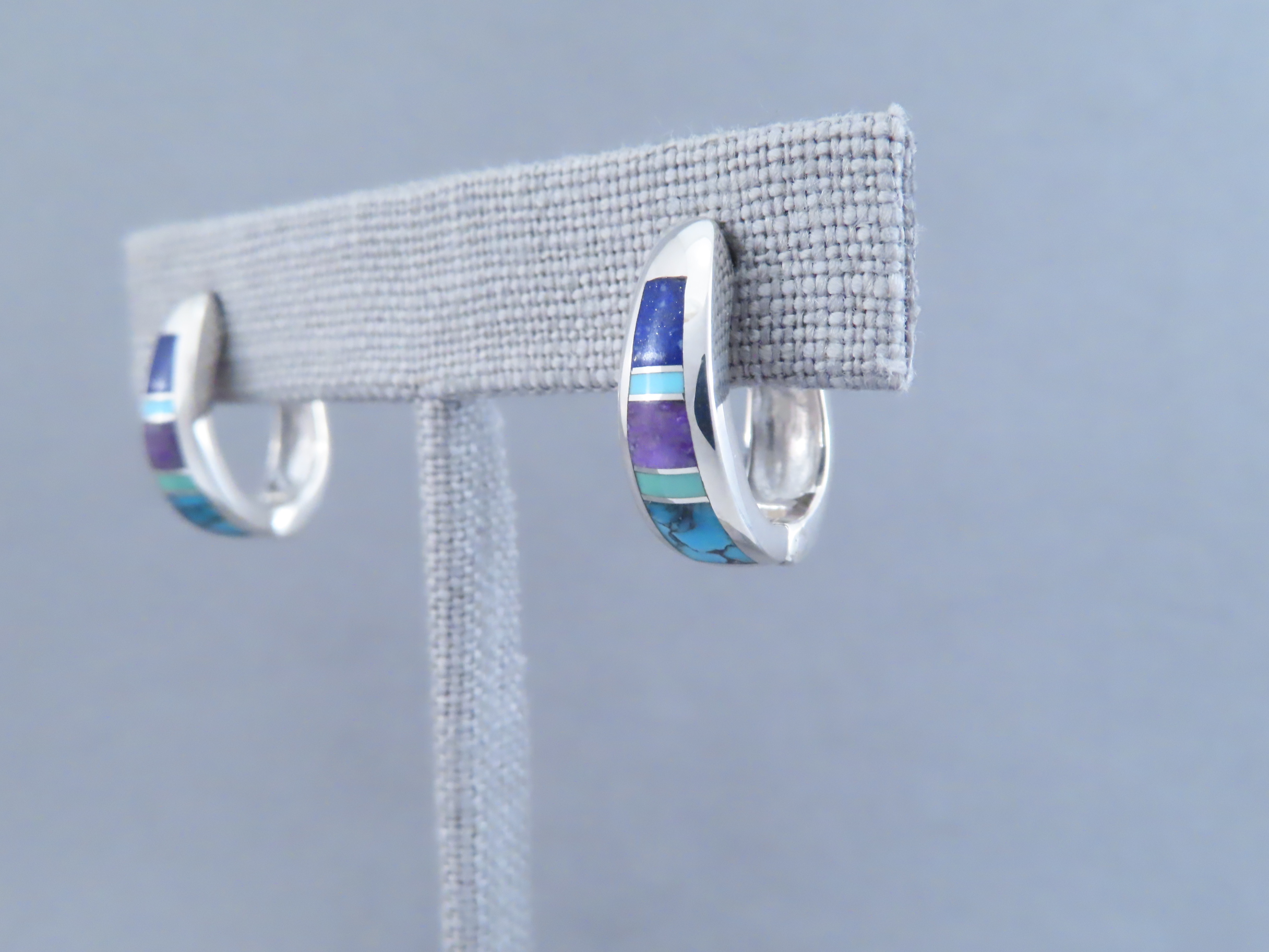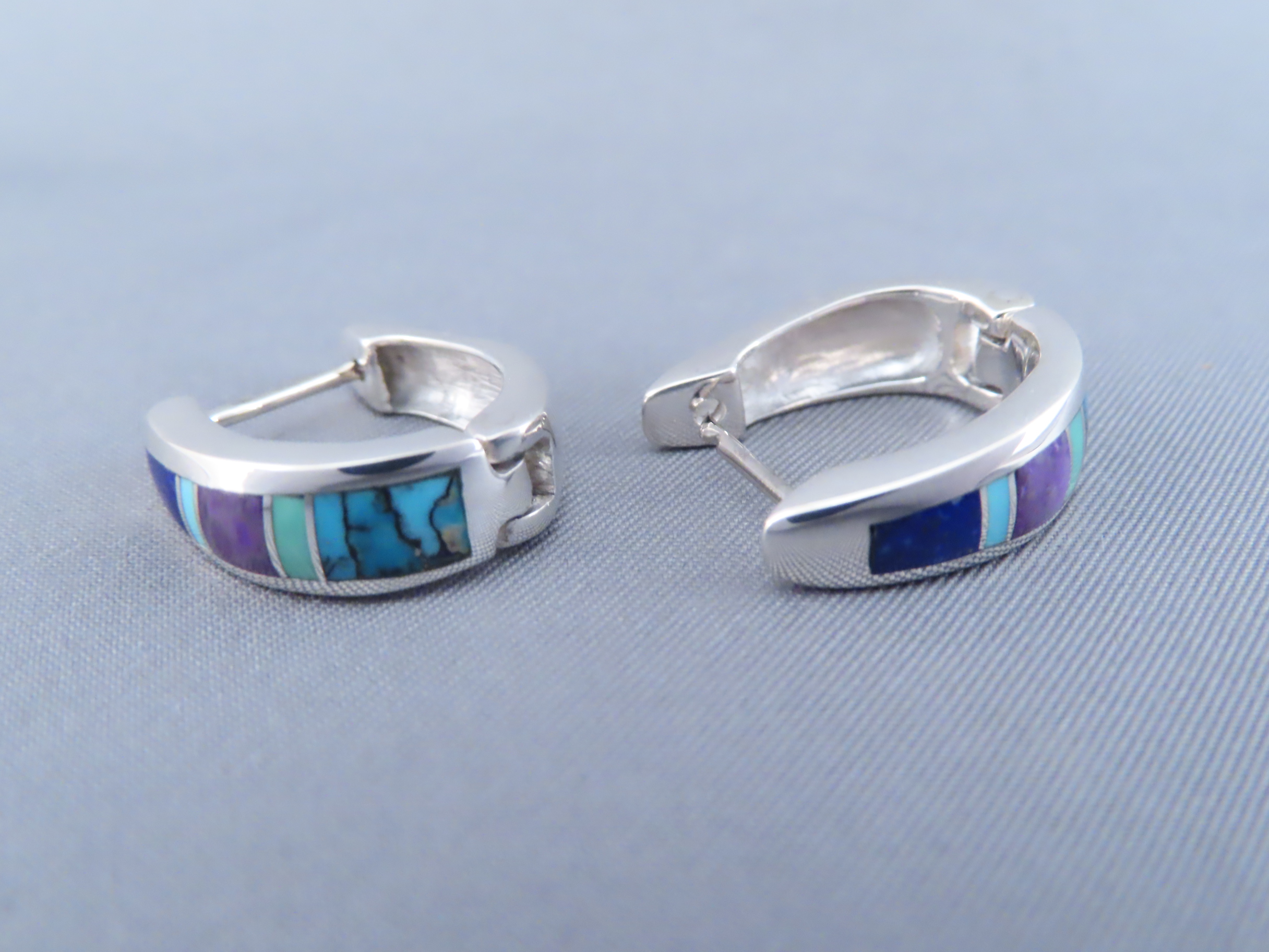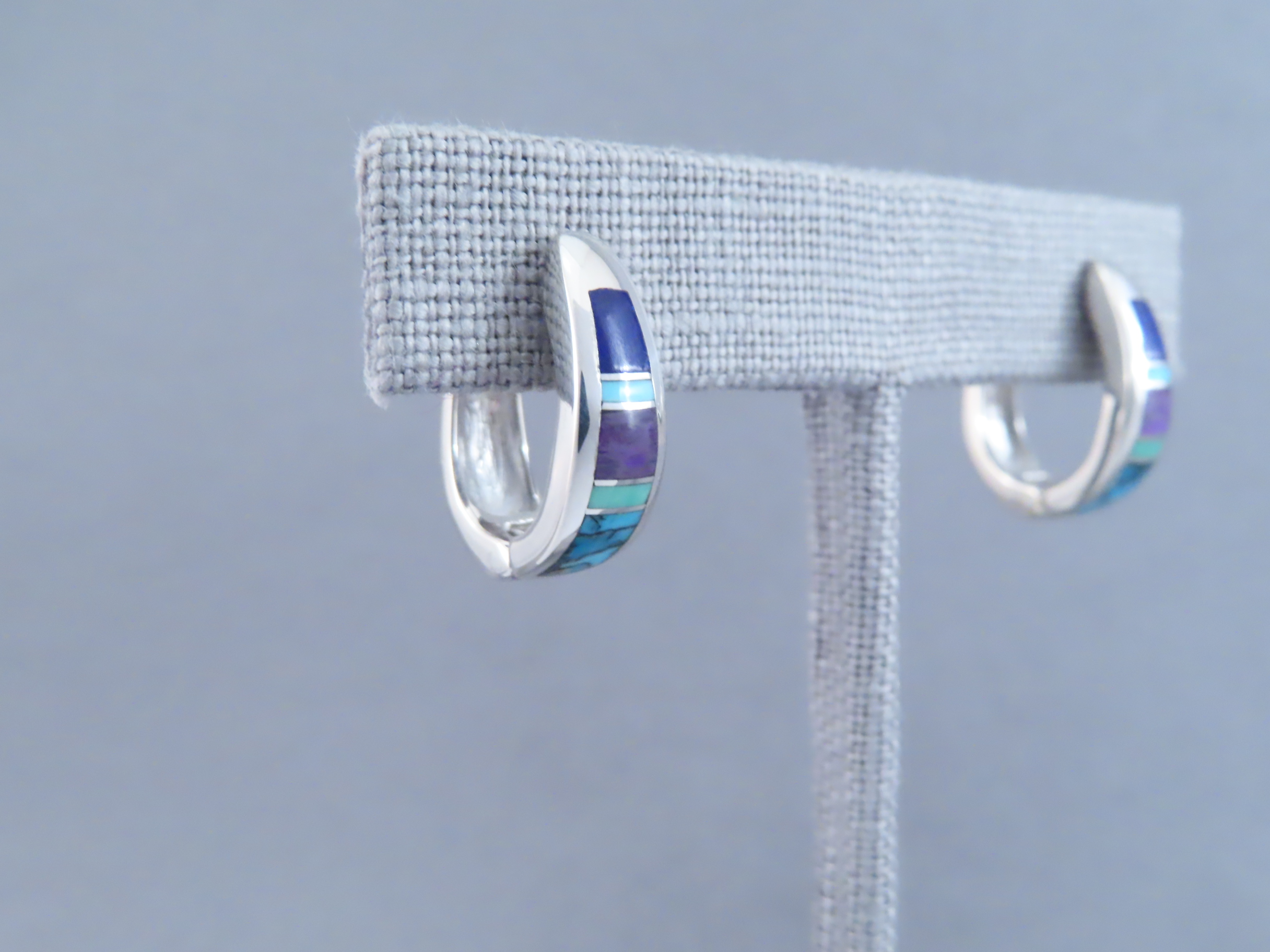 Inlaid Multi-Stone Earrings – Smaller ‘Huggies’! These sterling silver lever back post earrings (‘Huggies’) feature inlaid Turquoise, Sugilite, Varicite, and Lapis stones. Lovely Native American inlay jewelry by Charles Willie (Navajo).