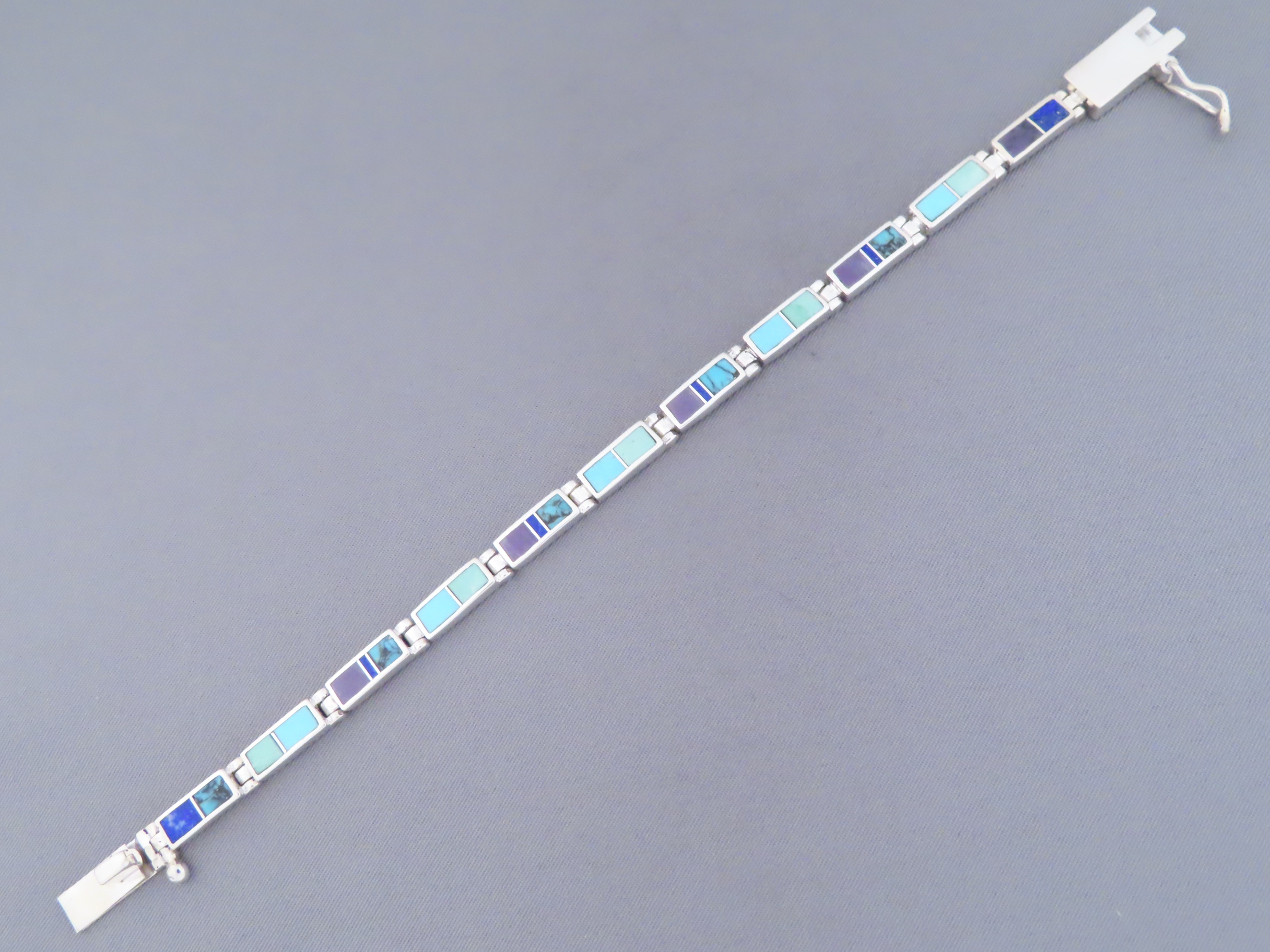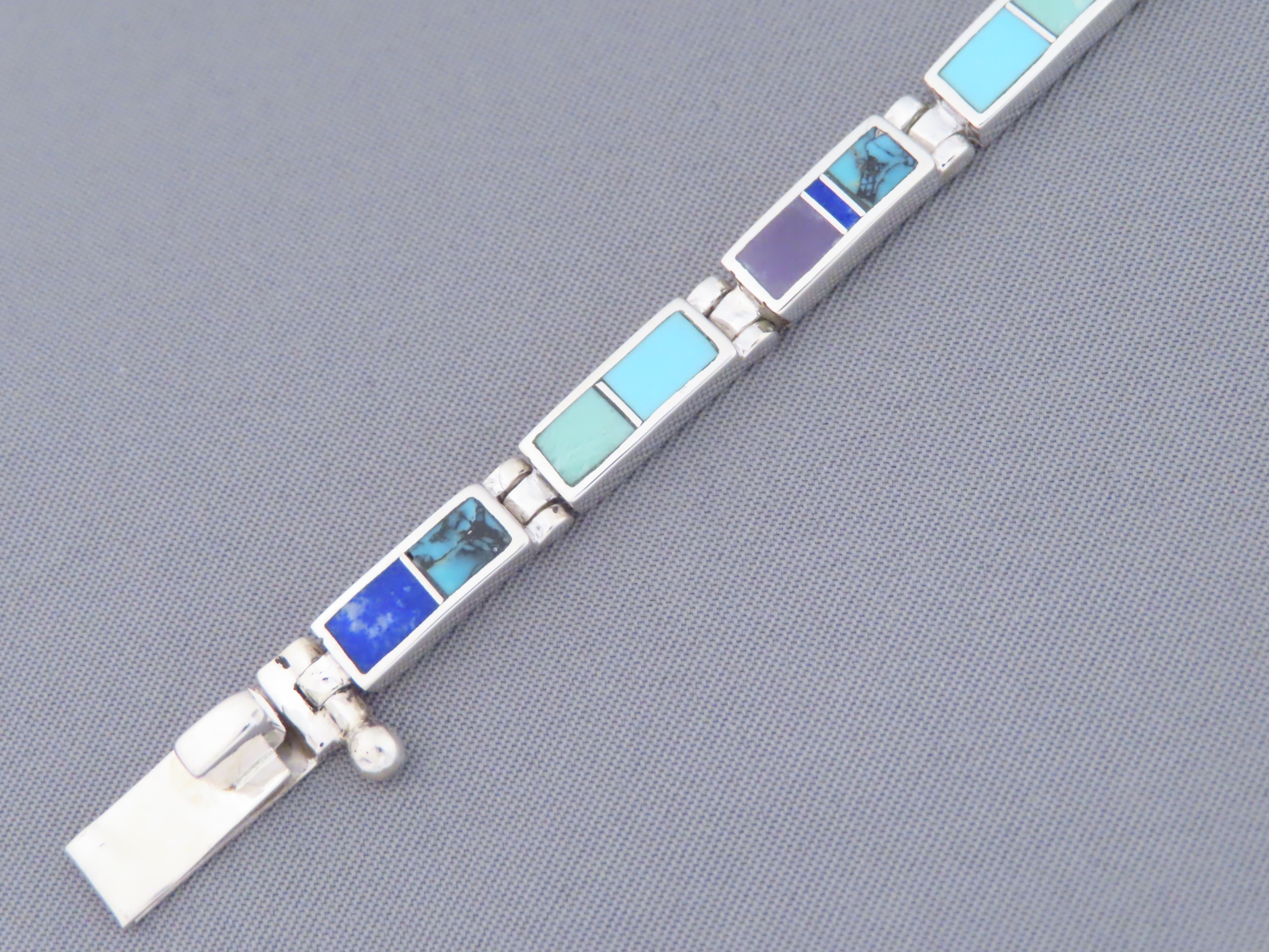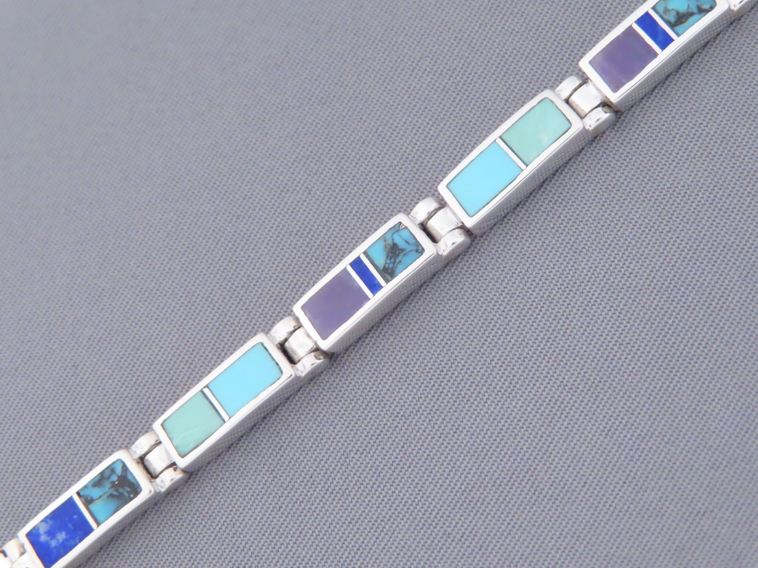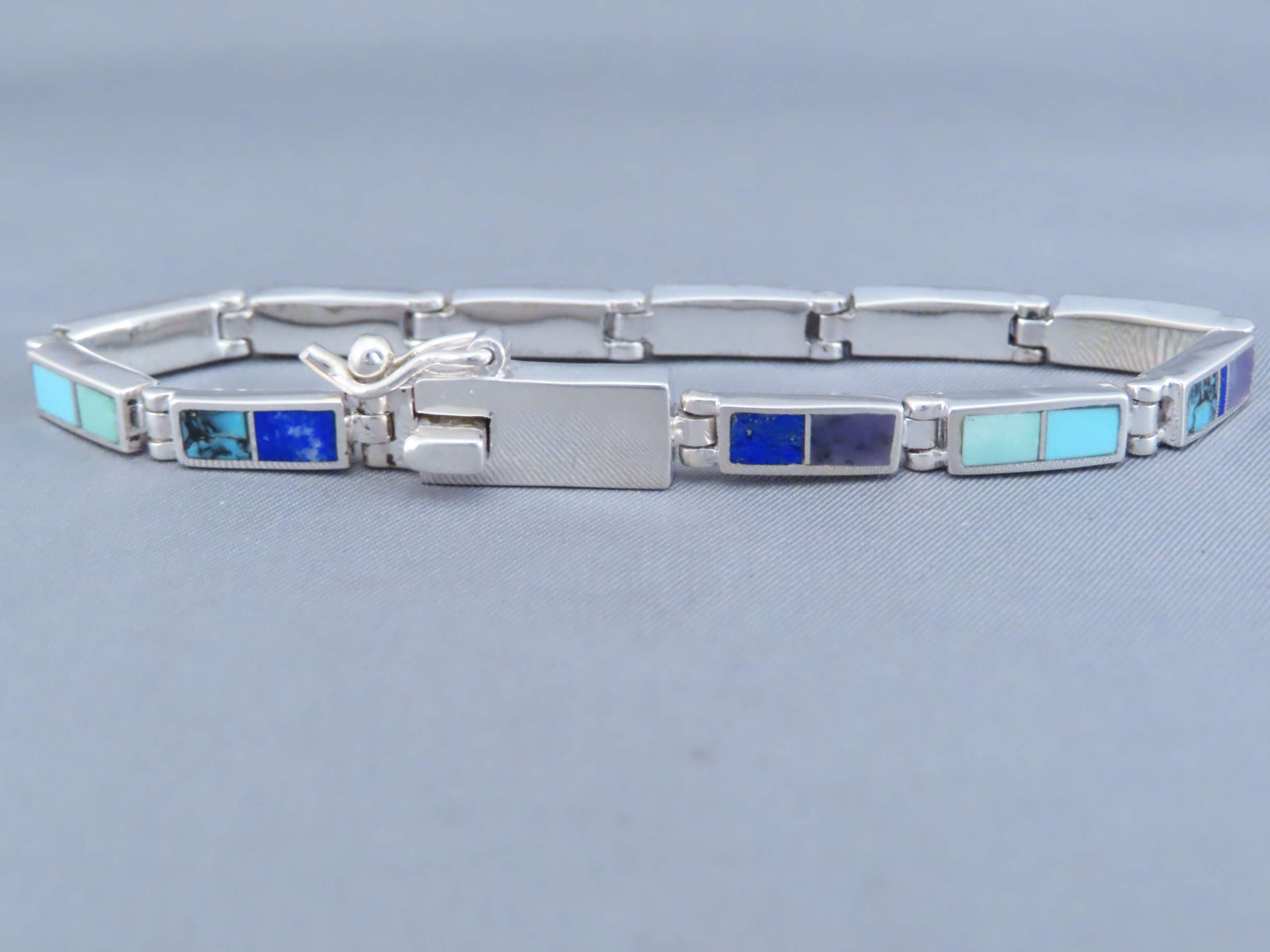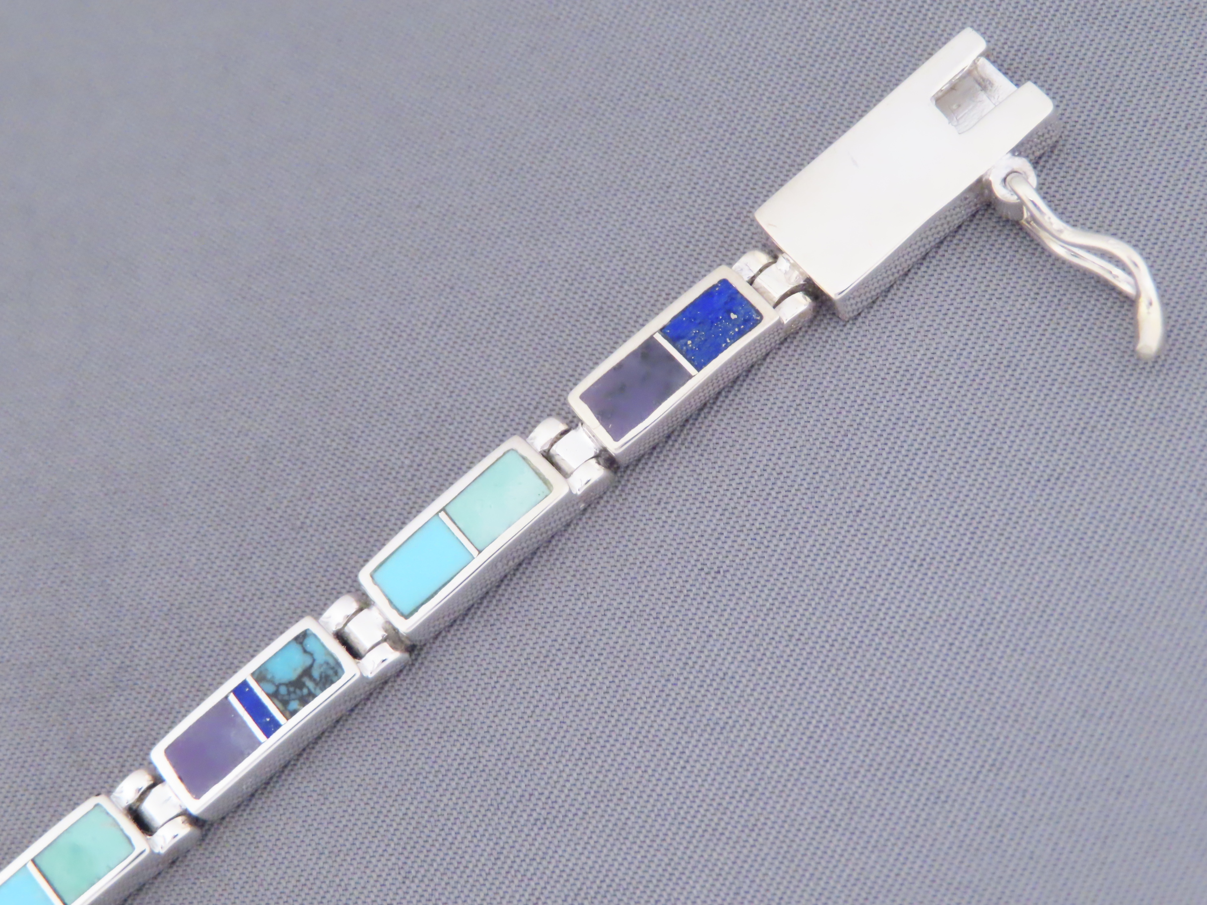Inlaid multi-stone link bracelet! Slightly smaller sterling silver inlay link bracelet with beautifully inlaid Turquoise, Lapis, Sugilite, and Varicite stones. Sturdy and very easy to use slide-in clasp with additional safety latch. Lovely inlay jewelry by Navajo Indian jewelry artist, Tim Charlie.