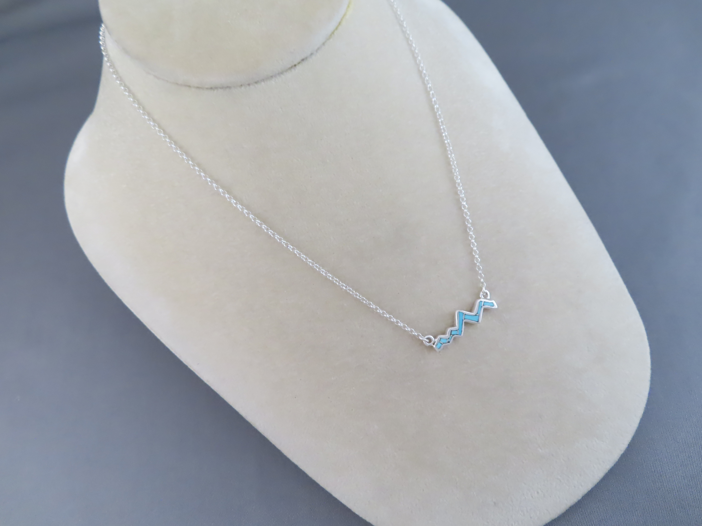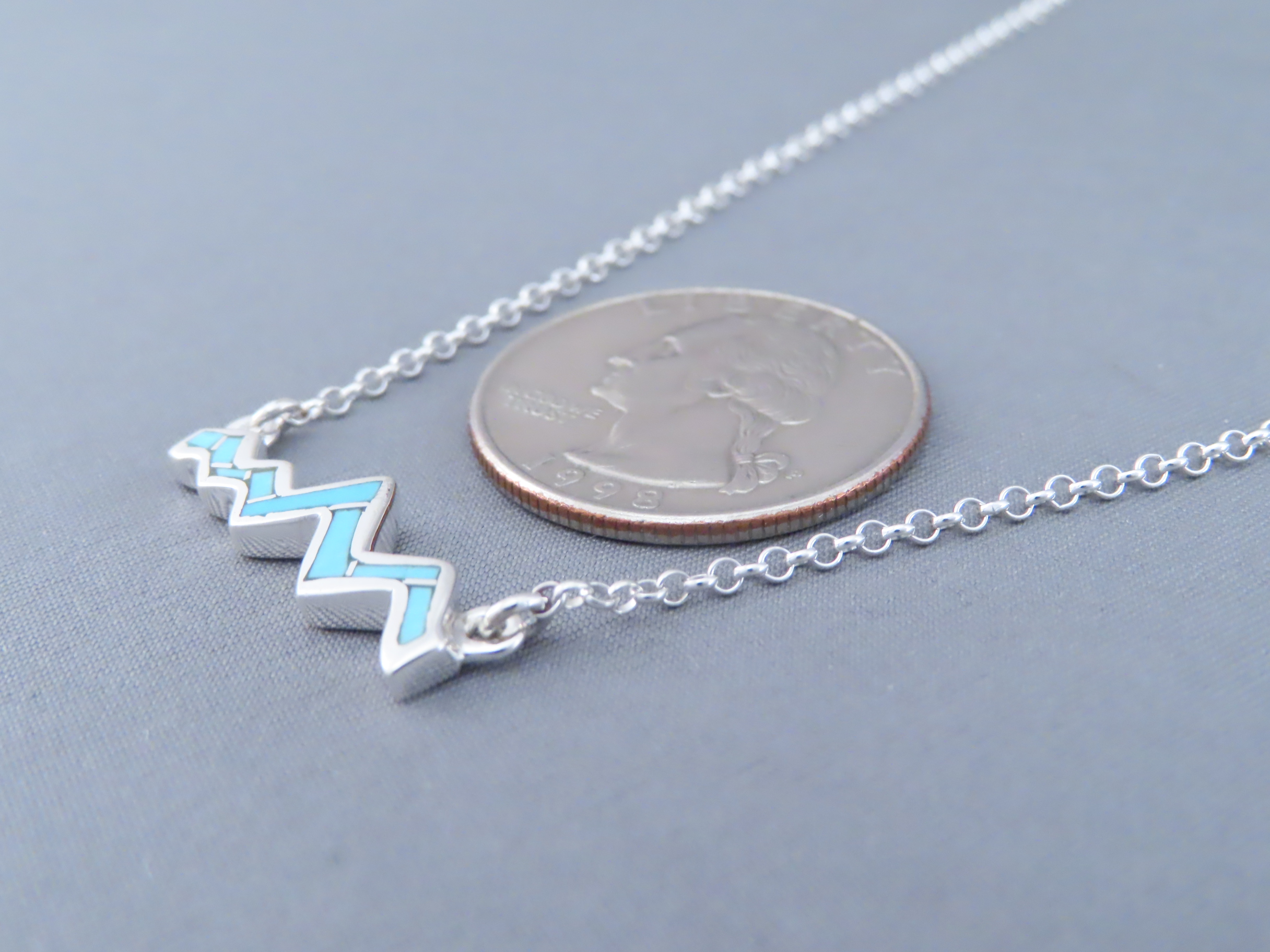 Inlaid Teton Necklace! Smaller Teton Turquoise Inlay Necklace. Take some of the Western Spirit home with you, and wear a piece of the mountains close to your heart. Approximately 16 1/2″ in total length, this lovely pendant necklace with turquoise inlay will hang a little higher around the neck. This is the most dainty version of the Inlaid Teton Necklace.
