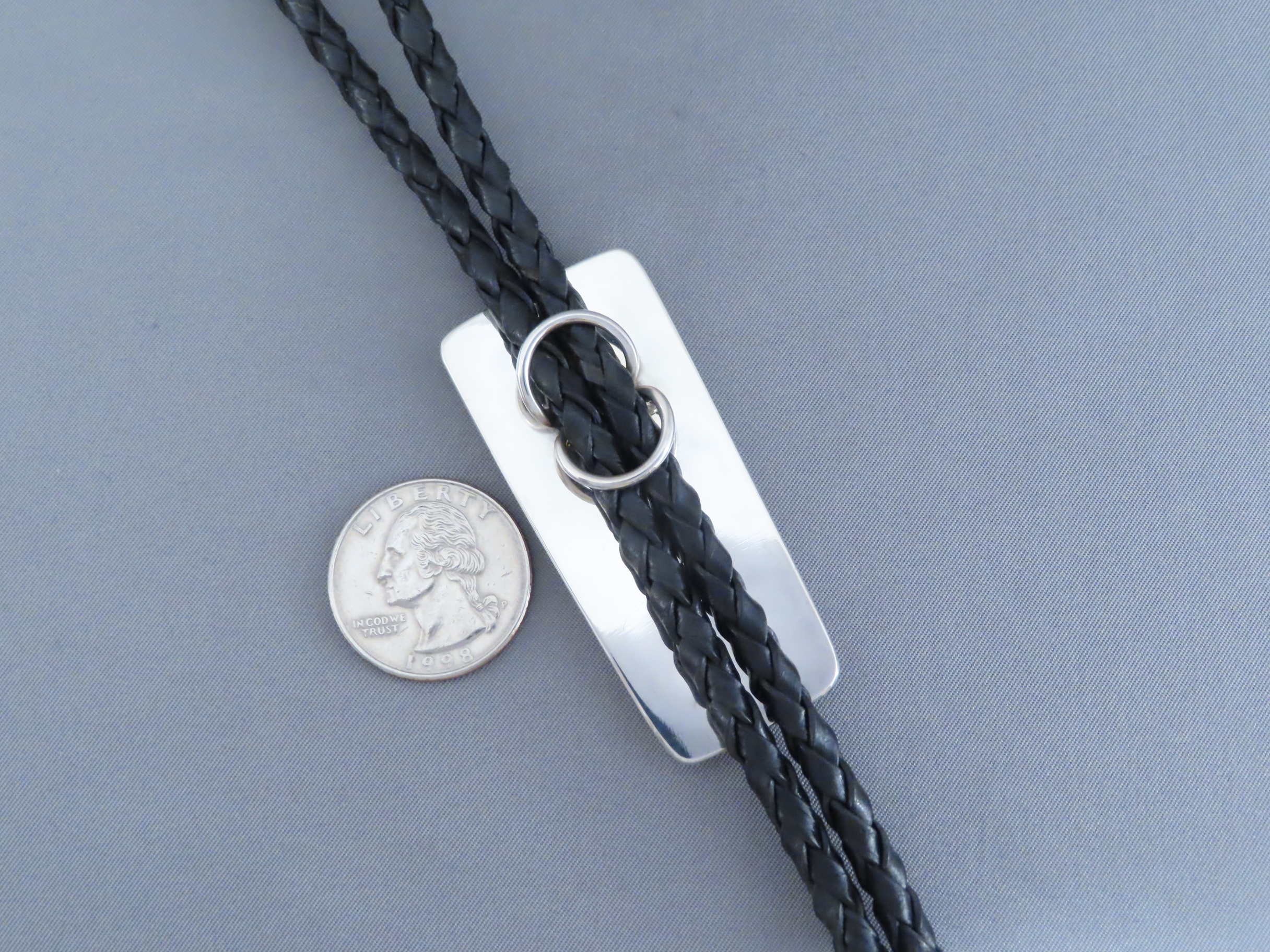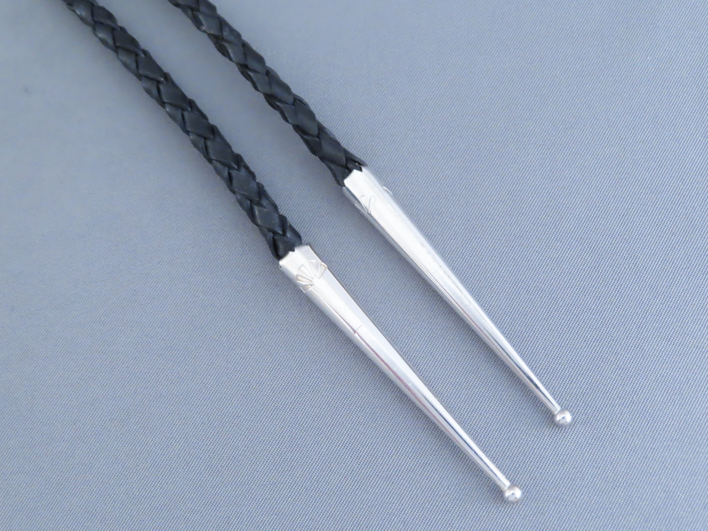 Inlay Bolo Tie by Jimmy Poyer! Very attractive sterling silver Bolo Tie with Turquoise and Black Jet inlay. Made by Native American jewelry artist, Jimmy Poyer (Navajo). Bolo comes with a longer 41″ braided leather tie with sterling silver tips.