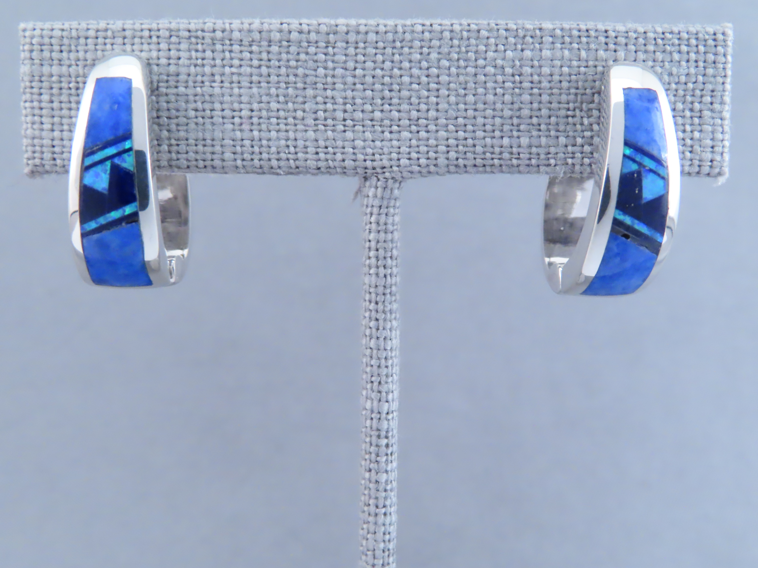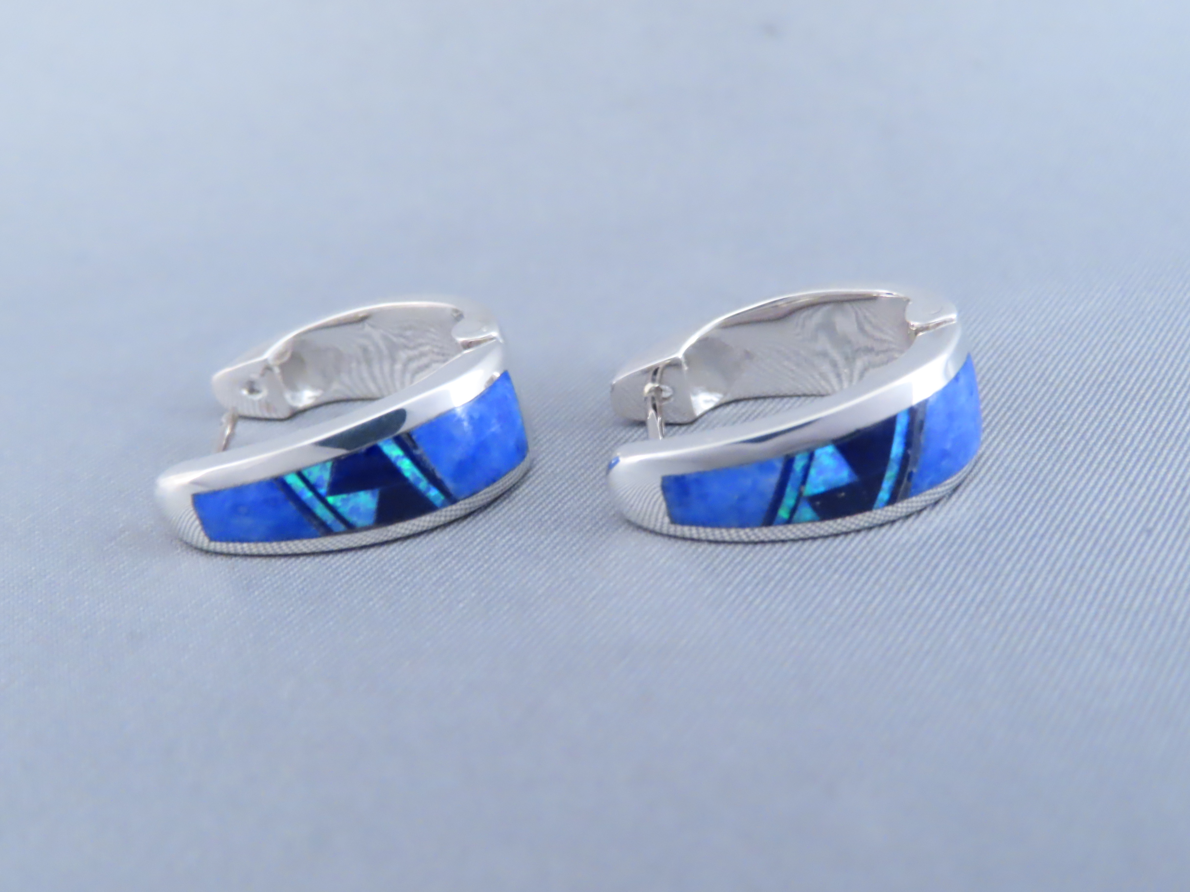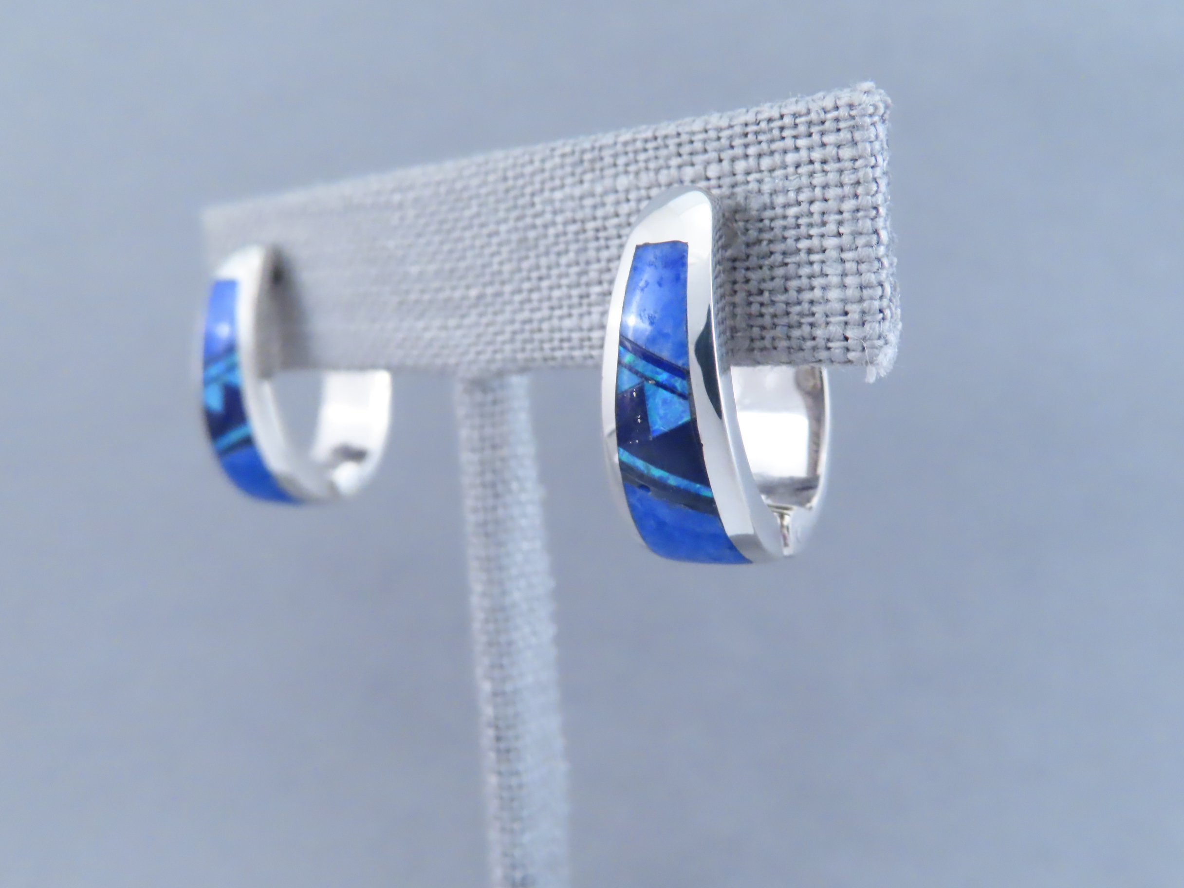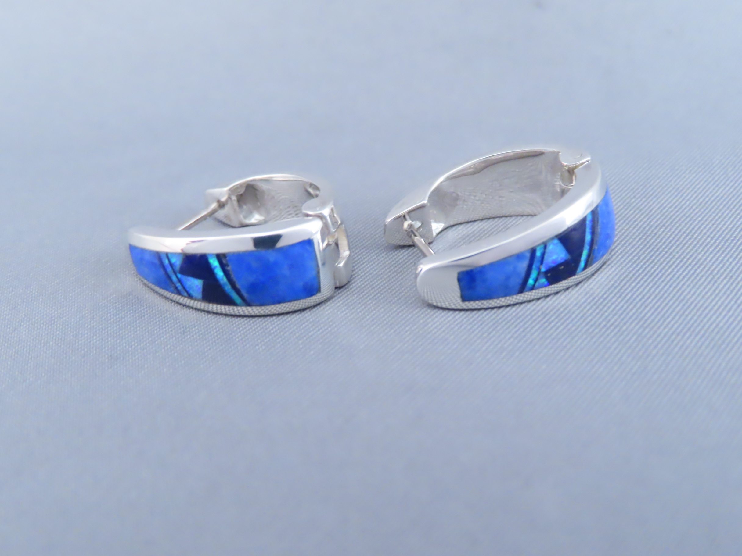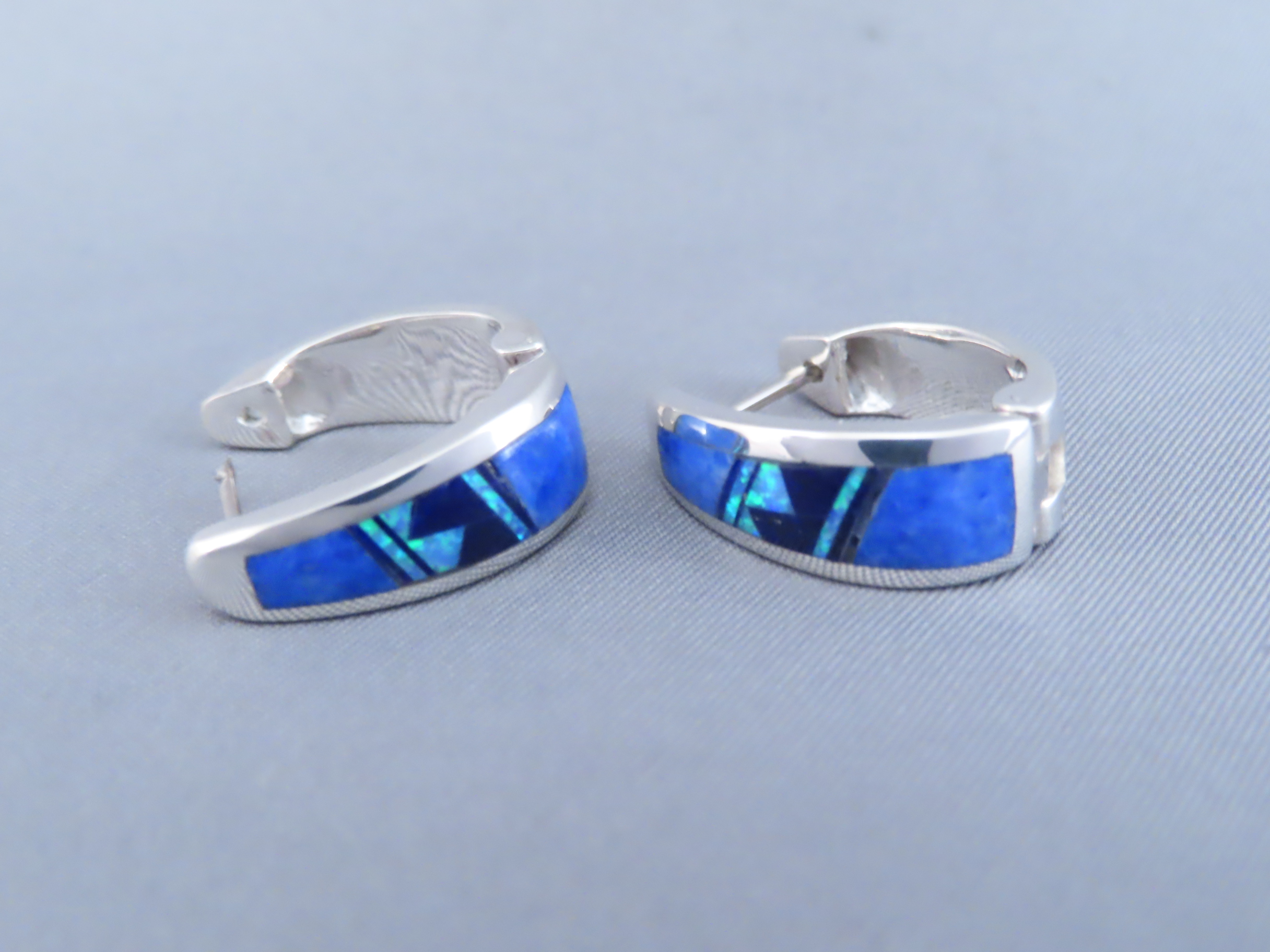 LOVELY Lapis & Opal Inlay ‘Huggies’ Earrings! These sterling silver lever back post earrings are made with a beautiful color combination of blue cultured opal and 2 shades of inlaid Lapis stones (Denim Lapis and Lapis Lazuli). Elegant Opal & Lapis earrings by Native American jewelry artist, Charles Willie (Navajo).