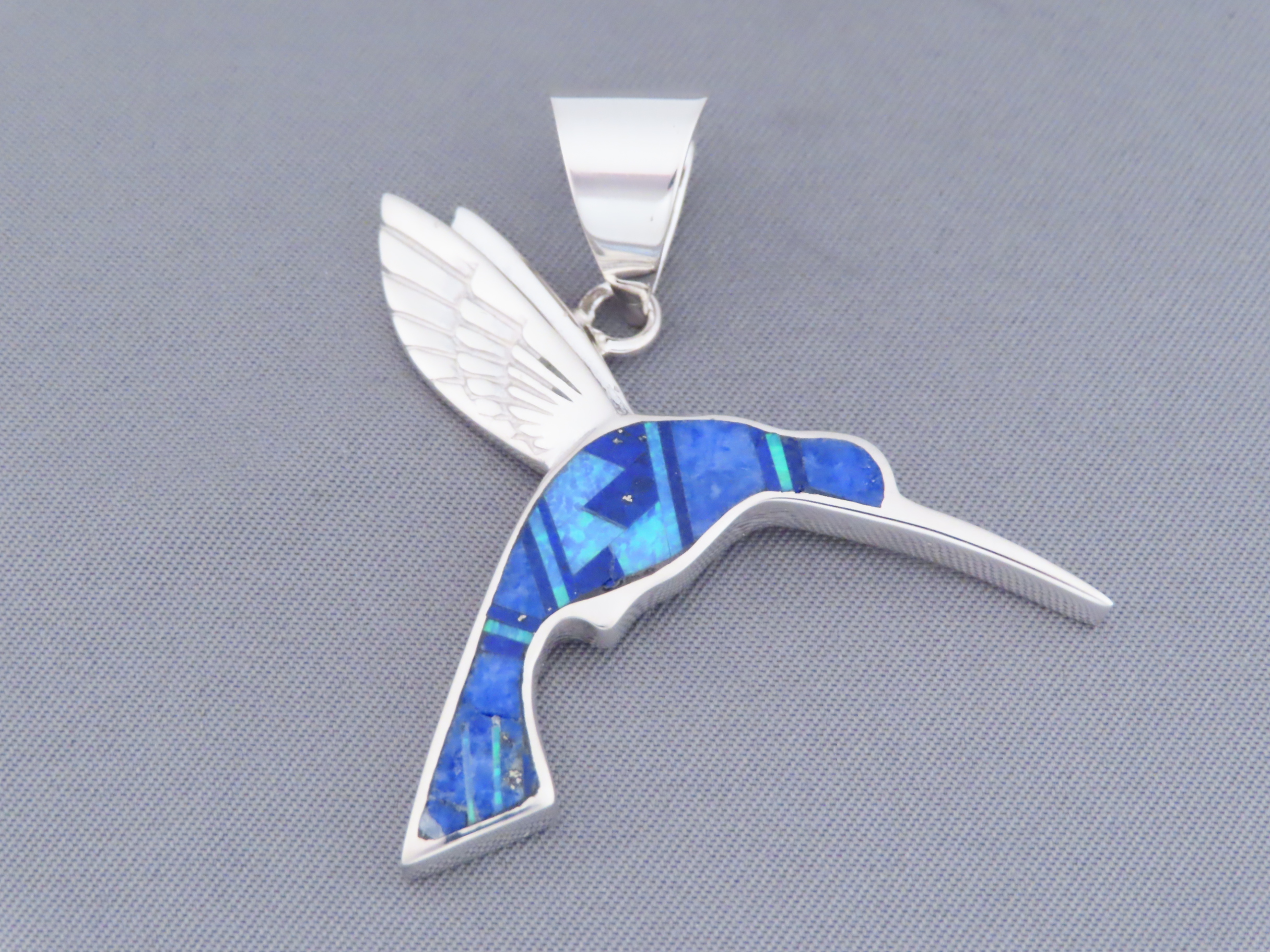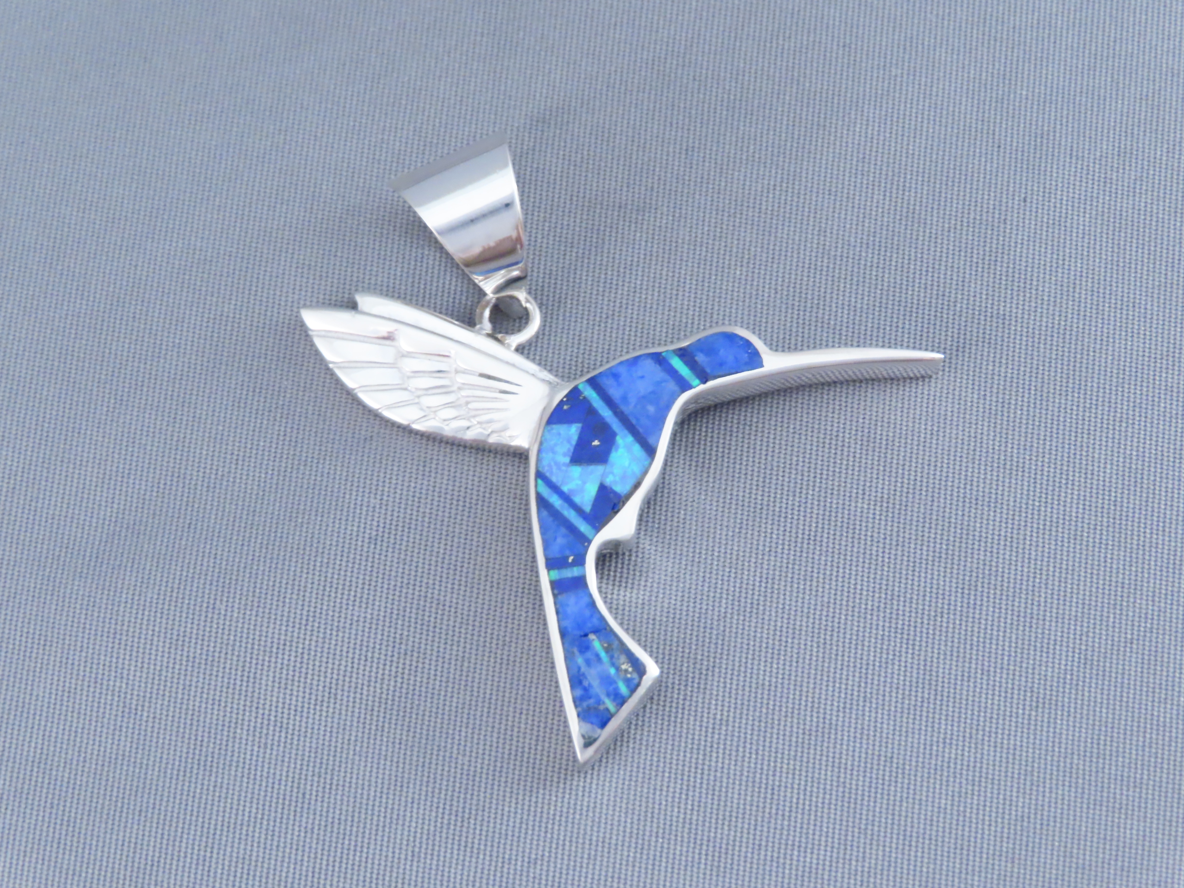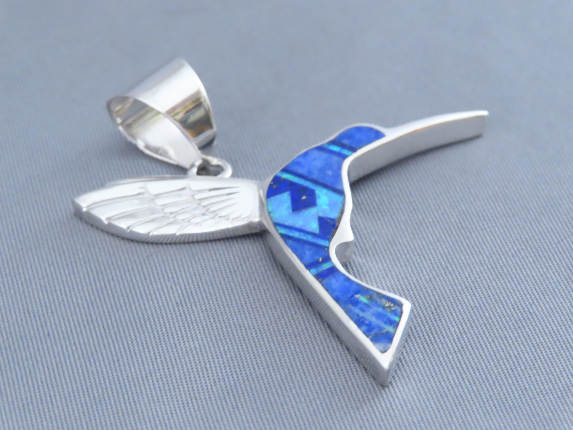 Beautiful Inlay HUMMINGBIRD Pendant! This sterling silver hummingbird pendant features finely inlaid lapis & opal stones. Made by Native American jewelry artist, Tim Charlie (Navajo). Lovely-