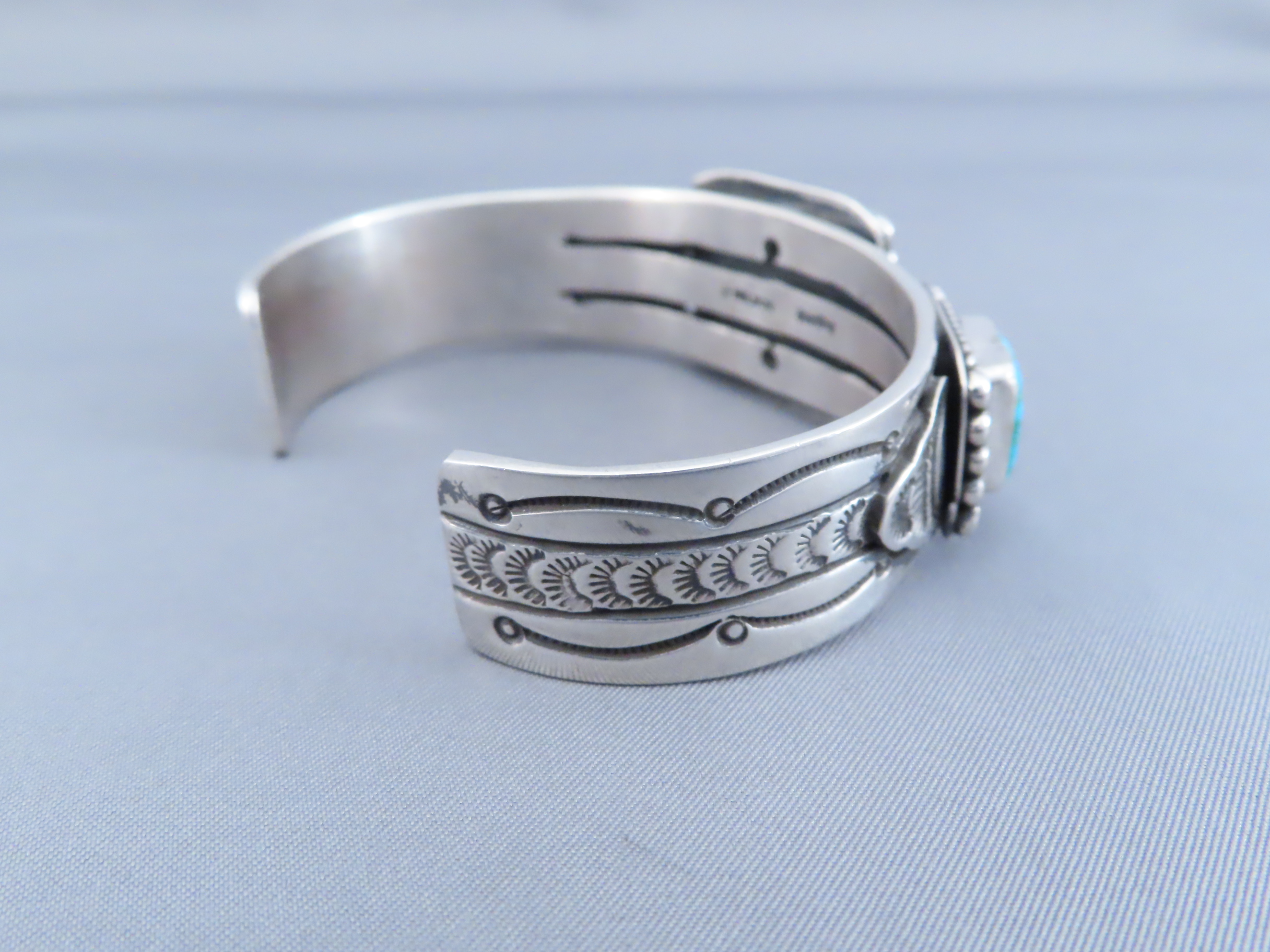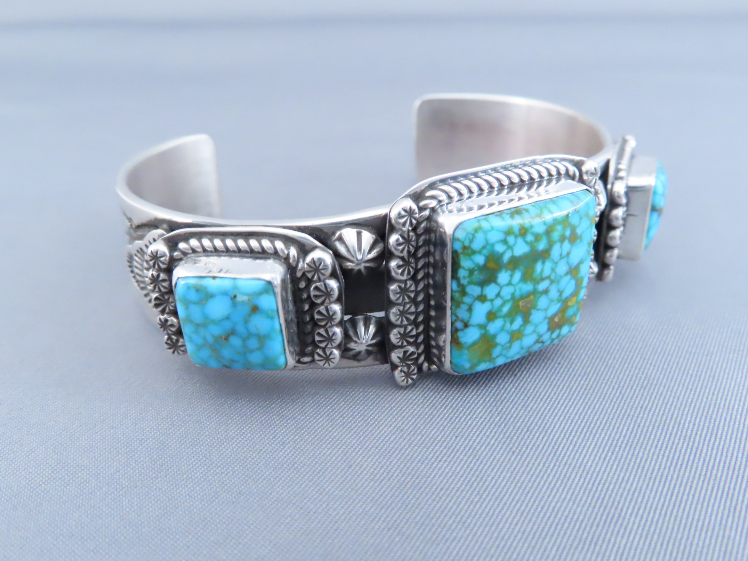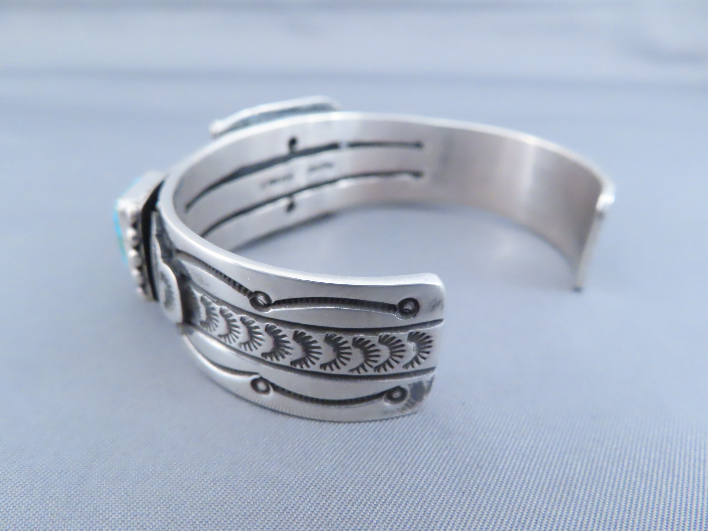 Kingman Turquoise Bracelet Cuff!  Larger sterling cuff bracelet with 3 really lovely Kingman Turquoise stones by Native American jewelry artist, John Nelson (Navajo).