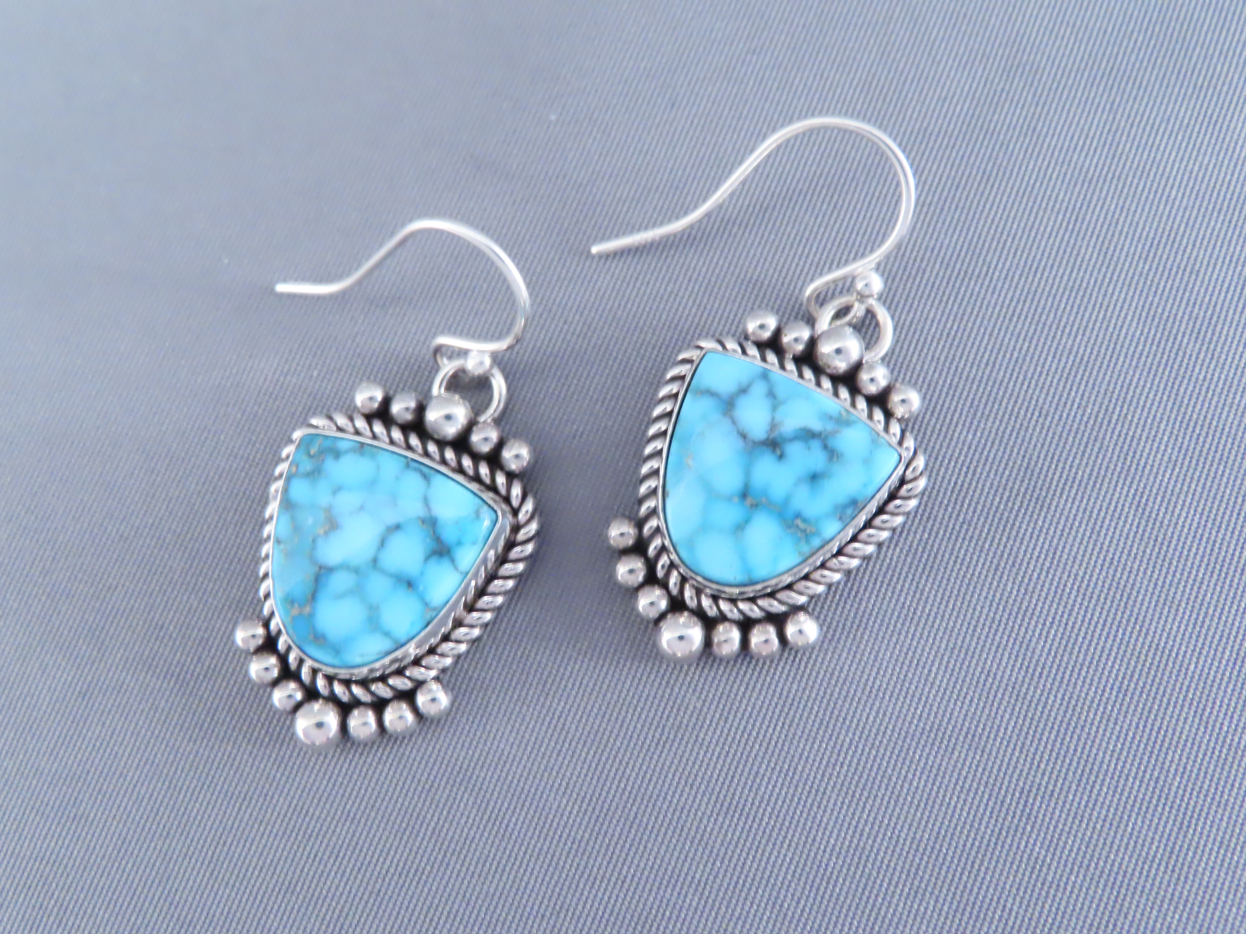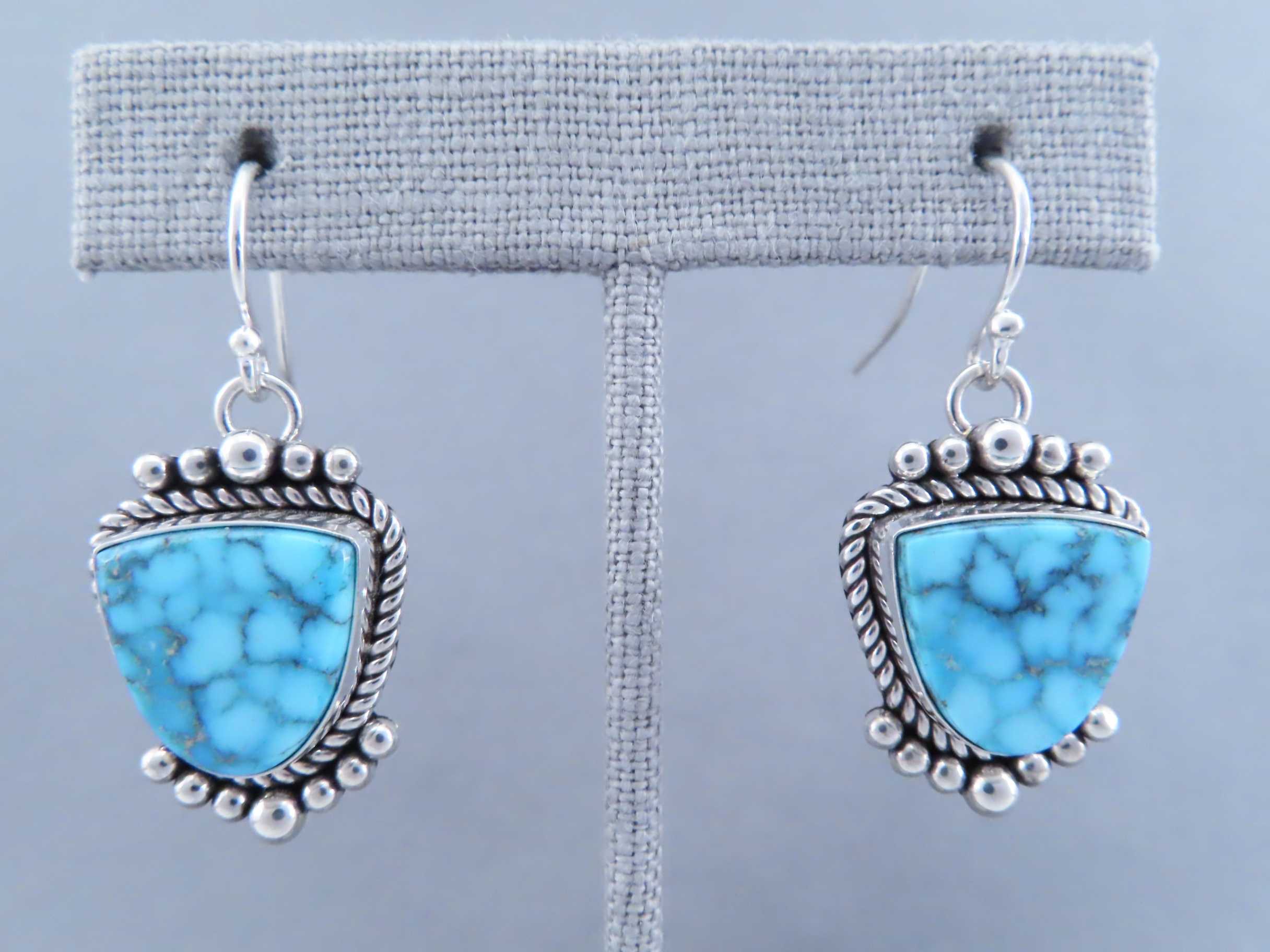 Larger dangling turquoise earrings by Artie Yellowhorse! Sterling silver & Kingman Turquoise earrings (hooks) by Native American (Navajo) jewelry artist, Artie Yellowhorse. BEAUTIFUL blue natural turquoise stones!!