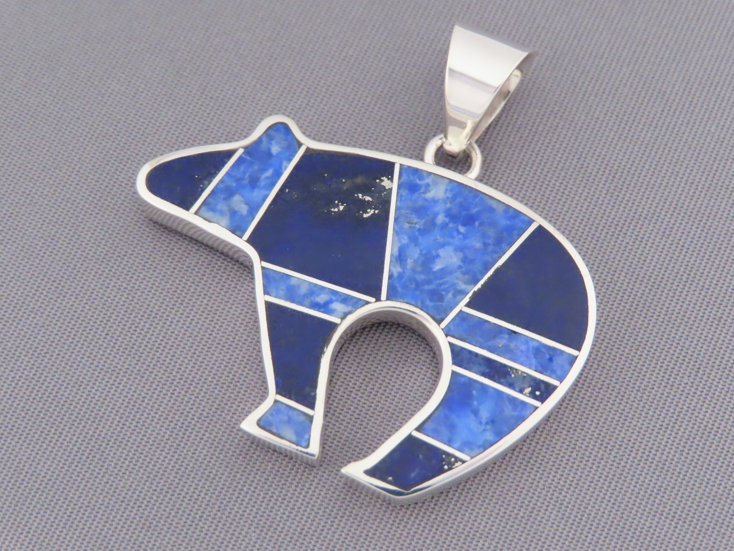 This sterling silver pendant in the shape of a bear features precisely inlaid Lapis and Denim Lapis stones. Can be reversed and worn as a lovely sterling silver bear with heart-line pendant. Beautiful inlay bear pendant by Native American (Navajo) jewelry artist, Tim Charlie.