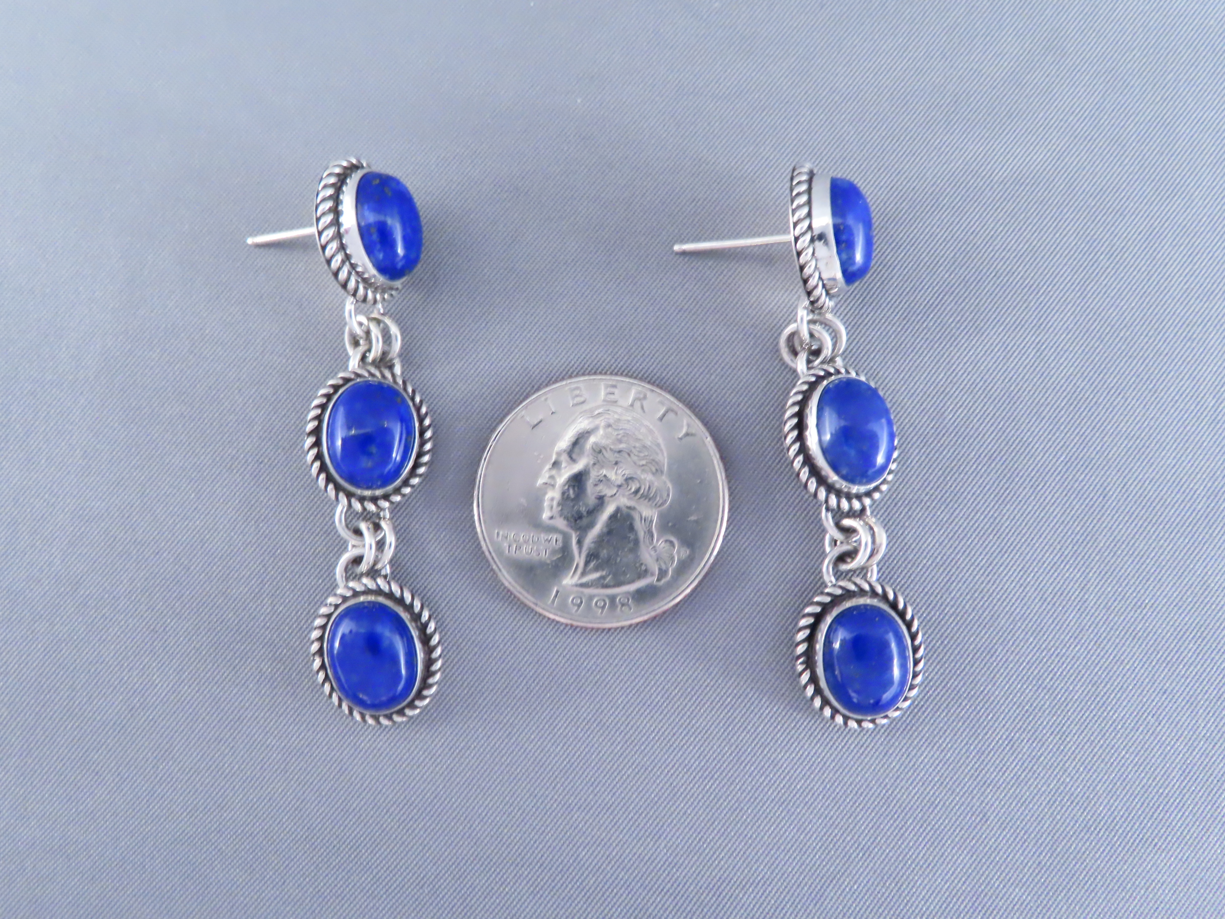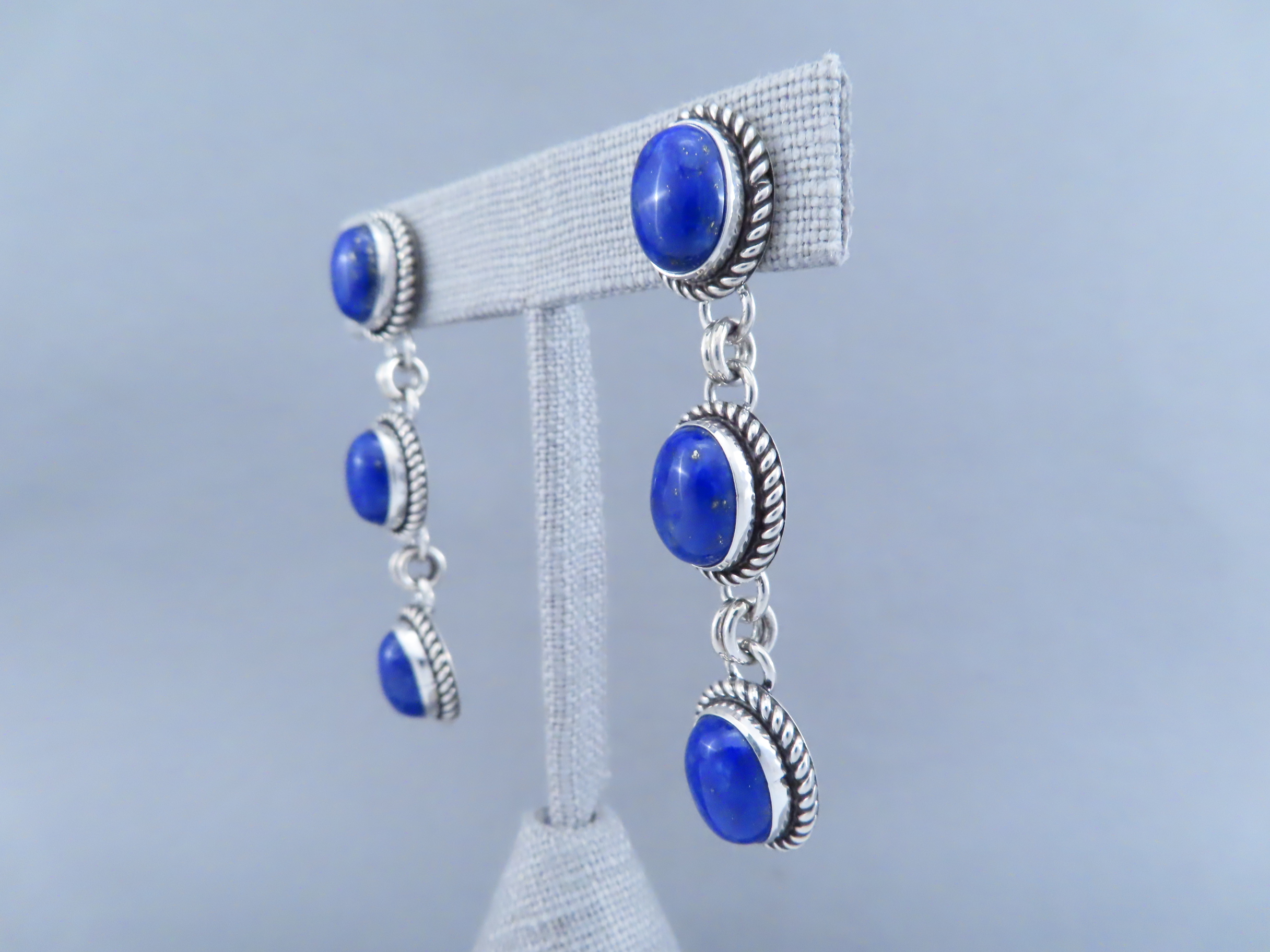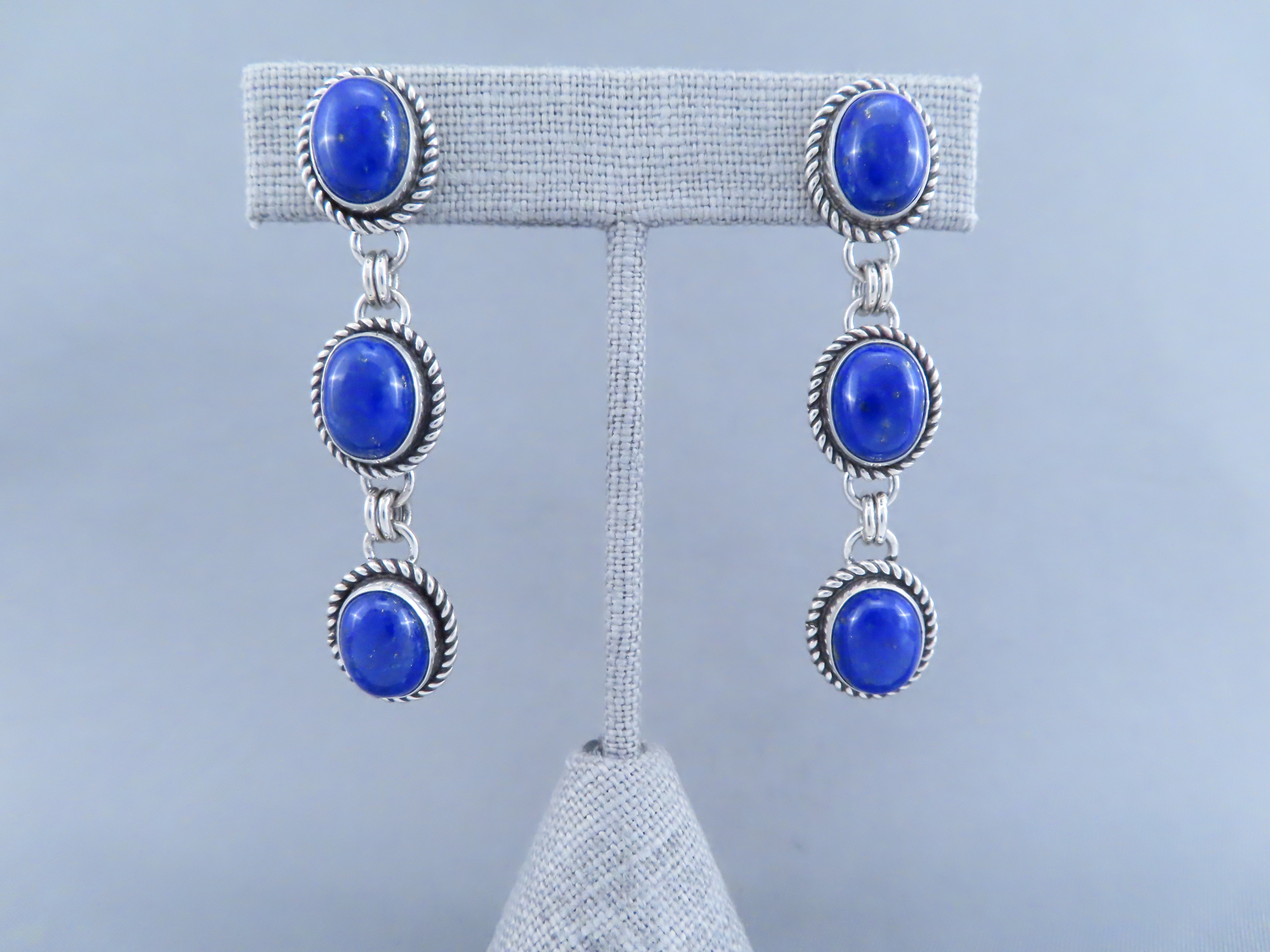 LONG Lapis Earrings!  Lovely 3-tier dangling post earrings of  blue lapis set in sterling silver.  Made by Navajo jewelry artist, Artie Yellowhorse.   BEAUTIFUL Native American Jewelry!