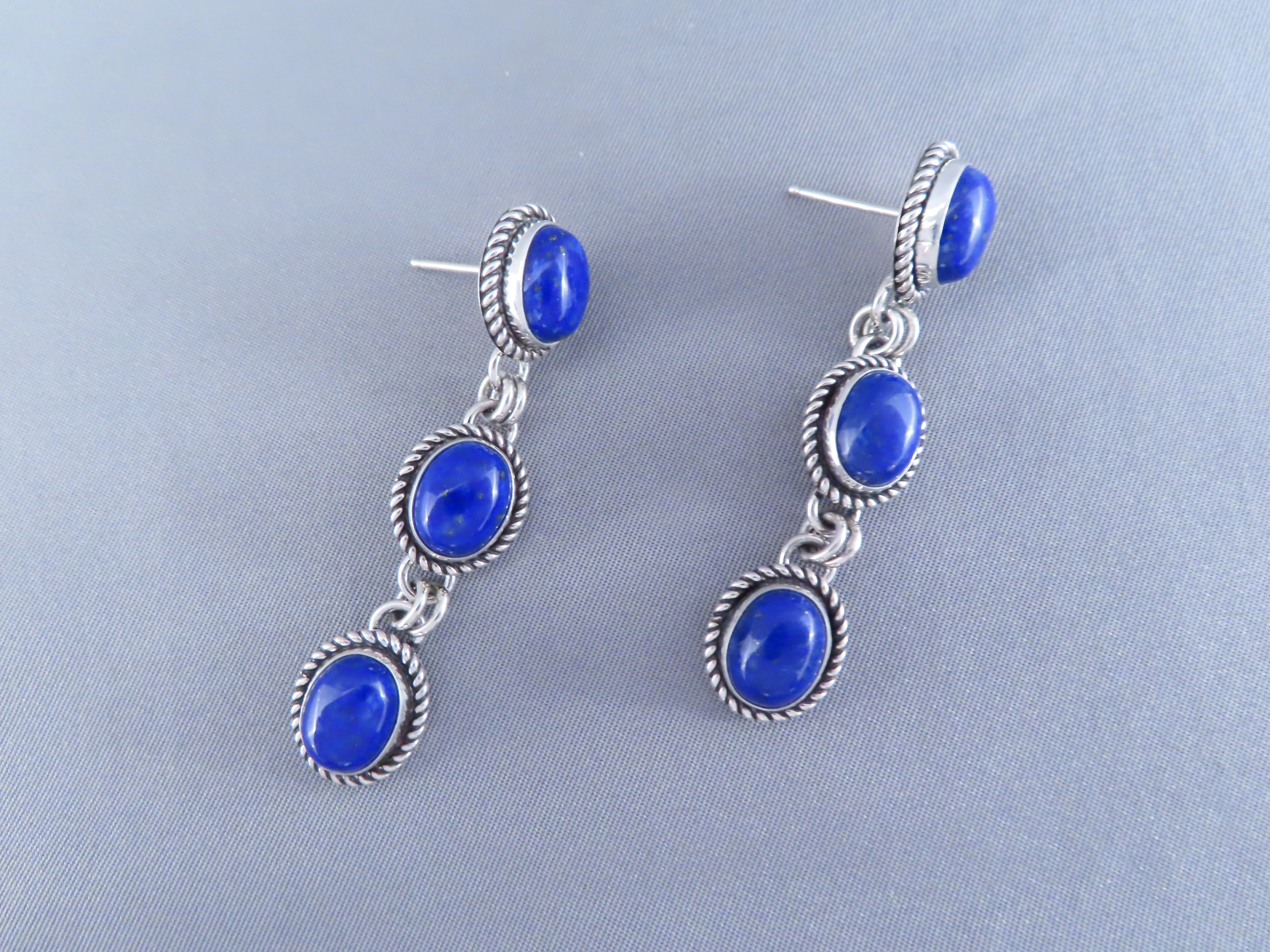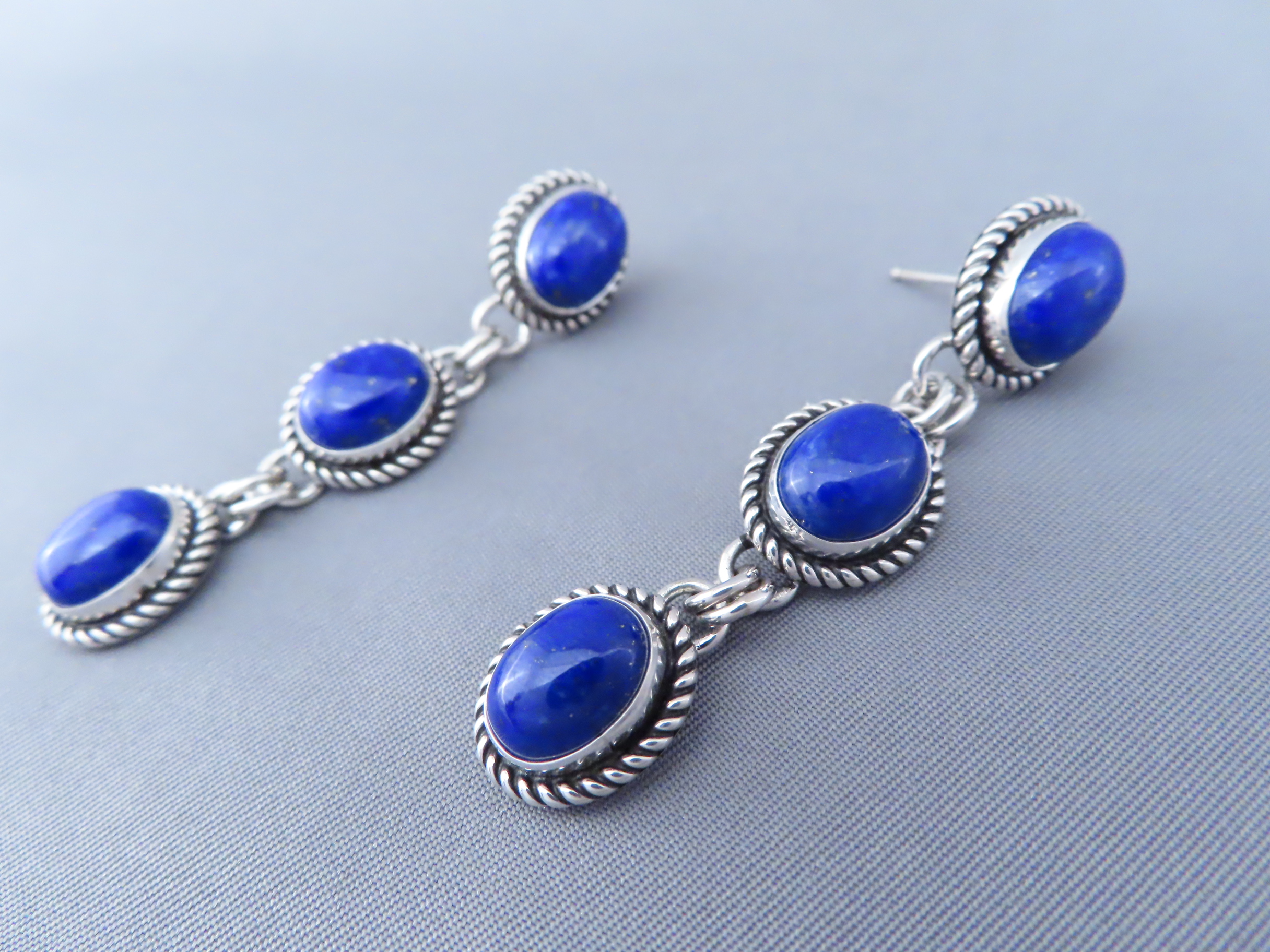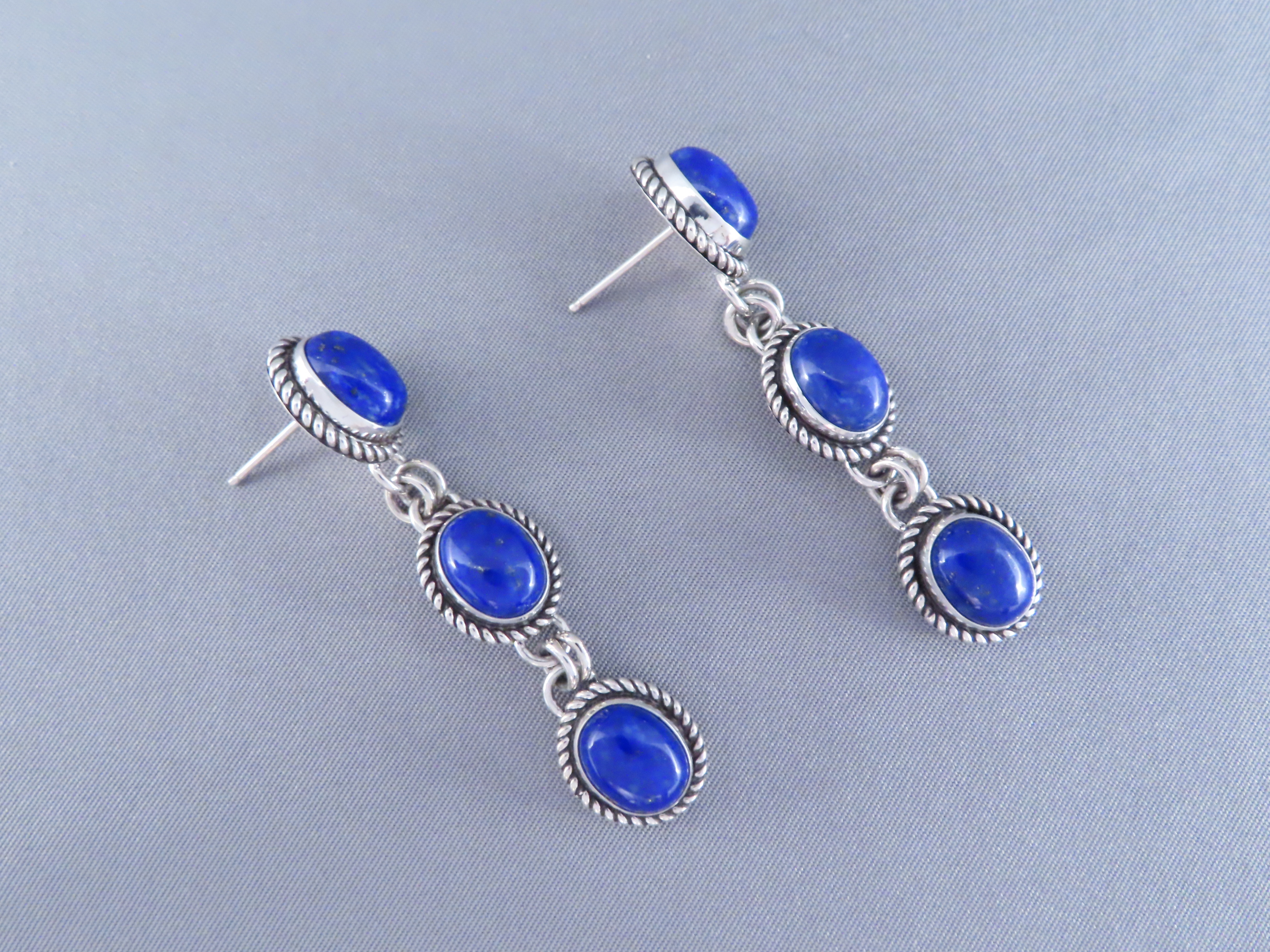 LONG Lapis Earrings!  Lovely 3-tier dangling post earrings of  blue lapis set in sterling silver.  Made by Navajo jewelry artist, Artie Yellowhorse.   BEAUTIFUL Native American Jewelry!