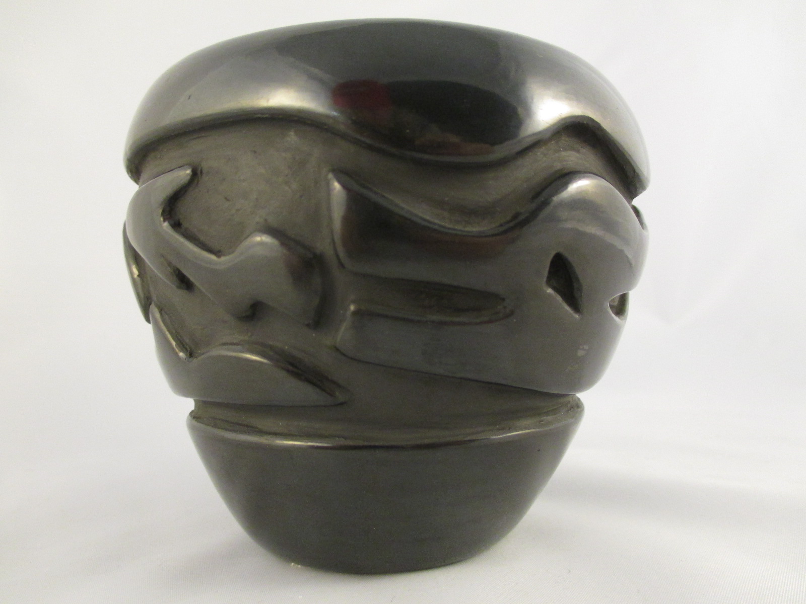 Smaller Mary Cain black Santa Clara Pueblo pottery with Avanyu. This lovely piece is approximately 3 3/4″ tall and 4 1/2″ in diameter. Mary Cain was recognized with numerous awards for her traditional Santa Clara pottery. Mary Cain was a daughter of Christina Naranjo, granddaughter to Sara Fina Tafoya, and niece to the great Margaret Tafoya & Camilio ‘Sunflower’ Tafoya… all amazing artists. Born in 1916, and primarily taught by her mother, Mary began making pottery around the age of 15. Please watch this quick video-