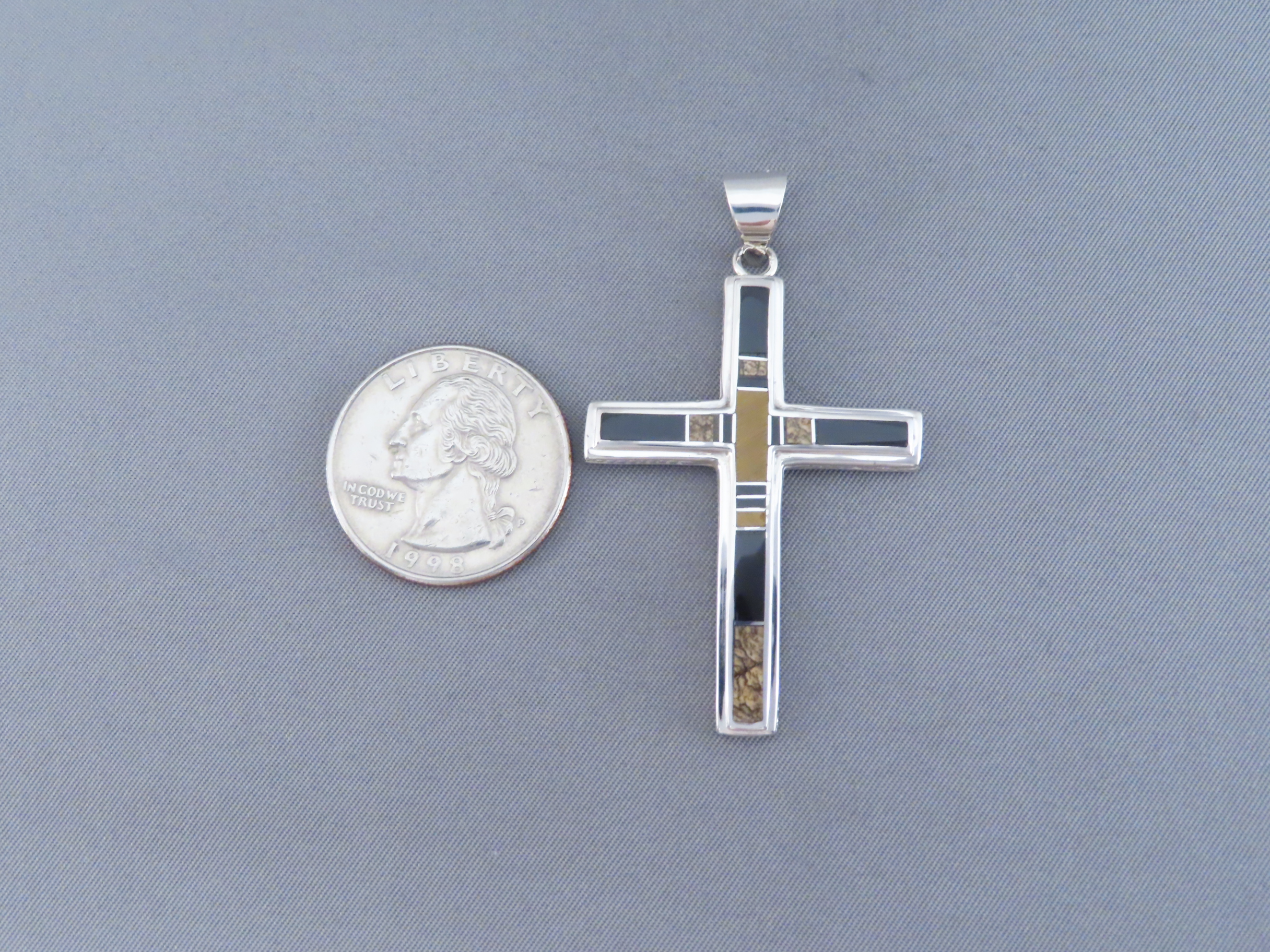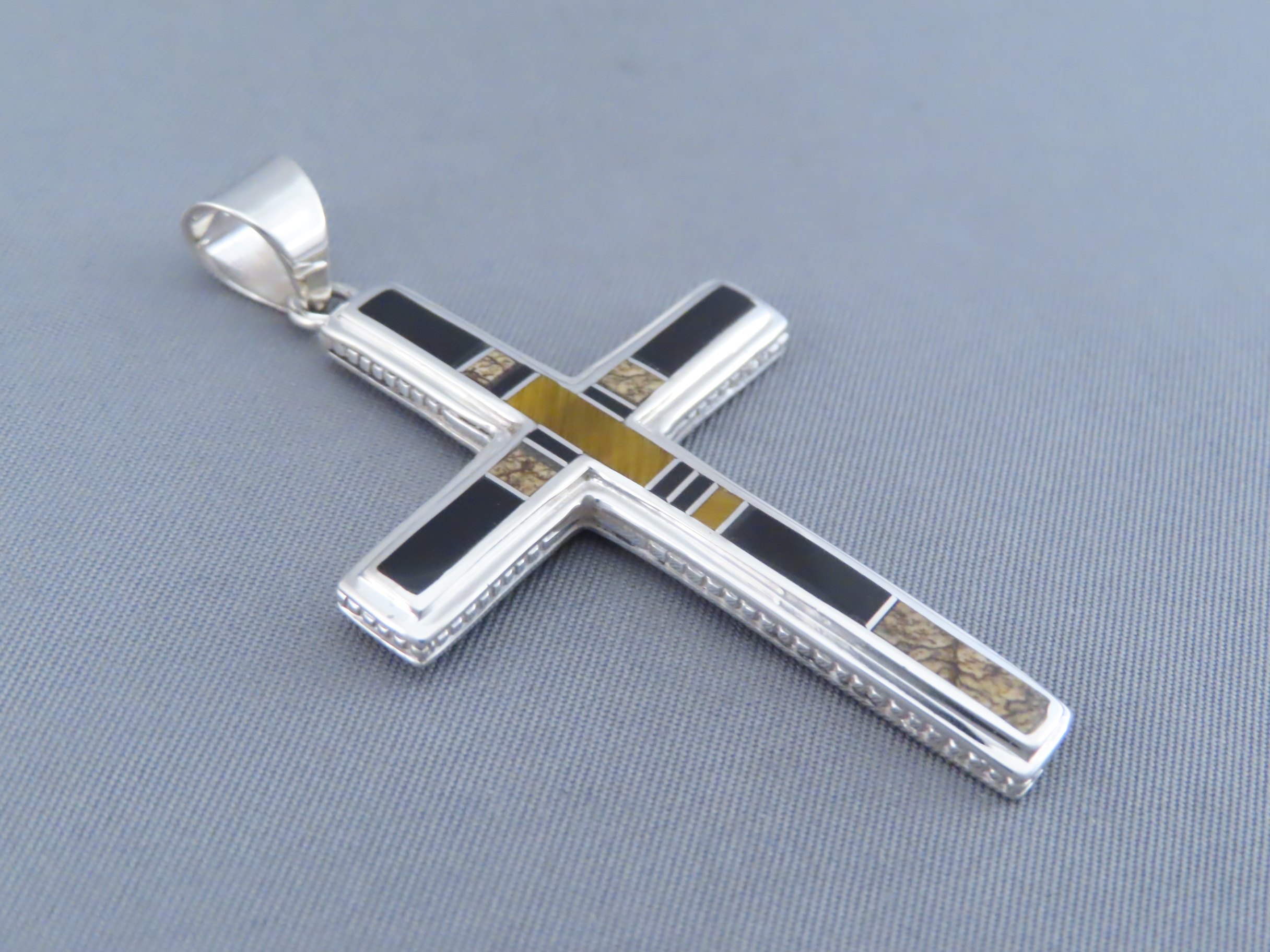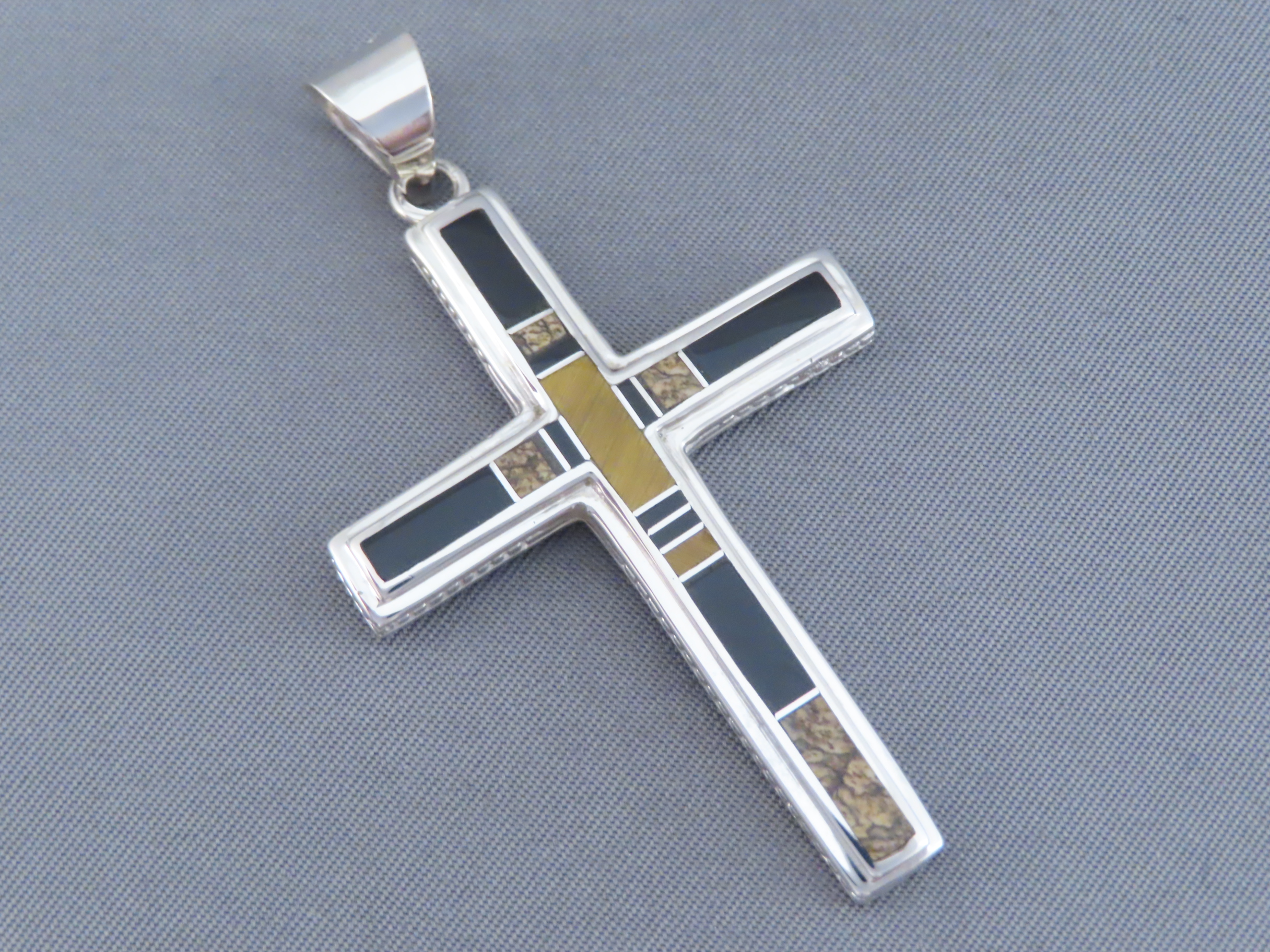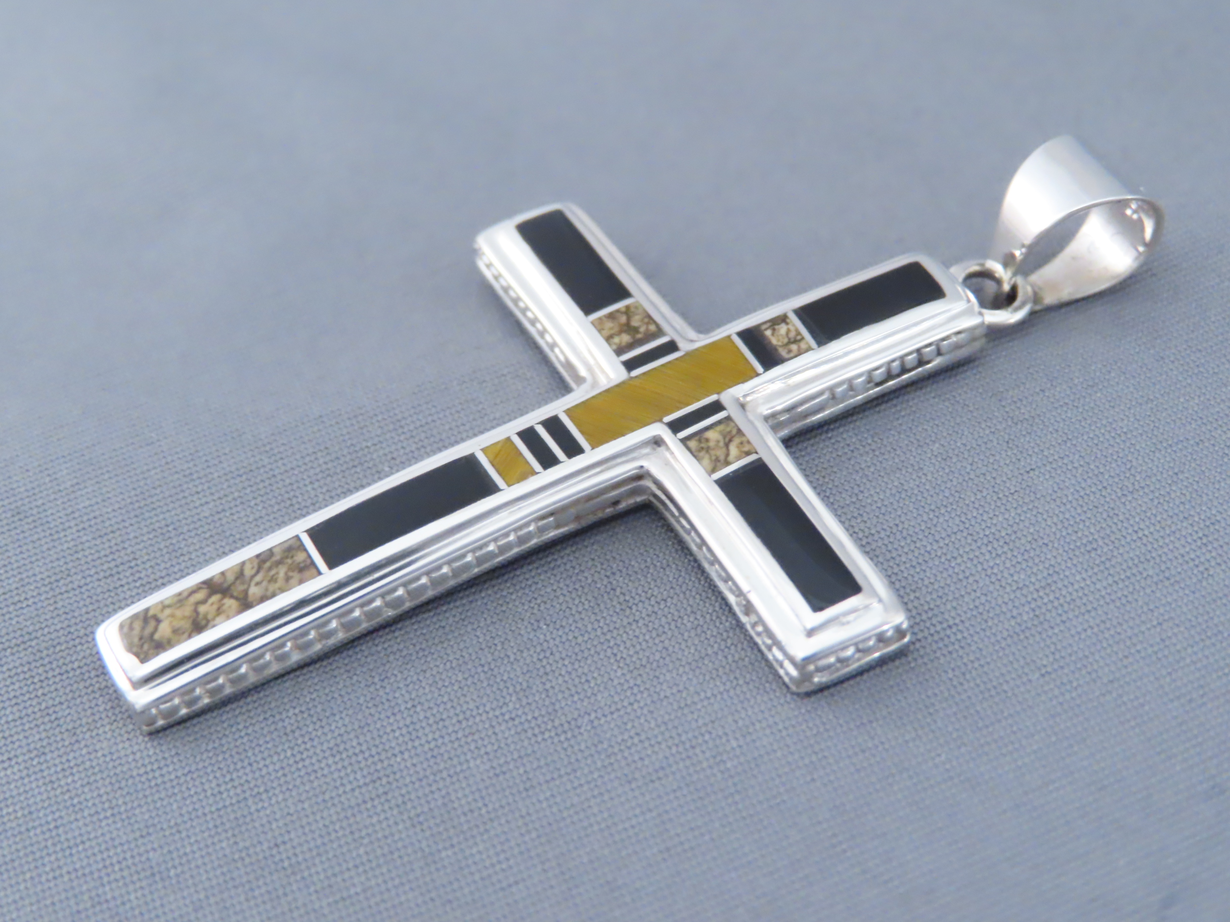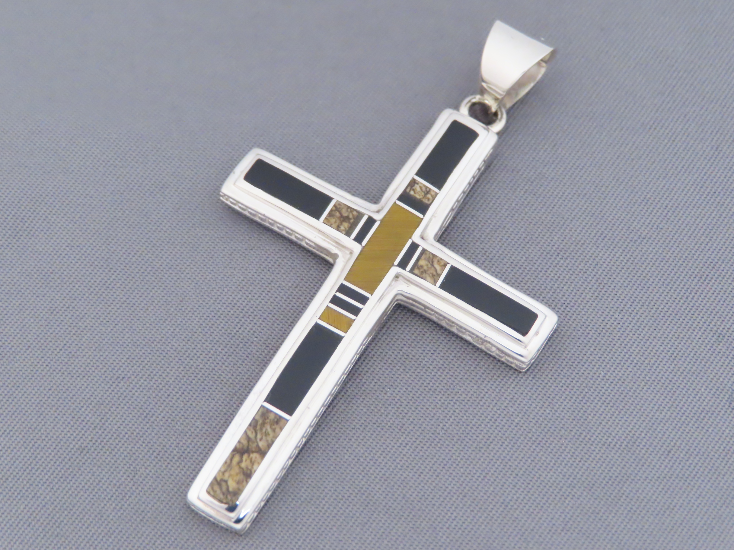 Multi-Stone Inlay Cross Pendant! This larger sterling silver cross pendant features finely inlaid Black Jade, Picture Jasper, and Tiger’s Eye stones. Made by Navajo jewelry and inlay artist, Charles Willie.