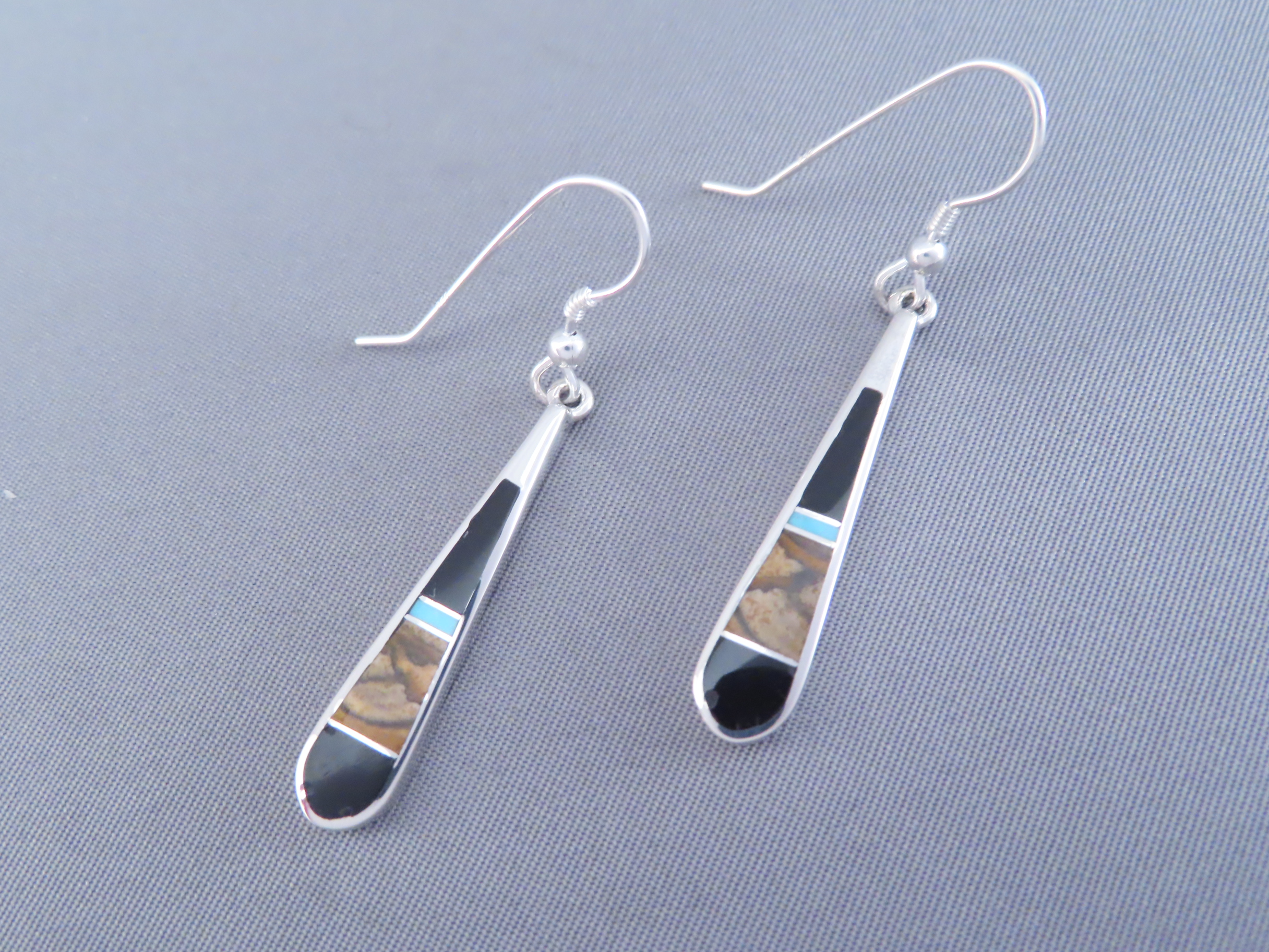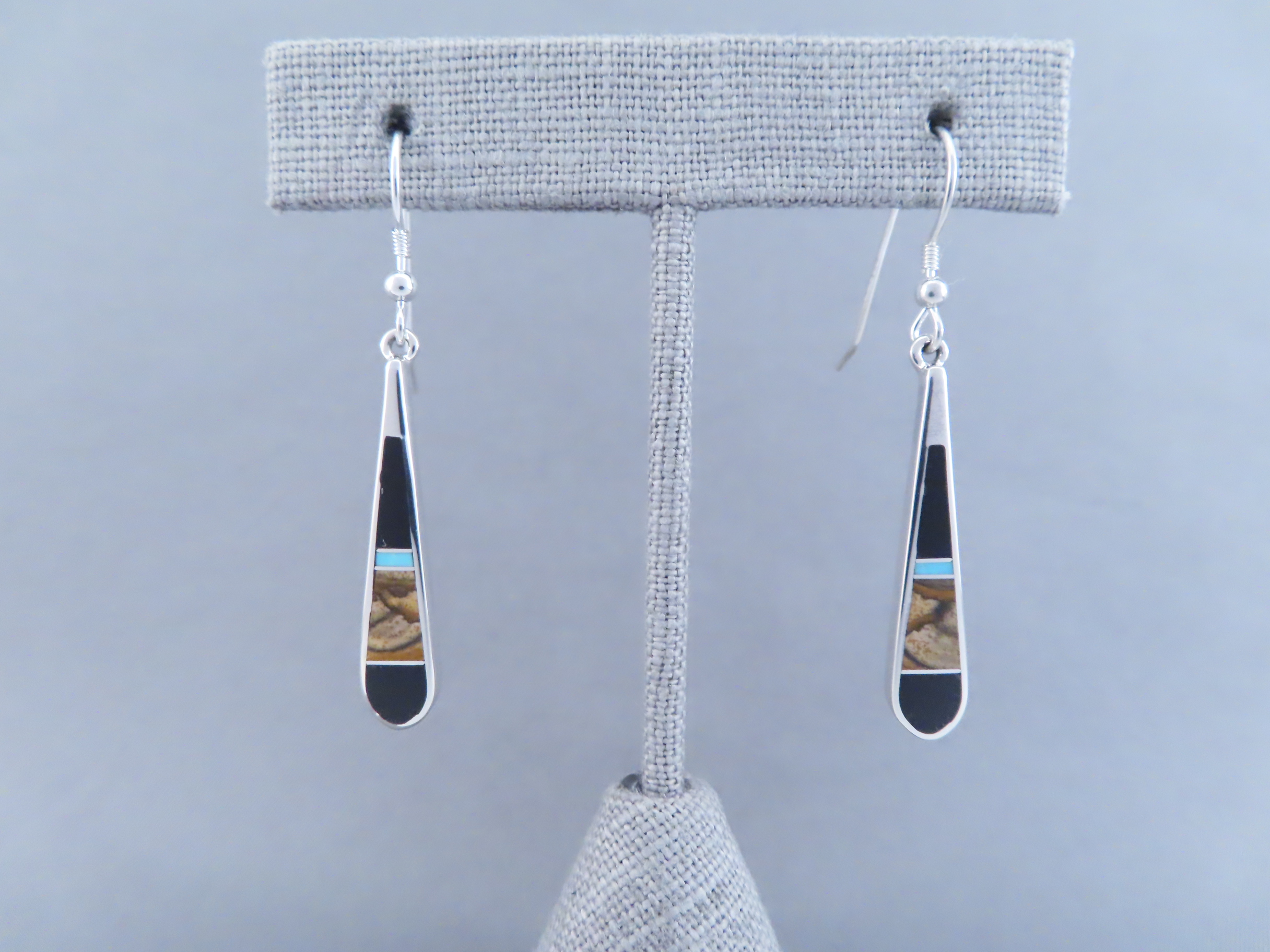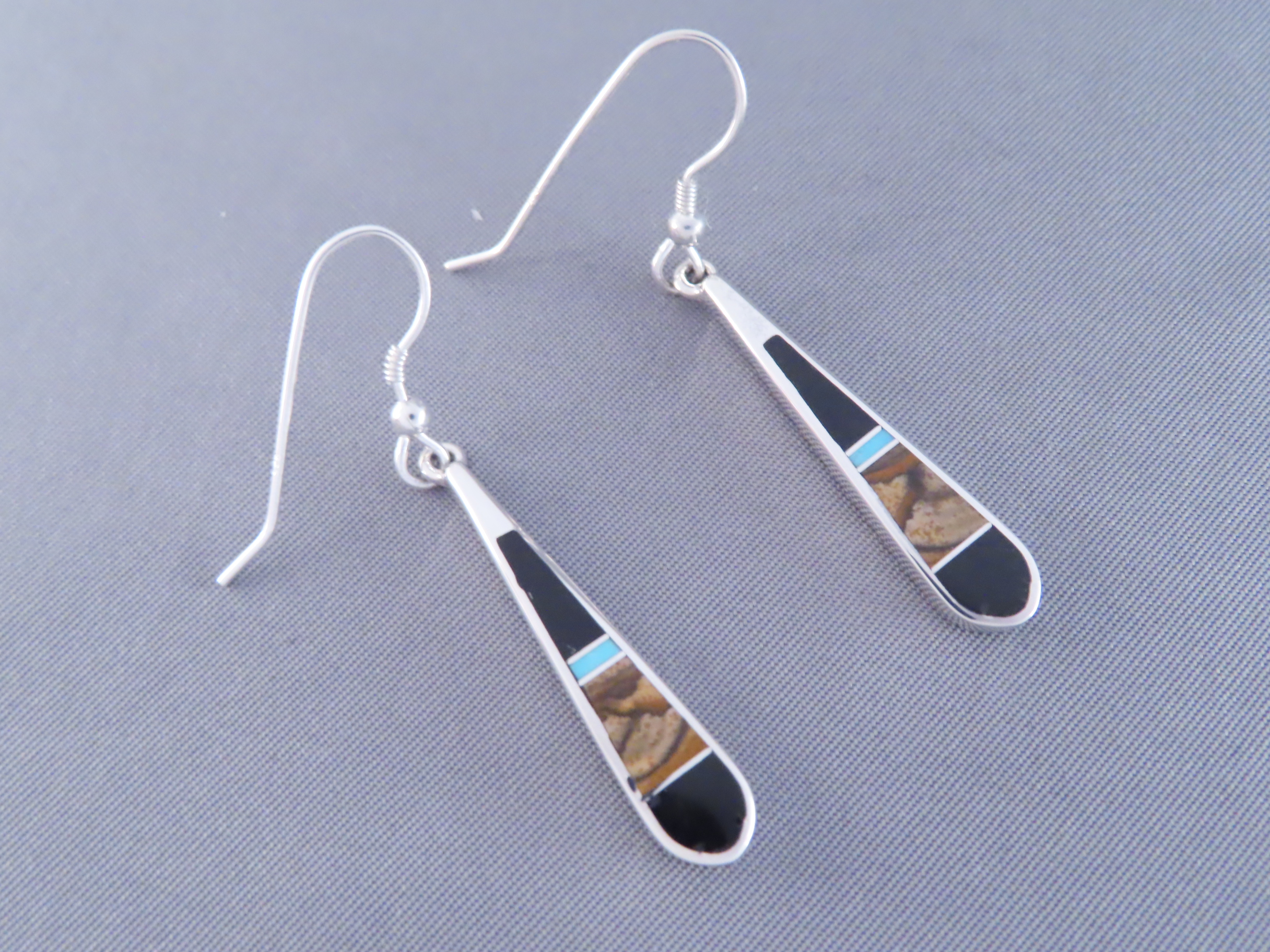 Multi-Stone inlay earrings featuring Turquoise! Gorgeous sterling silver inlay dangling hook earrings with finely inlaid Black Jade, Picture Jasper, and Turquoise stones. Made by Native American (Navajo) jewelry artist, Tim Charlie. Lovely inlay jewelry!