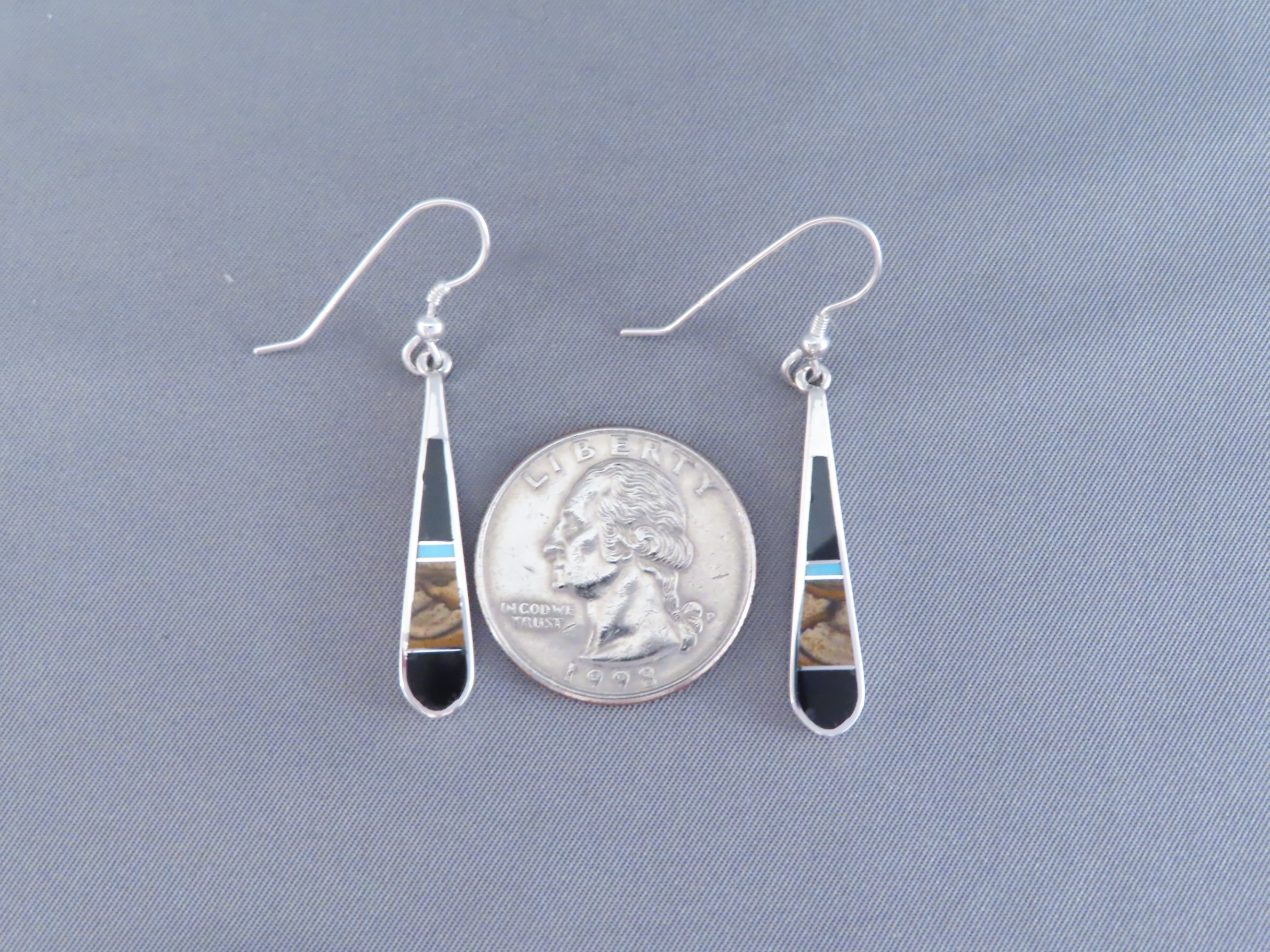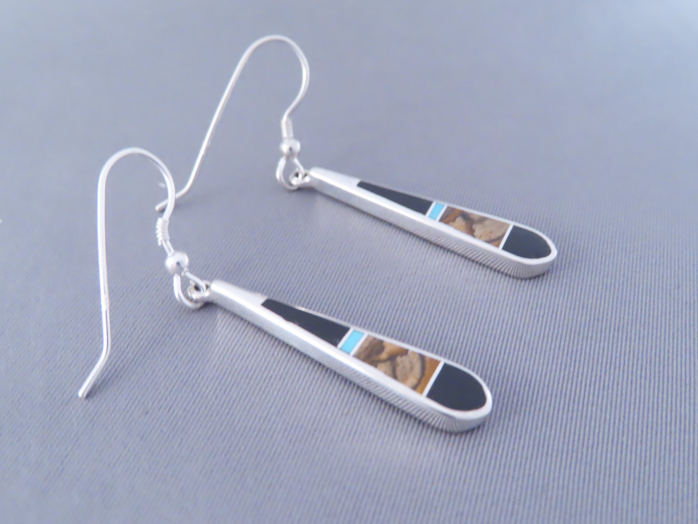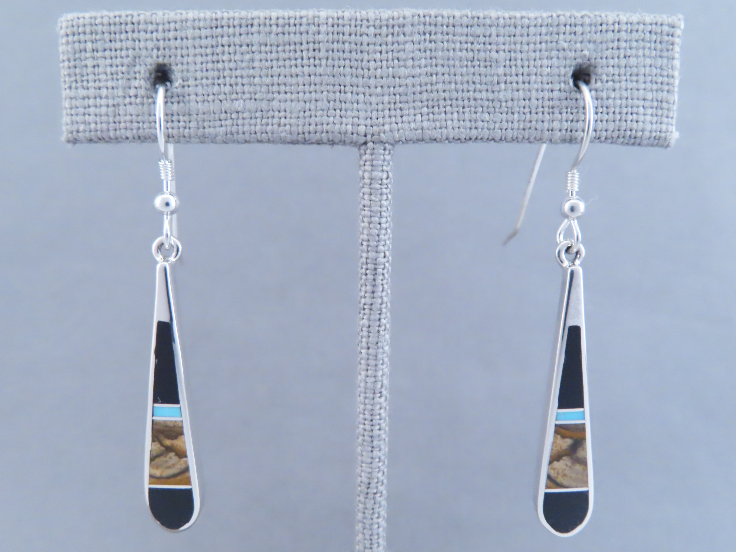 Multi-Stone inlay earrings featuring Turquoise! Gorgeous sterling silver inlay dangling hook earrings with finely inlaid Black Jade, Picture Jasper, and Turquoise stones. Made by Native American (Navajo) jewelry artist, Tim Charlie. Lovely inlay jewelry!