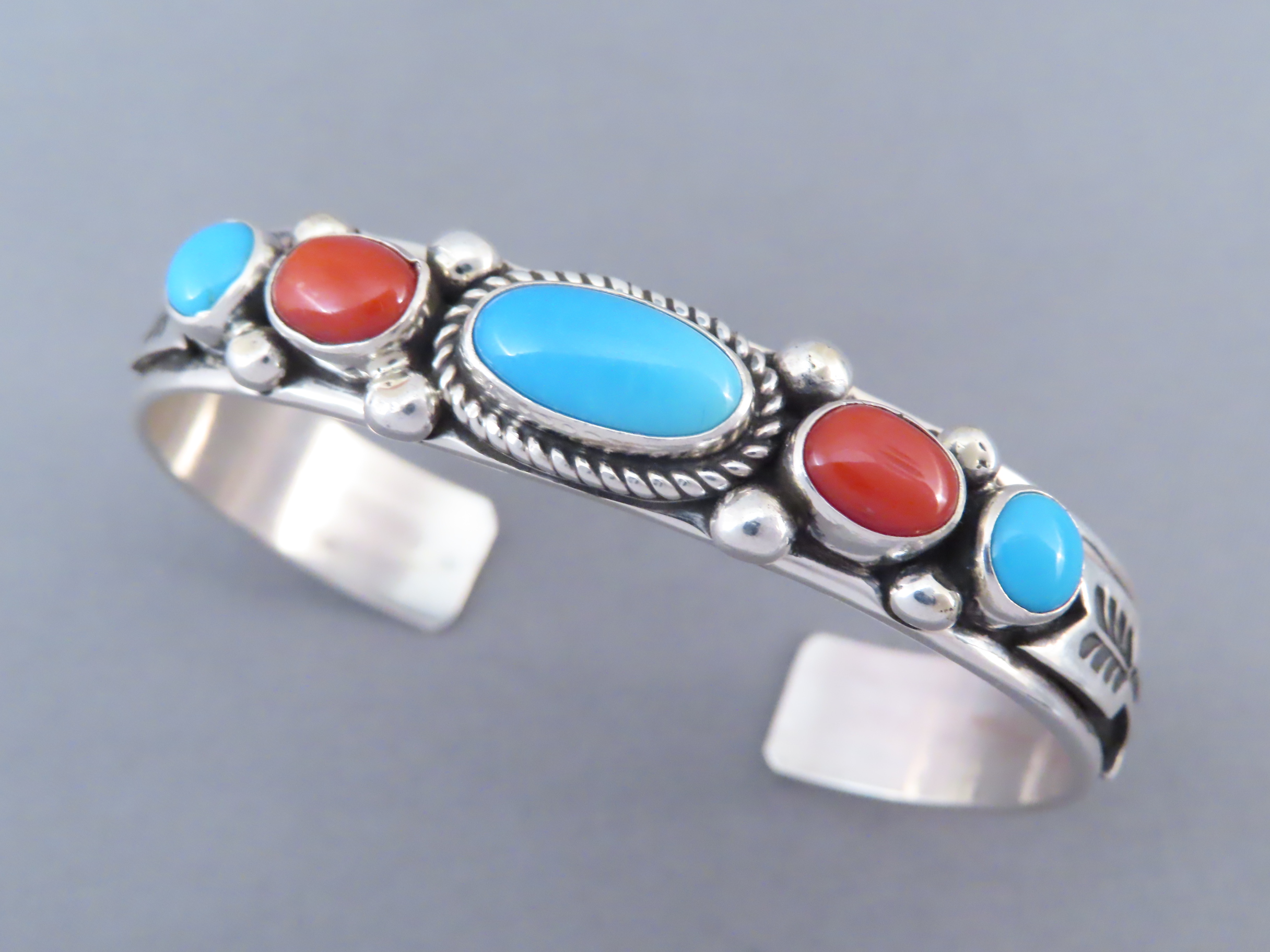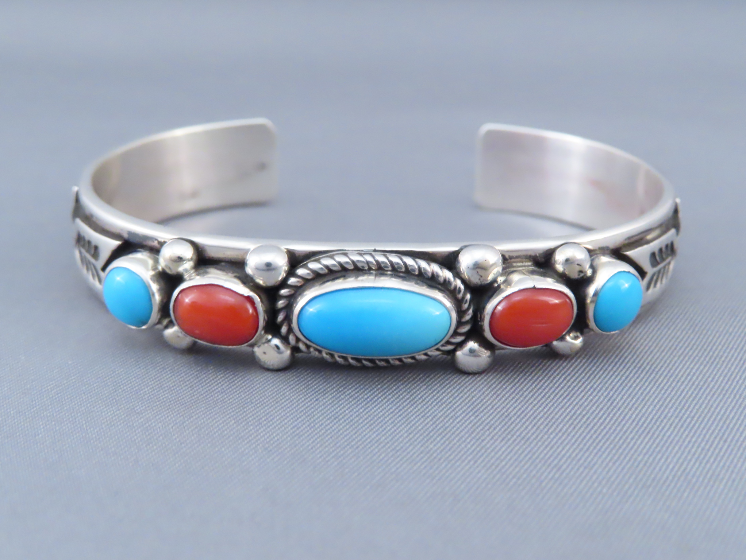 Lovely Multi-Stone Cuff Bracelet!  This VERY attractive sterling silver cuff bracelet with 3 vibrant Sleeping Beauty Turquoise stones, paired with 2 beautiful pieces of red Mediterranean Coral, was made by Native American jewelry artist, Albert Jake (Navajo).