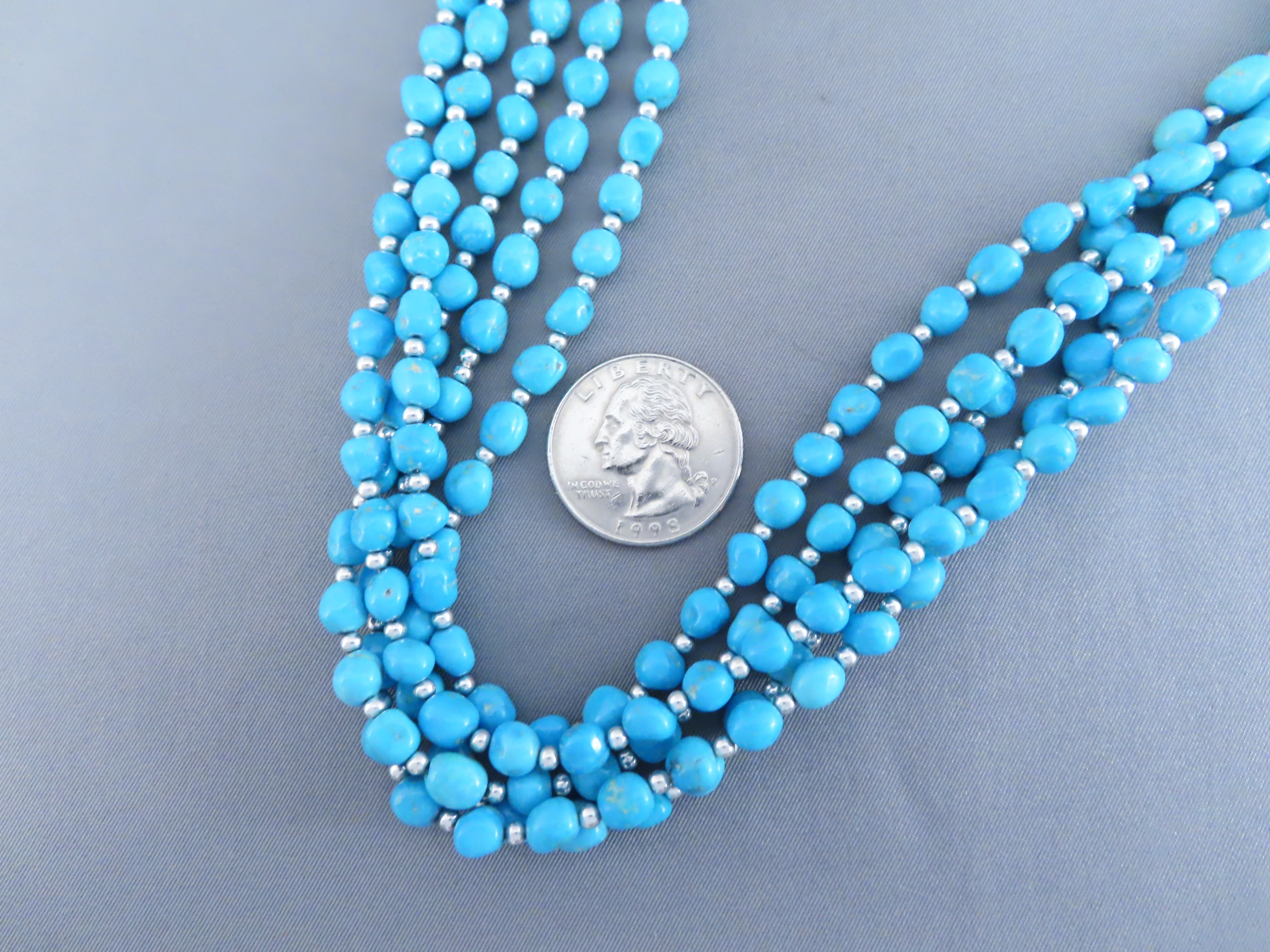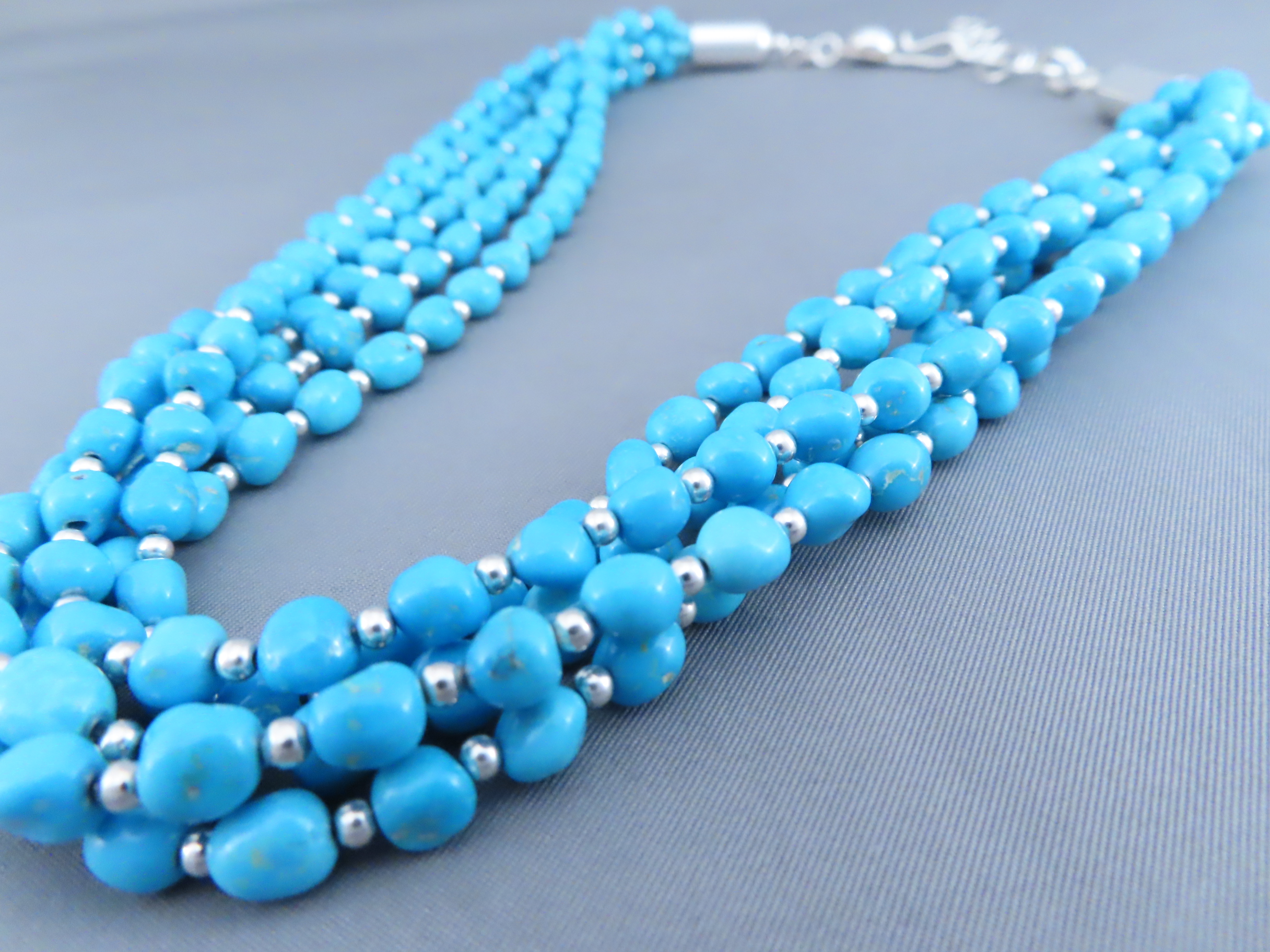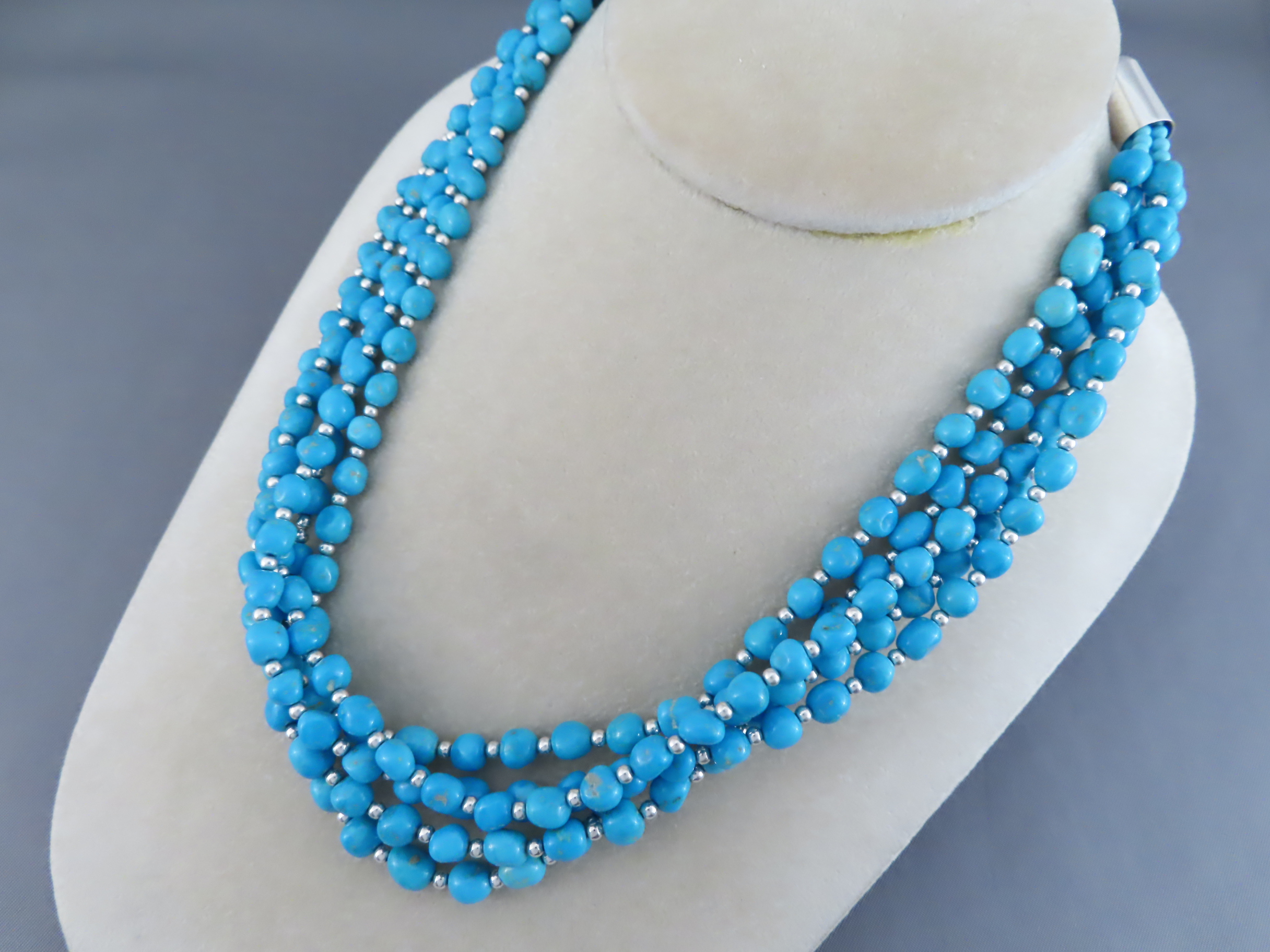 Beautifully made necklace of Sleeping Beauty Turquoise with sterling silver bead accents and closures. Attractive, vibrant, natural stones. A lighter-weight piece, but with a very ‘full’ look. Made by Native American jewelry artist Desiree Yellowhorse (Navajo), daughter of very highly regarded Navajo jewelry artist, Artie Yellowhorse.