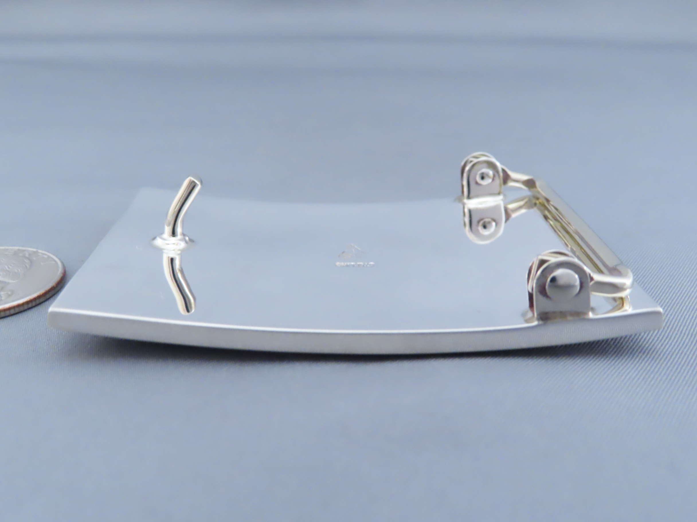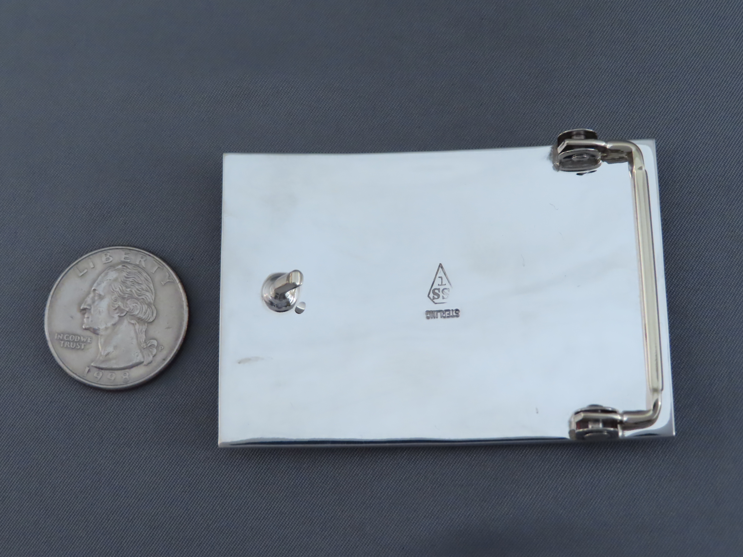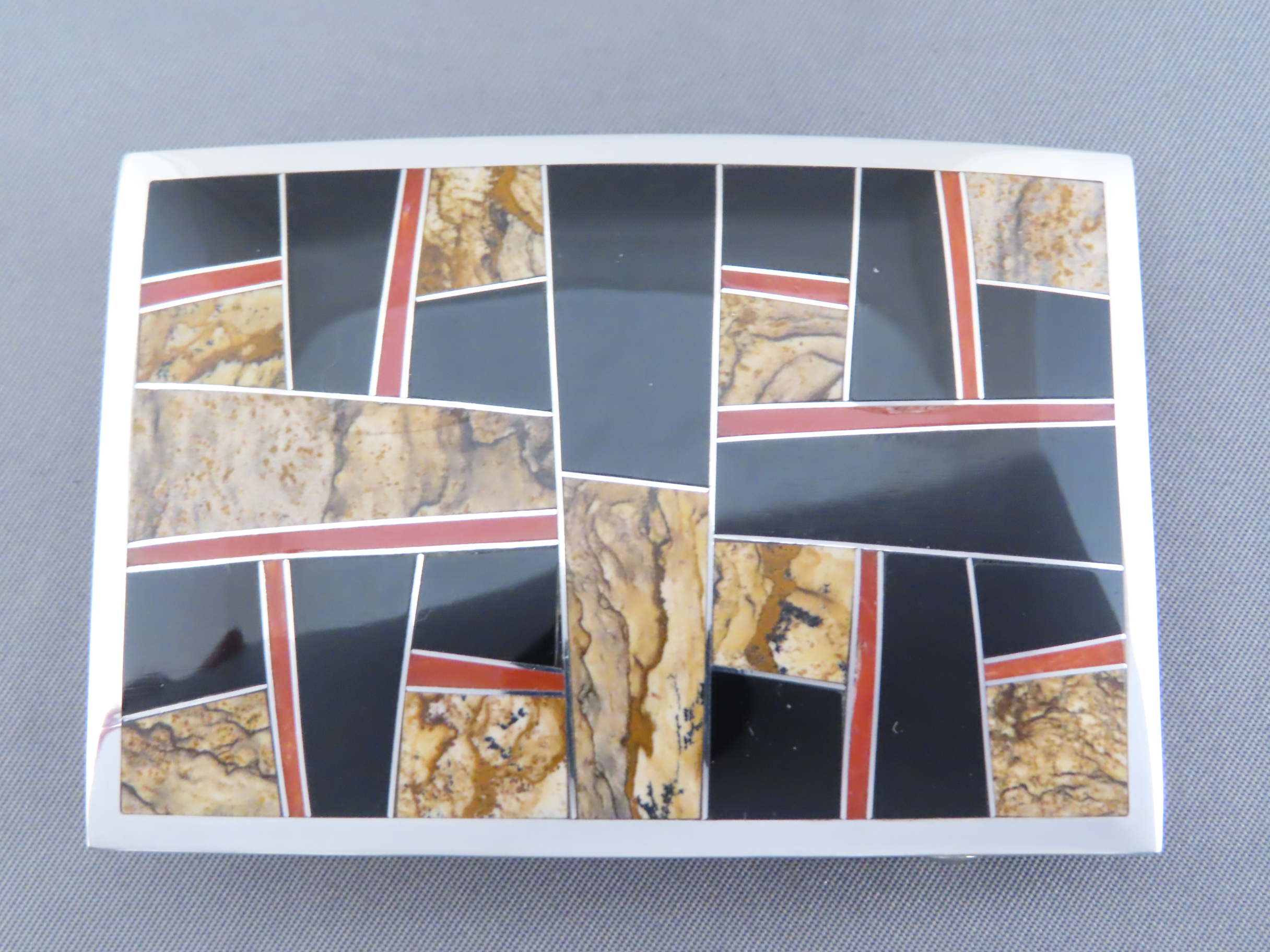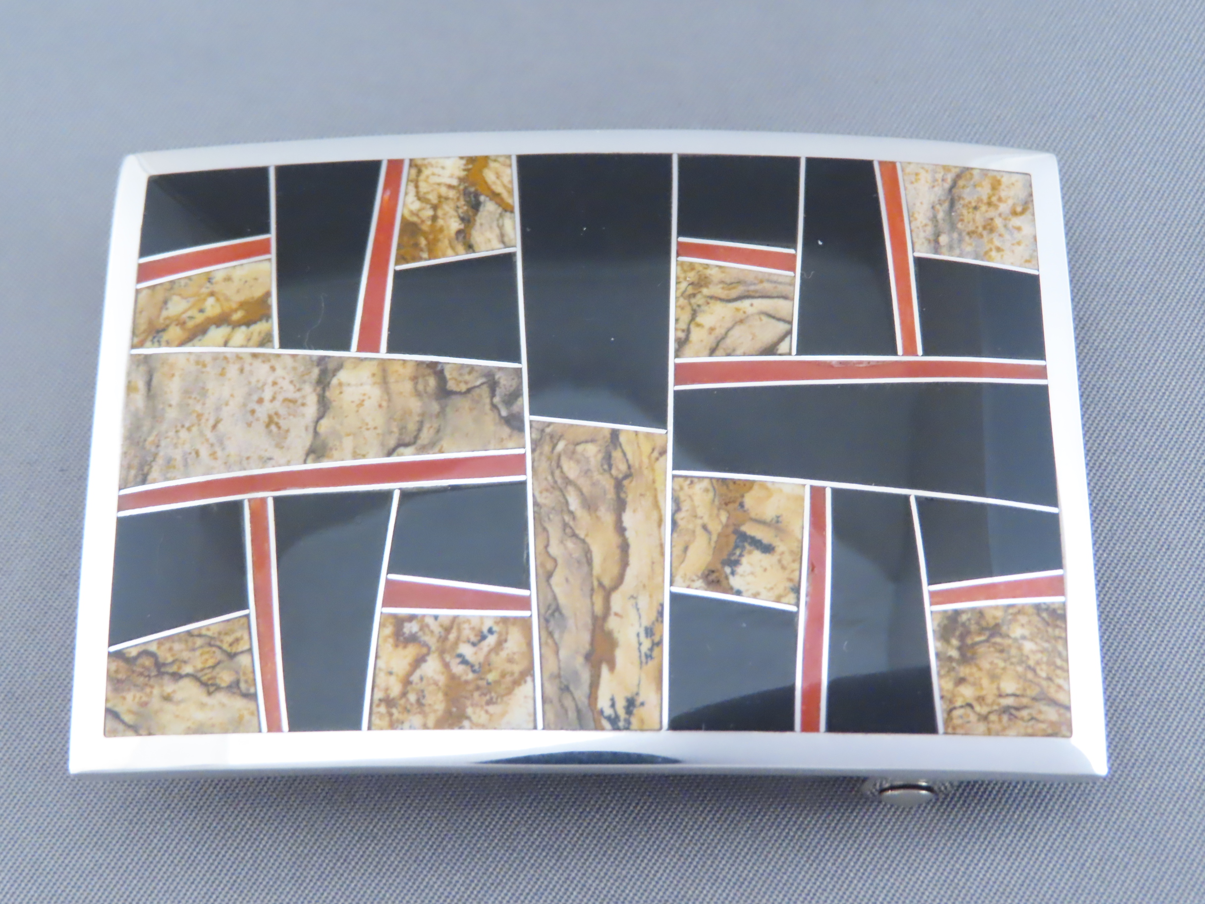 LOVELY multi-stone inlay belt buckle! Navajo jewelry artist, Tim Charlie, made this sterling silver inlay belt buckle with expertly inlaid Picture Jasper, Coral, and Black Jade. Beautiful inlay color combination! Buckle fits up to a 1 1/2″ wide belt.