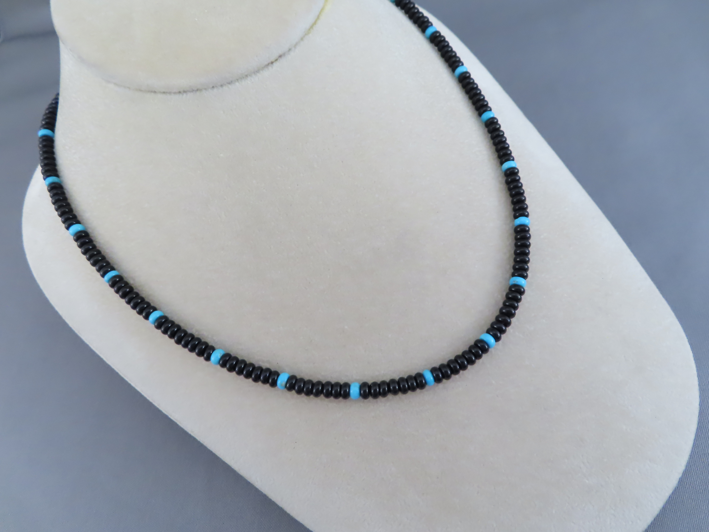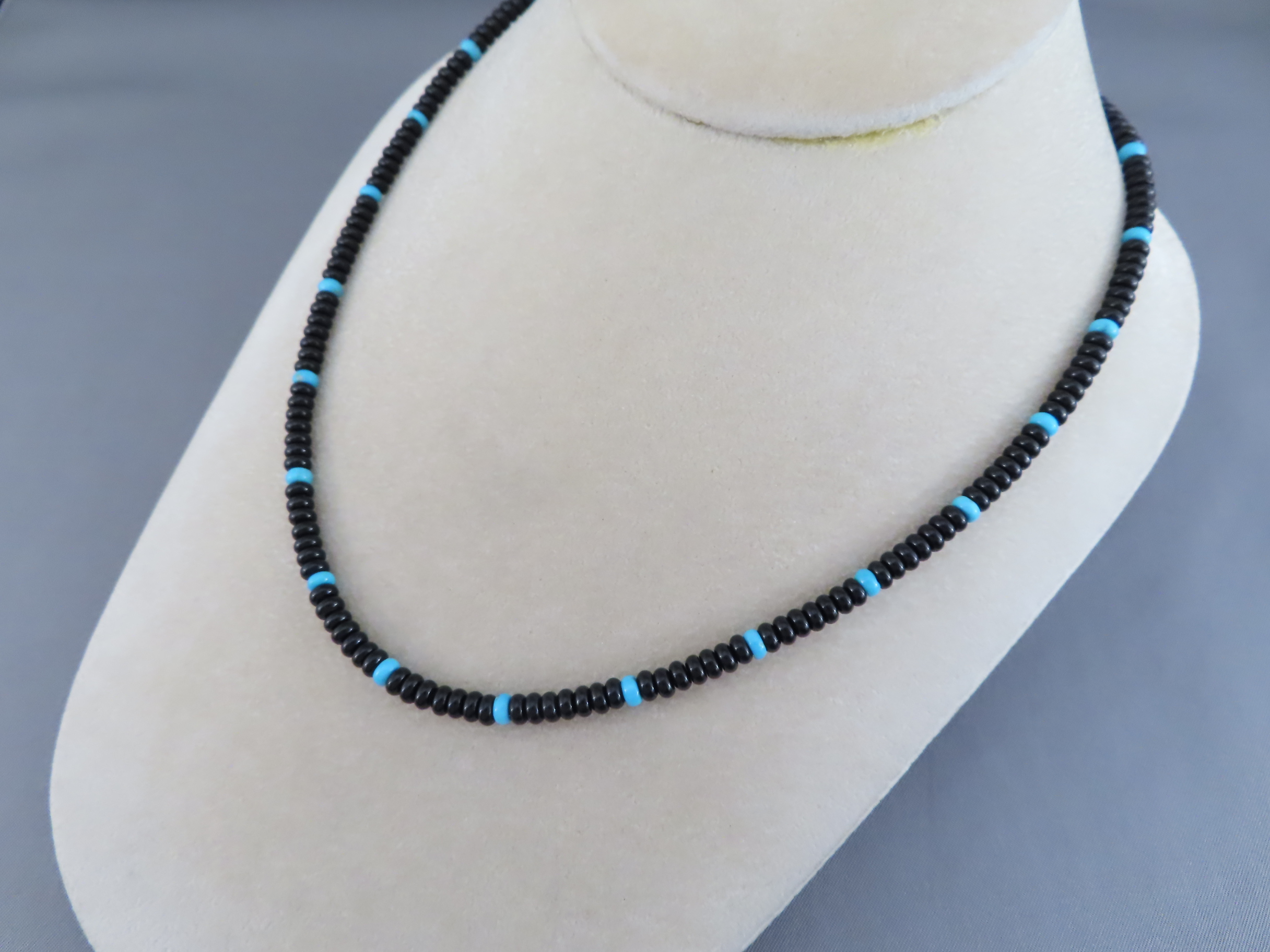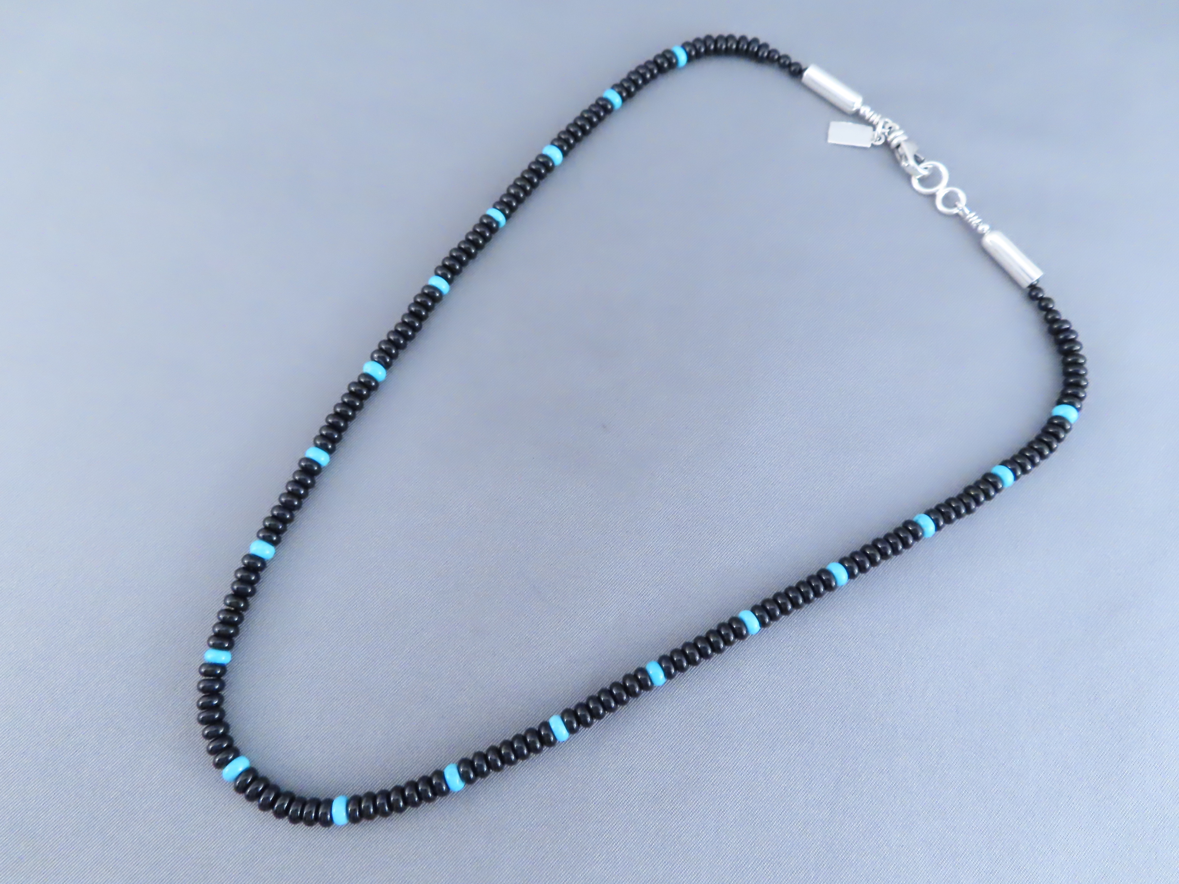Attractive Black & Blue Necklace! Single-strand necklace of Black Onyx with Sleeping Beauty Turquoise accents. Made by Native American (Navajo) jewelry artist, Desiree Yellowhorse (Daughter of Artie Yellowhorse).