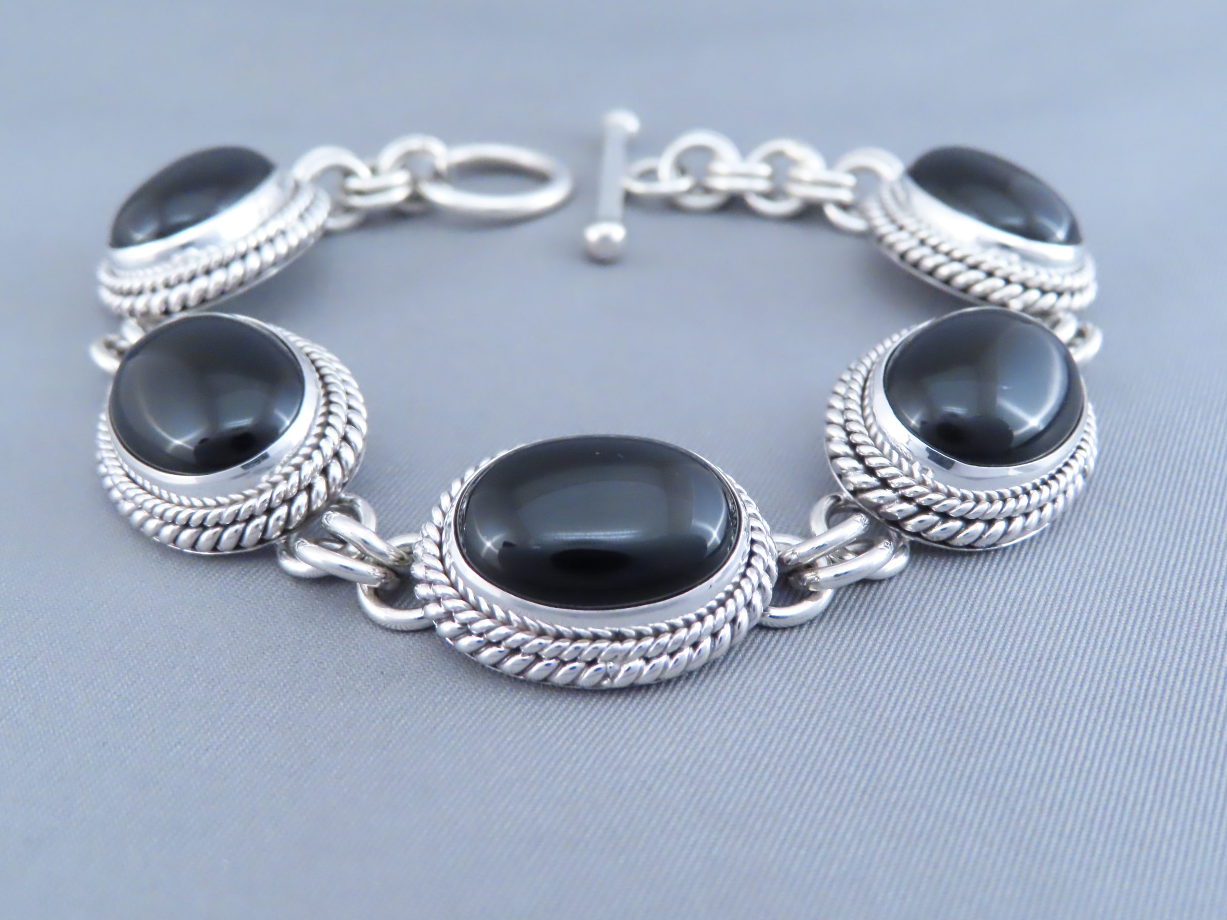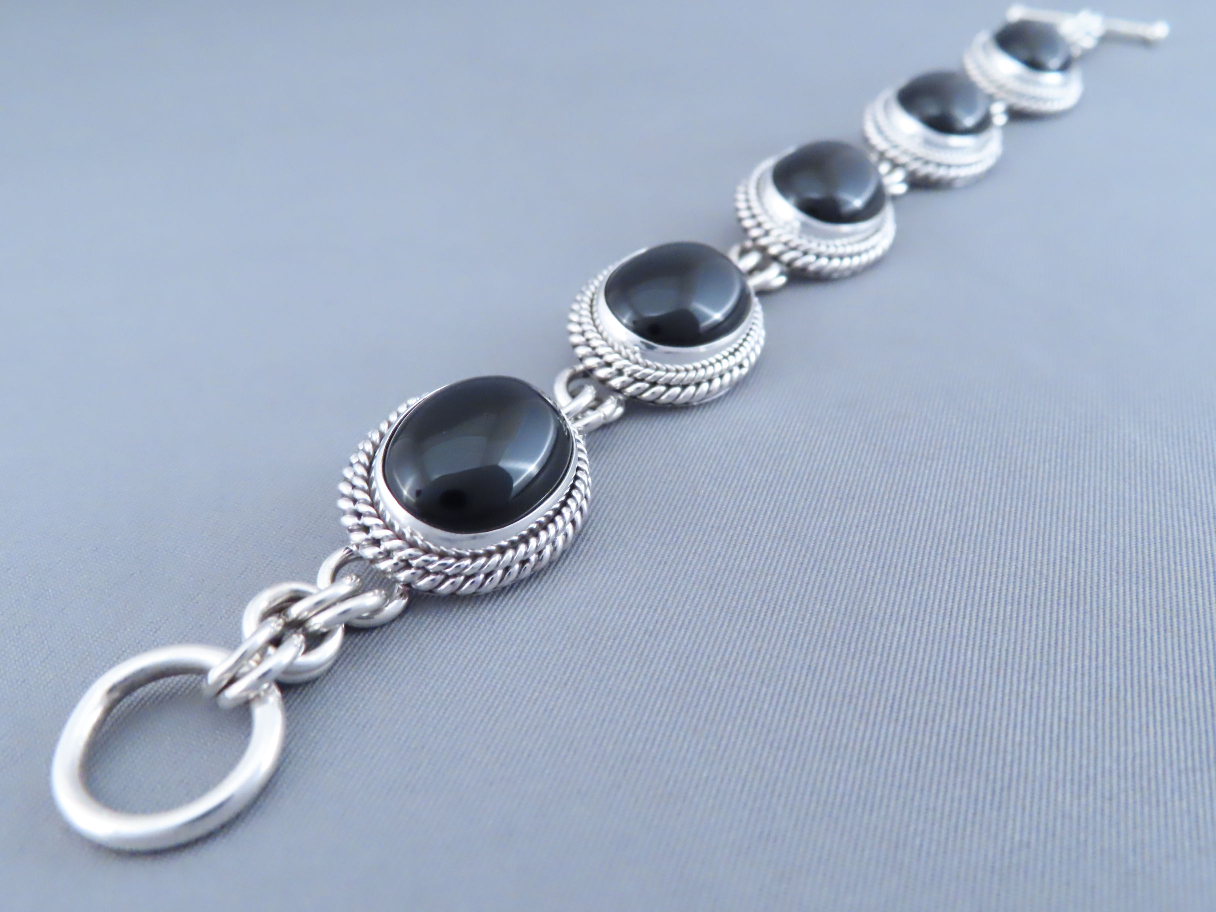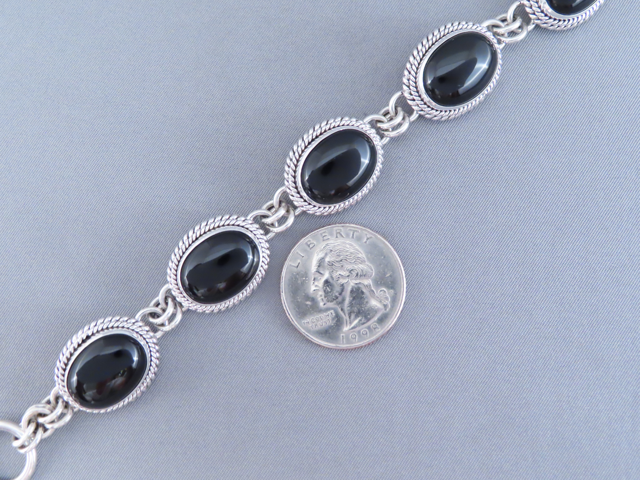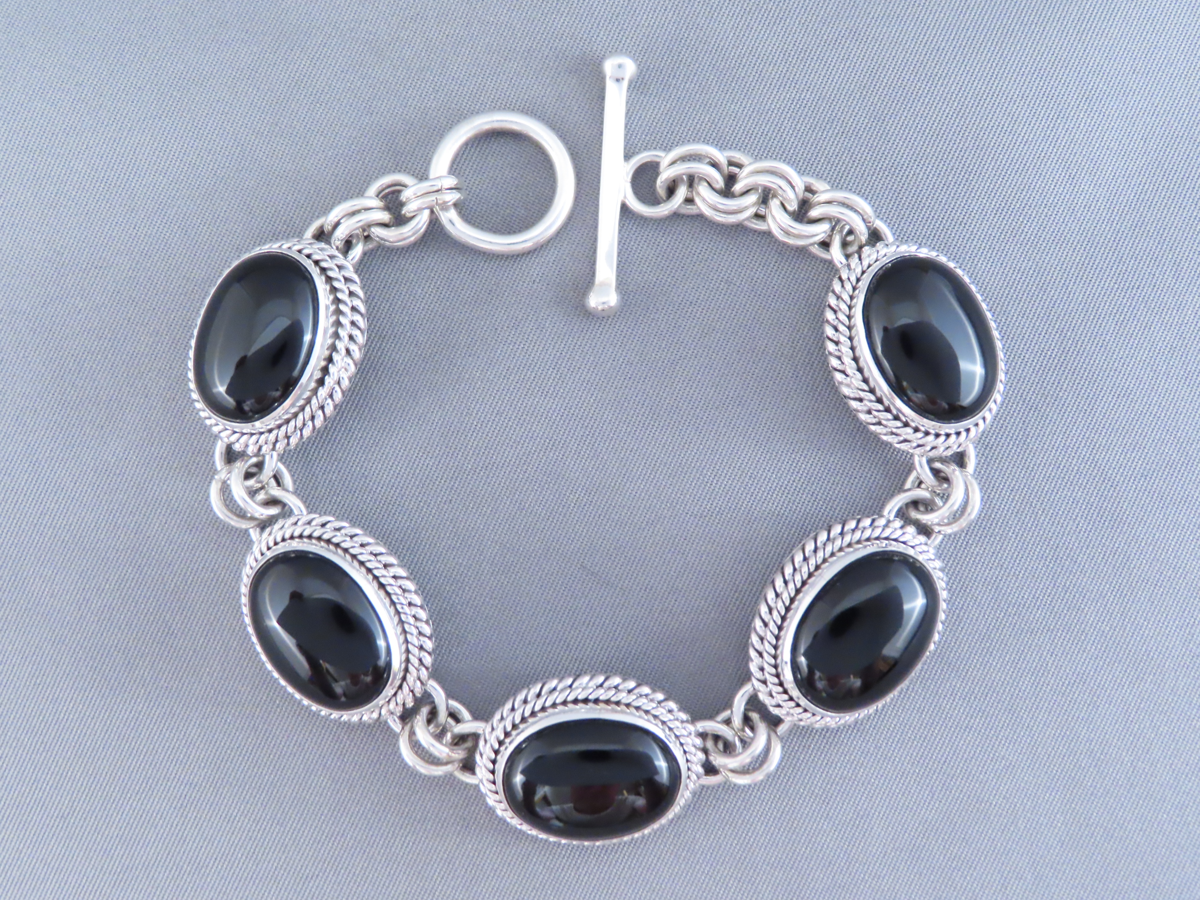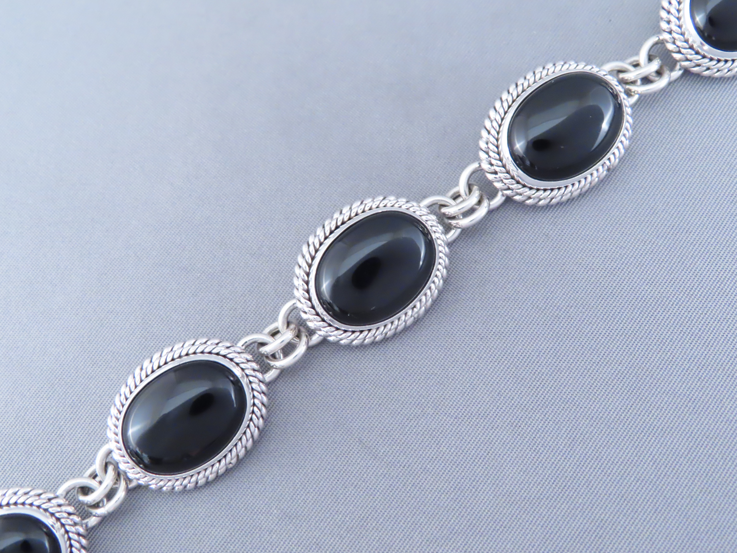Beautifully eye-catching Black Onyx Link Bracelet! Sterling silver link bracelet with 5 lovely oval Black Onyx medallions by Navajo jewelry artist, Artie Yellowhorse.