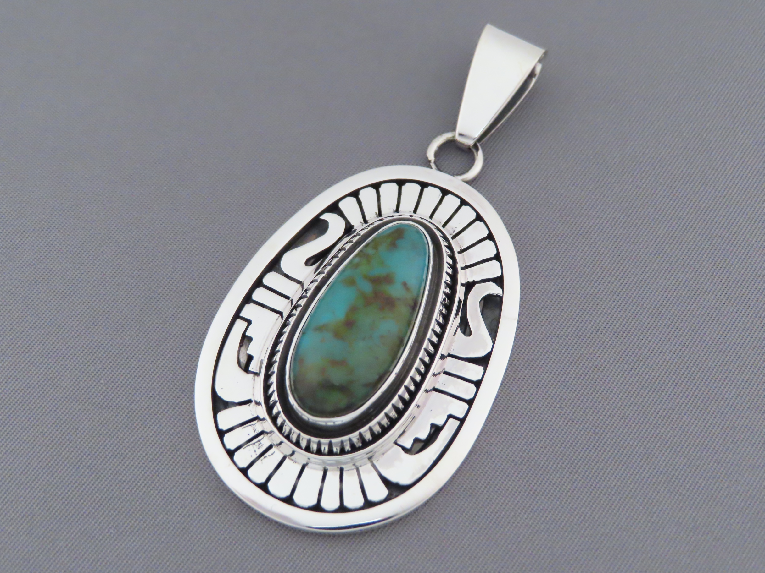 LOVELY Blue Gem Turquoise pendant! Absolutely beautiful sterling silver & Blue Gem Turquoise pendant by Native American jewelry artist, Leonard Nez (Navajo). A great turquoise stone, and excellent silver-work are featured here by Leonard Nez. Beautiful turquoise jewelry!