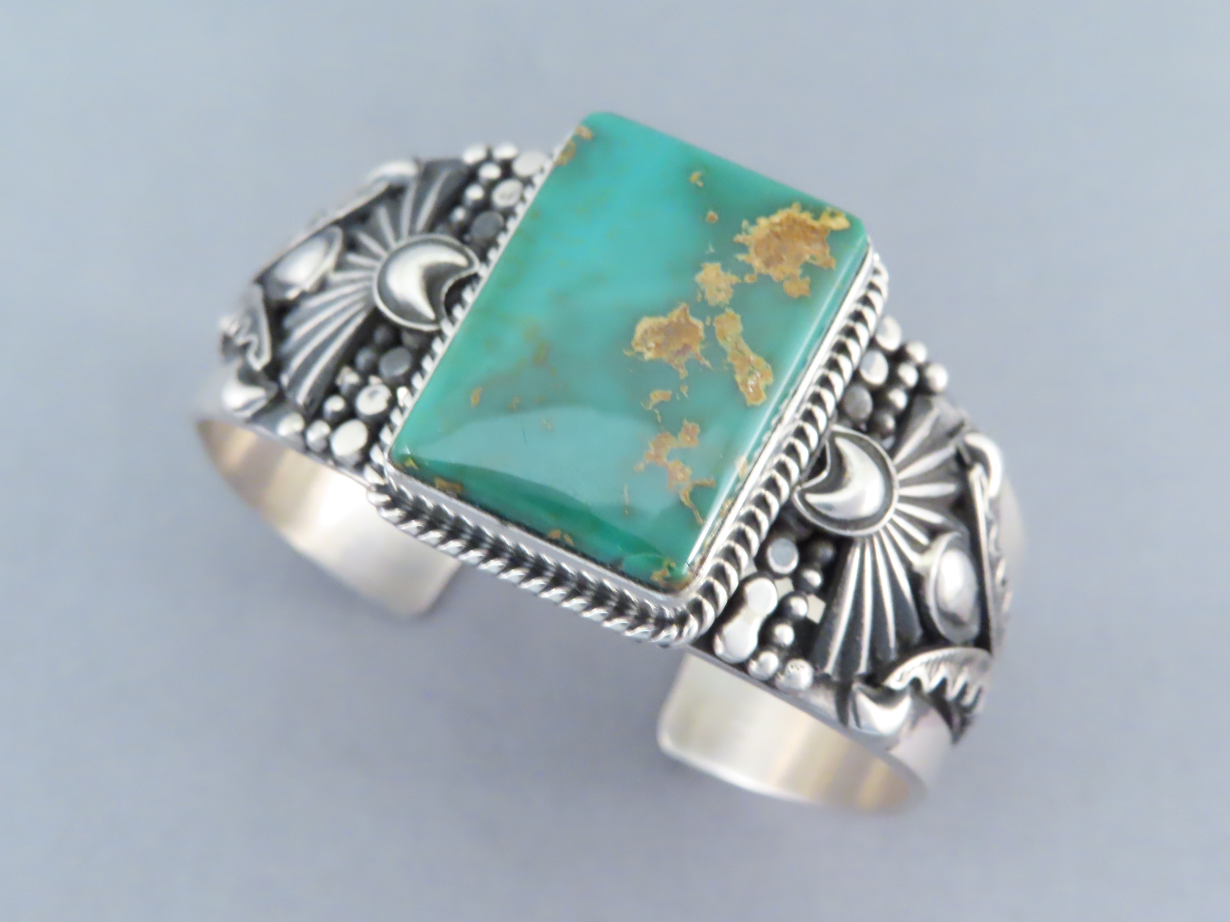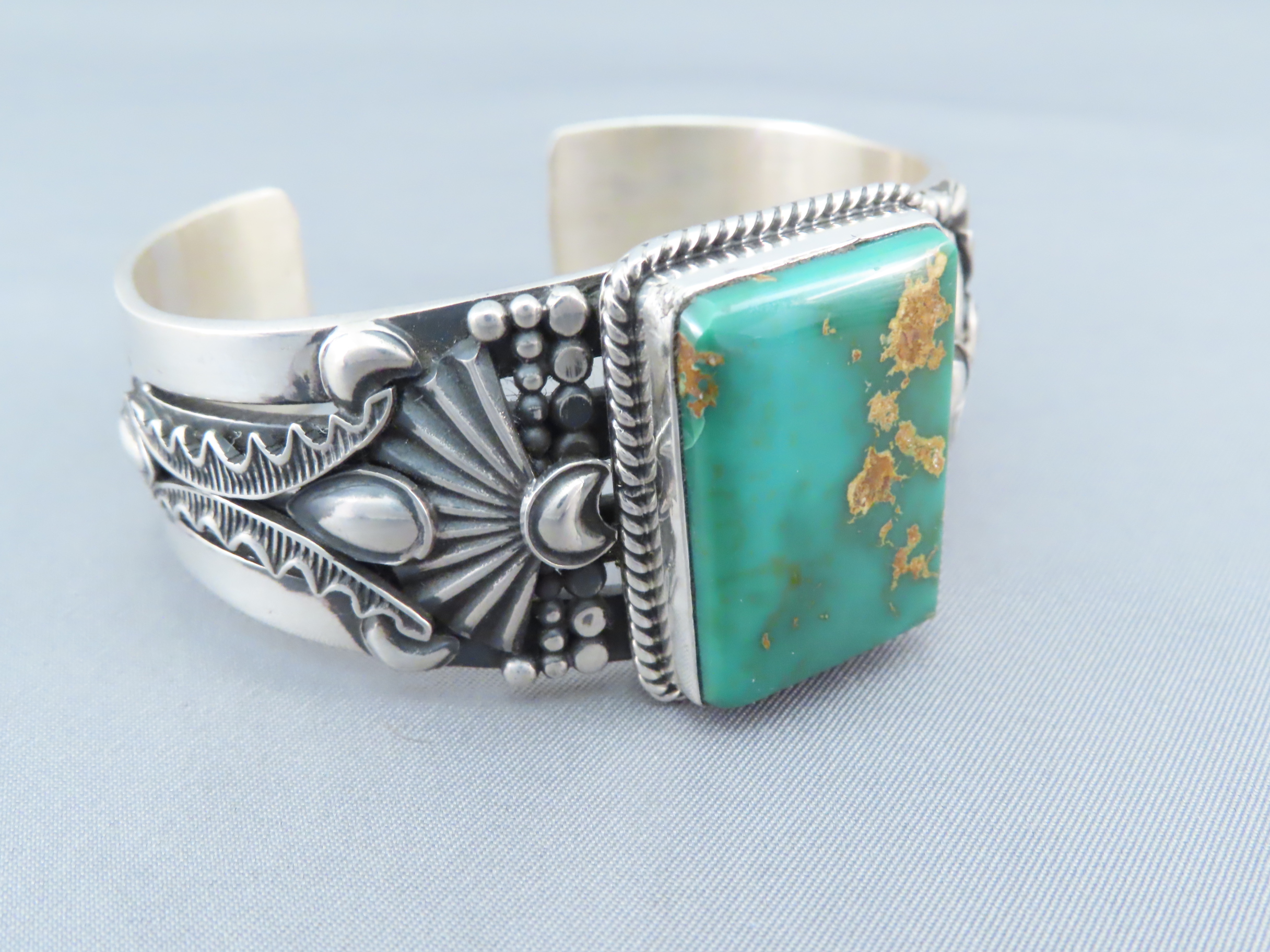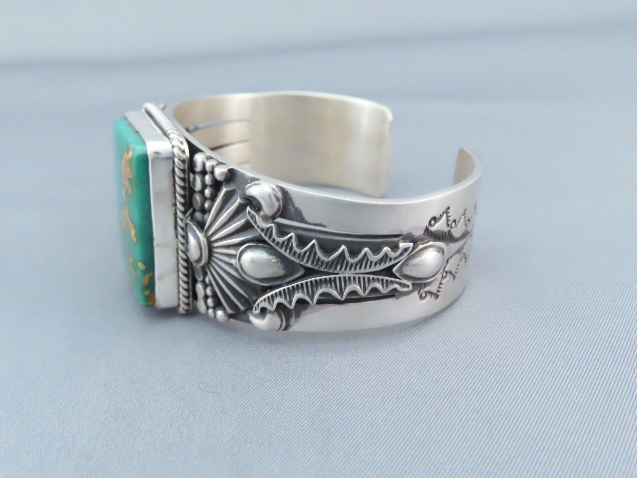 Beautifully awesome Royston Turquoise cuff bracelet! Sterling silver cuff bracelet with a really vibrant & absolutely gorgeous Royston Turquoise centerpiece stone. Made by Native American jewelry artist, Derrick Gordon (Navajo).