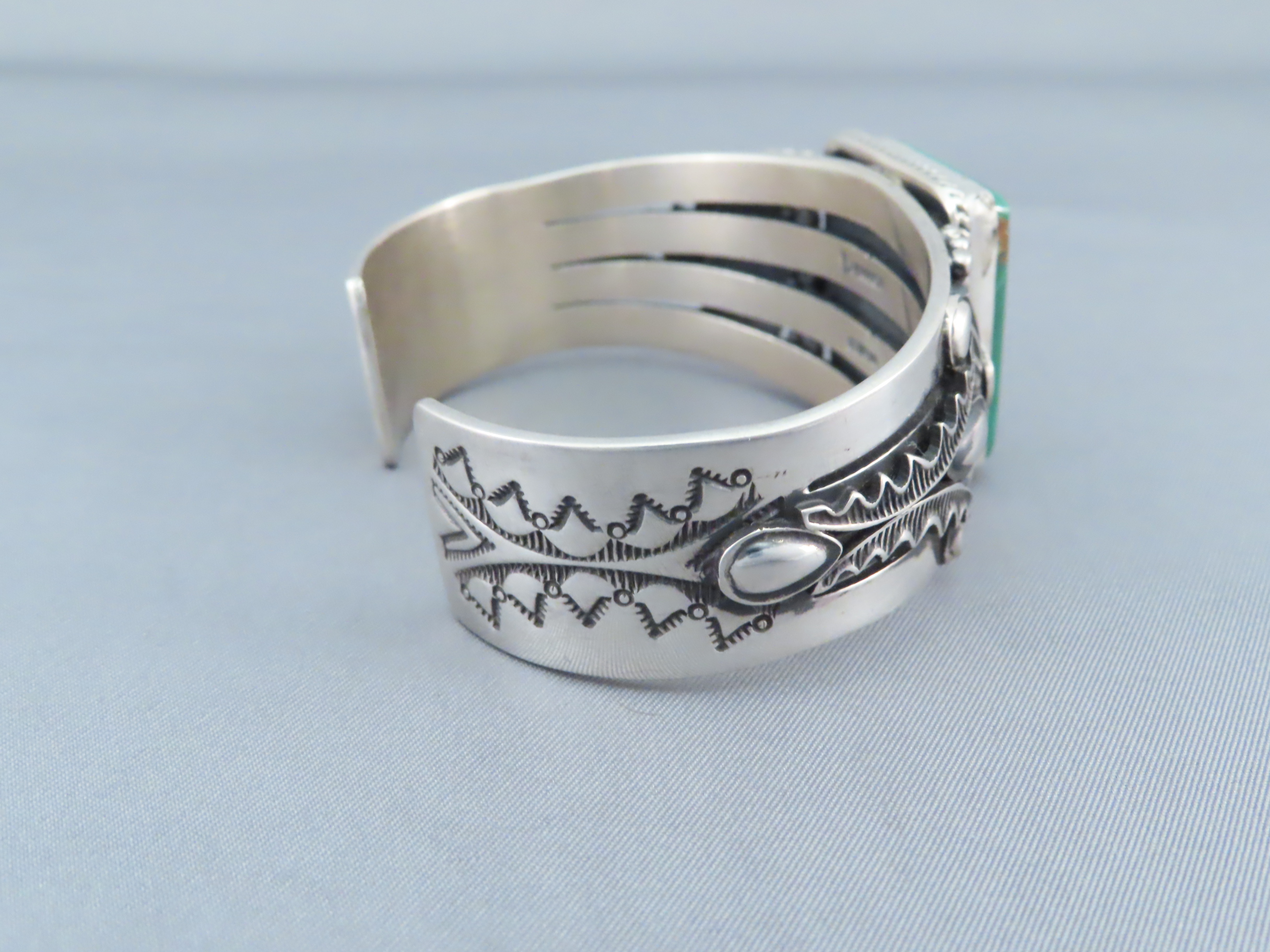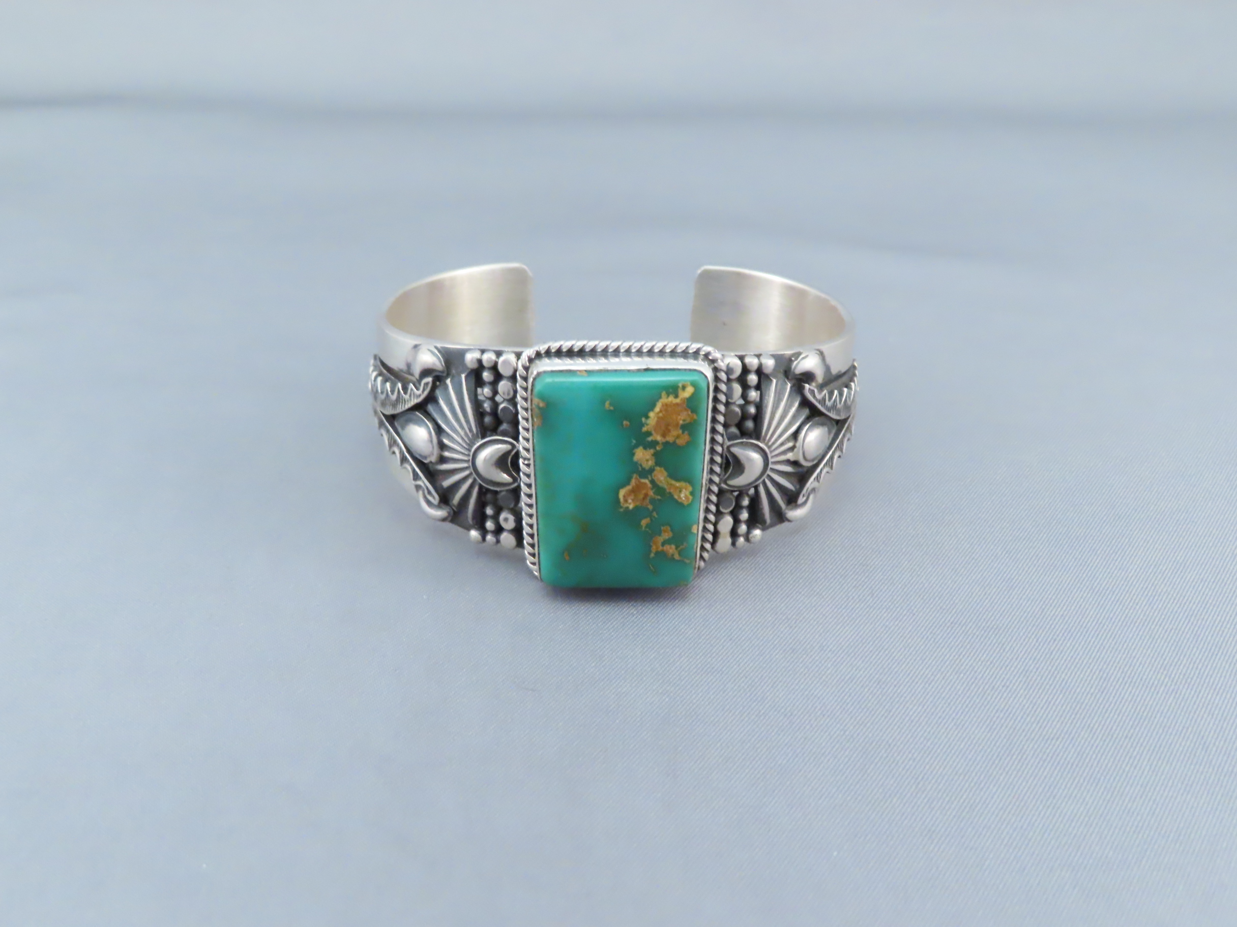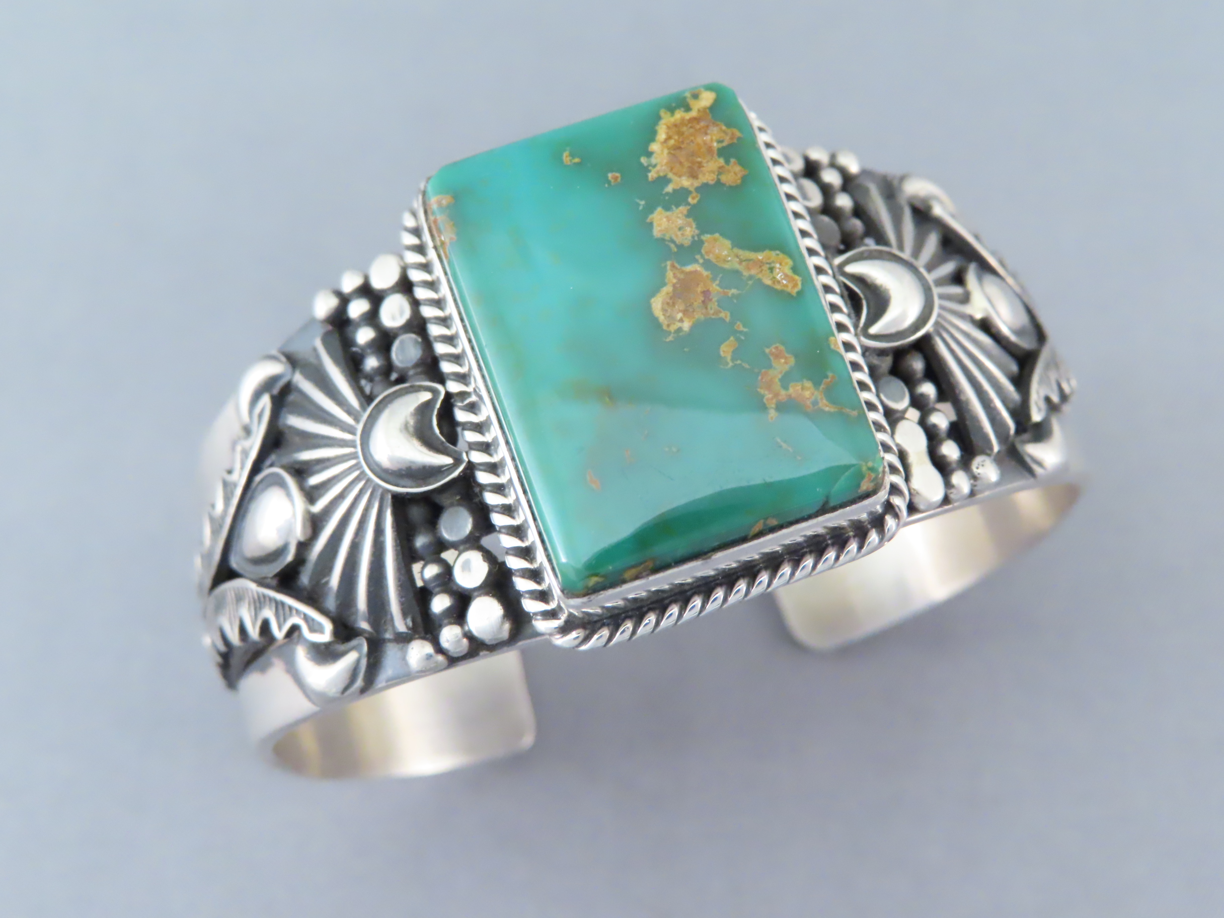 Beautifully awesome Royston Turquoise cuff bracelet! Sterling silver cuff bracelet with a really vibrant & absolutely gorgeous Royston Turquoise centerpiece stone. Made by Native American jewelry artist, Derrick Gordon (Navajo).