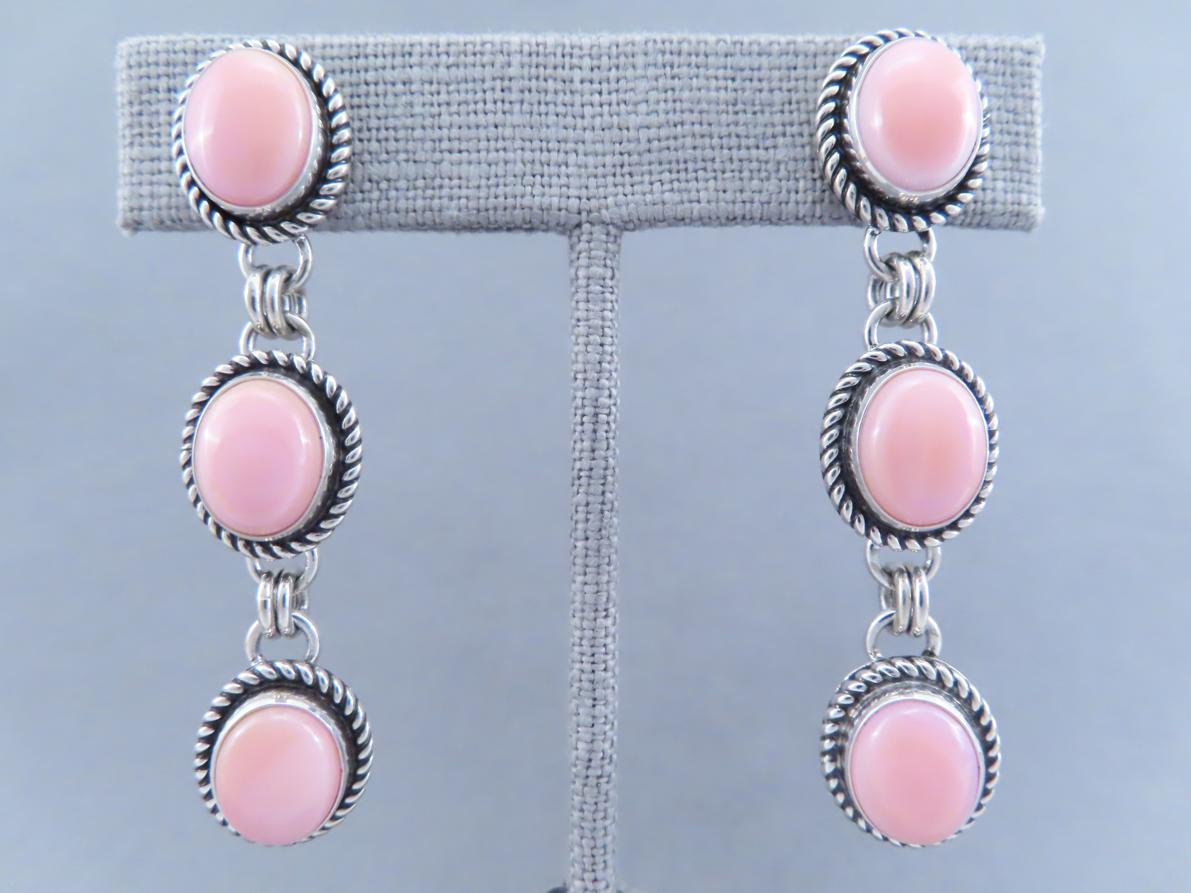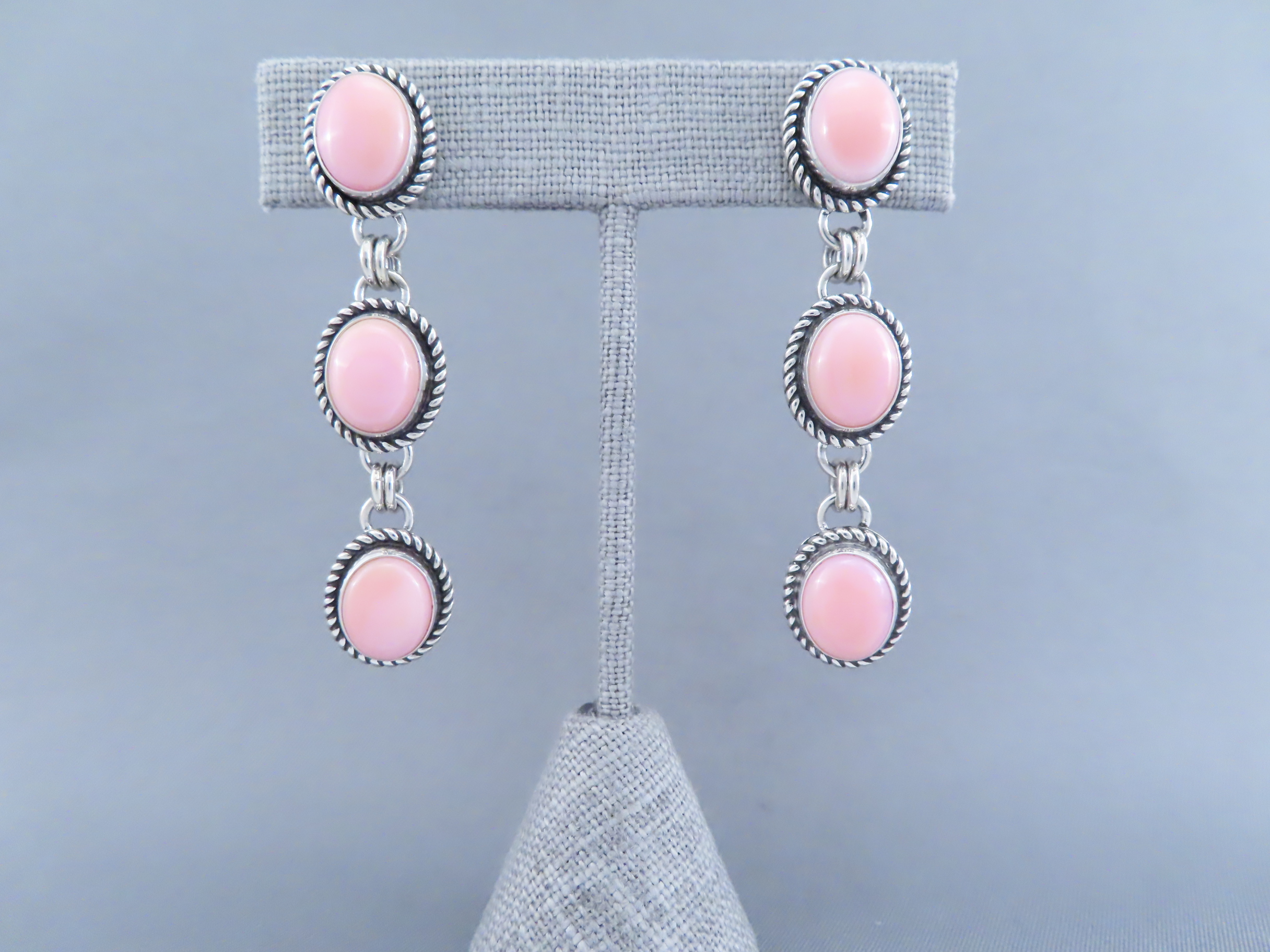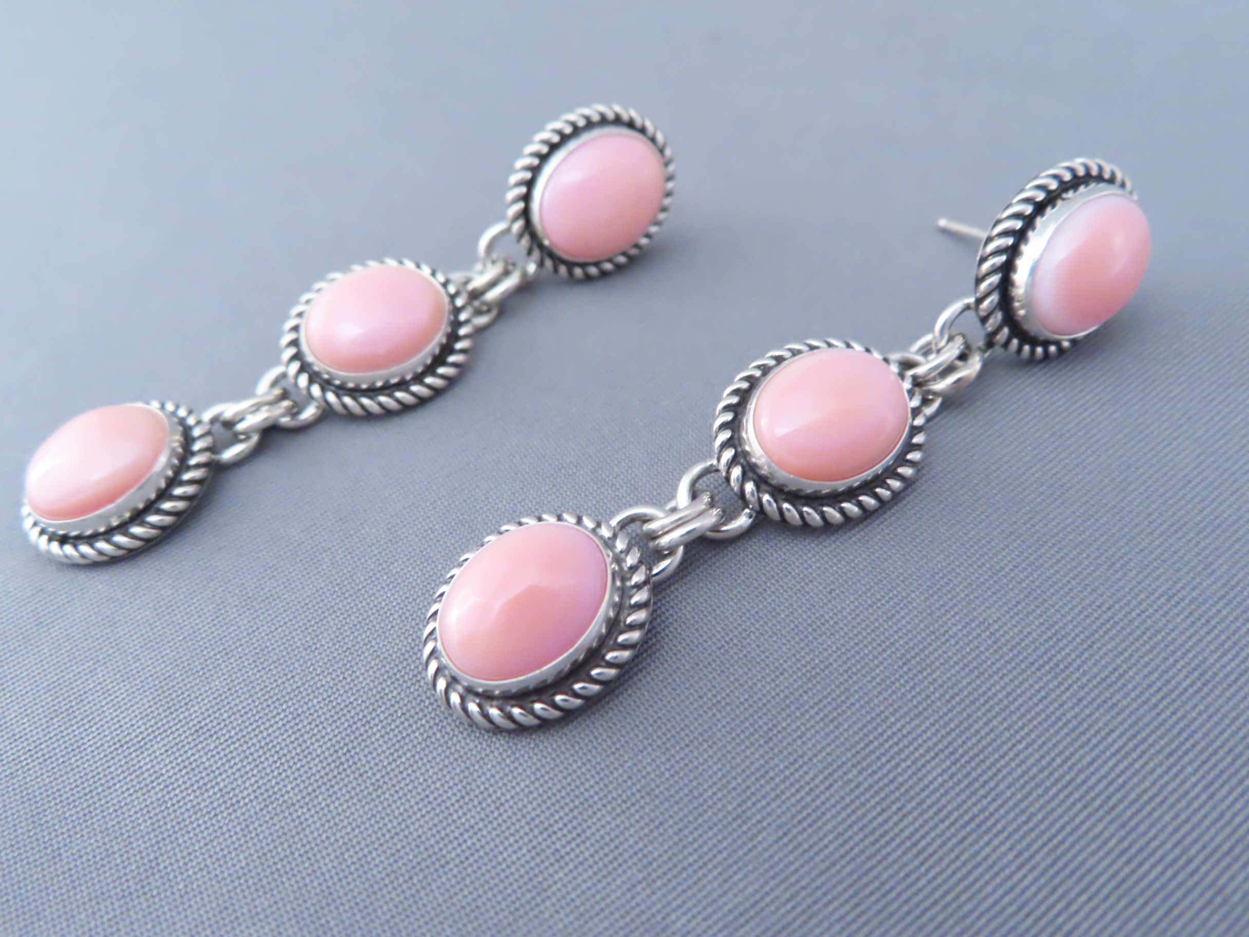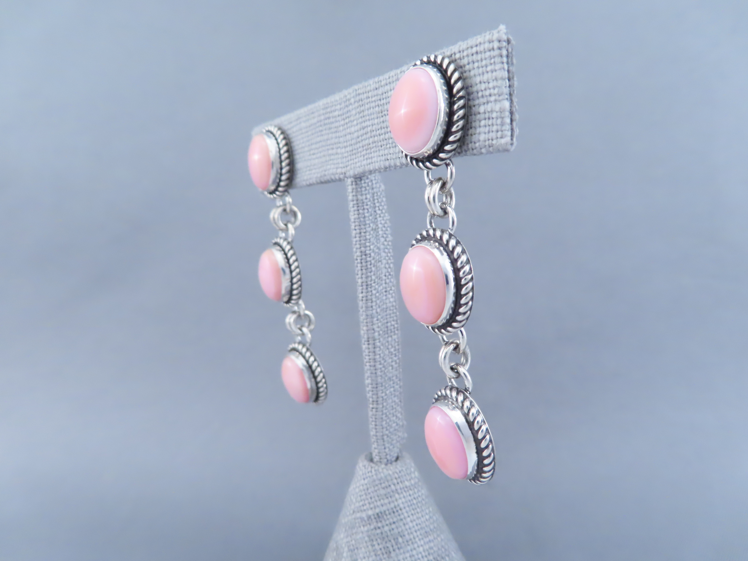 Long Pink Conch Shell Earrings by Artie Yellowhorse! Beautifully vibrant pink shell earrings (long posts) by Native American jewelry artist, Artie Yellowhorse (Navajo). 3 tiers of lovely pink!