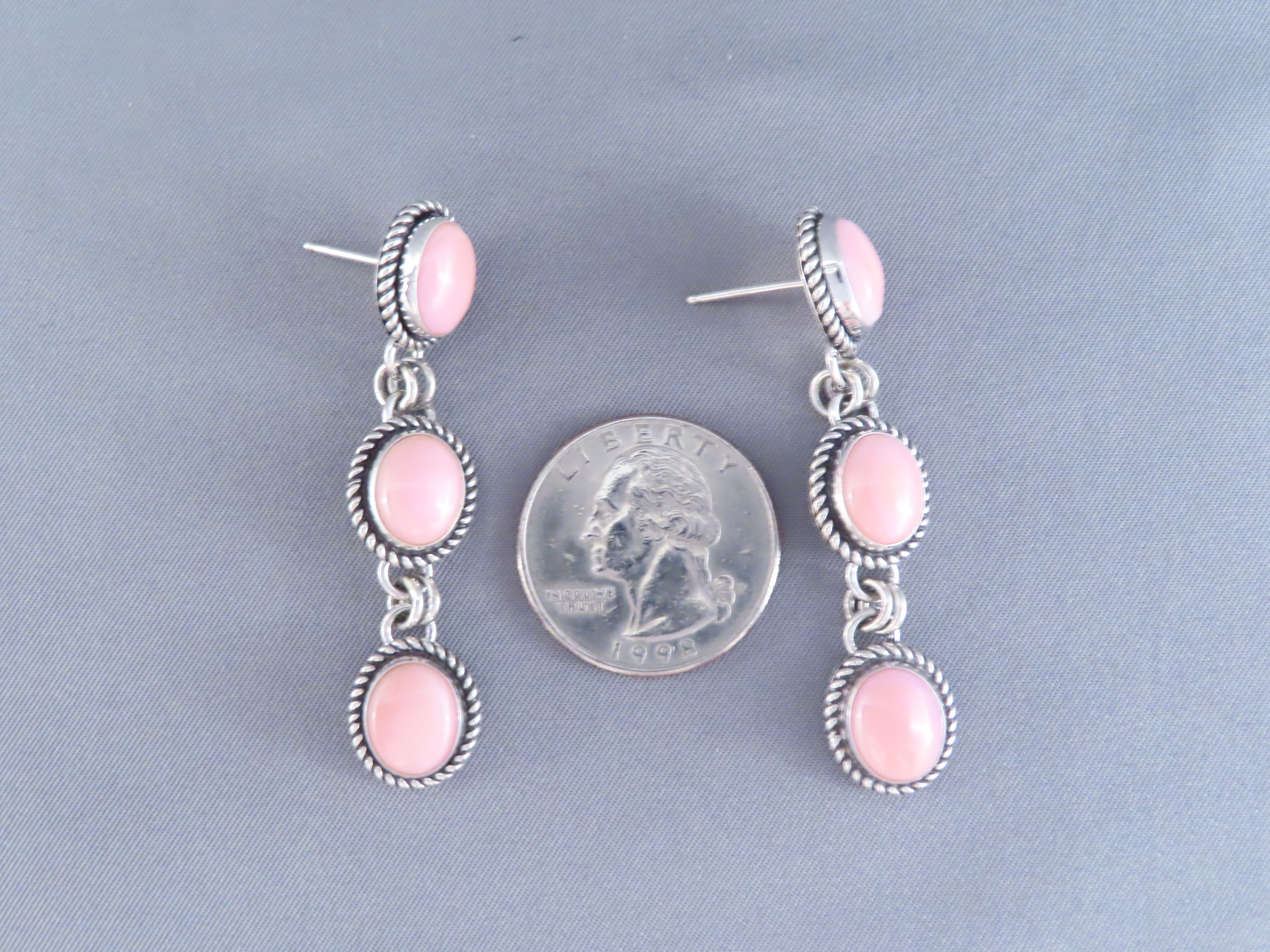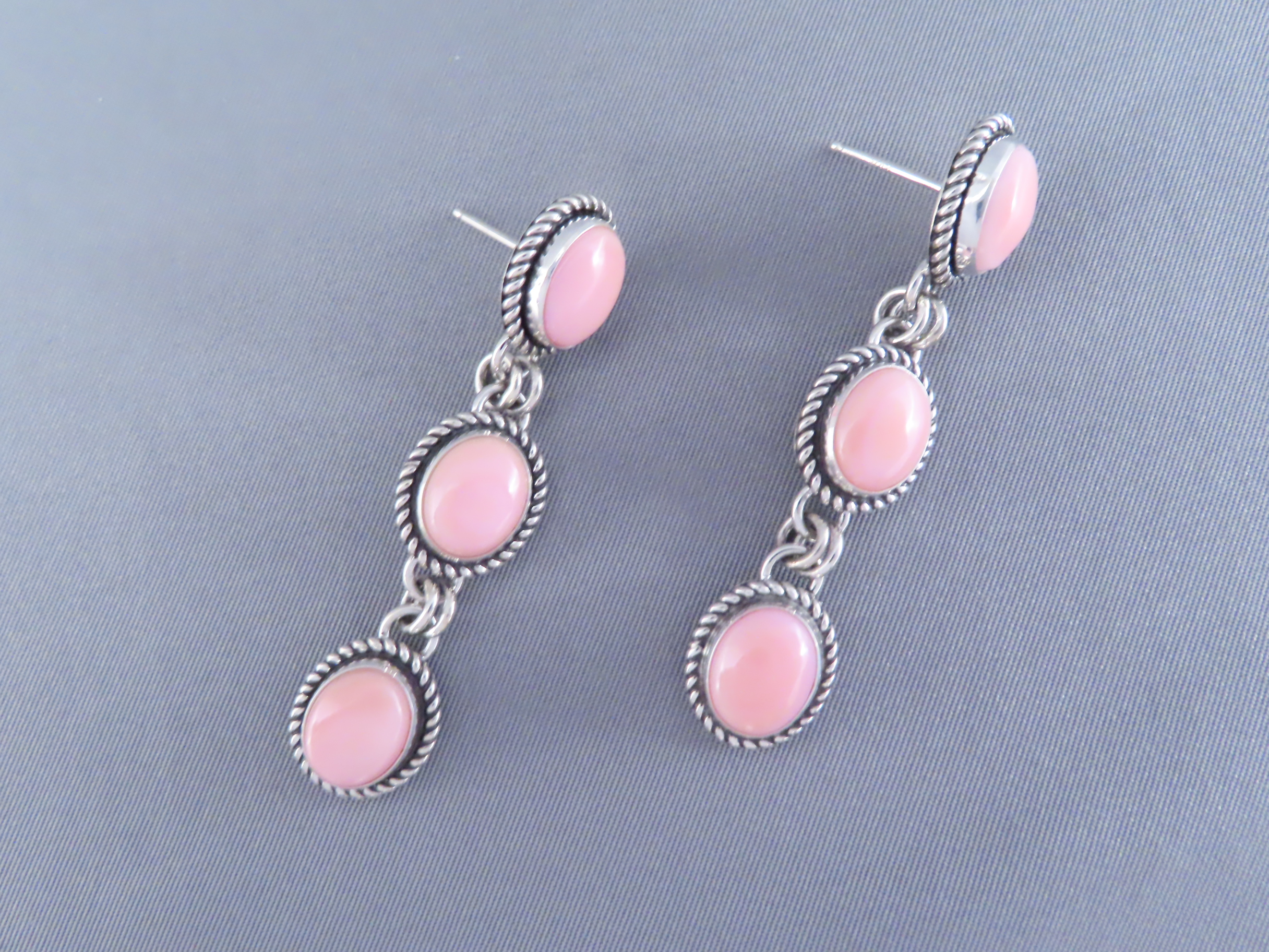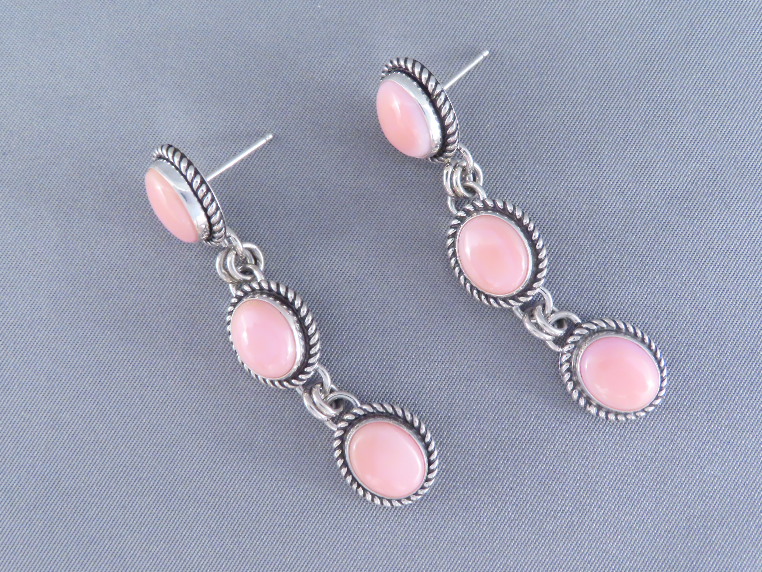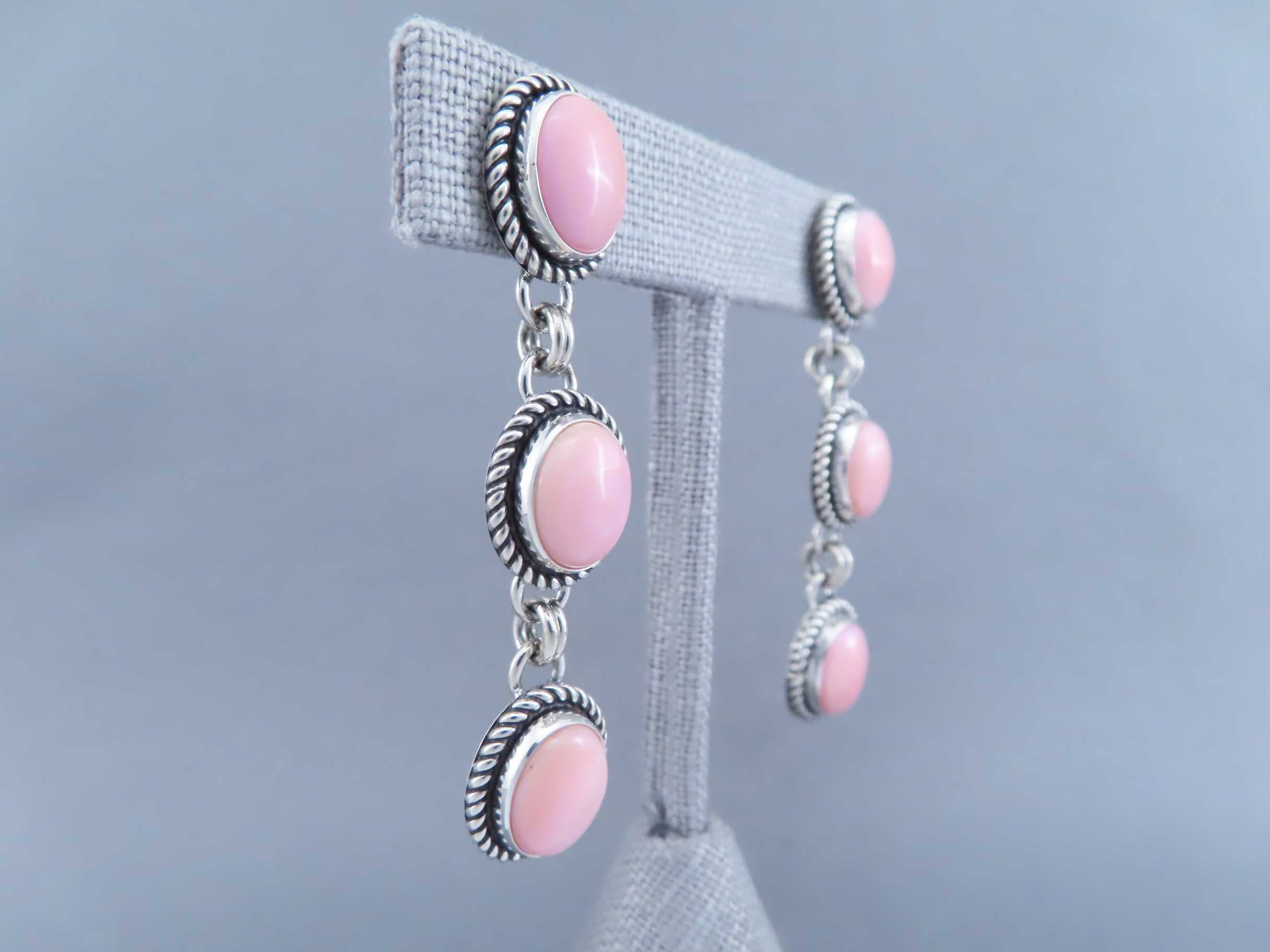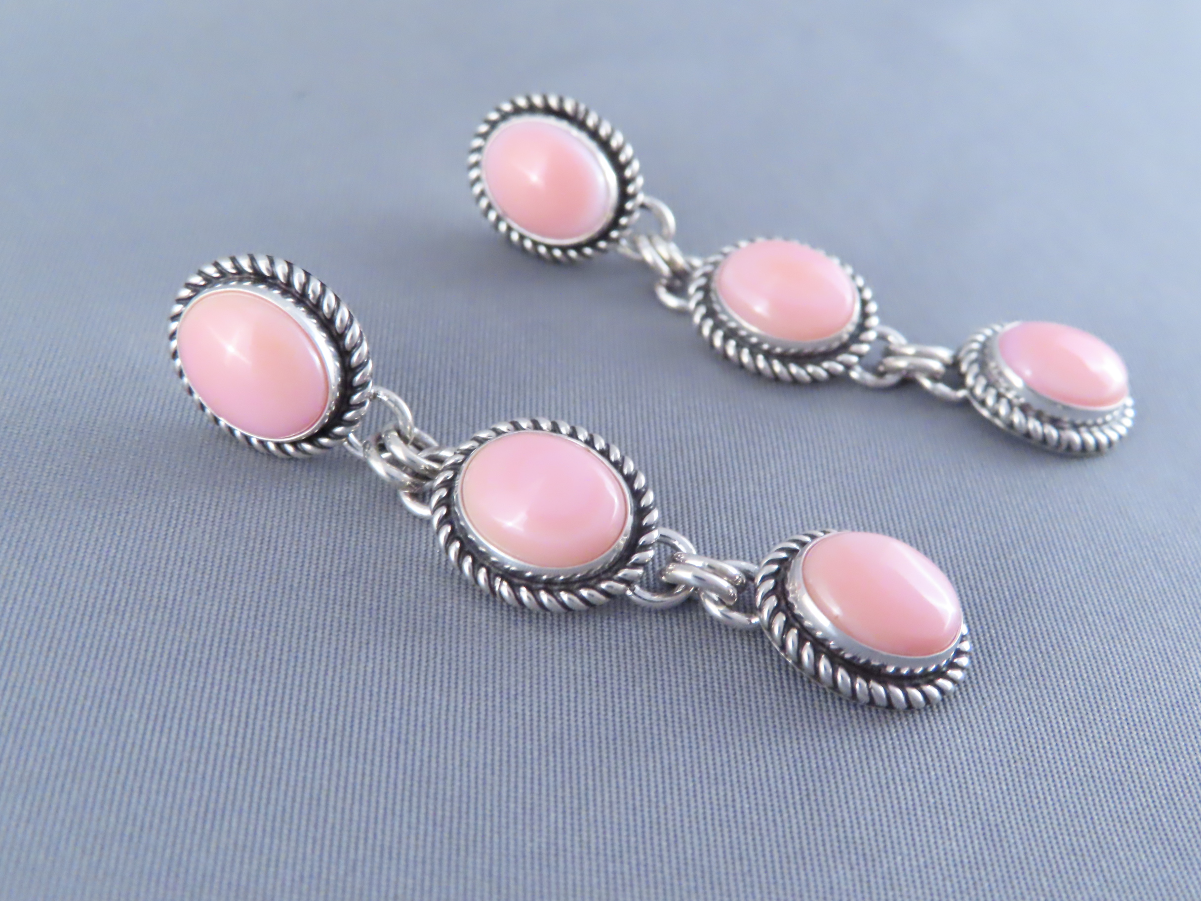 Long Pink Conch Shell Earrings by Artie Yellowhorse! Beautifully vibrant pink shell earrings (long posts) by Native American jewelry artist, Artie Yellowhorse (Navajo). 3 tiers of lovely pink!