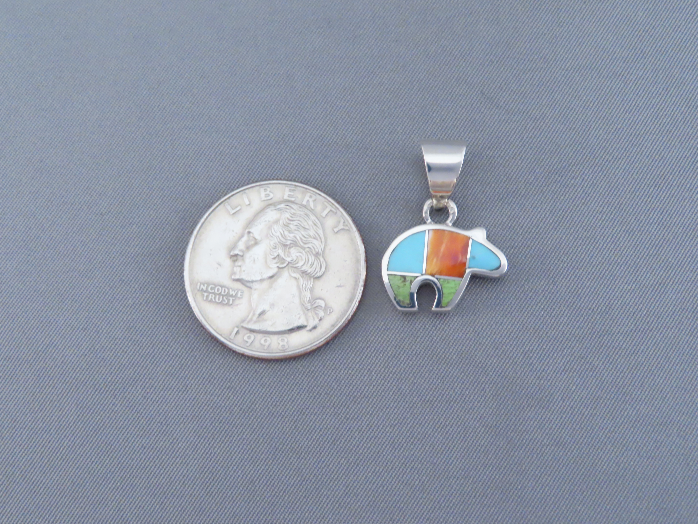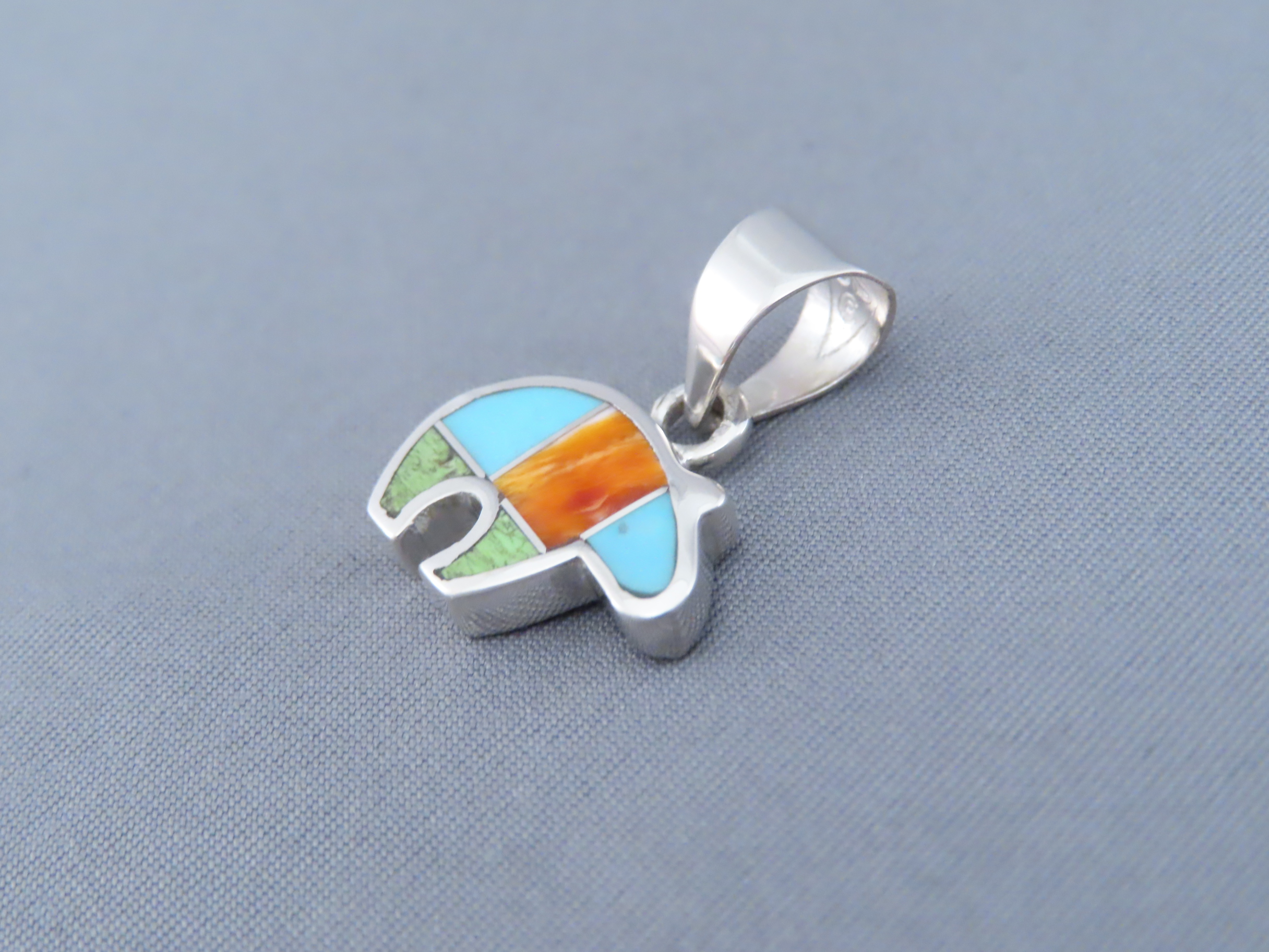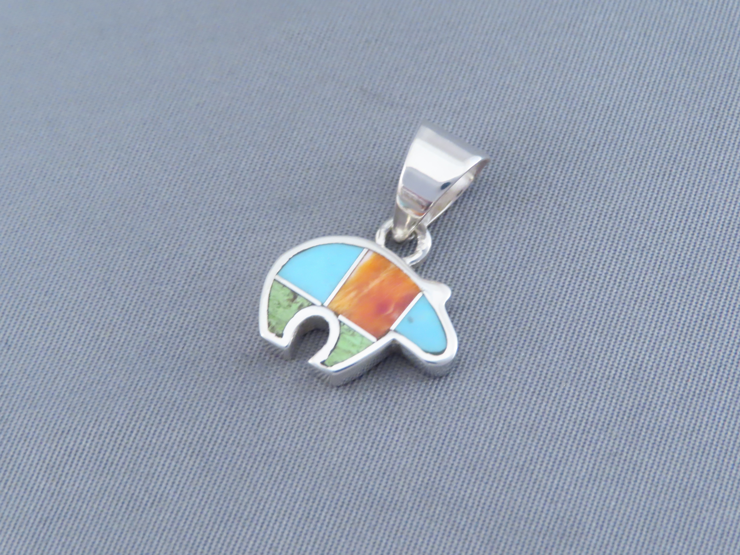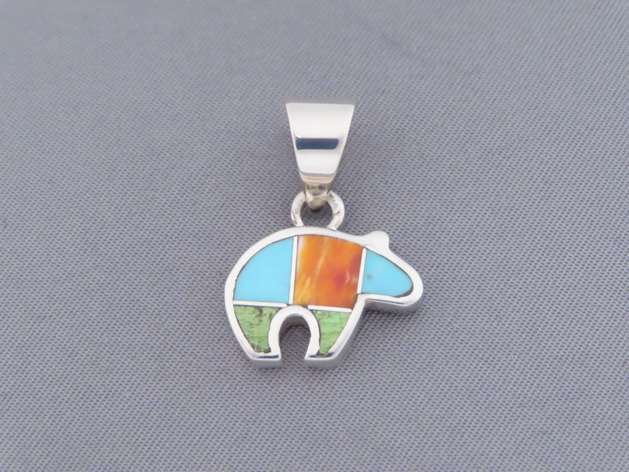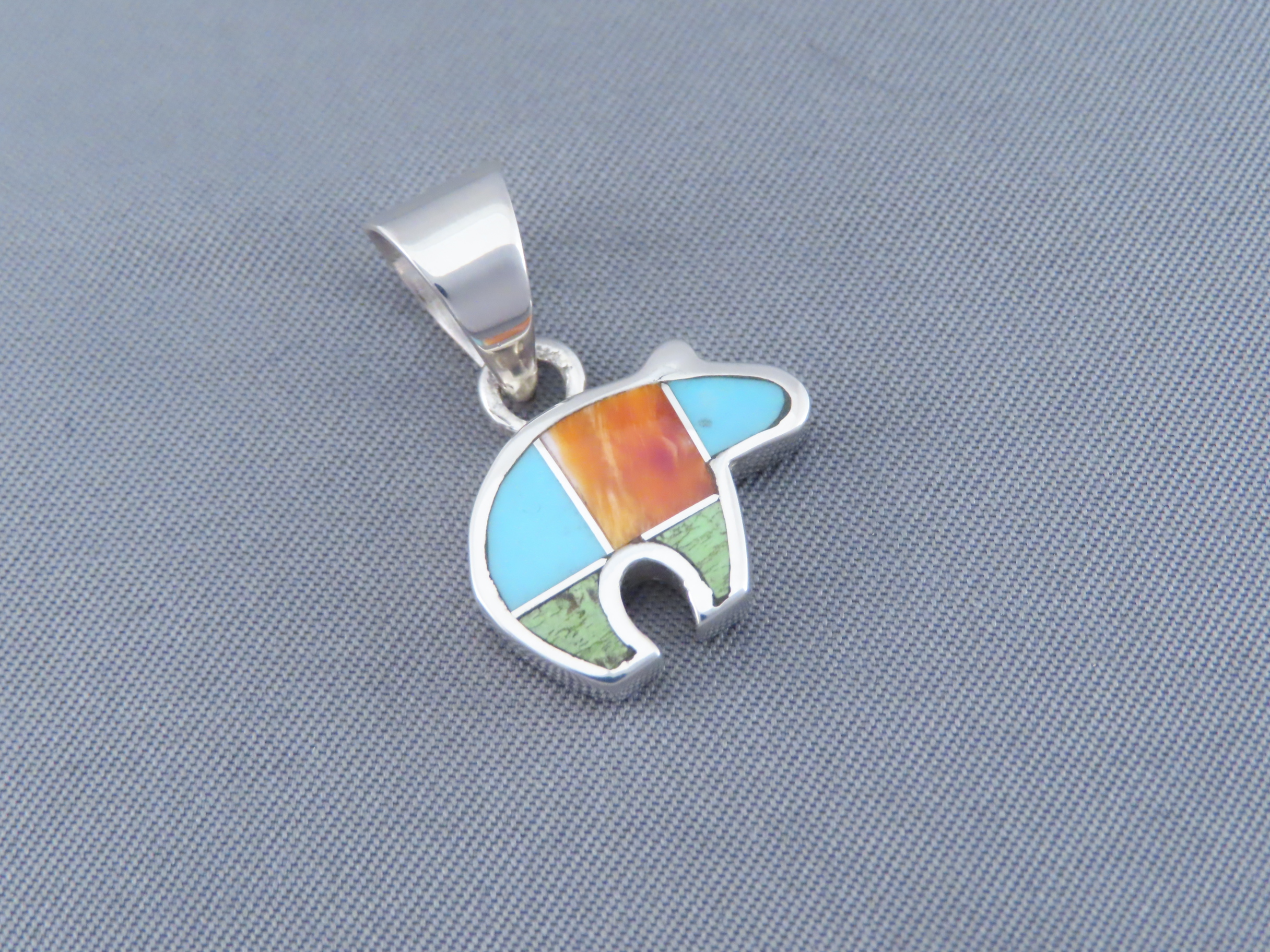 Colorful Inlay Bear Pendant! Small and VERY attractive bear pendant with a bright and vibrant color combination of inlaid stones. Made by Native American (Navajo) jewelry artist, Peterson Chee, featuring inlaid Spiny Oyster shell, Turquoise, and Gaspeite.