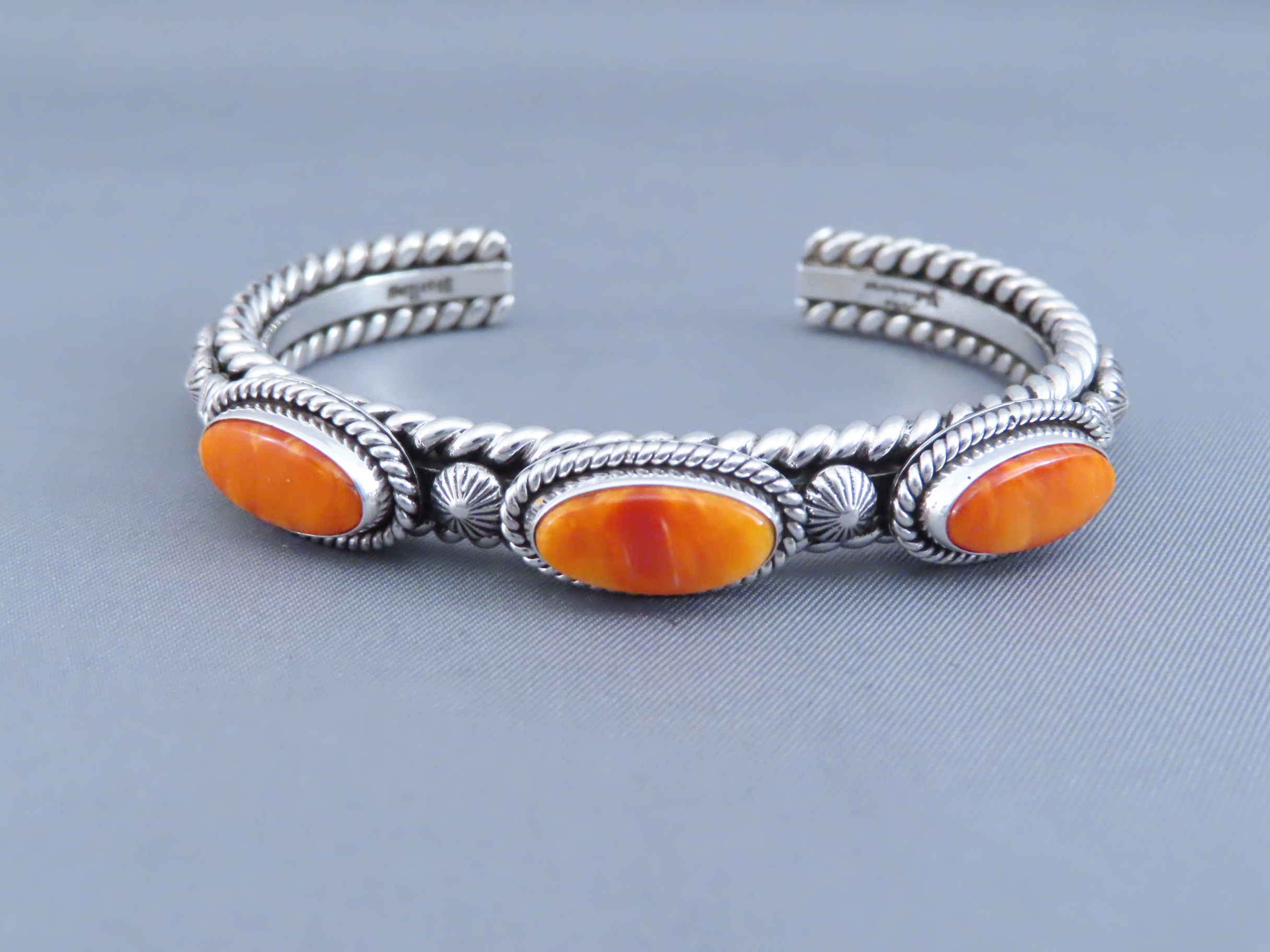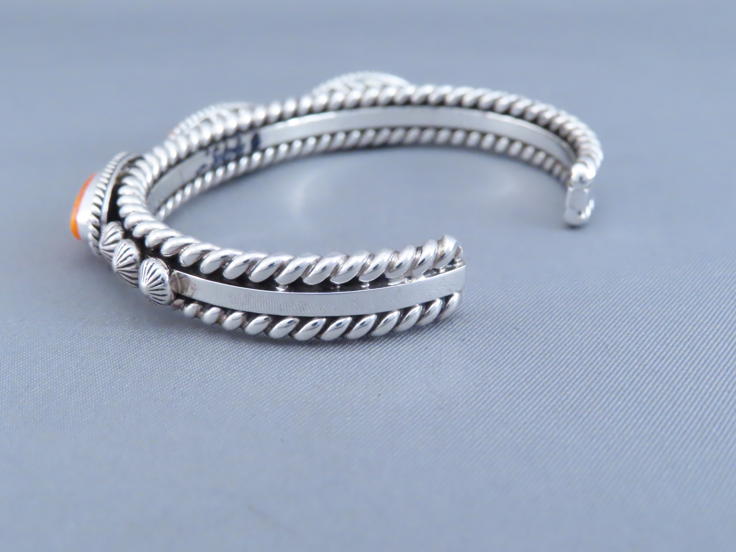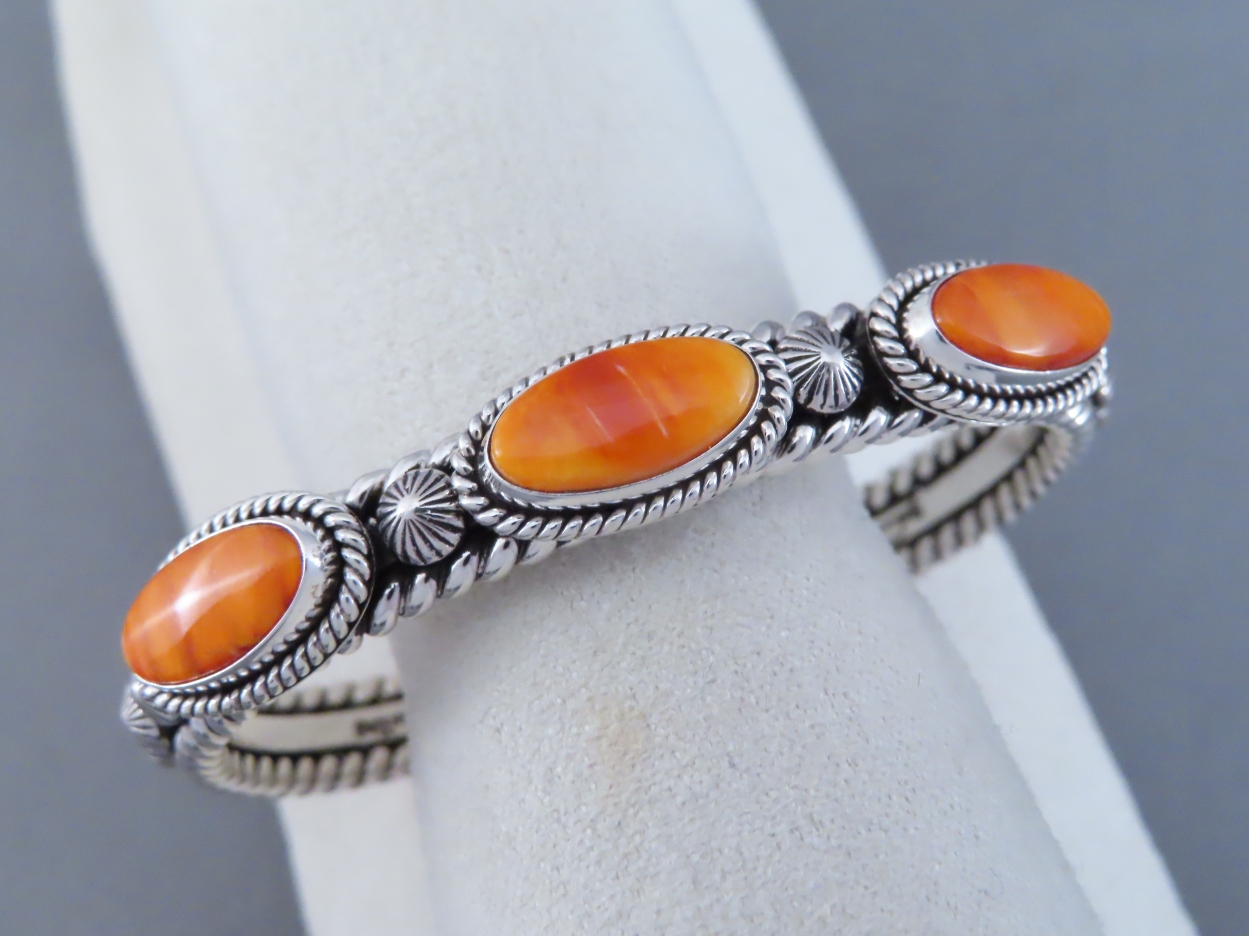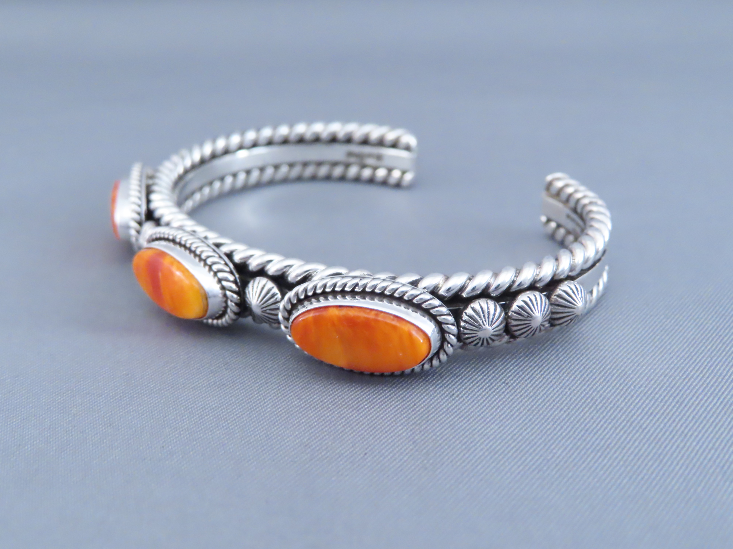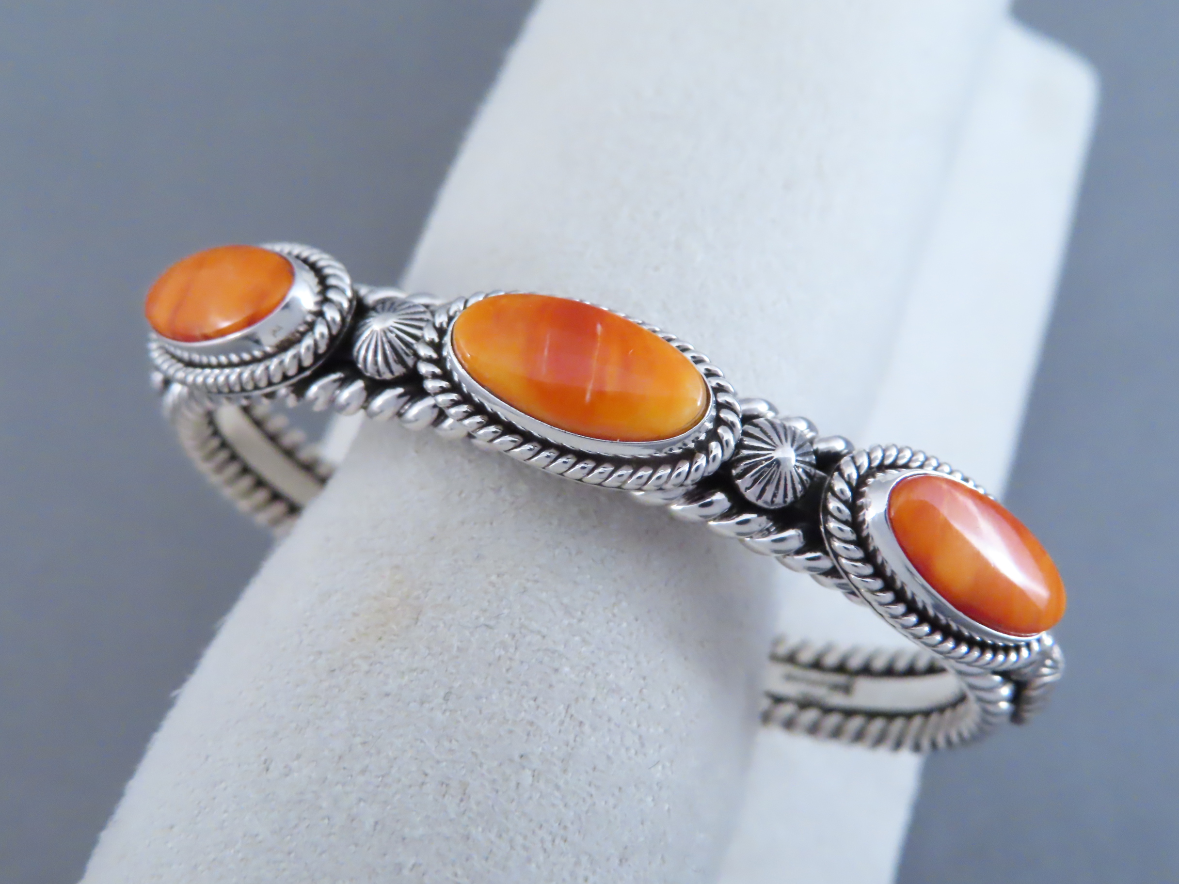 Spiny Oyster Shell Cuff Bracelet by Artie Yellowhorse! This very attractive and dainty sterling silver cuff bracelet has 3 totally lovely orange Spiny Oyster Shell medallions. Made by Native American jewelry artist, Artie Yellowhorse (Navajo).