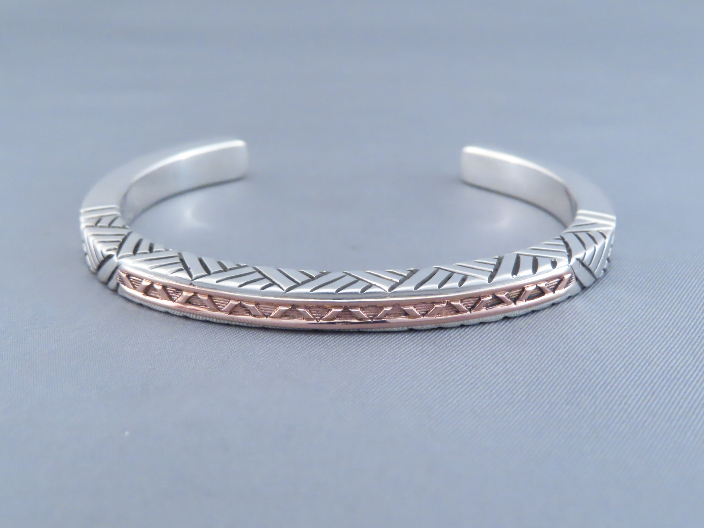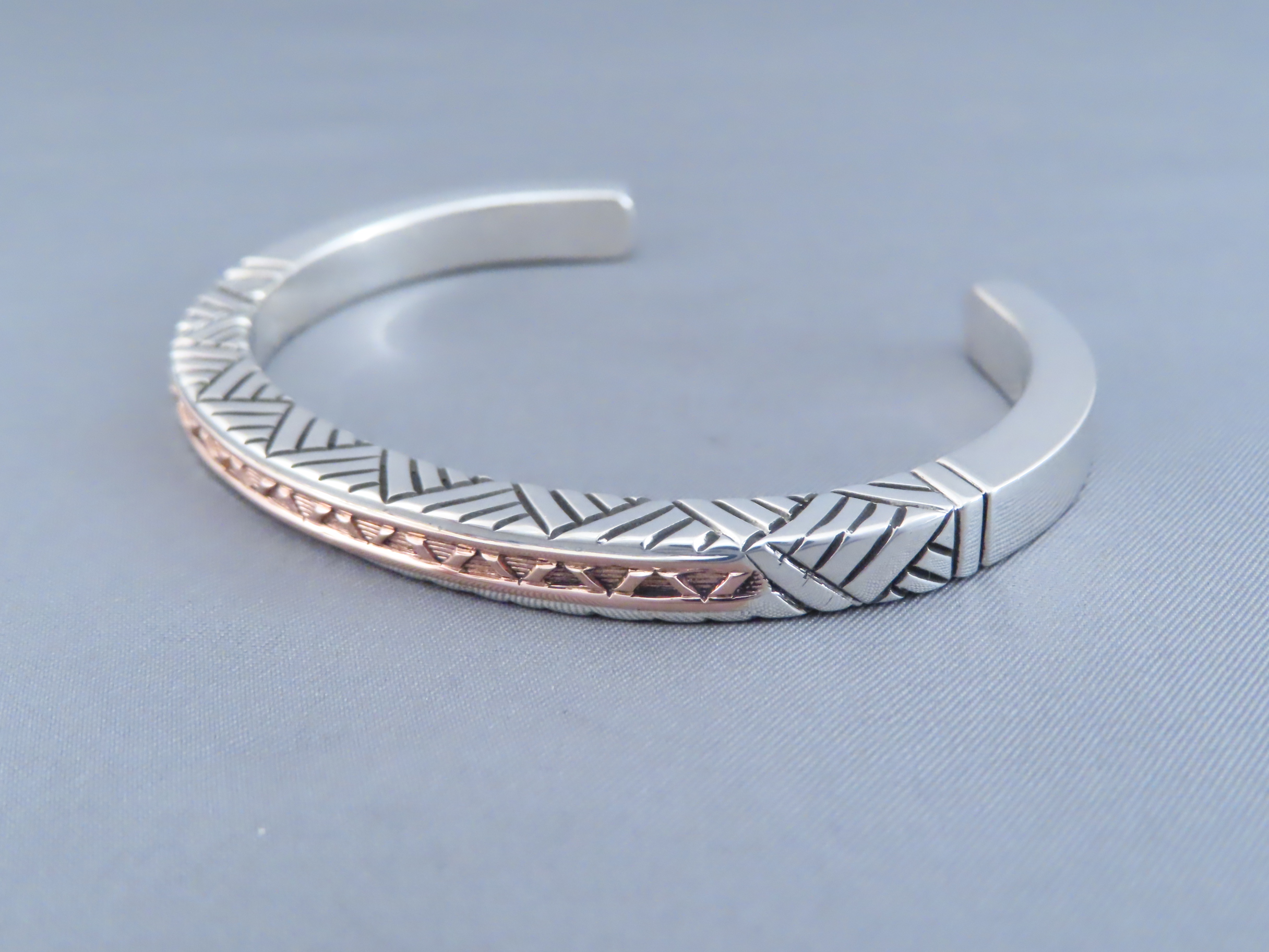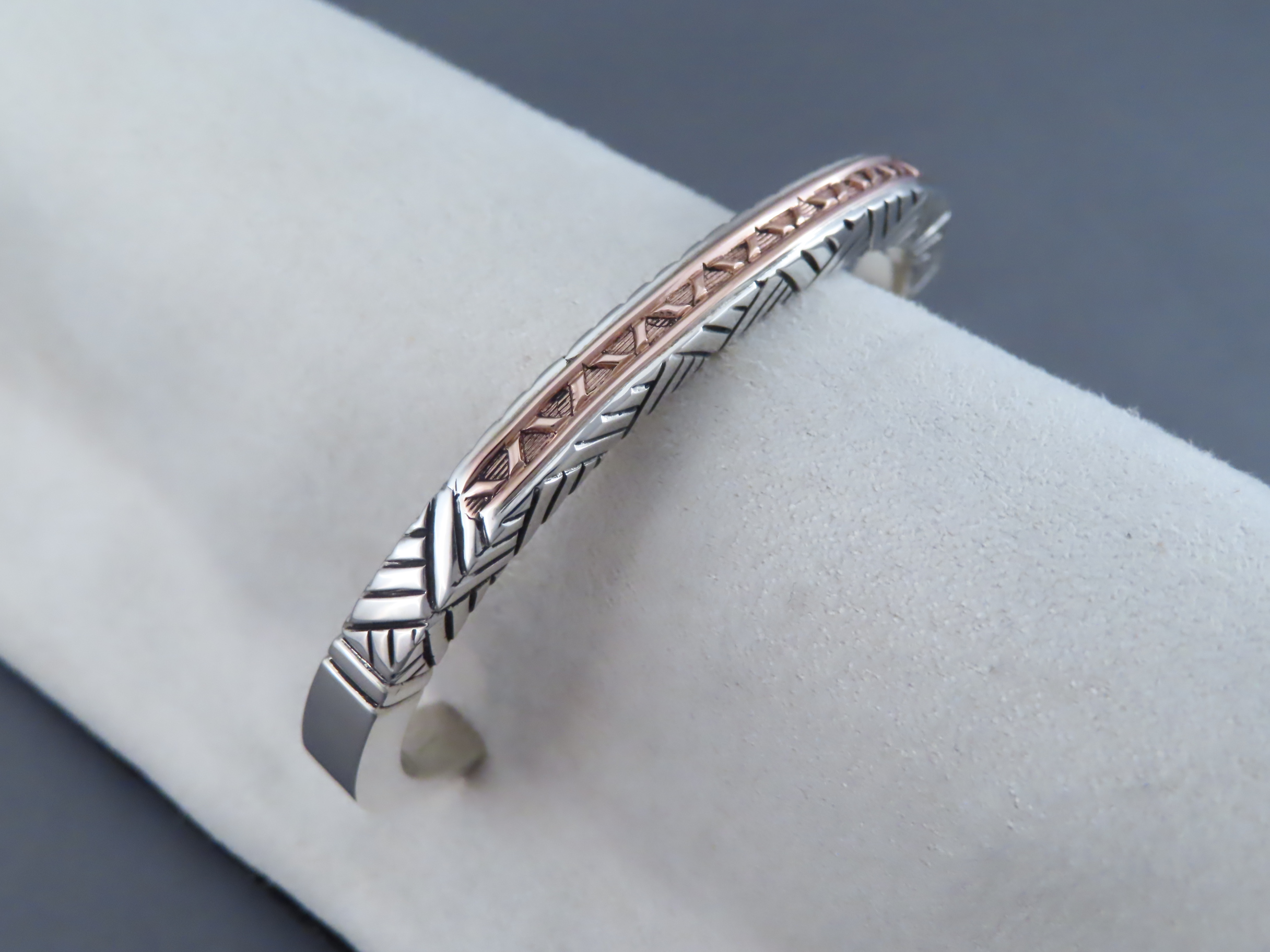 Sterling silver and 14k Gold cuff bracelet by Navajo jewelry artist, Jennifer Curtis.  Beautiful design!  Jennifer is one of the BEST out there – love her work!