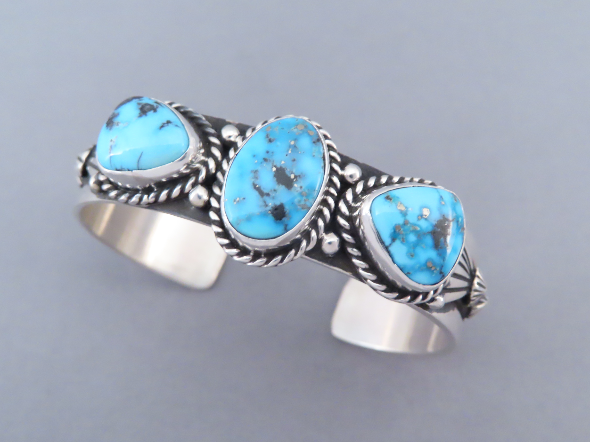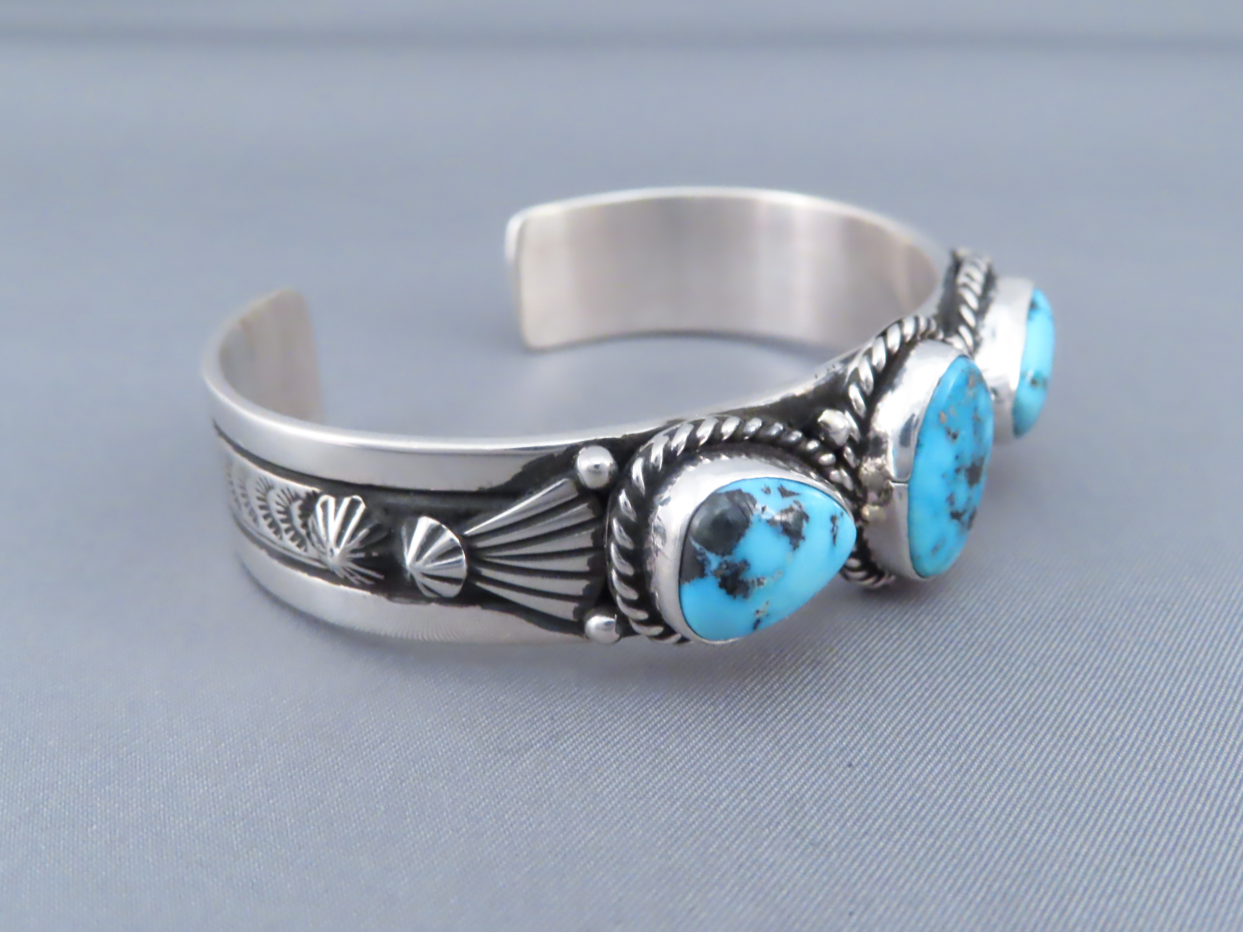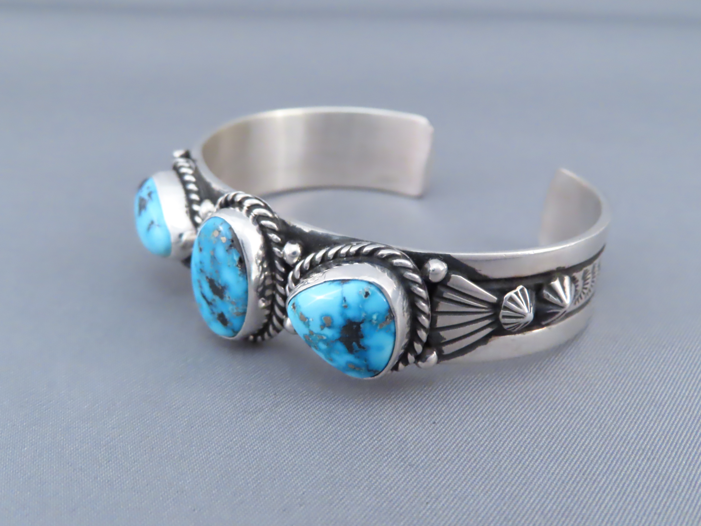 John Nelson Riviera Turquoise Cuff Bracelet! Beautifully-made sterling silver cuff bracelet with 3 attractive Riviera Turquoise stones by Native American jewelry artist, John Nelson (Navajo). Vibrant blue Turquoise Jewelry-