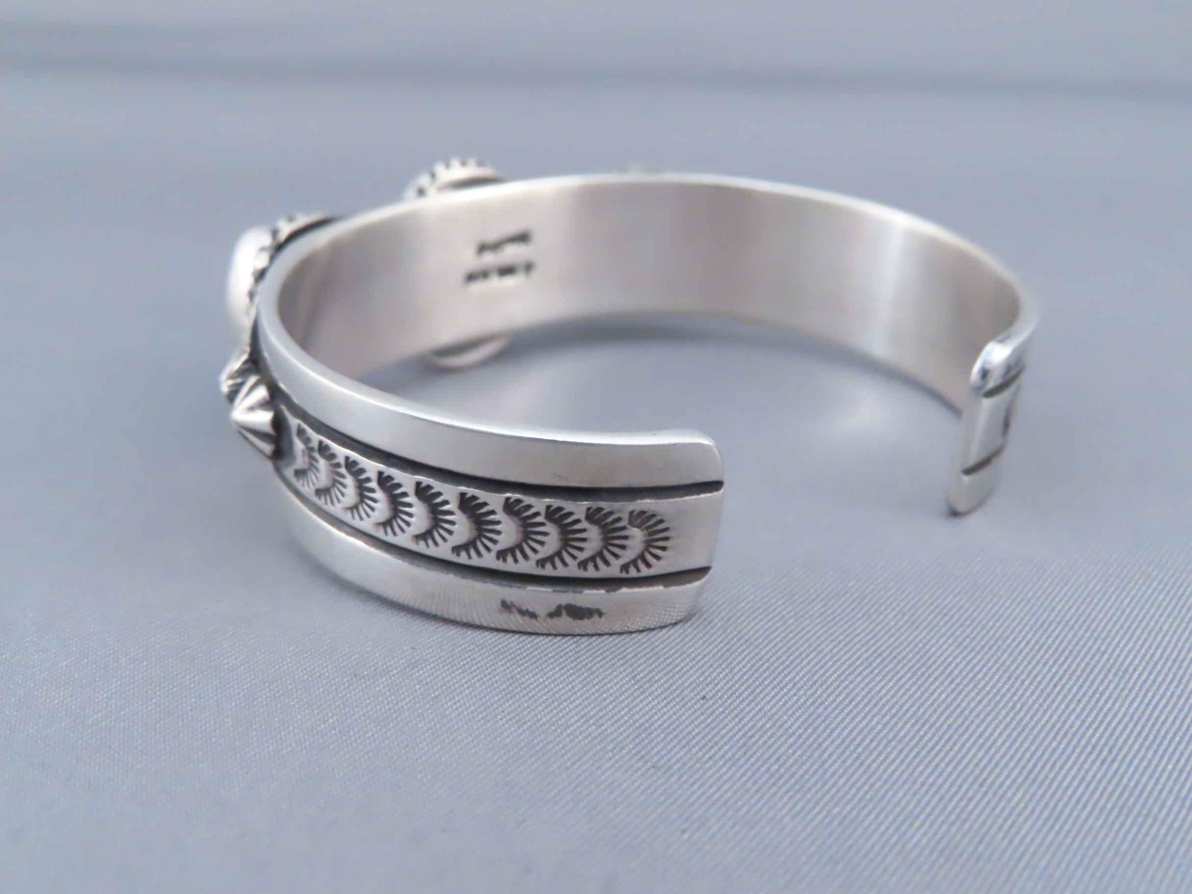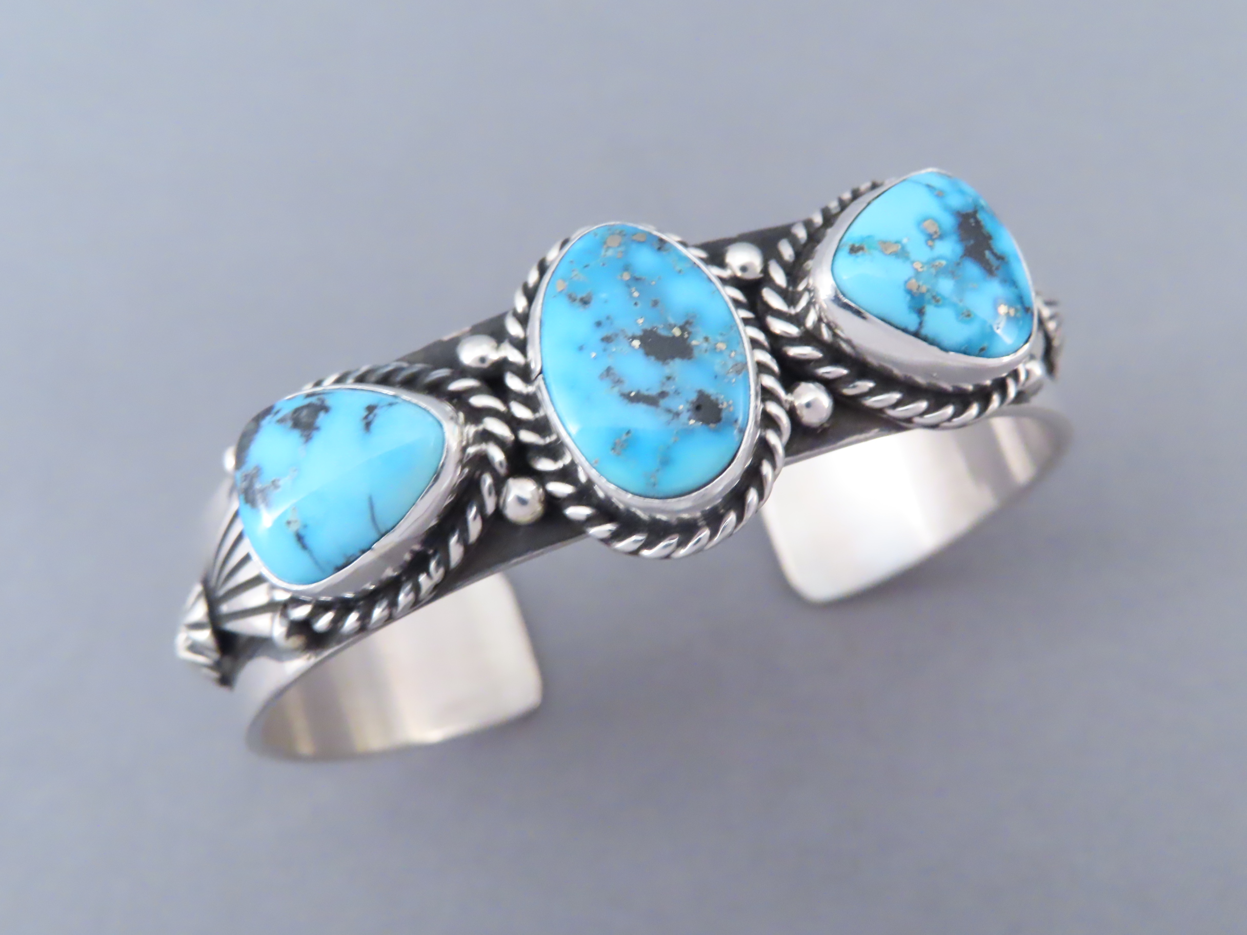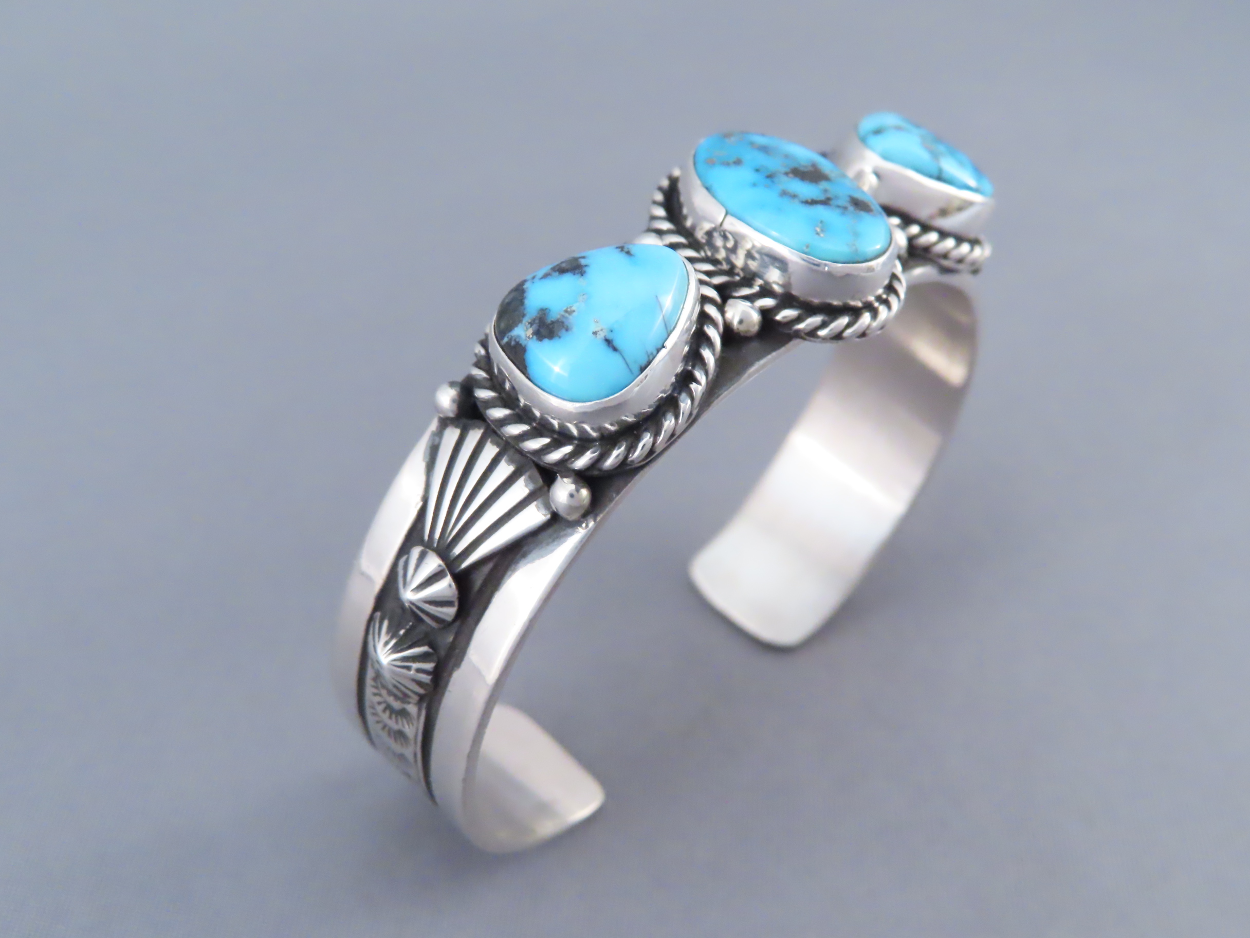 John Nelson Riviera Turquoise Cuff Bracelet! Beautifully-made sterling silver cuff bracelet with 3 attractive Riviera Turquoise stones by Native American jewelry artist, John Nelson (Navajo). Vibrant blue Turquoise Jewelry-