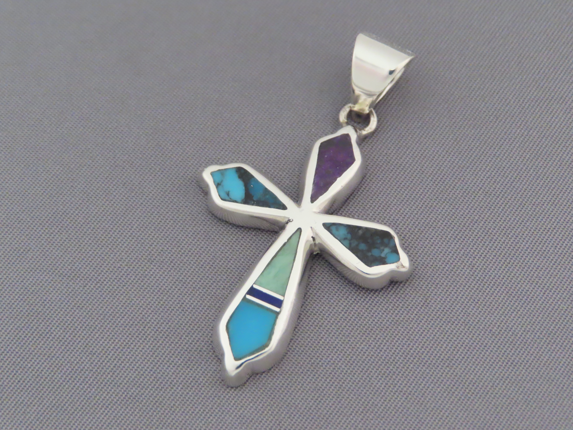 Inlay Multi-Stone Cross Pendant! VERY attractive sterling silver inlay cross pendant with inlaid Turquoise, Lapis, Vaircite, and Sugilite stones. Lovely Native American Jewelry cross pendant! Made by Navajo jeweler, Peterson Chee.