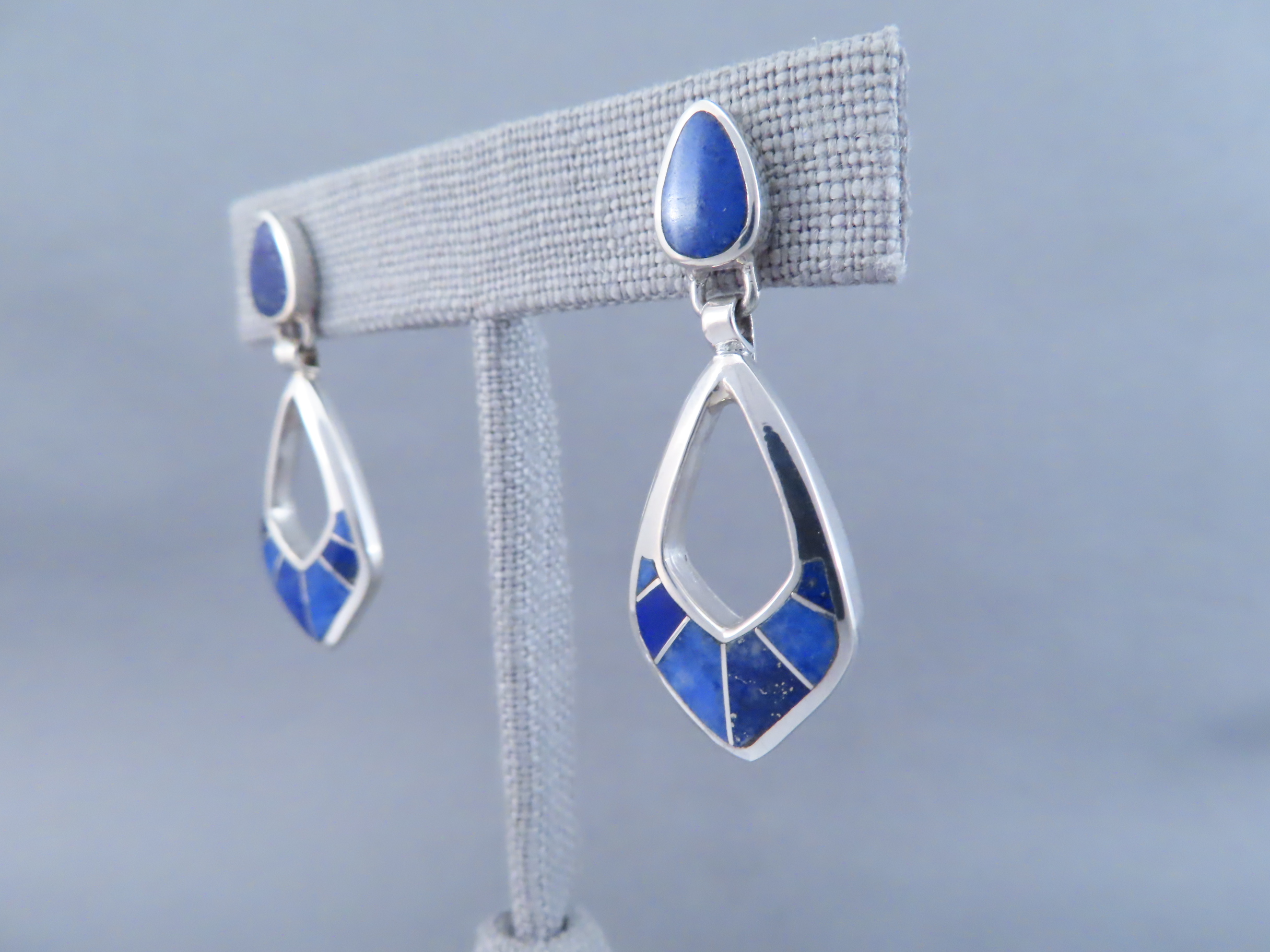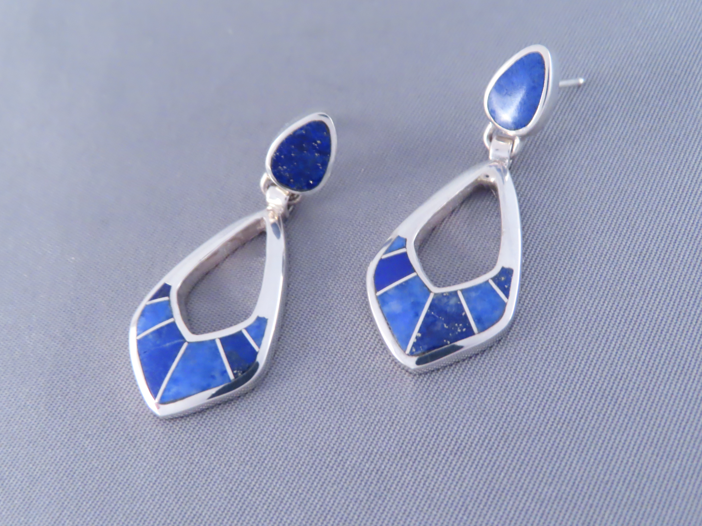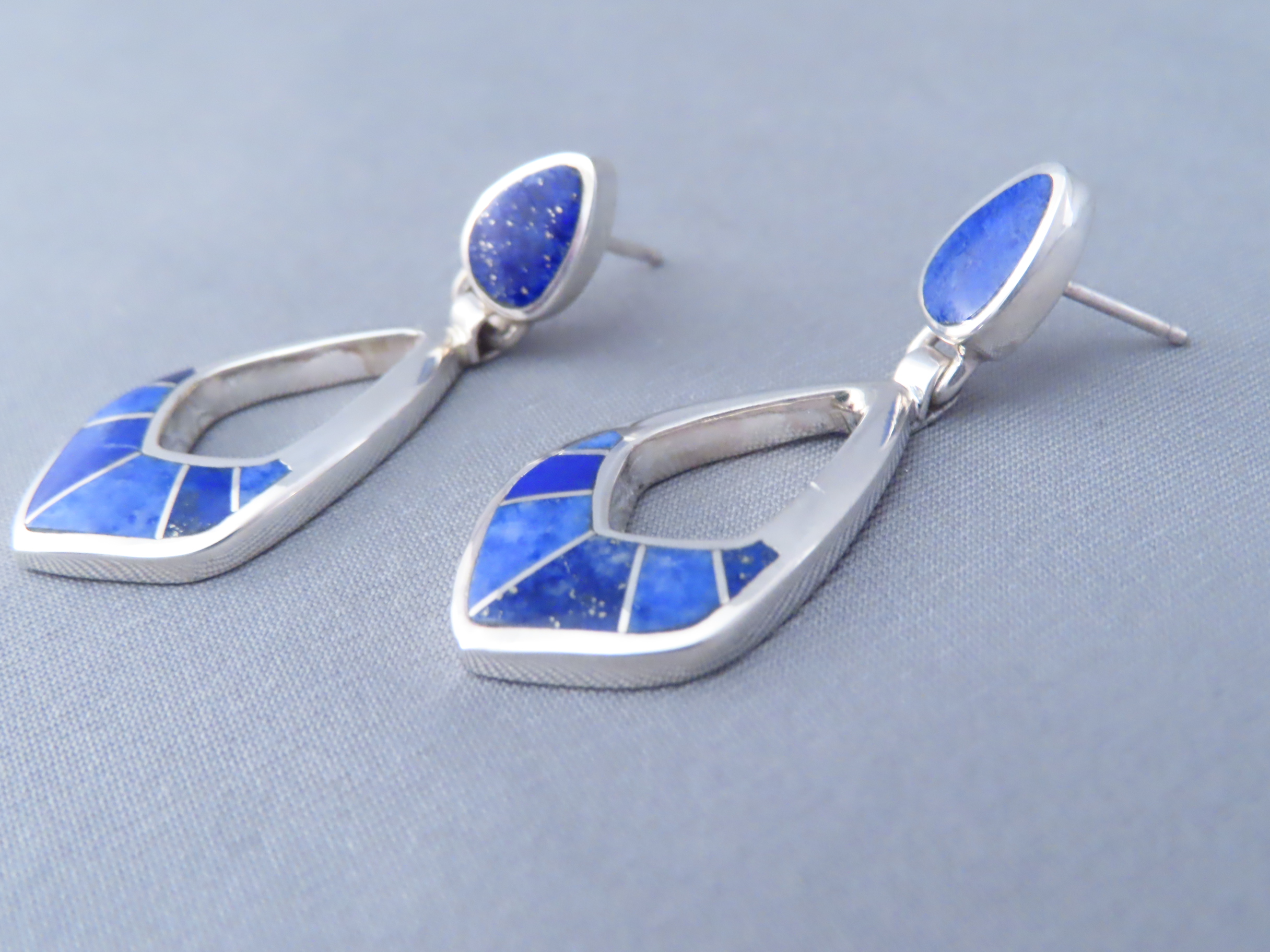 Beautiful Lapis Inlay Earrings! These sterling silver dangling post earrings with Lapis inlay were beautifully made! The two different shades of inlaid Lapis stones add wonderful depth. Made by Native American jewelry artist, Peterson Chee (Navajo).