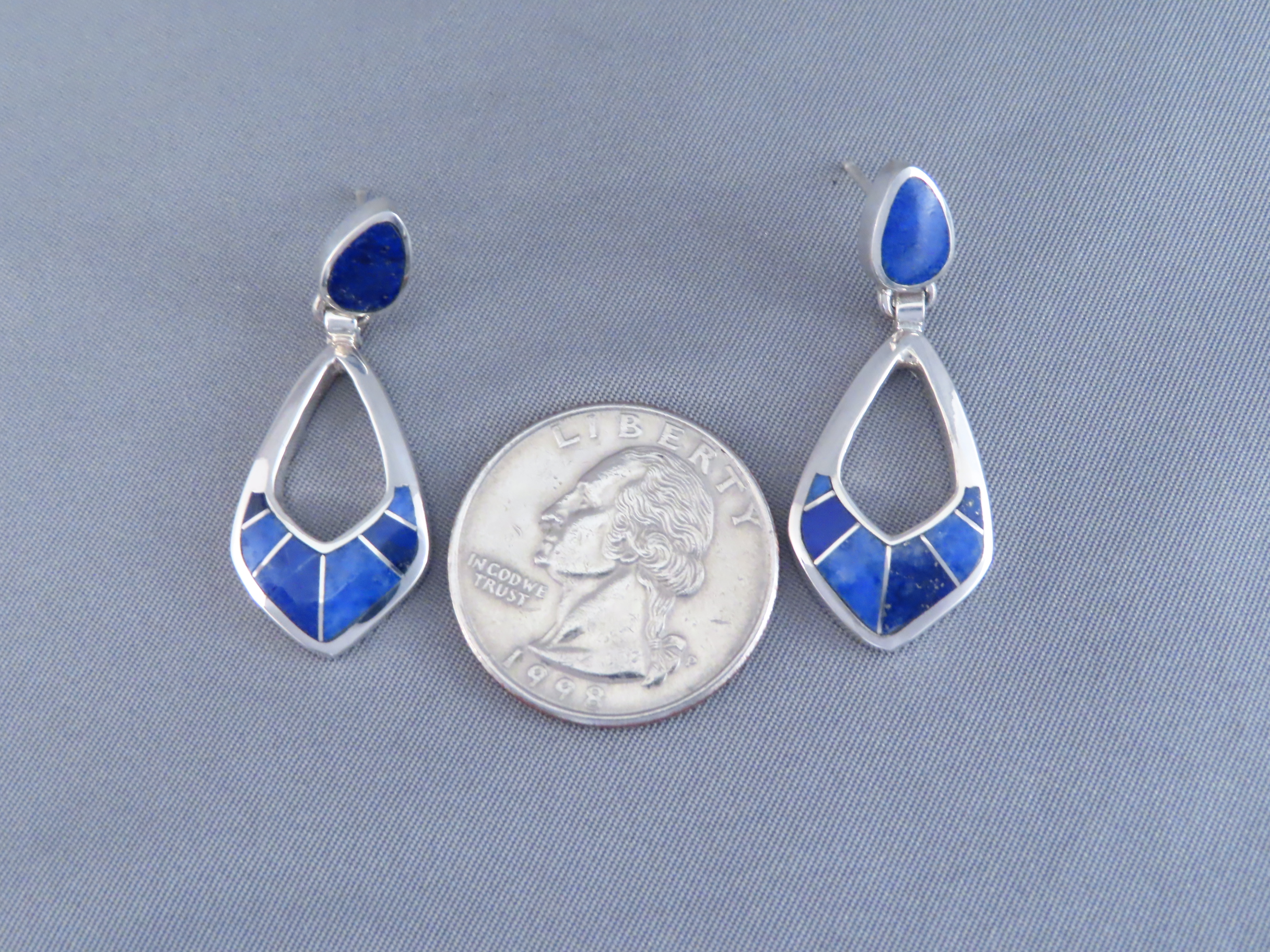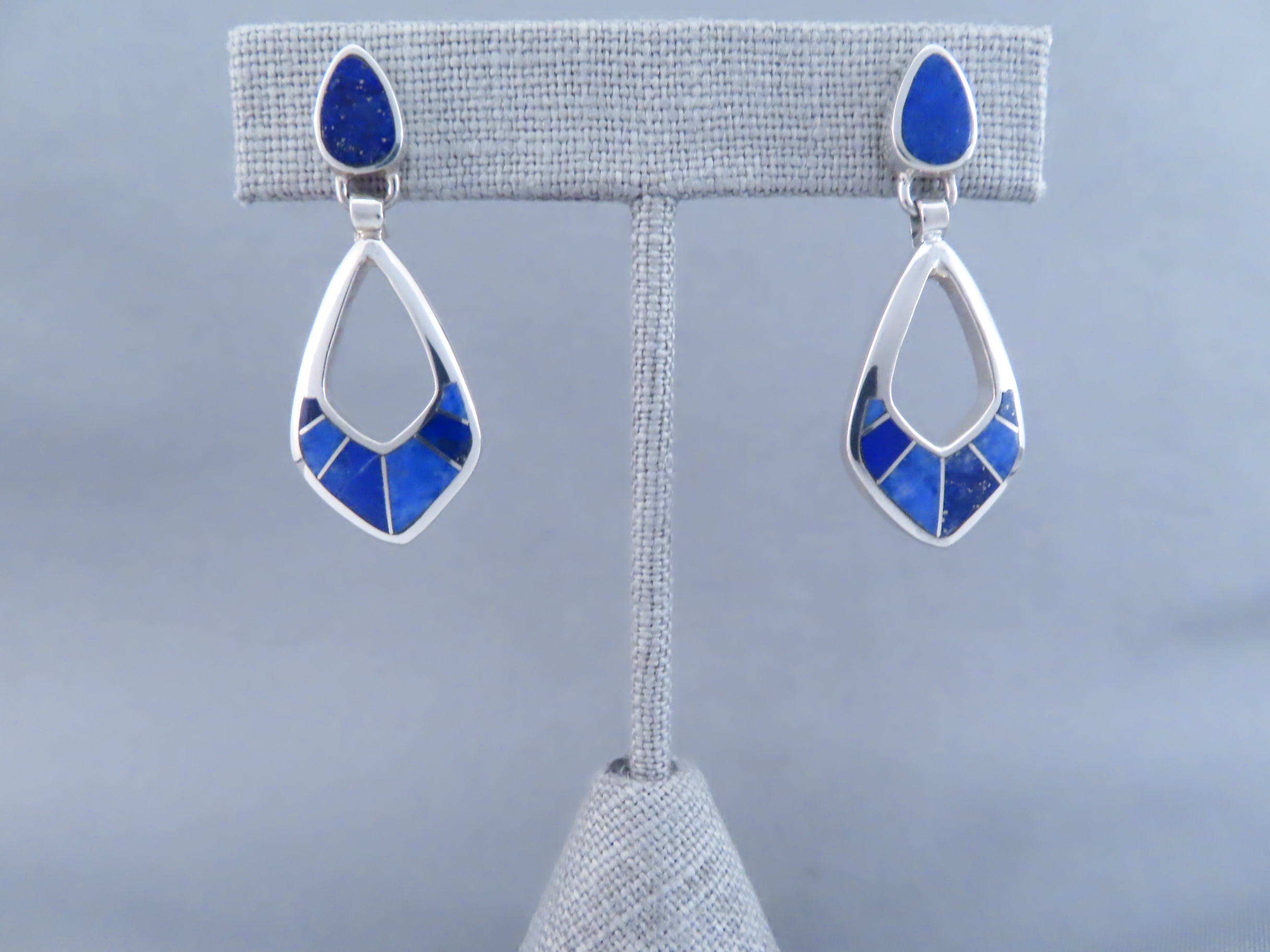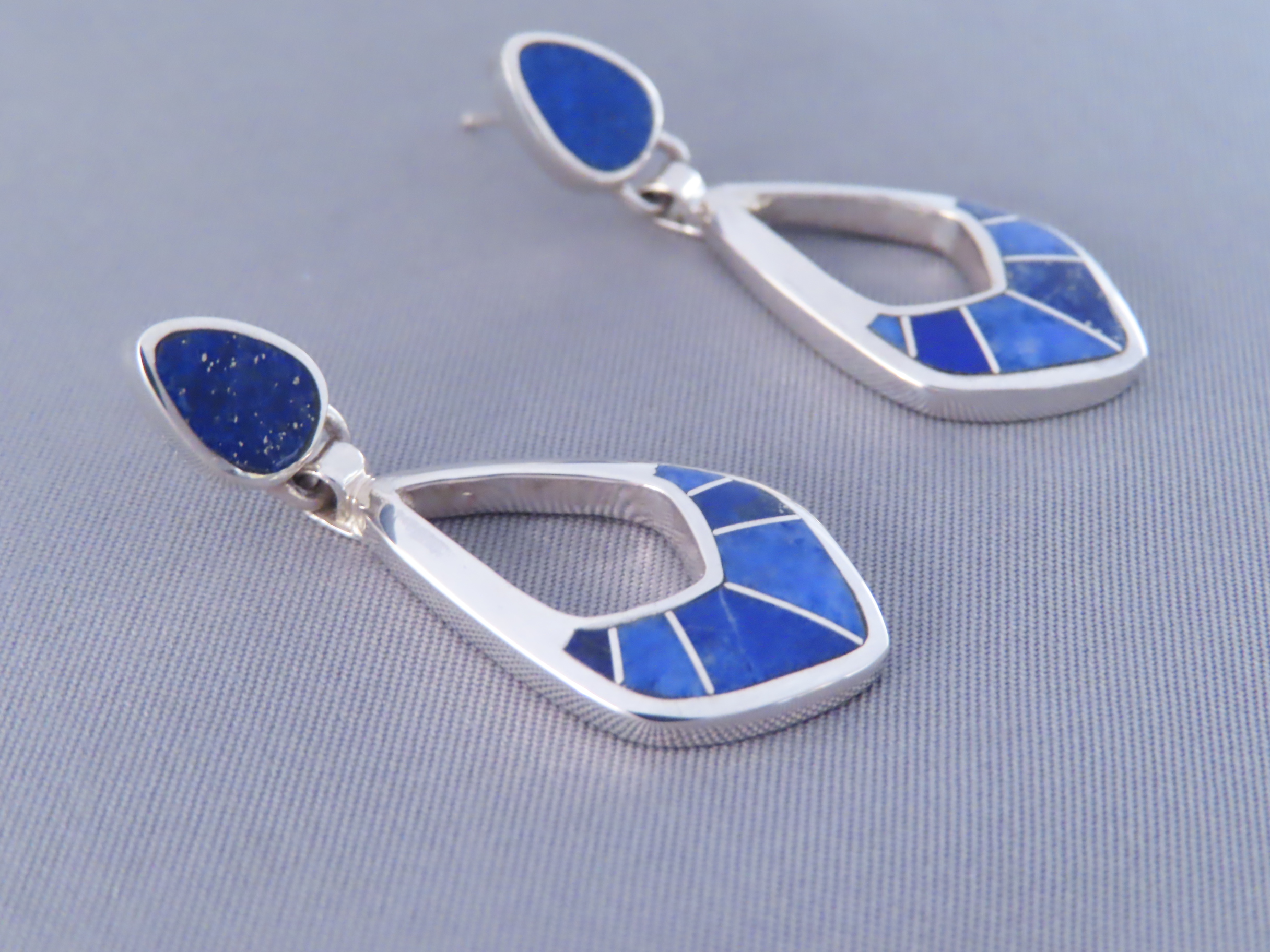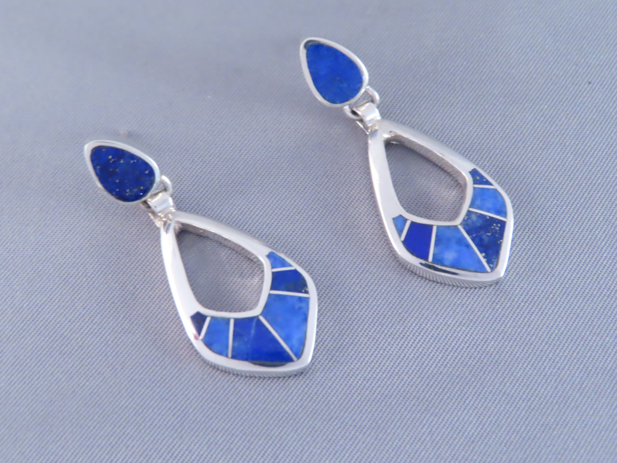 Beautiful Lapis Inlay Earrings! These sterling silver dangling post earrings with Lapis inlay were beautifully made! The two different shades of inlaid Lapis stones add wonderful depth. Made by Native American jewelry artist, Peterson Chee (Navajo).