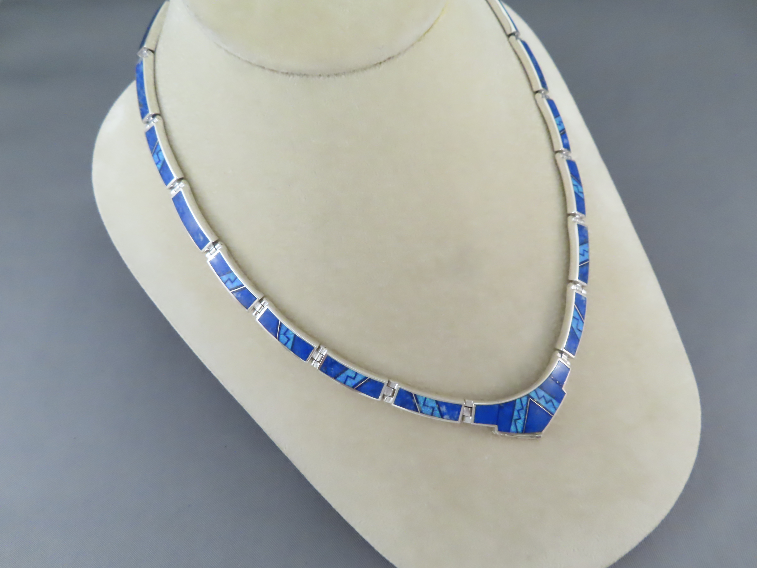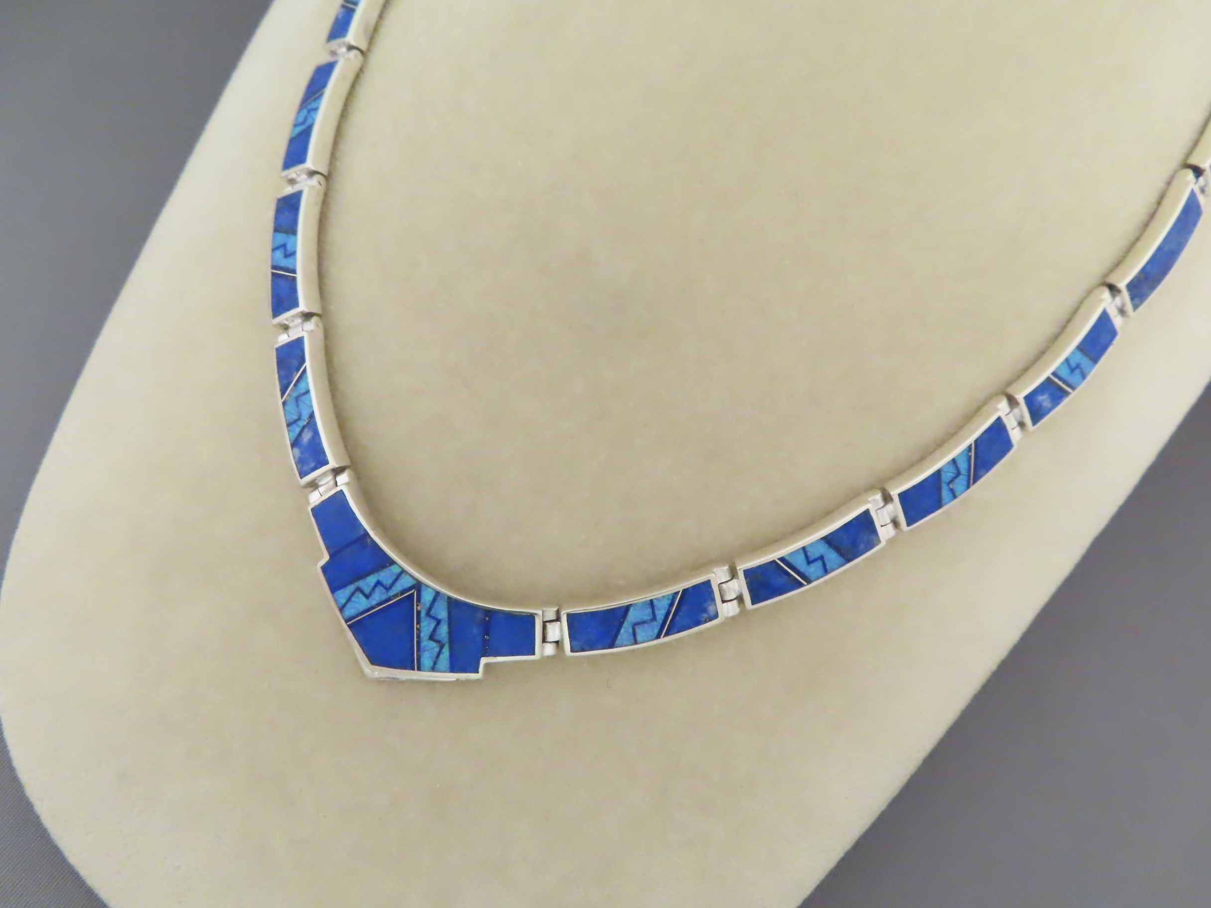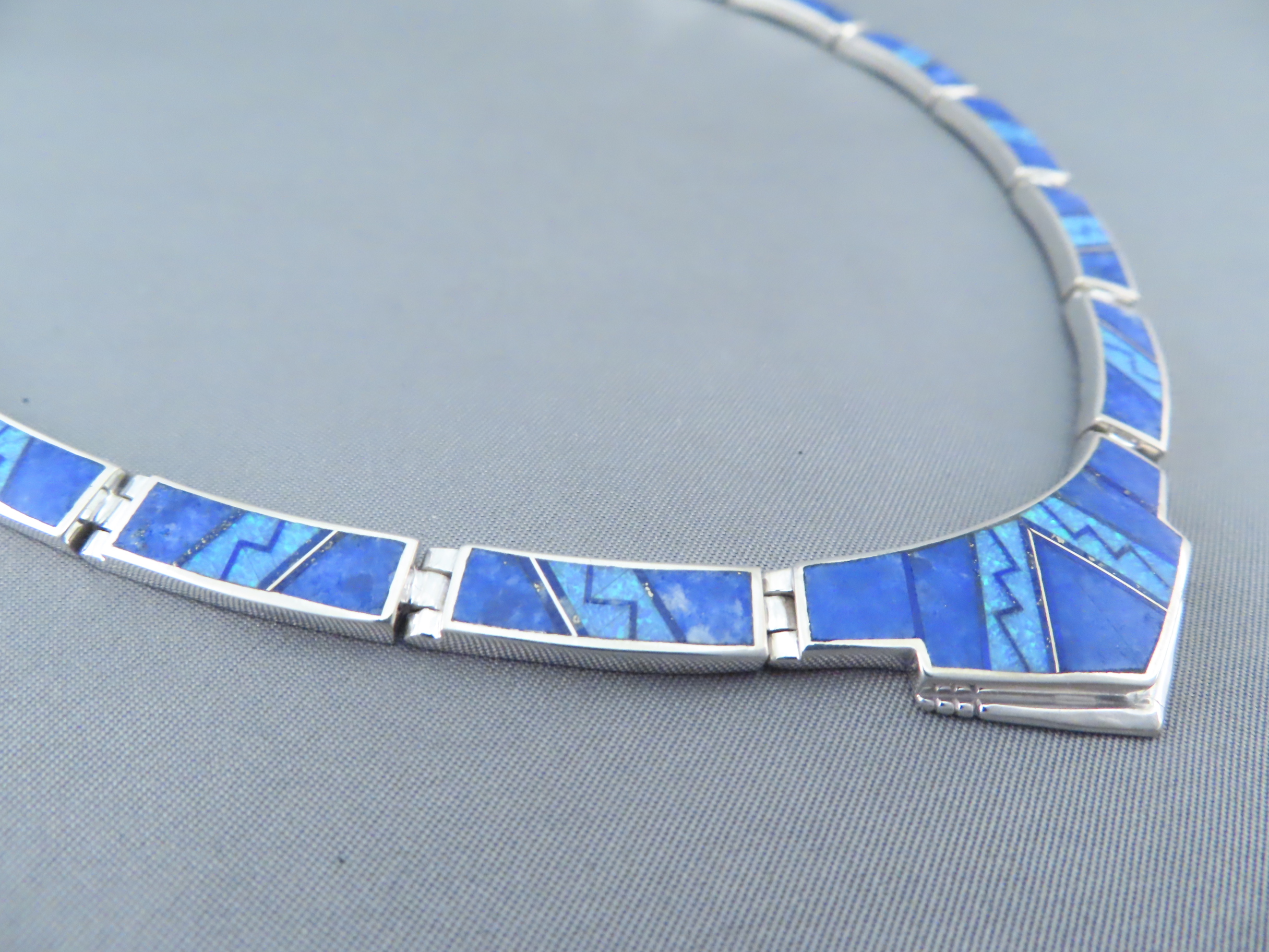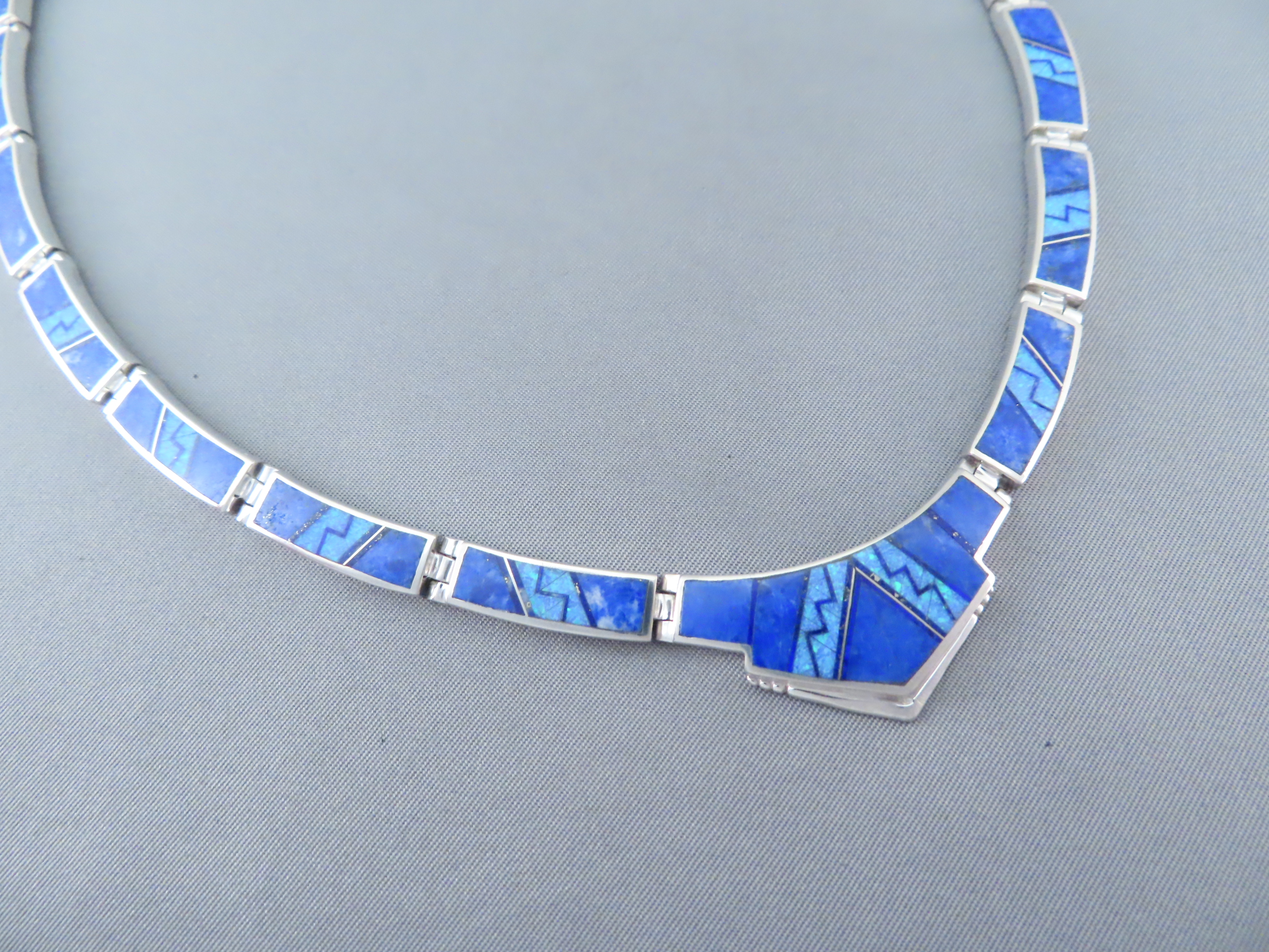 IMPRESSIVE Lapis & Opal Inlay Necklace! Totally gorgeous full necklace with inlaid lapis, cultured opal, and denim lapis stones. Beautiful color combination. VERY finely inlaid. Made by Native American jewelry artist, Tim Charlie (Navajo). Stunning Native American Jewelry!