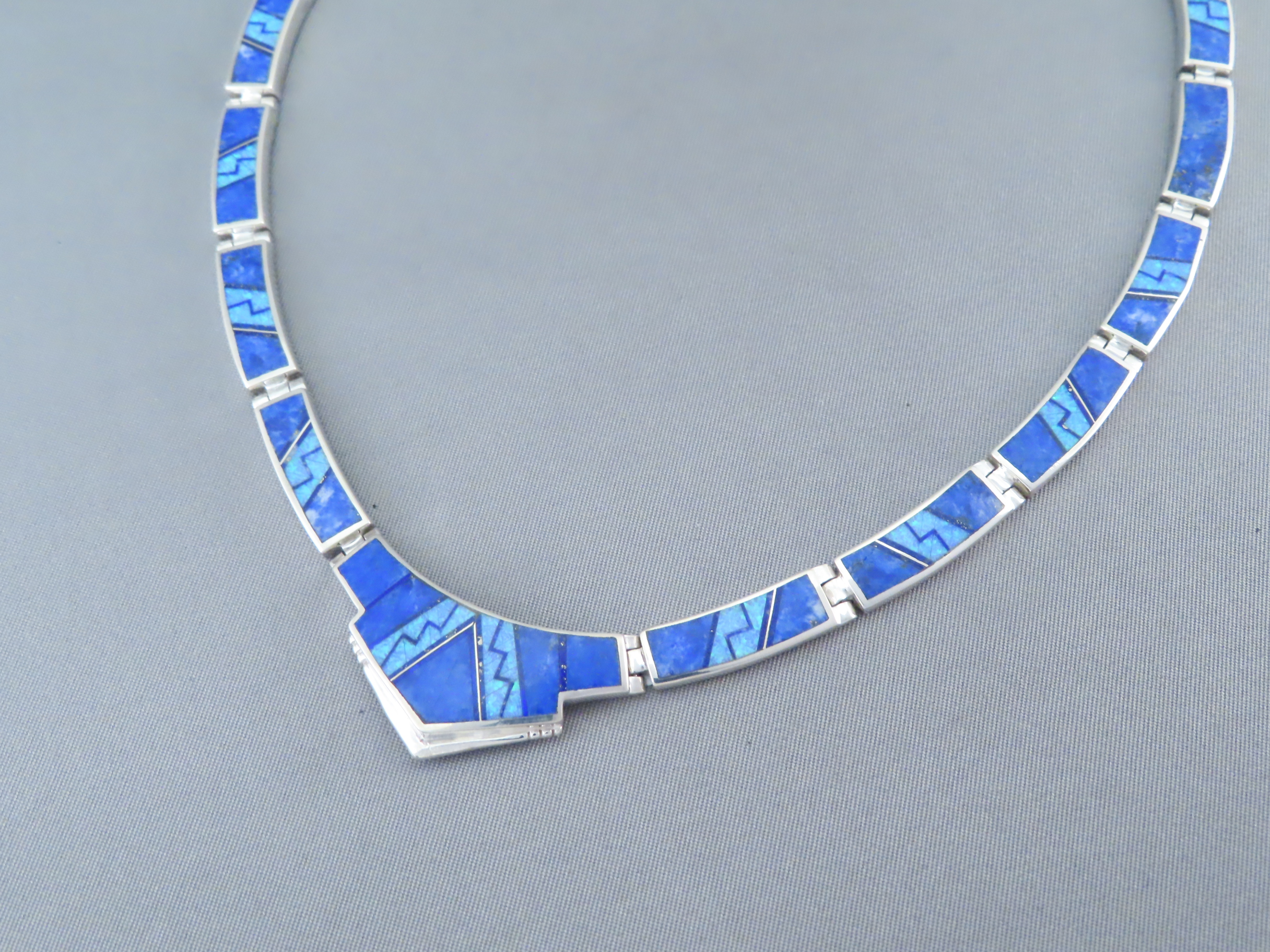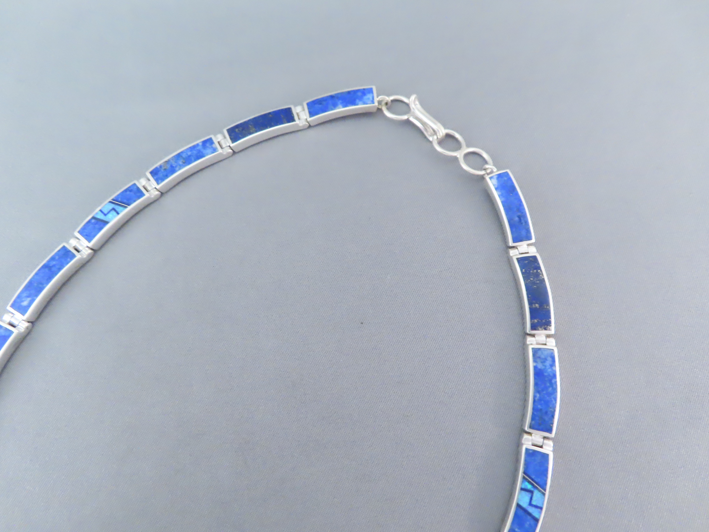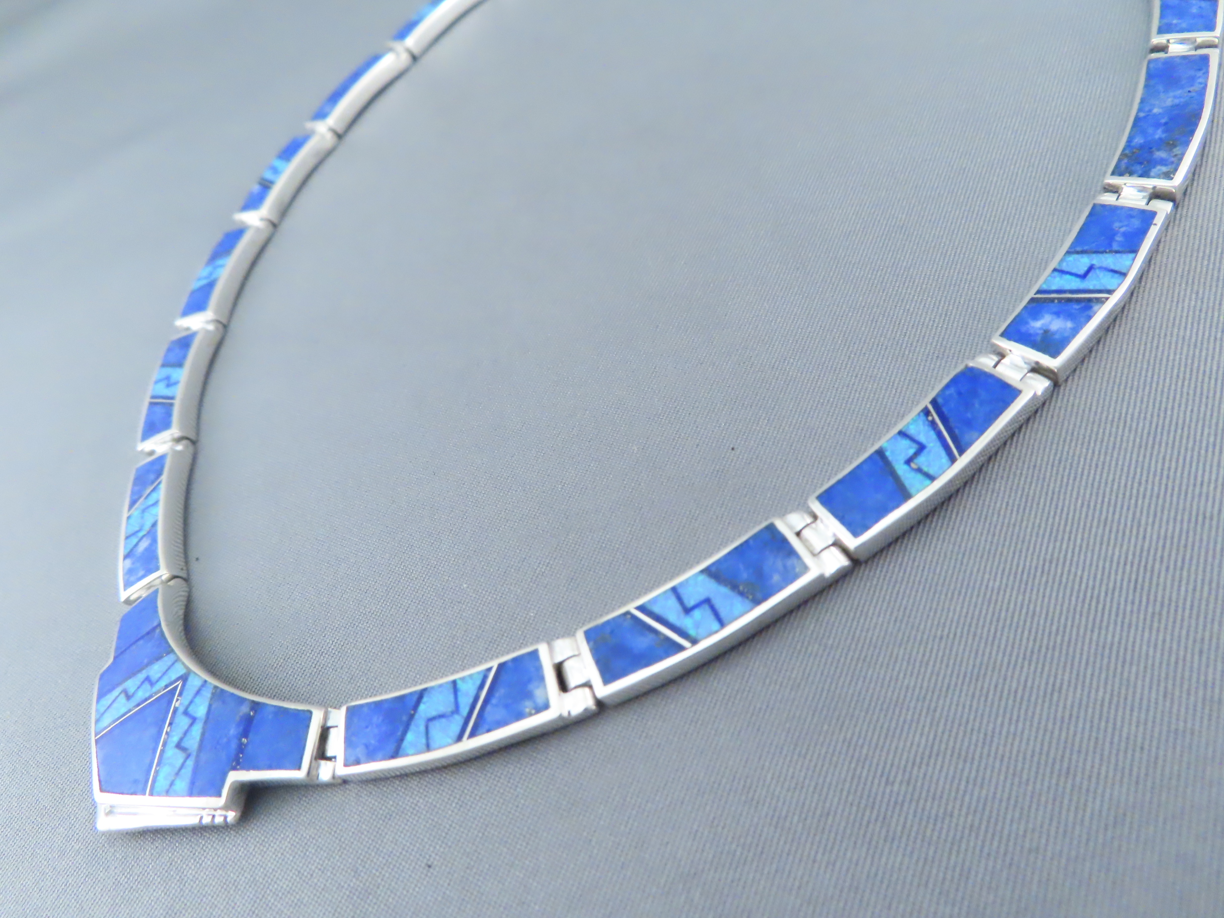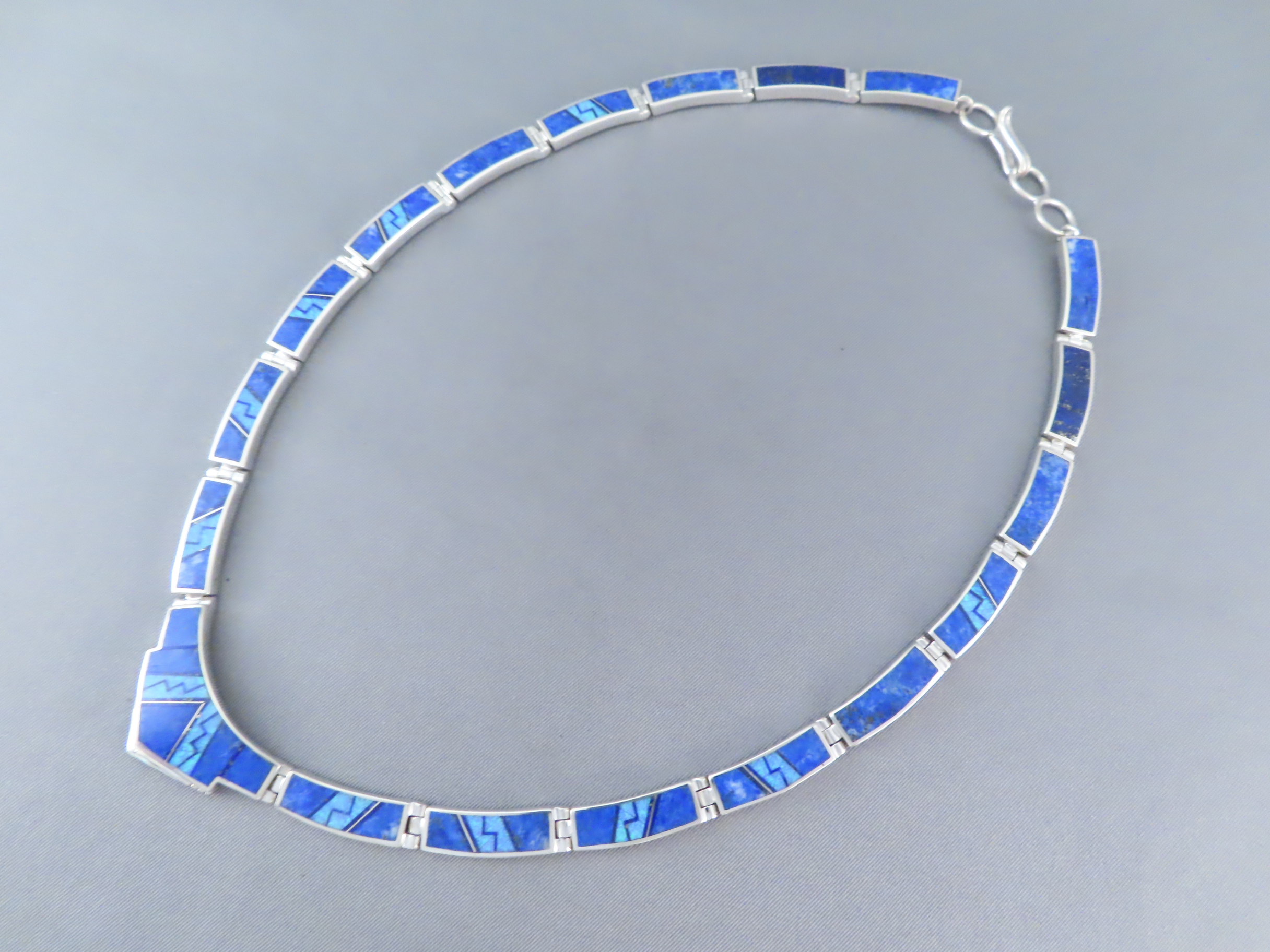 IMPRESSIVE Lapis & Opal Inlay Necklace! Totally gorgeous full necklace with inlaid lapis, cultured opal, and denim lapis stones. Beautiful color combination. VERY finely inlaid. Made by Native American jewelry artist, Tim Charlie (Navajo). Stunning Native American Jewelry!