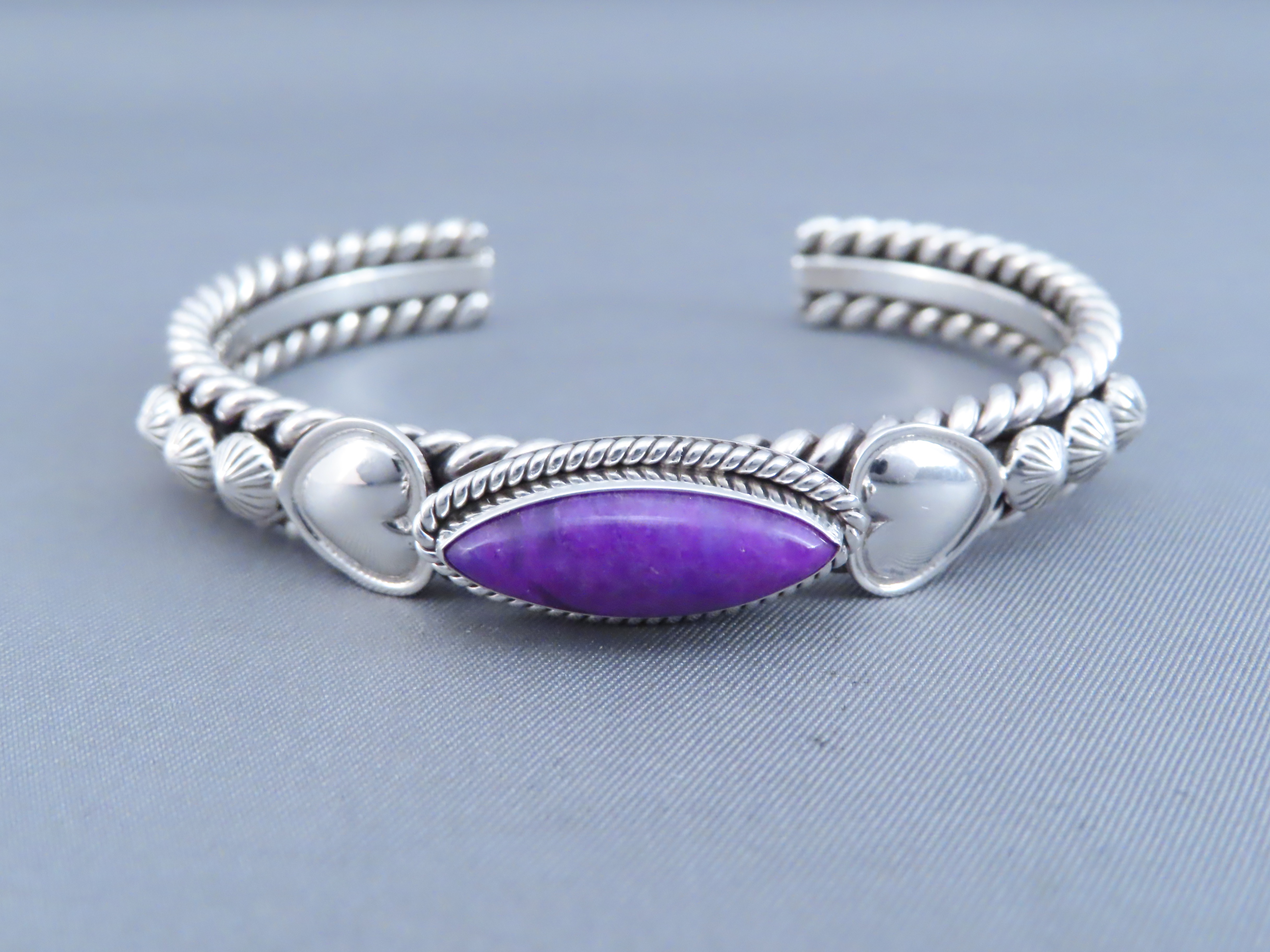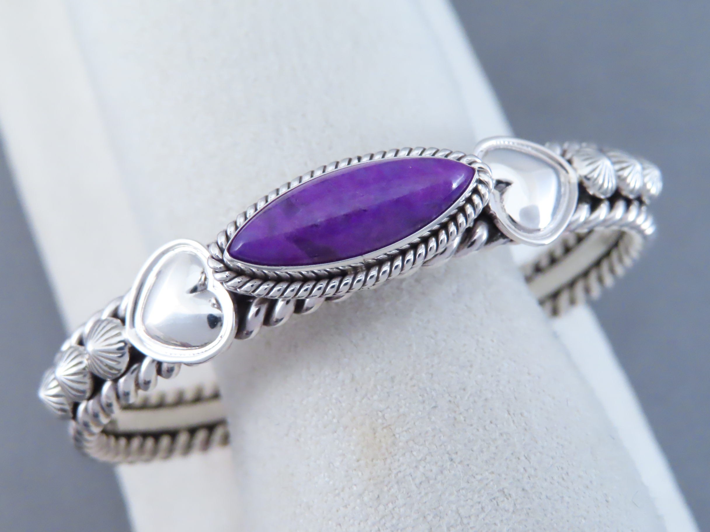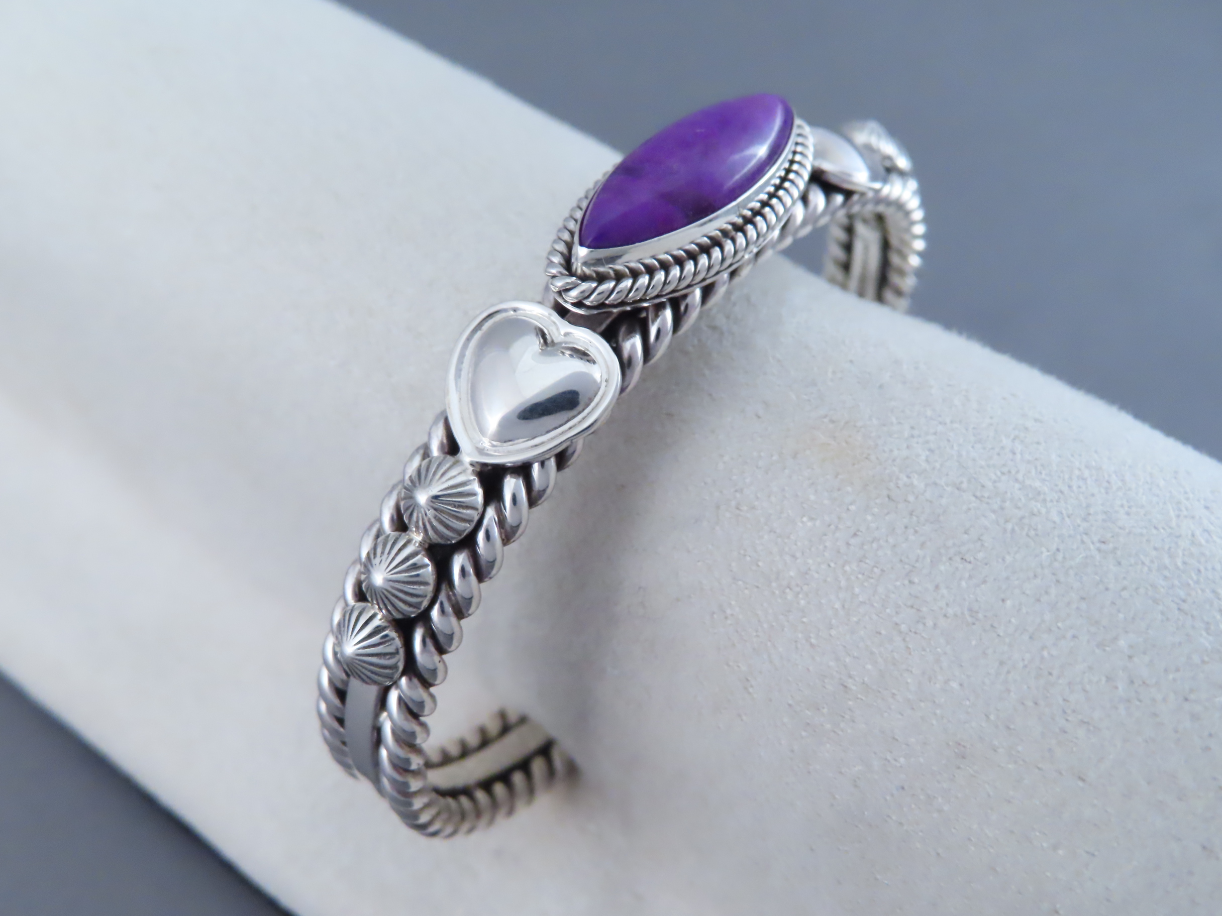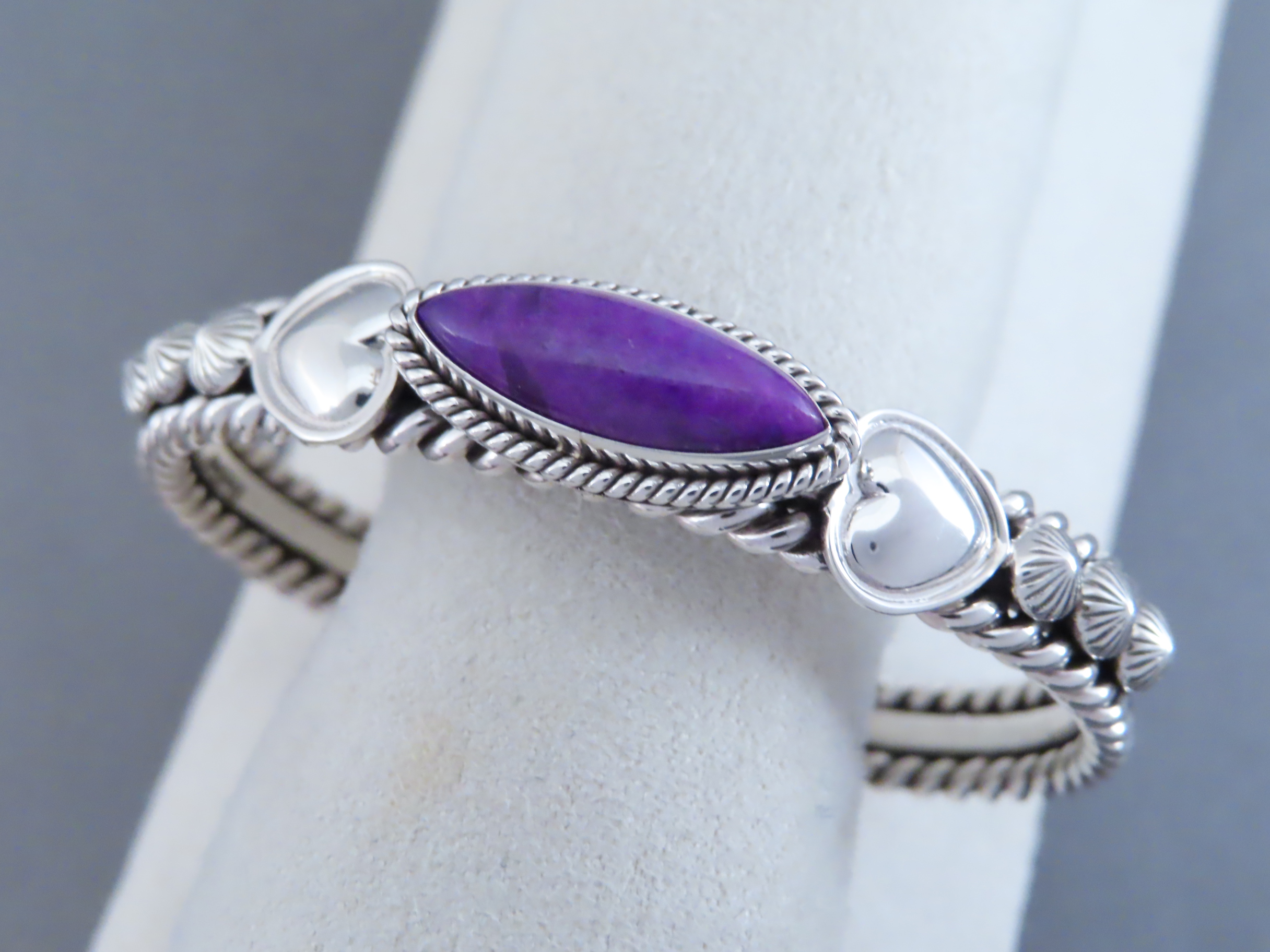 Sugilite Bracelet! This lovely sterling silver cuff bracelet features a wonderfully vibrant little piece of purple Sugilite as a centerpiece. Great Sugilite cuff bracelet created by Navajo jewelry artist, Artie Yellowhorse.