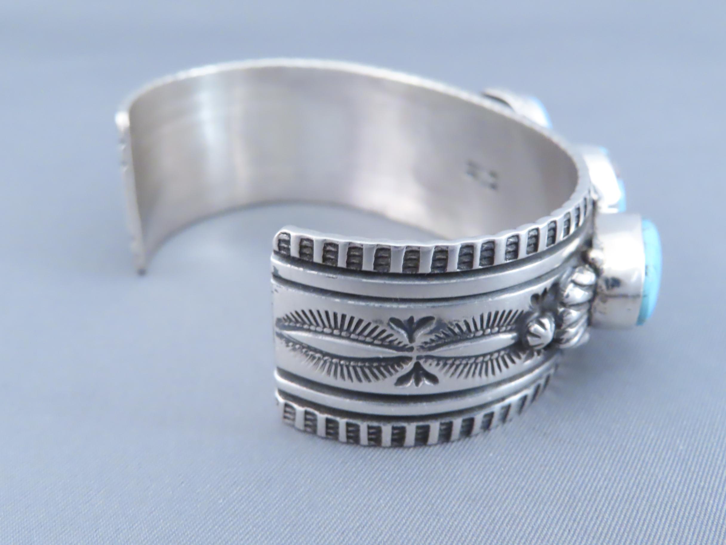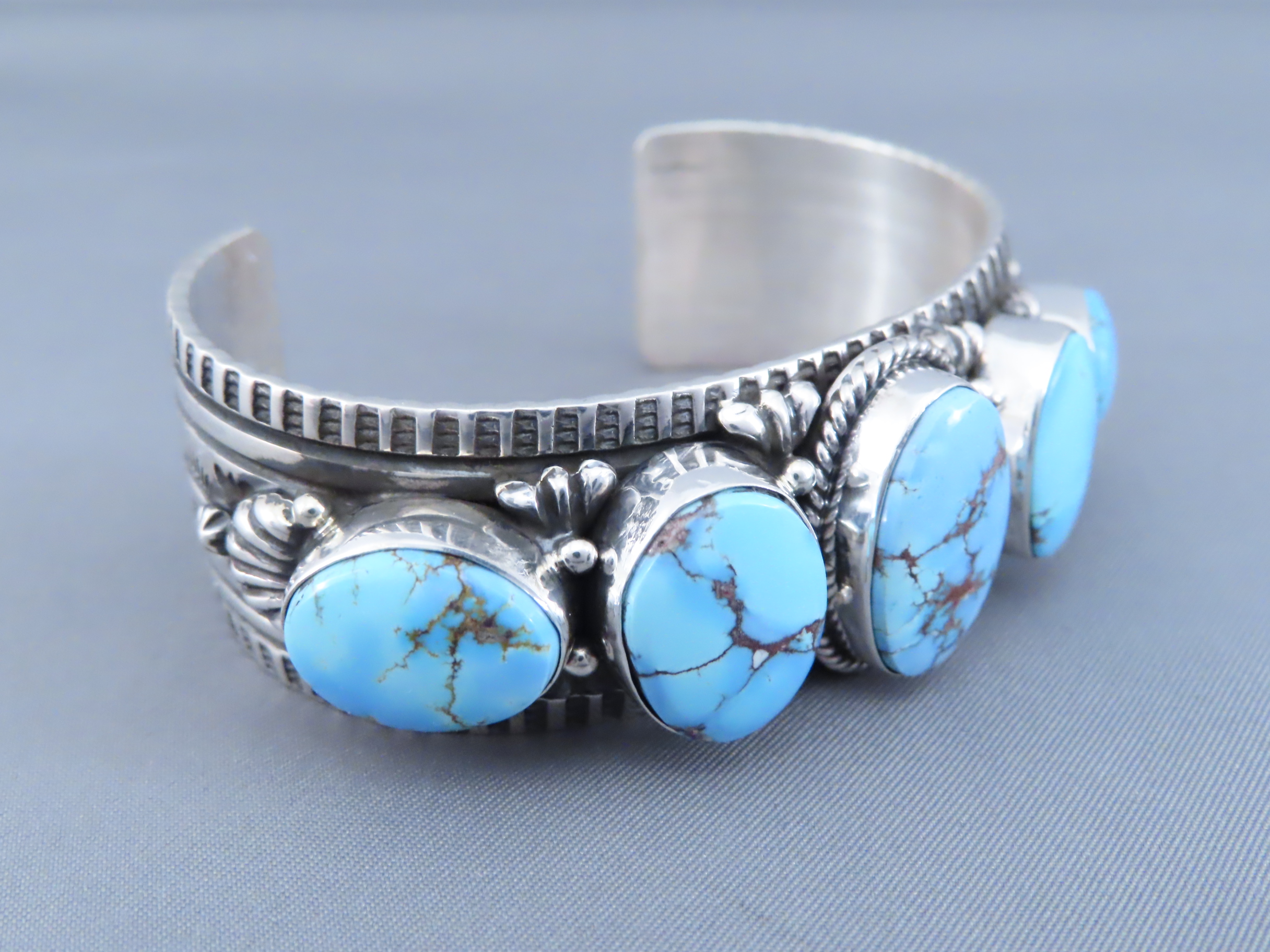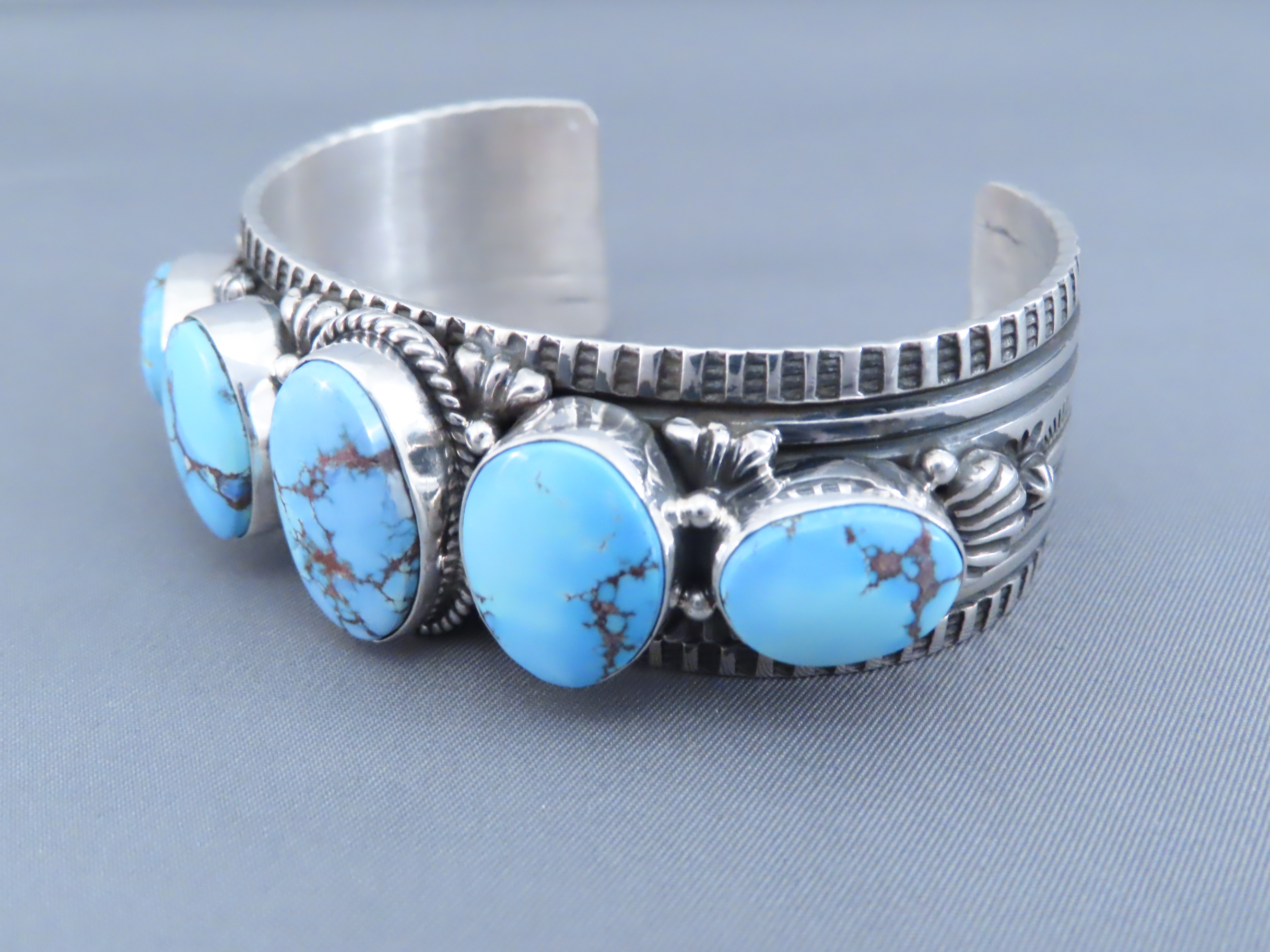Lovely Golden Hills Turquoise & Sterling Silver Bracelet! Very attractive 5-stone Turquoise cuff bracelet by Native American jewelry artist, Happy Piasso (Navajo). Beautiful Turquoise Jewelry!